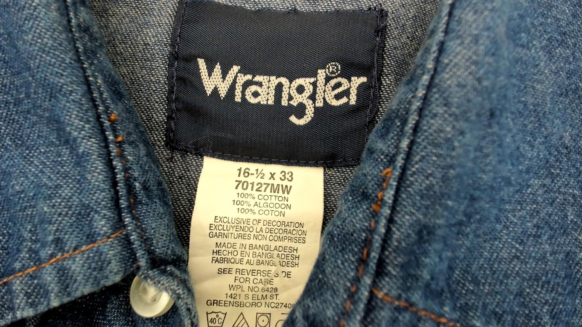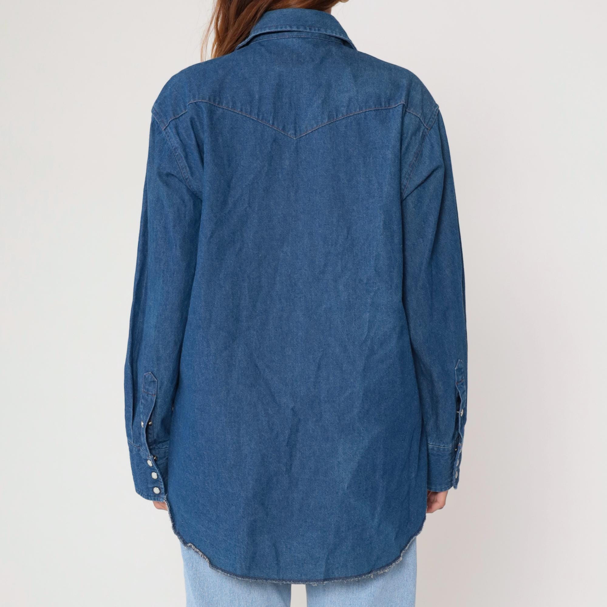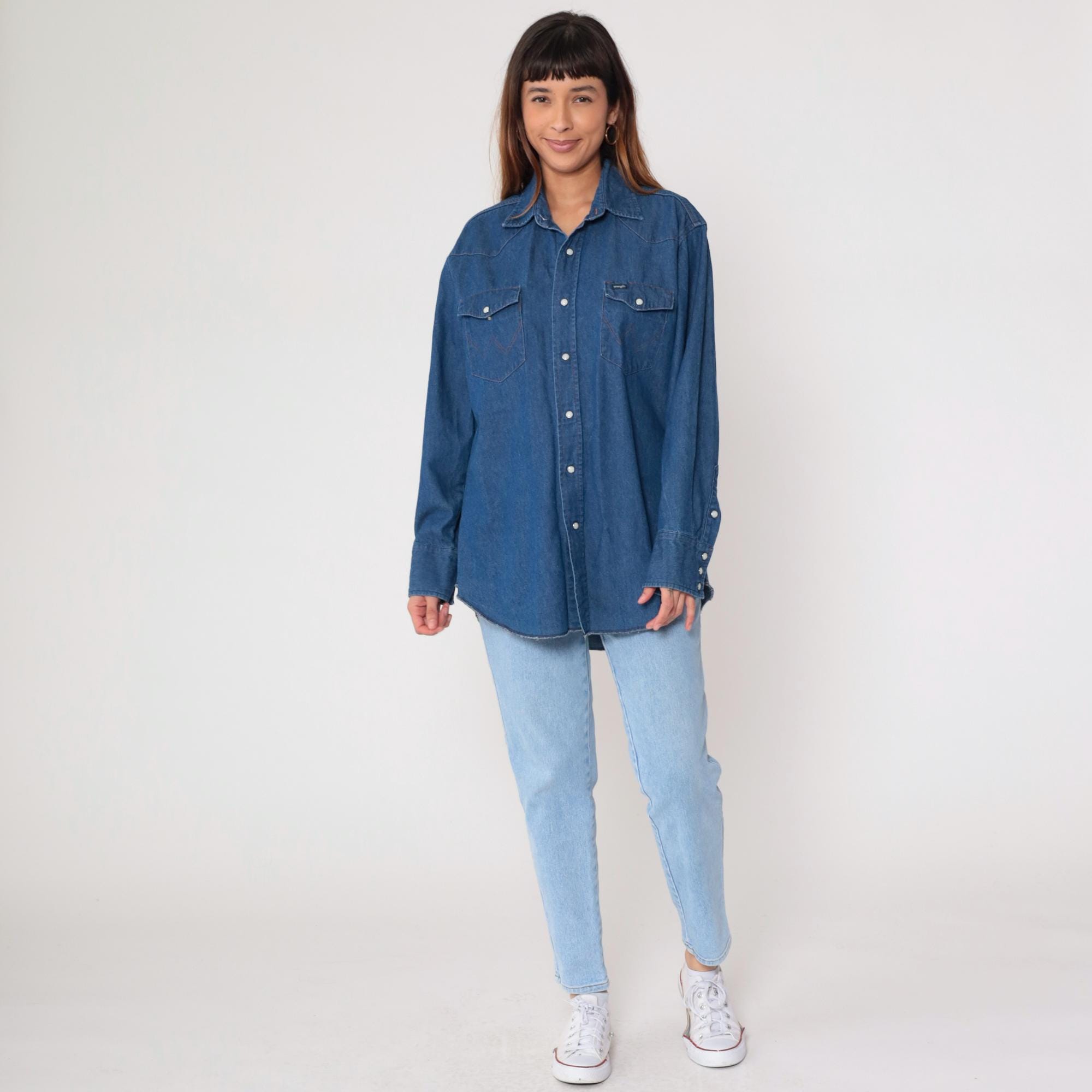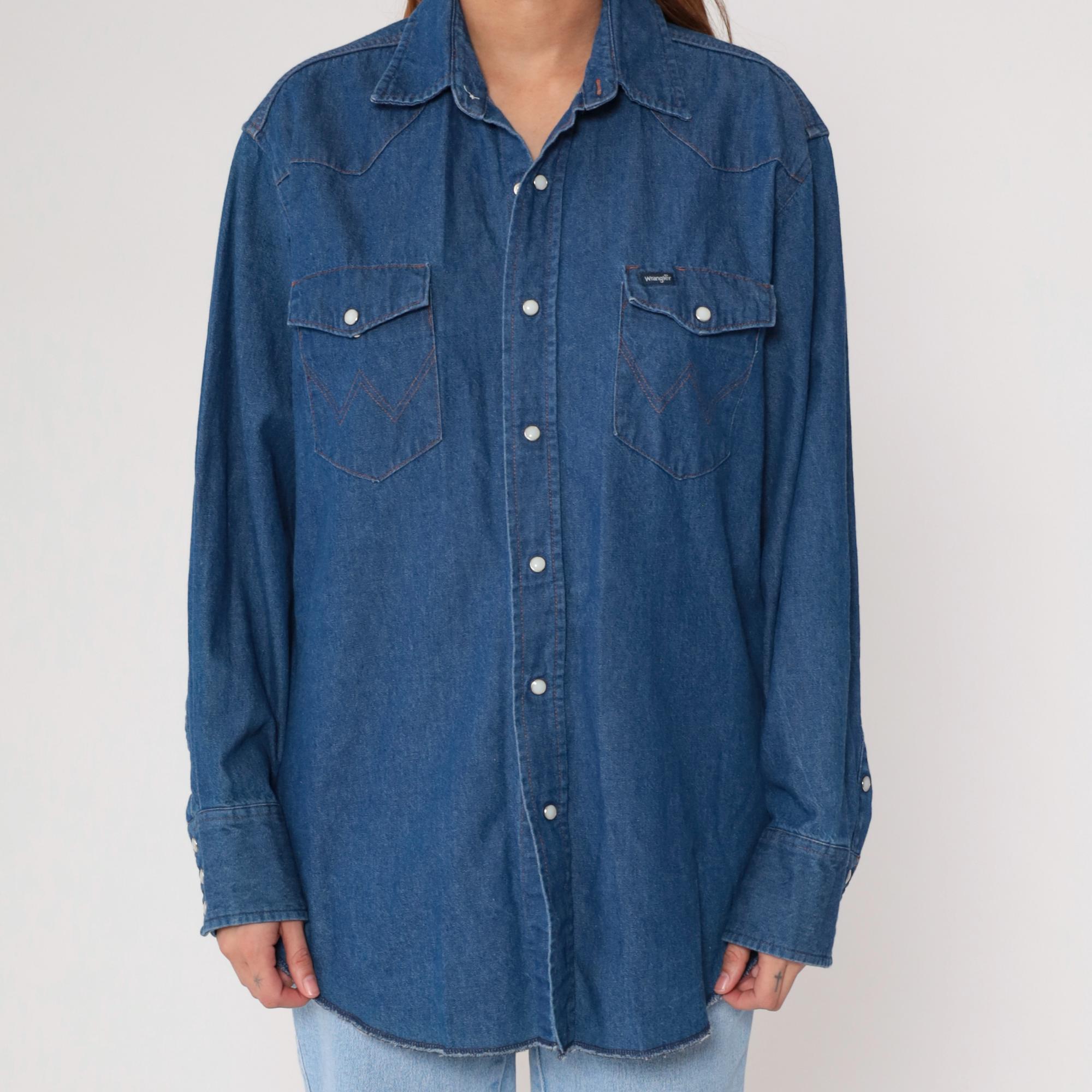 Vintage 90s Wrangler shirt in blue denim with pearl snaps down the front and a Western yoke. It has long sleeves and chest pockets.