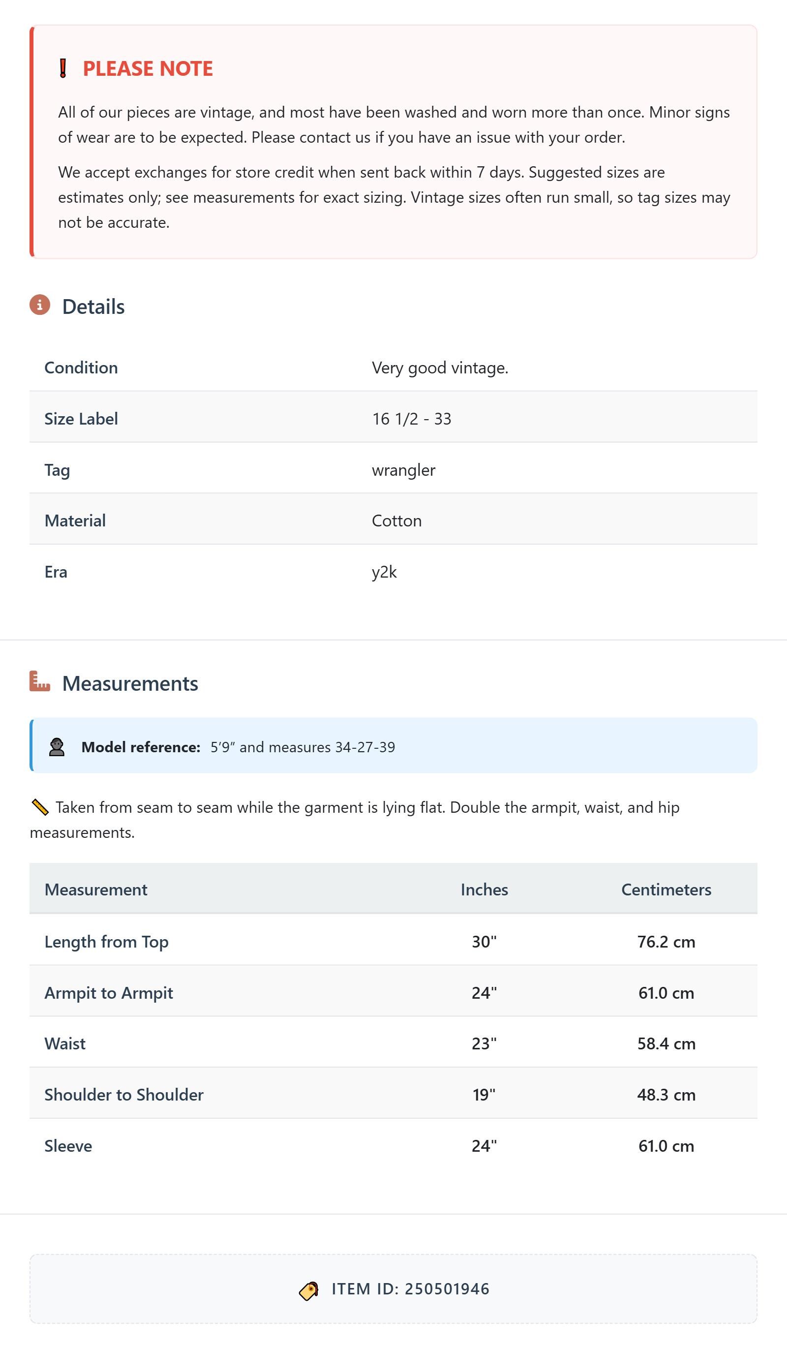 All of our pieces are vintage, and most have been washed and worn more than once. Minor signs of wear are to be expected. Please contact us if you have an issue with your order. We accept exchanges for store credit when sent back within 7 days.