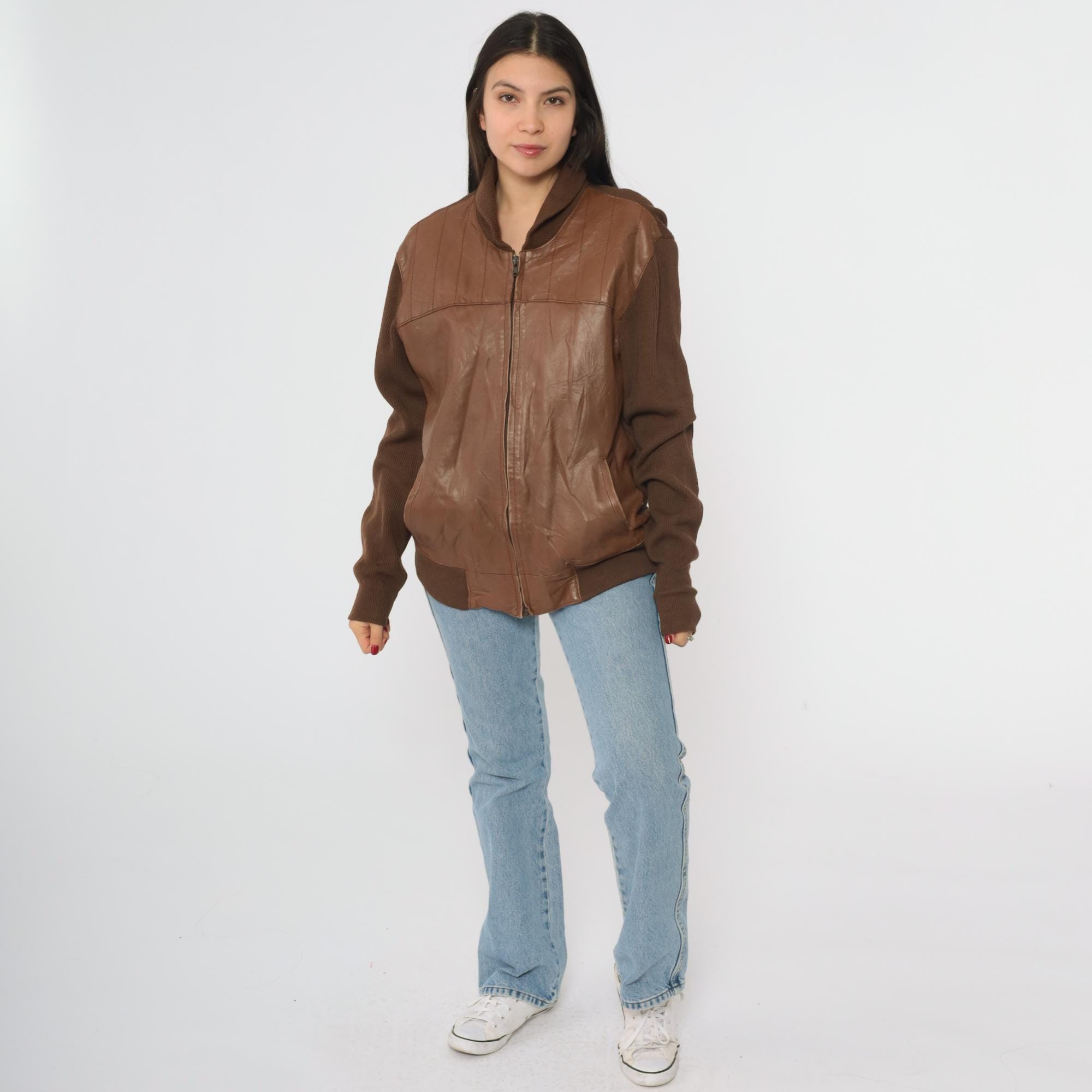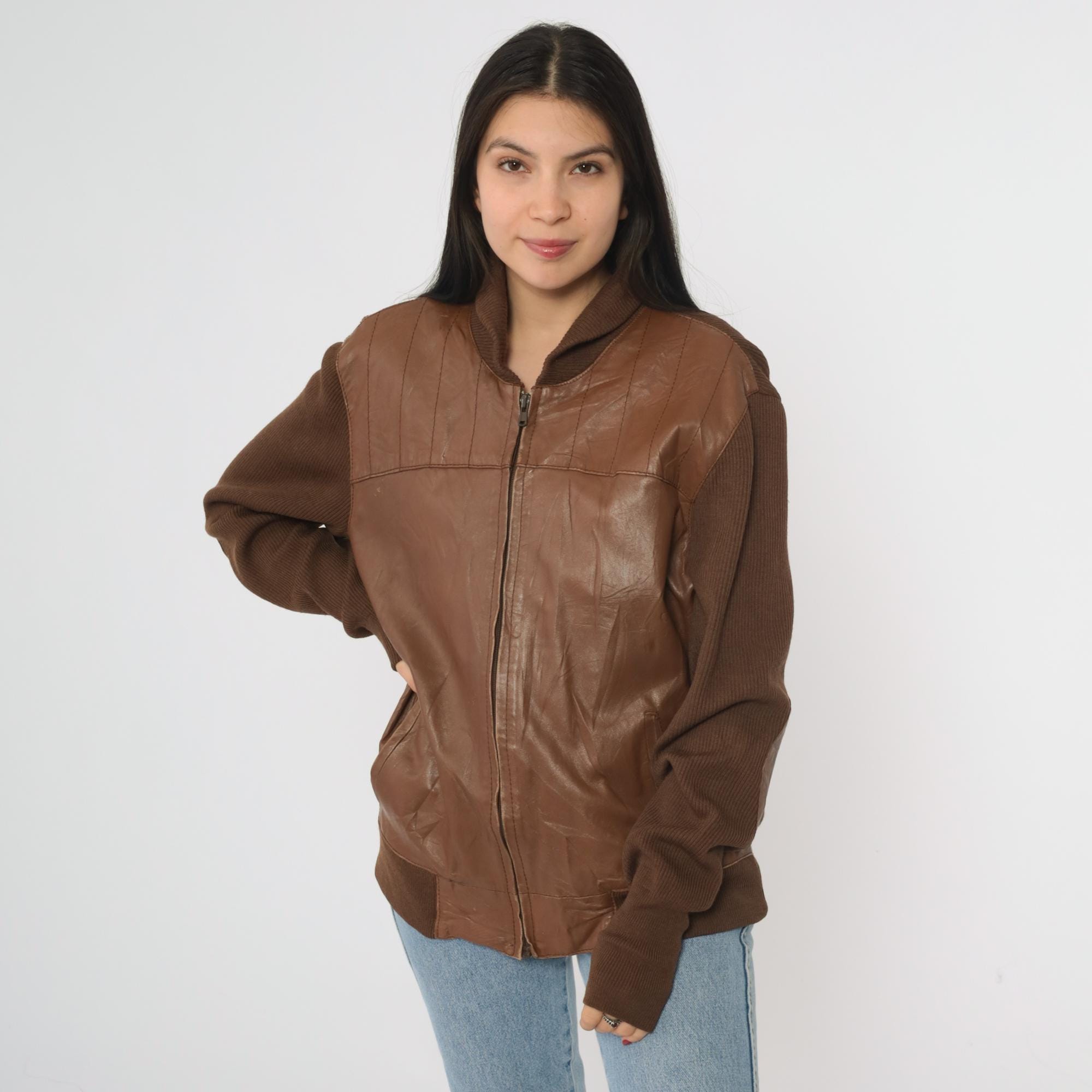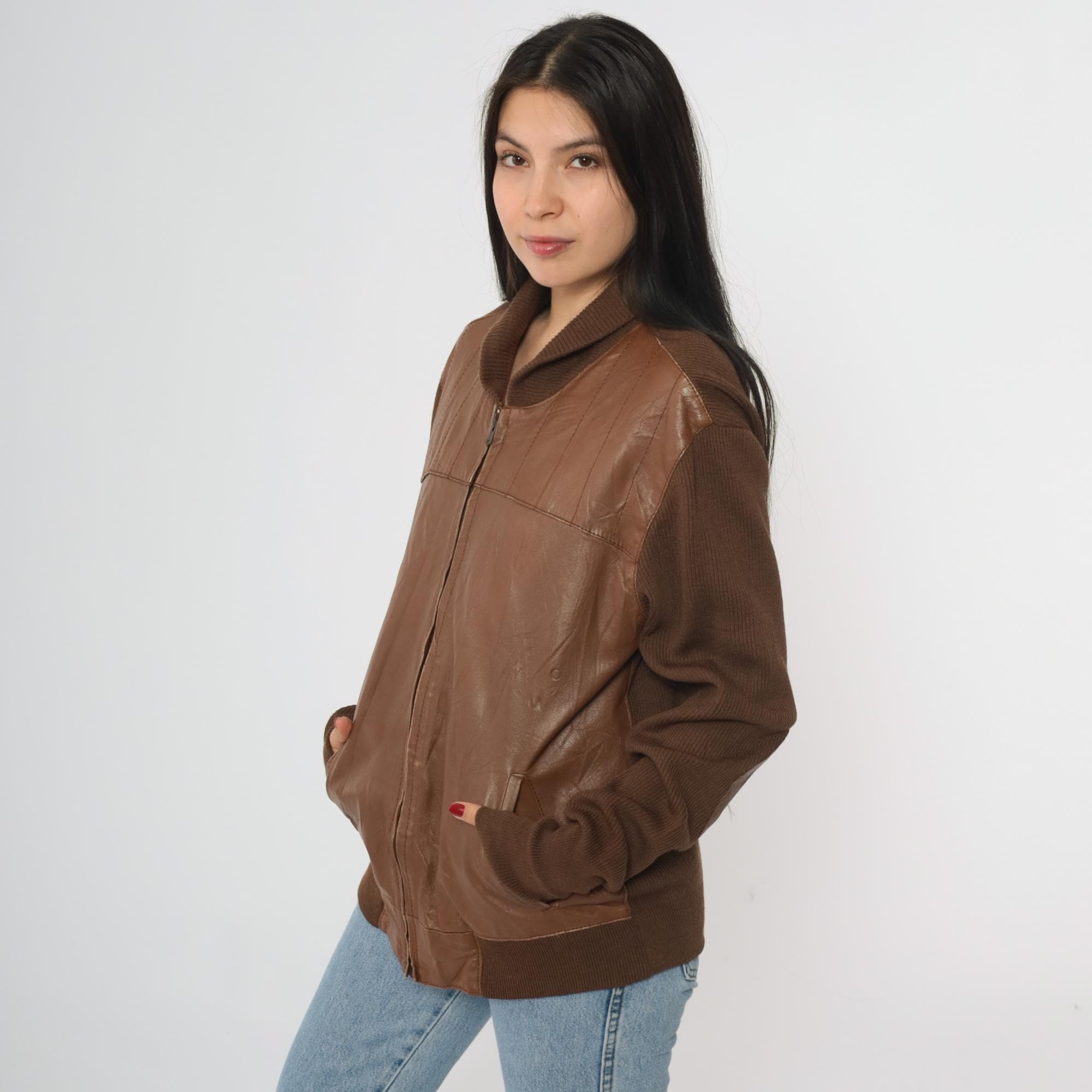 80s Torras bomber jacket made in Spain, crafted from brown leather and wool knit. Features a zip front closure, ribbed cuffs and hem, and matching leather elbow patches. The body is fully lined with a relaxed fit and classic aviator styling.