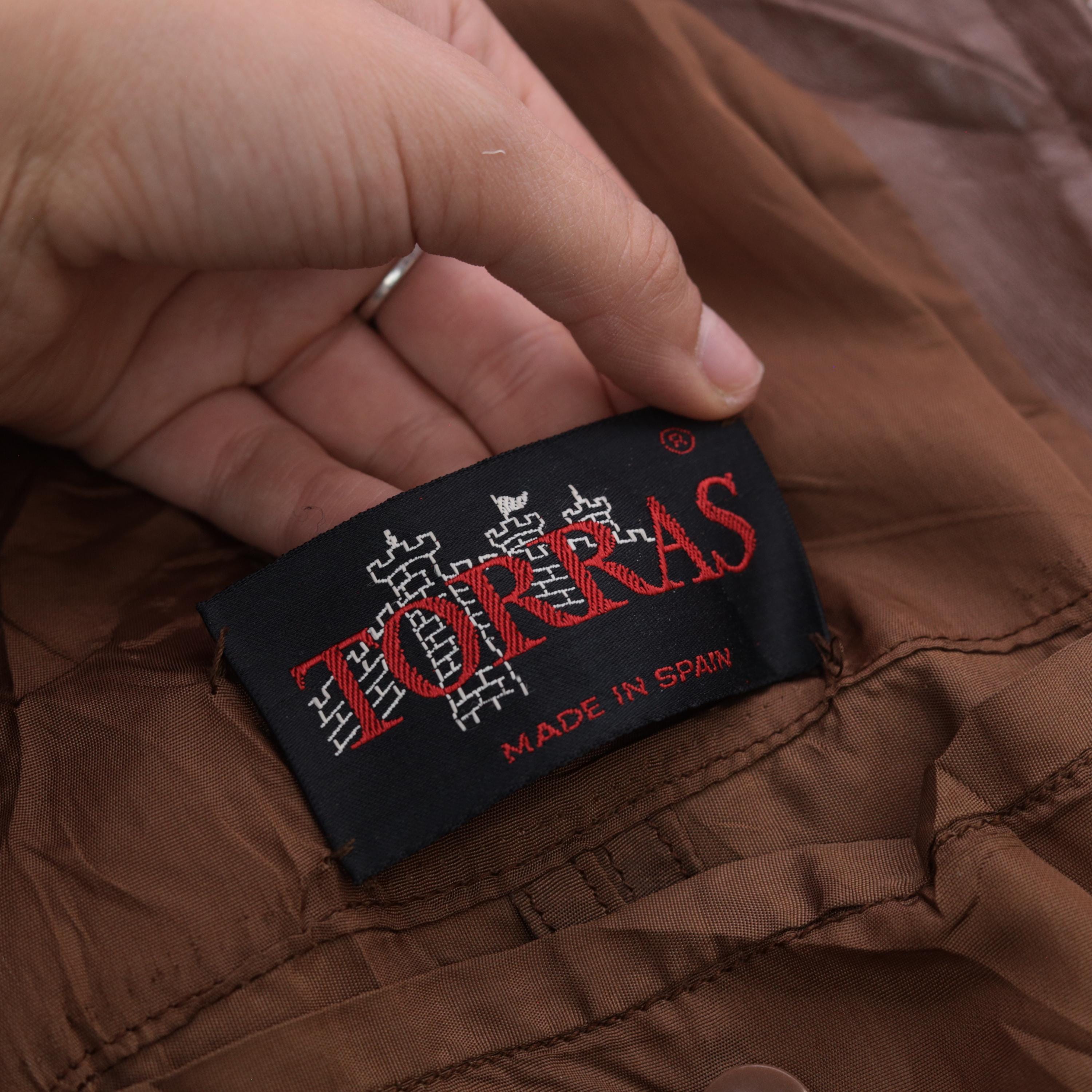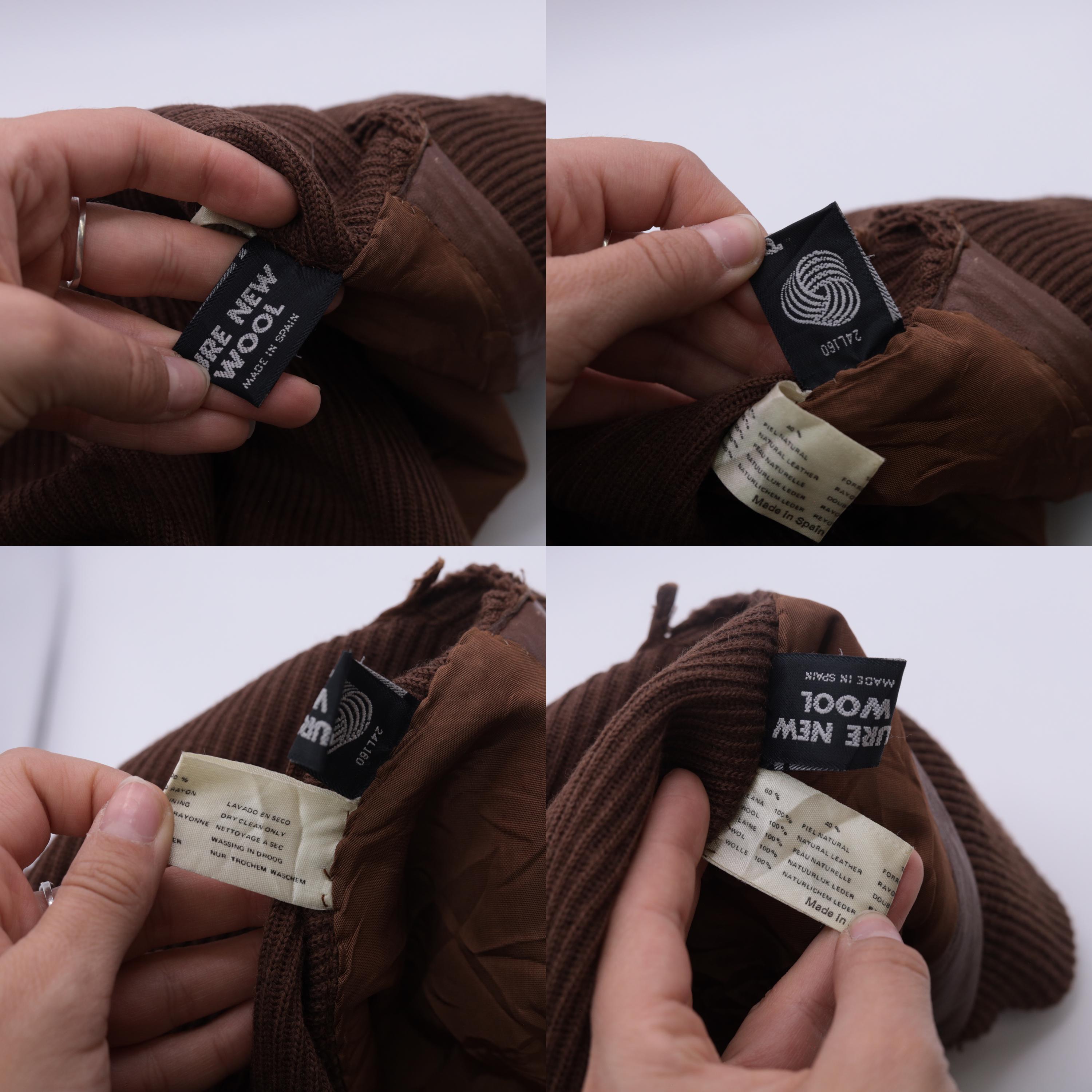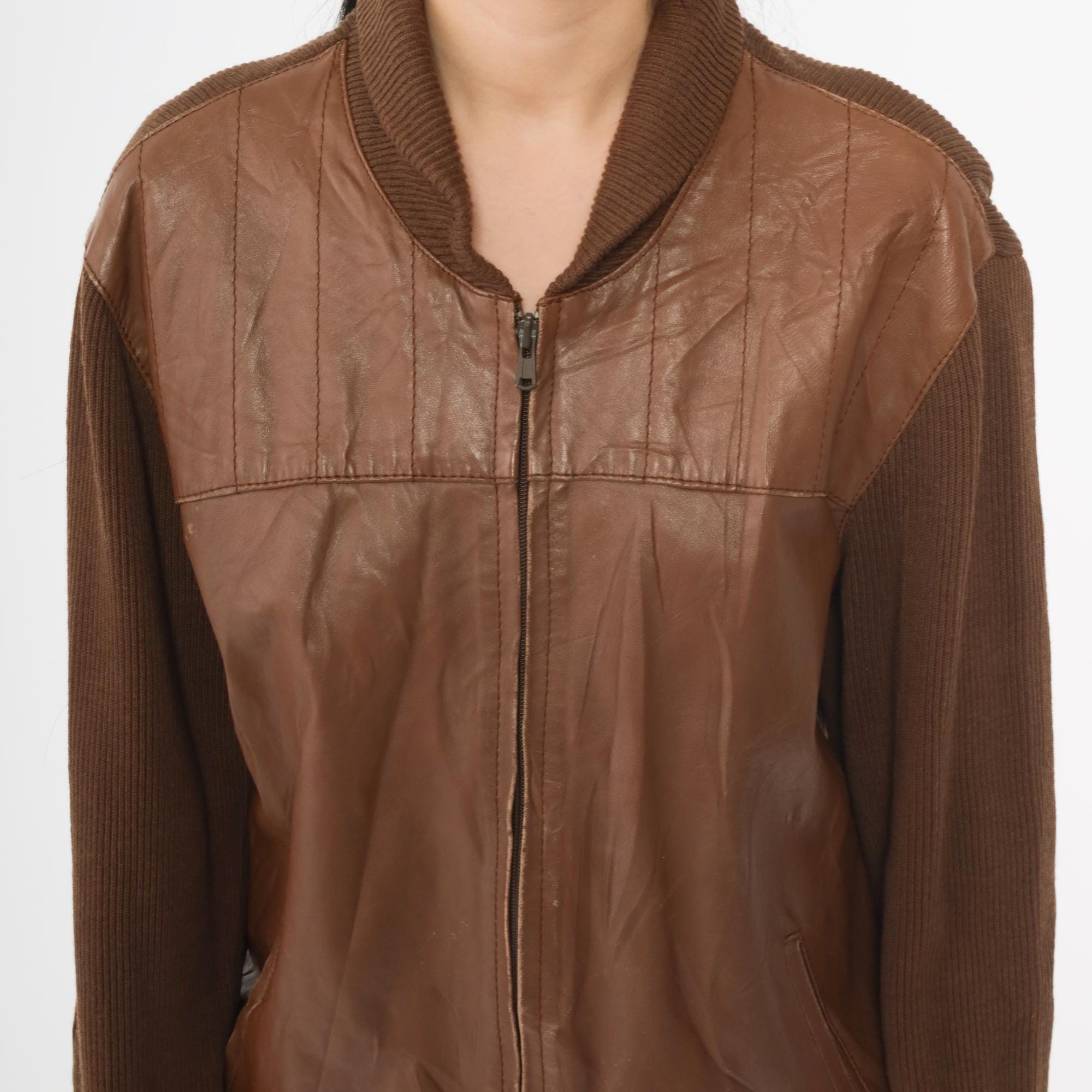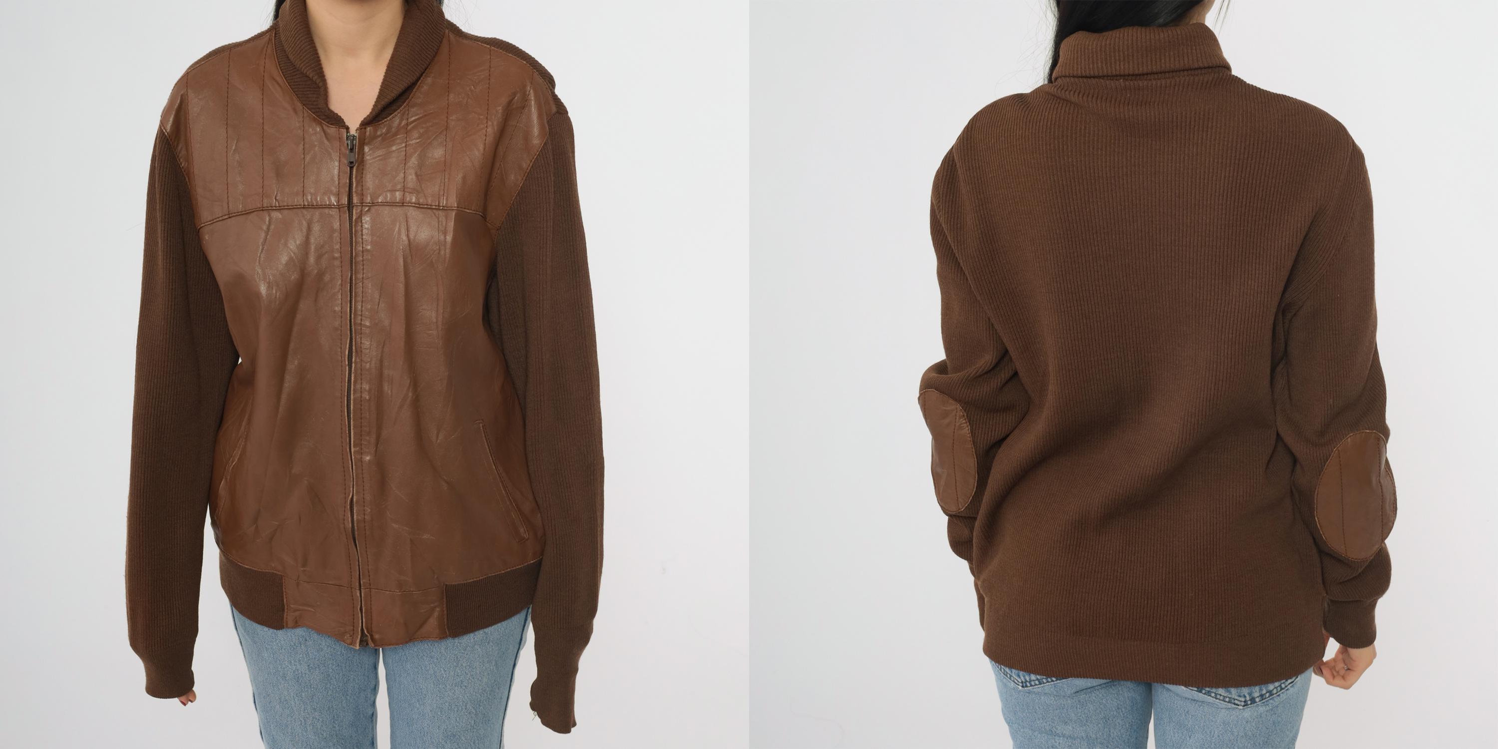 80s Torras bomber jacket made in Spain, crafted from brown leather and wool knit. Features a zip front closure, ribbed cuffs and hem, and matching leather elbow patches. The body is fully lined with a relaxed fit and classic aviator styling.