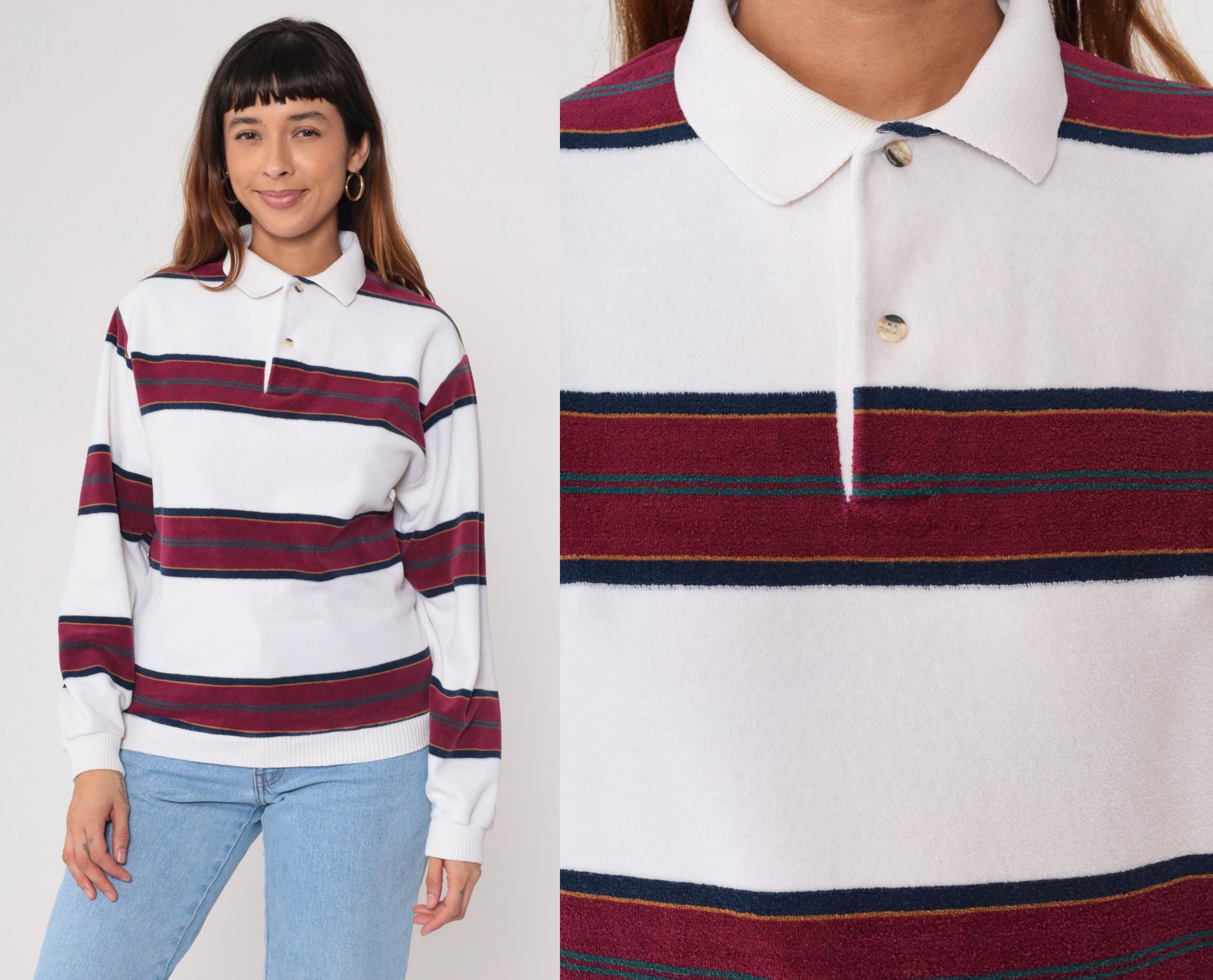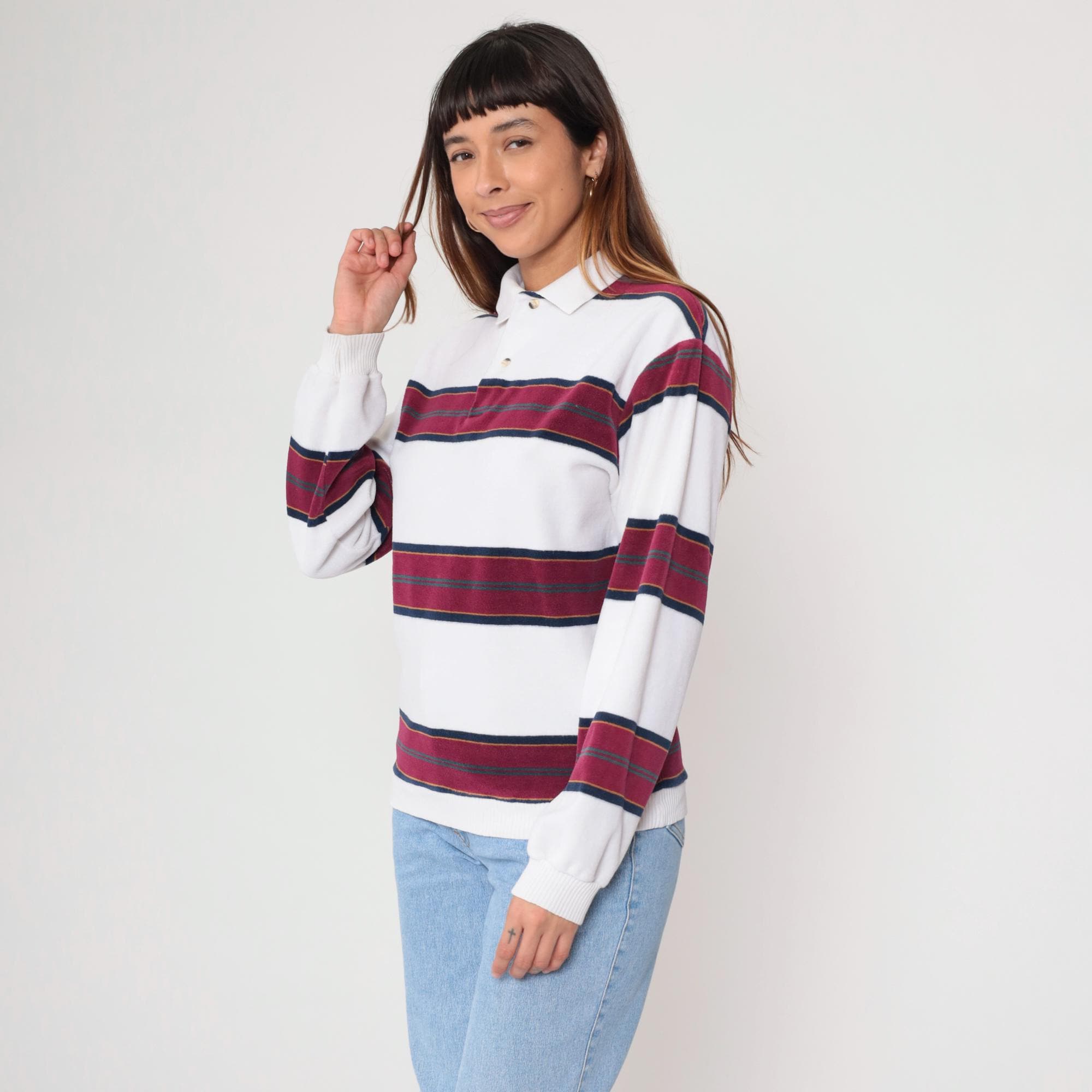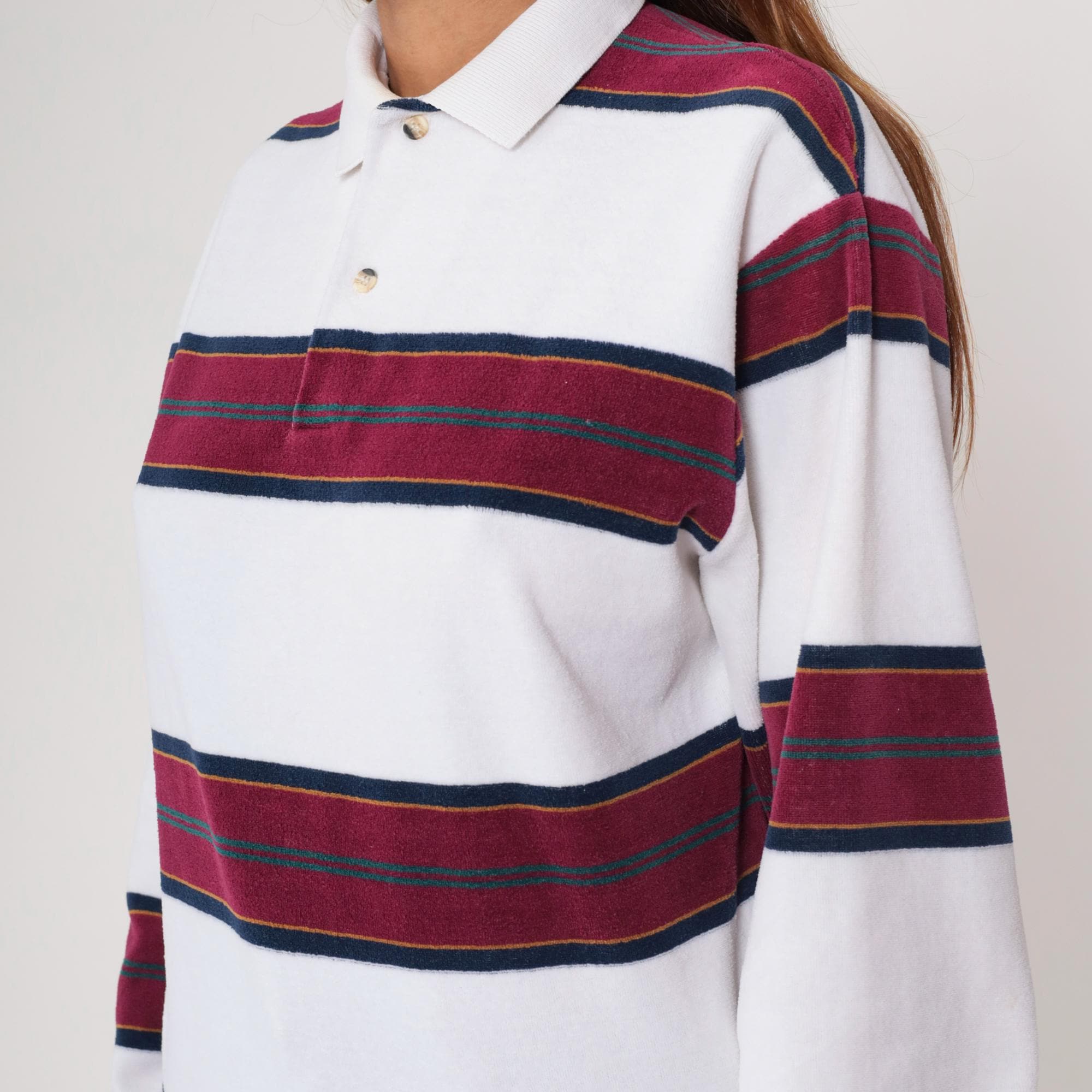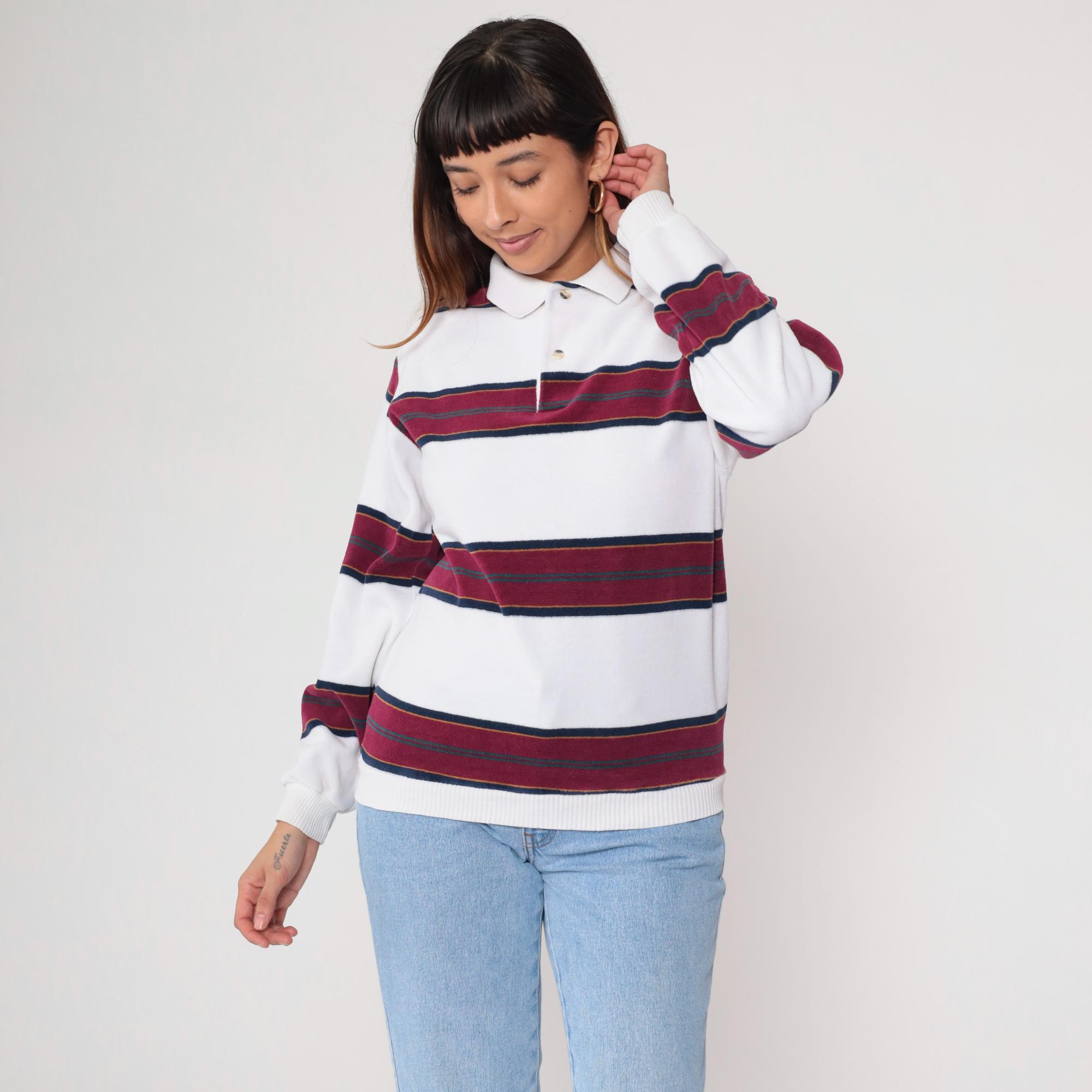 90s polo sweater with burgundy, navy and green horizontal stripes on white background. Long sleeves with ribbed cuffs.