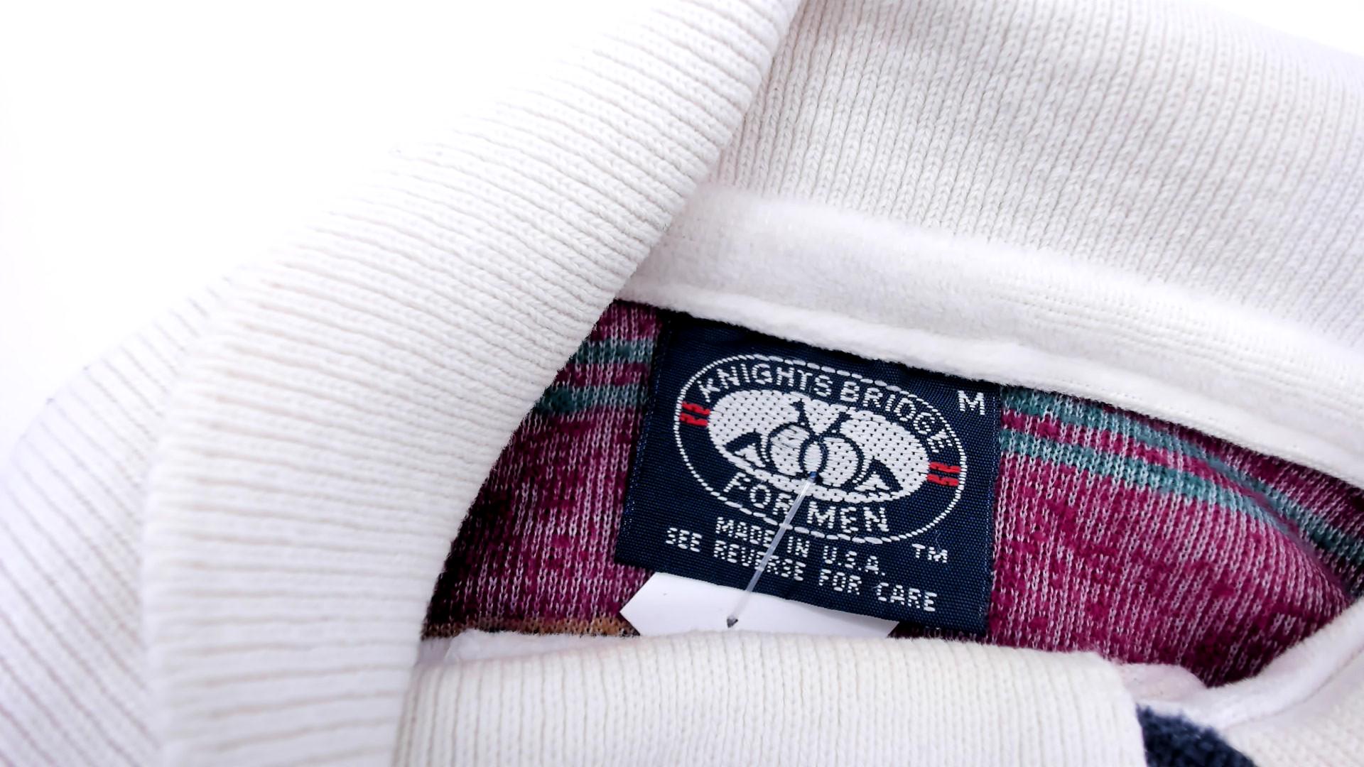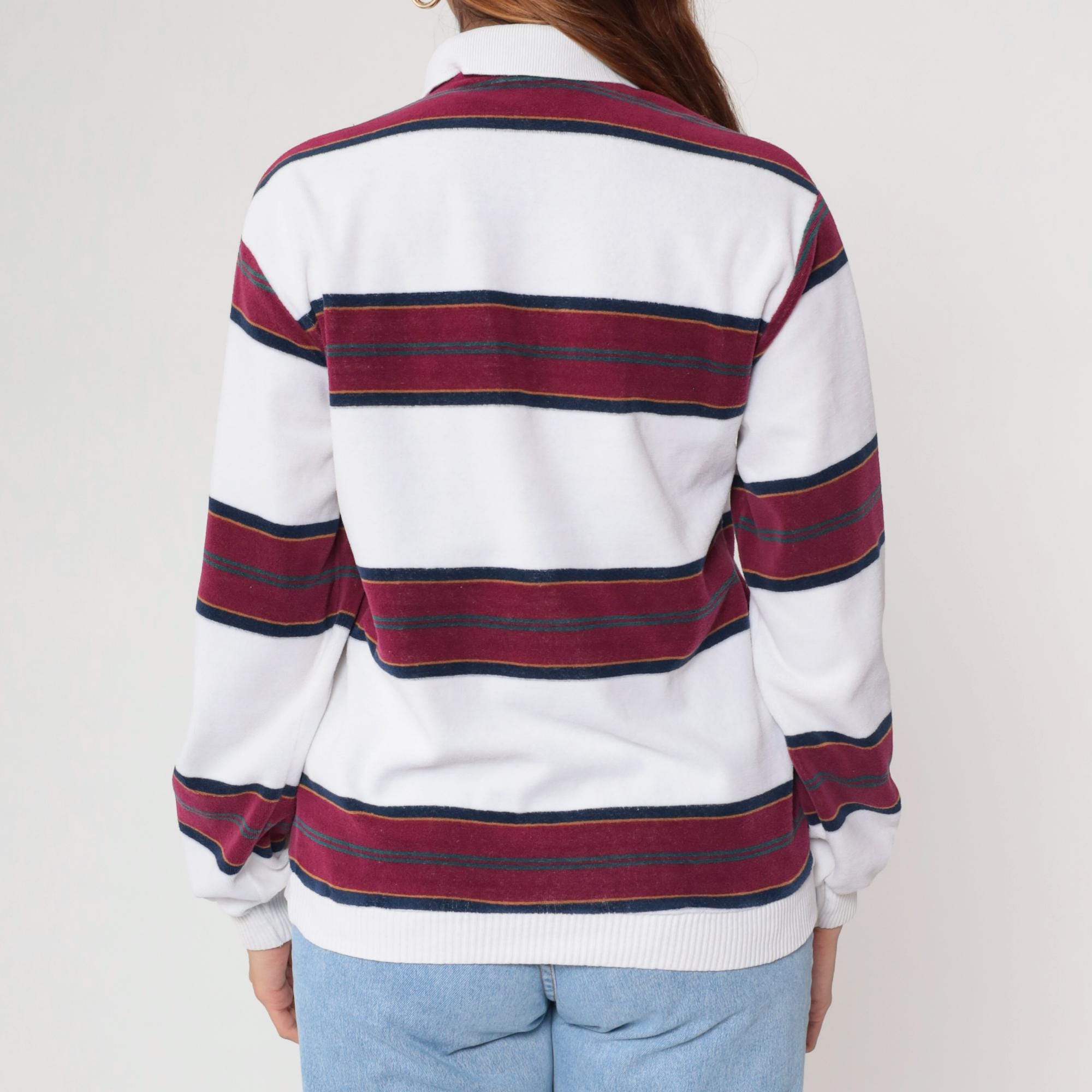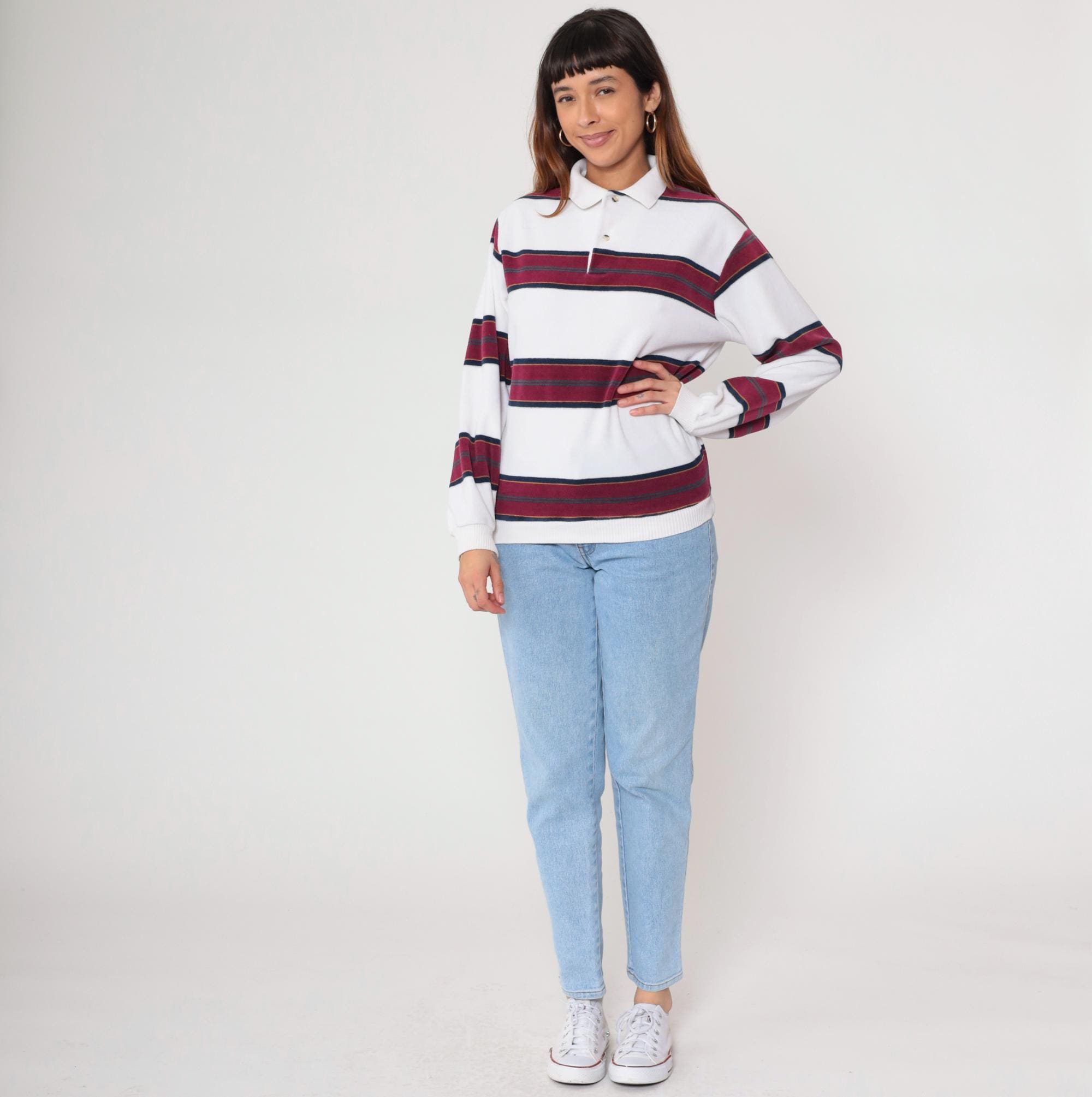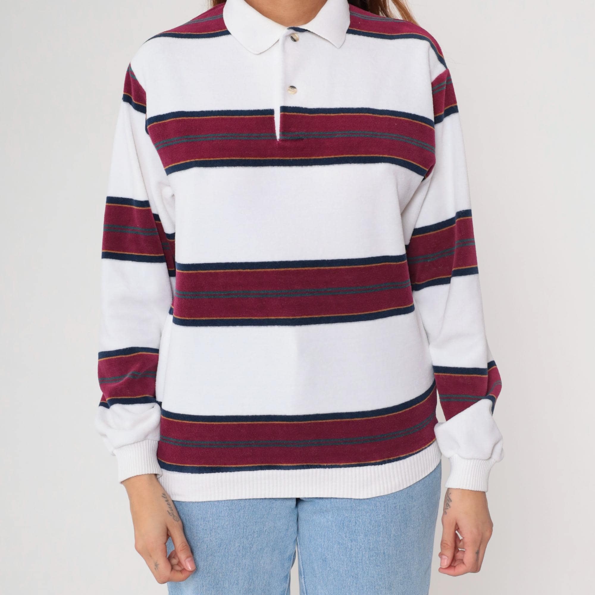 90s polo sweater with burgundy, navy and green horizontal stripes on white background. Long sleeves with ribbed cuffs.