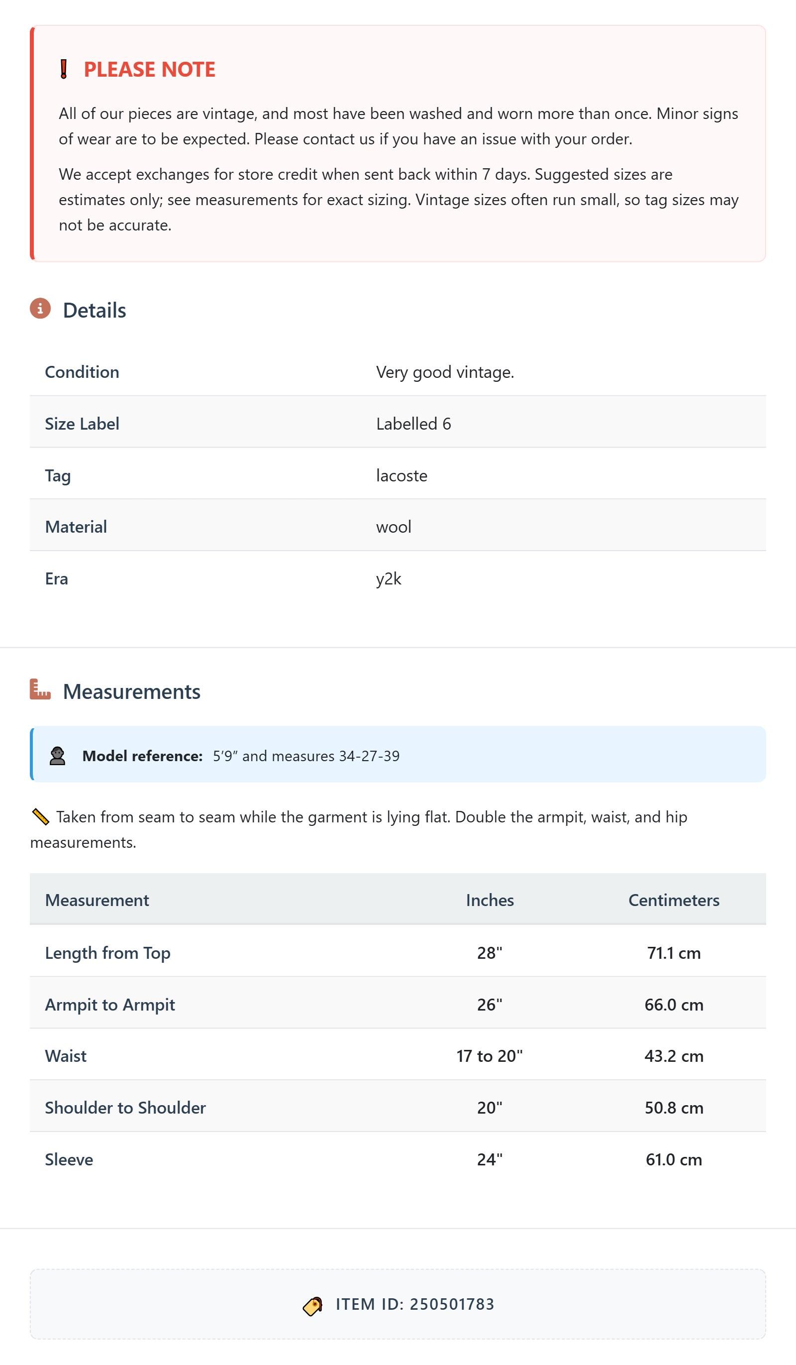 All of our pieces are vintage, and most have been washed and worn more than once. Minor signs of wear are to be expected. Please contact us if you have an issue with your order. We accept exchanges for store credit when sent back within 7 days.