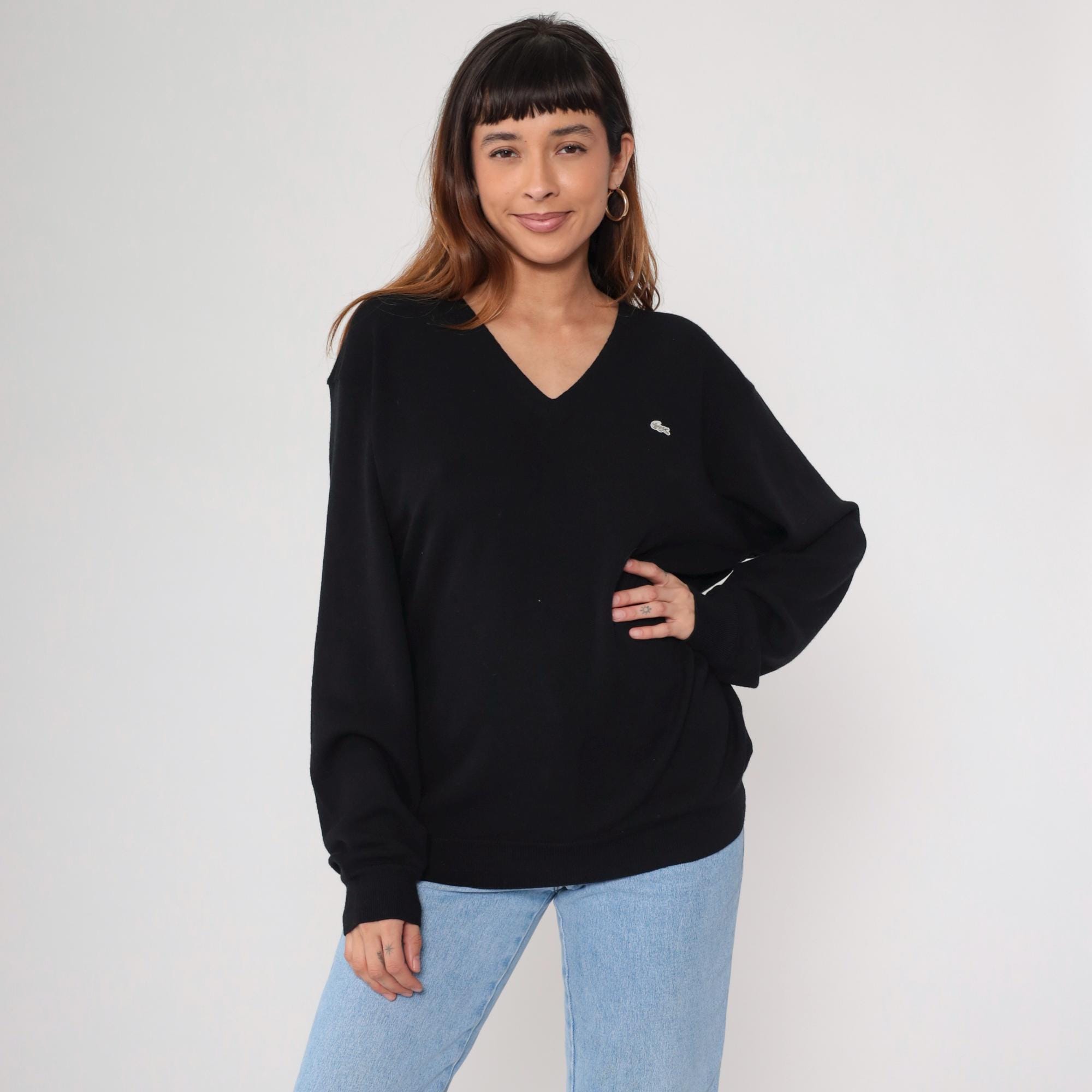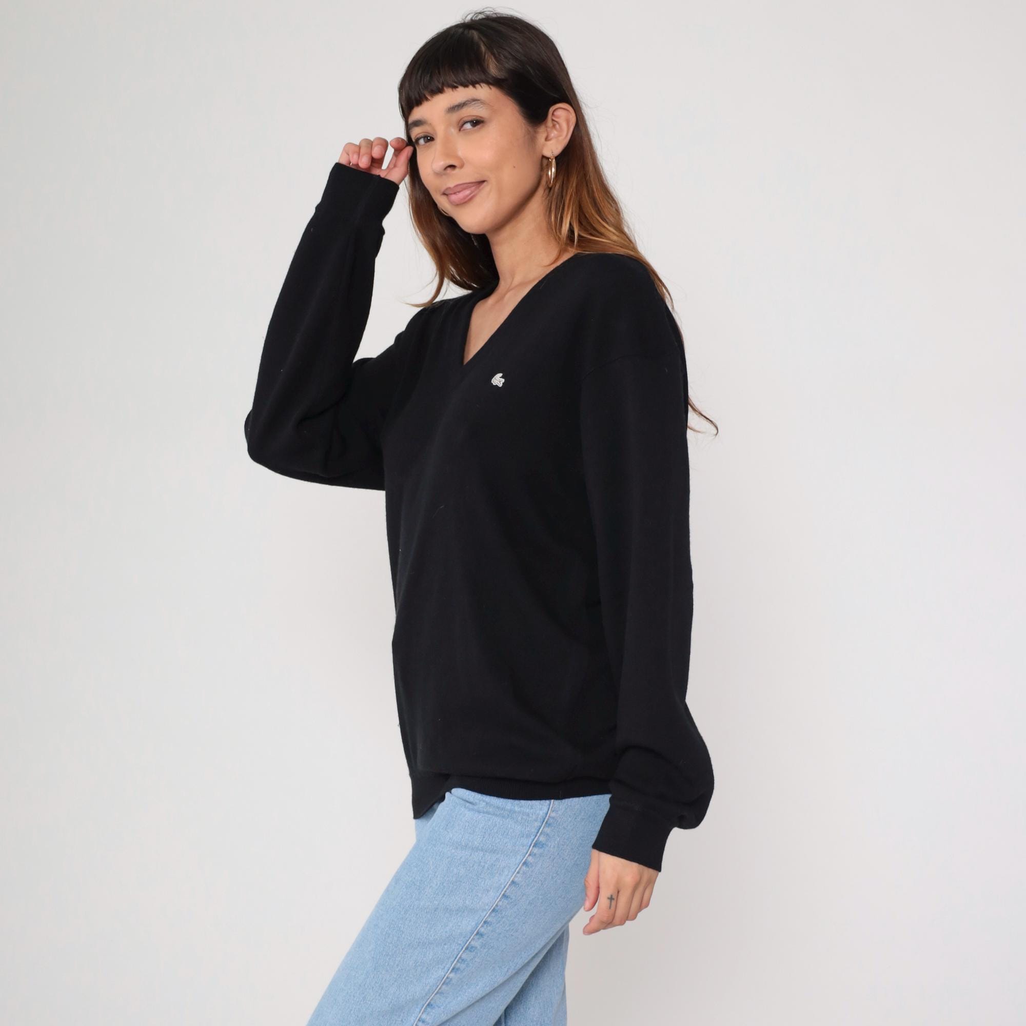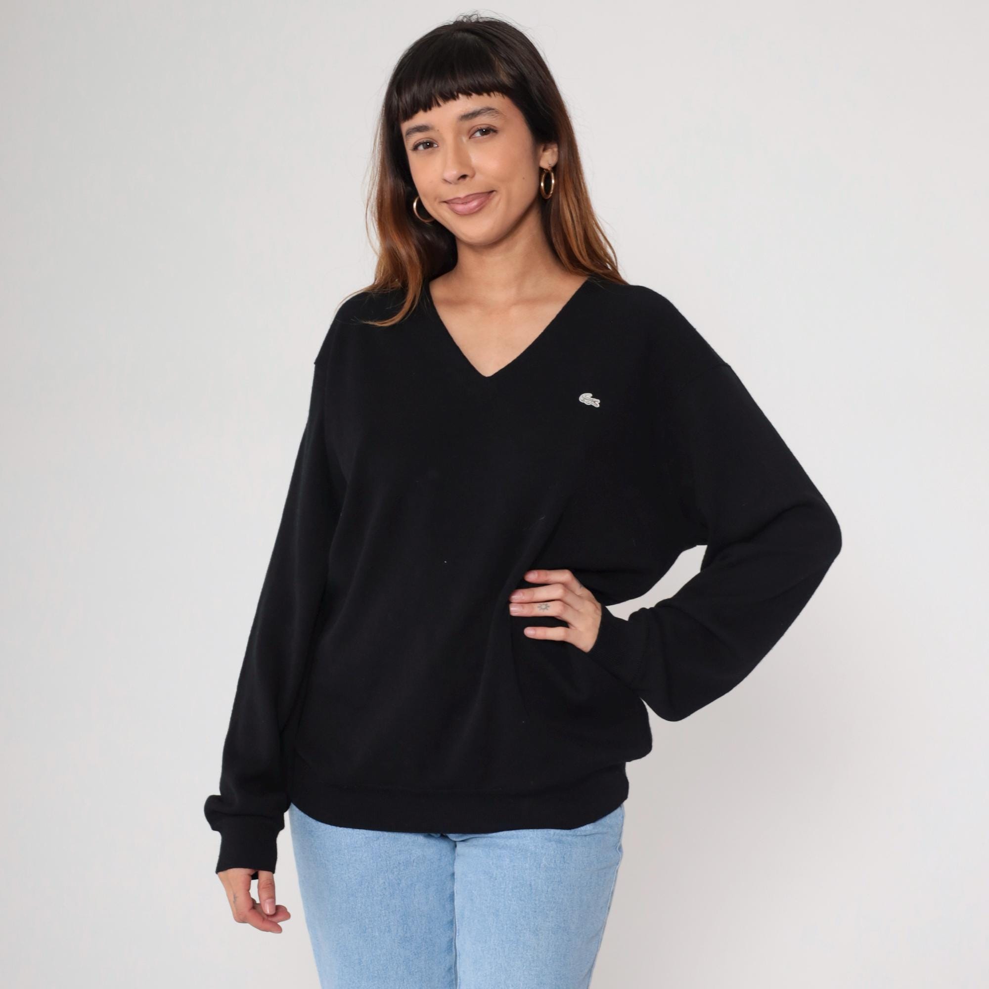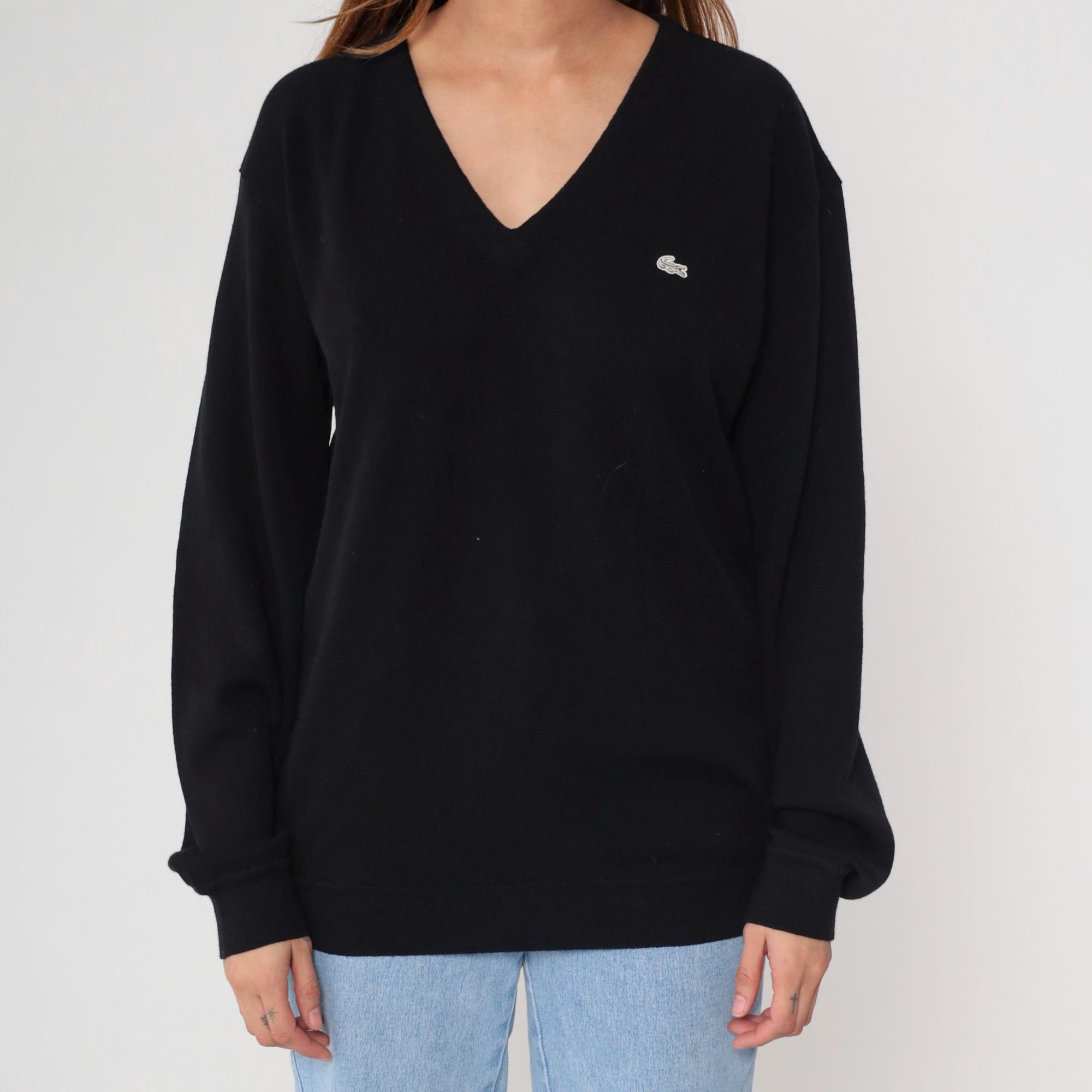 Y2K V-neck sweater by Lacoste with embroidered white crocodile logo on chest. Classic black wool knit. Ribbed collar, cuffs and hem.