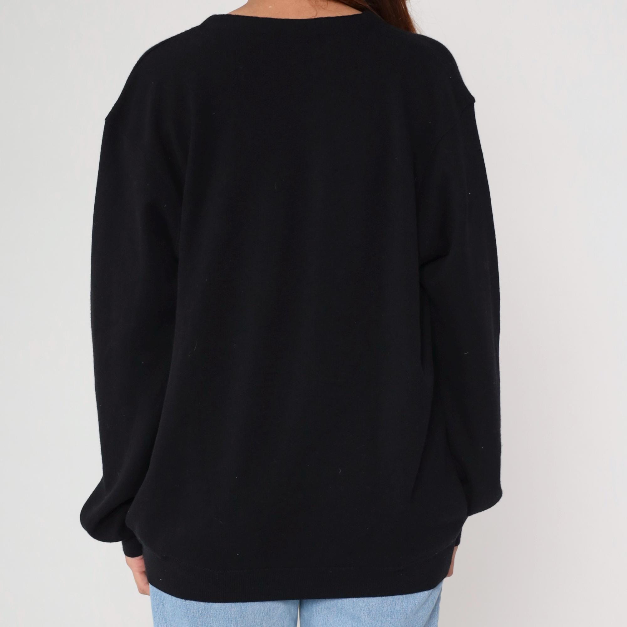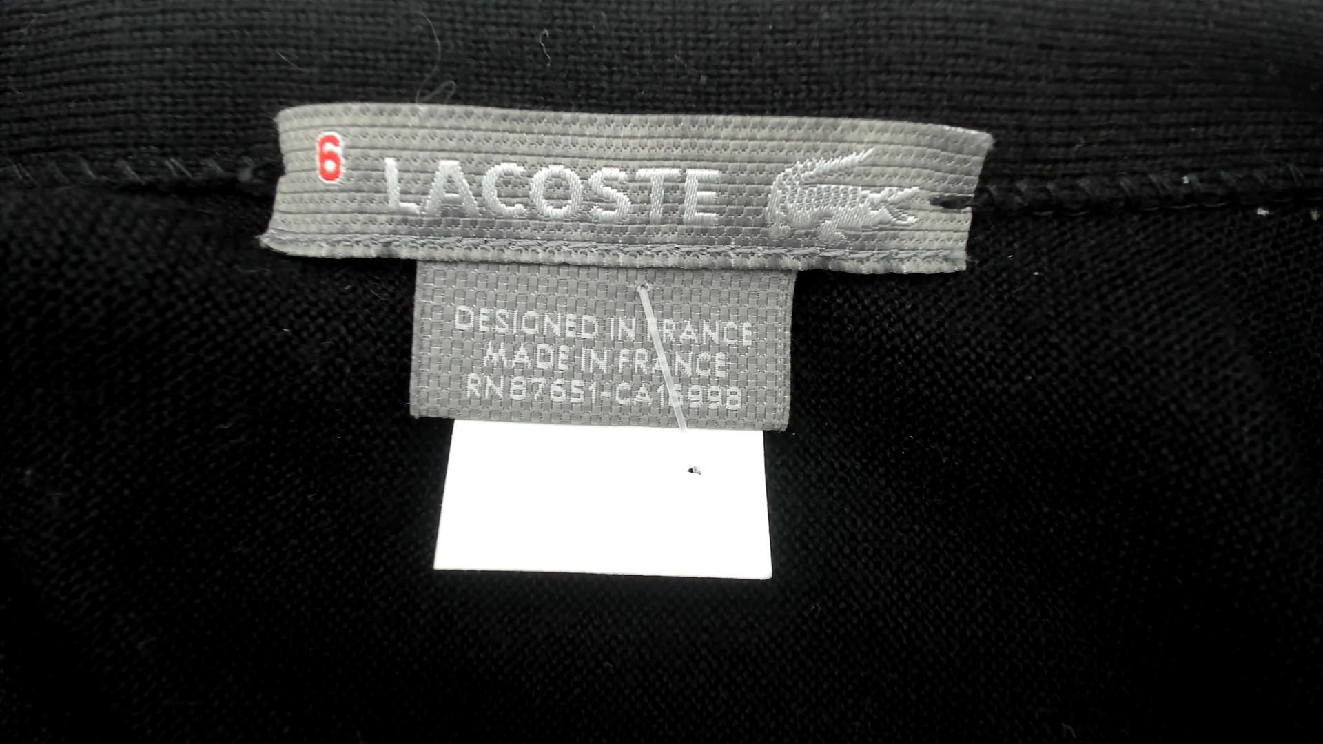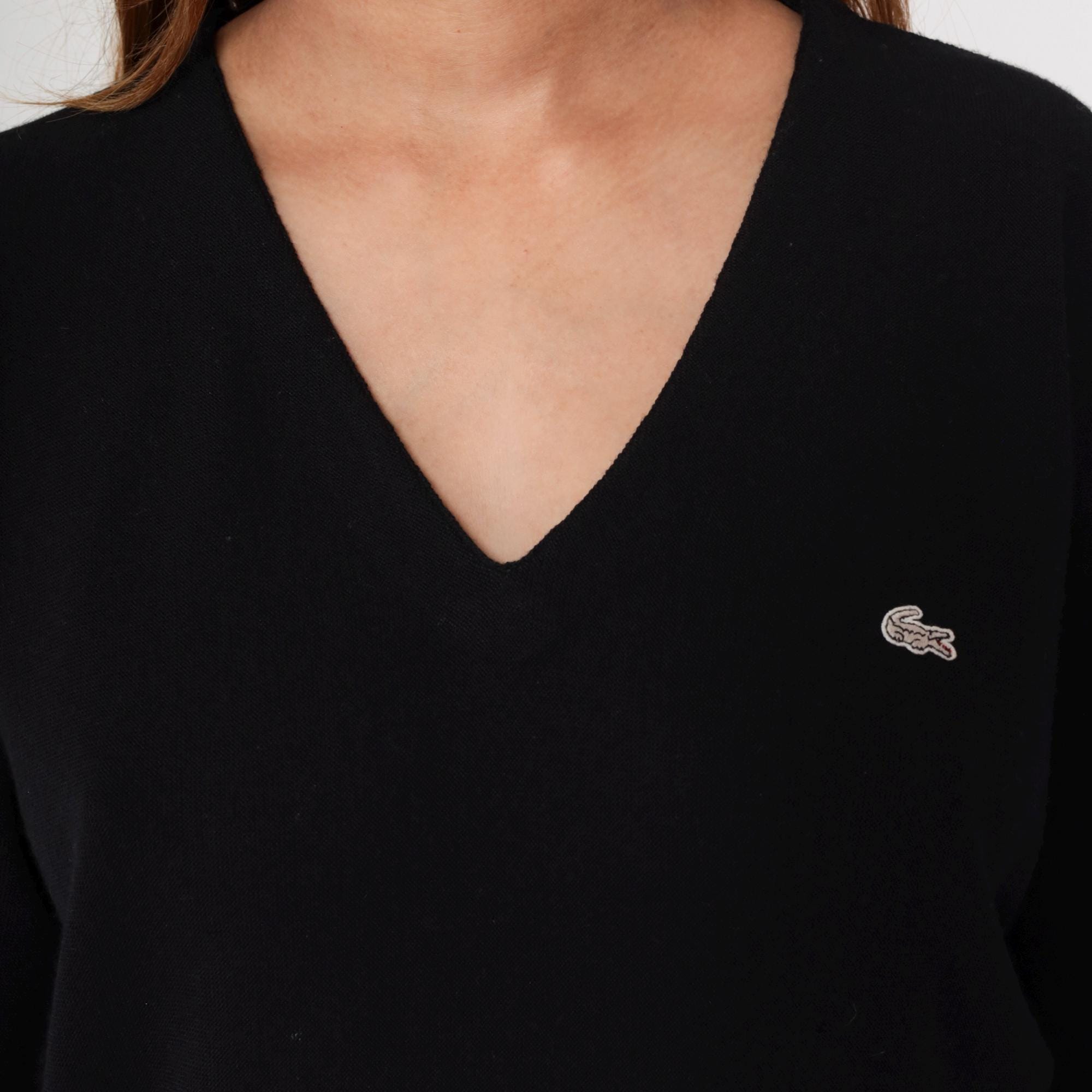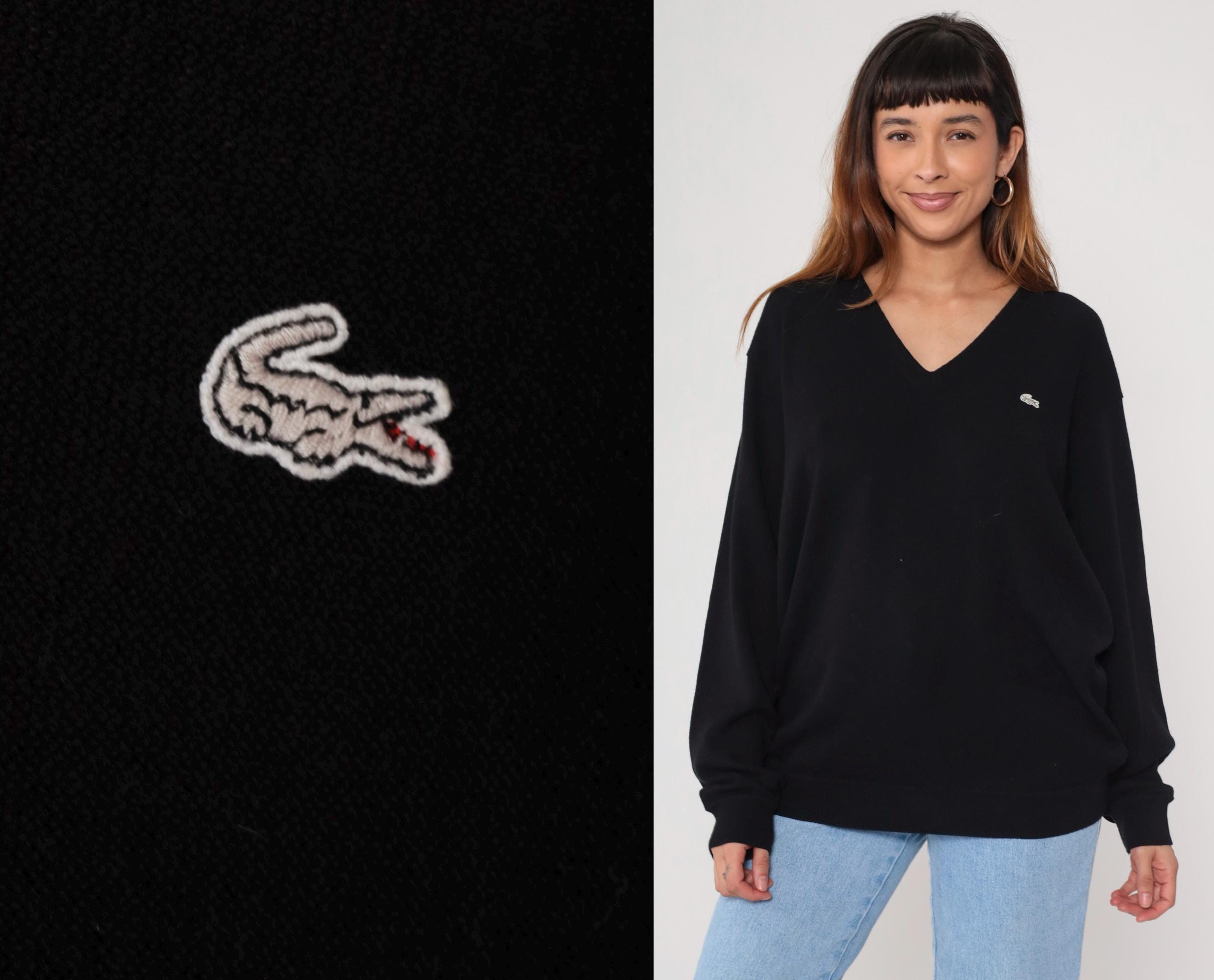 Y2K V-neck sweater by Lacoste with embroidered white crocodile logo on chest. Classic black wool knit. Ribbed collar, cuffs and hem.