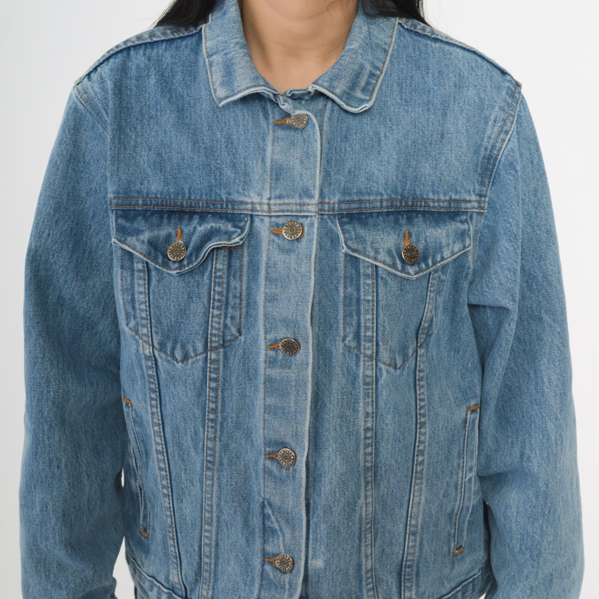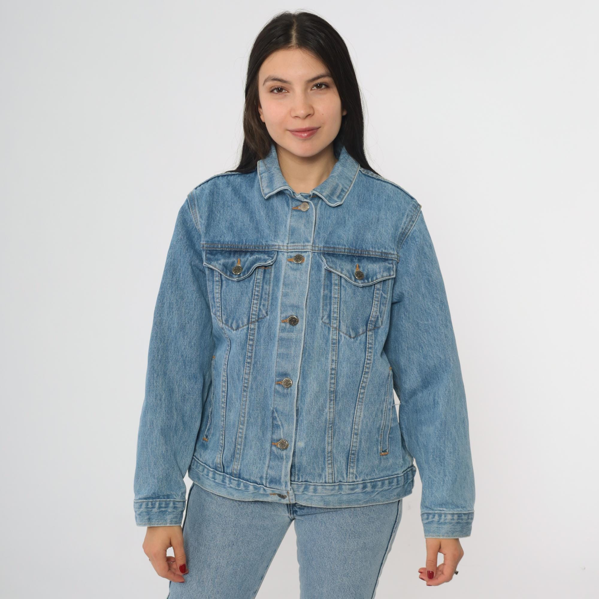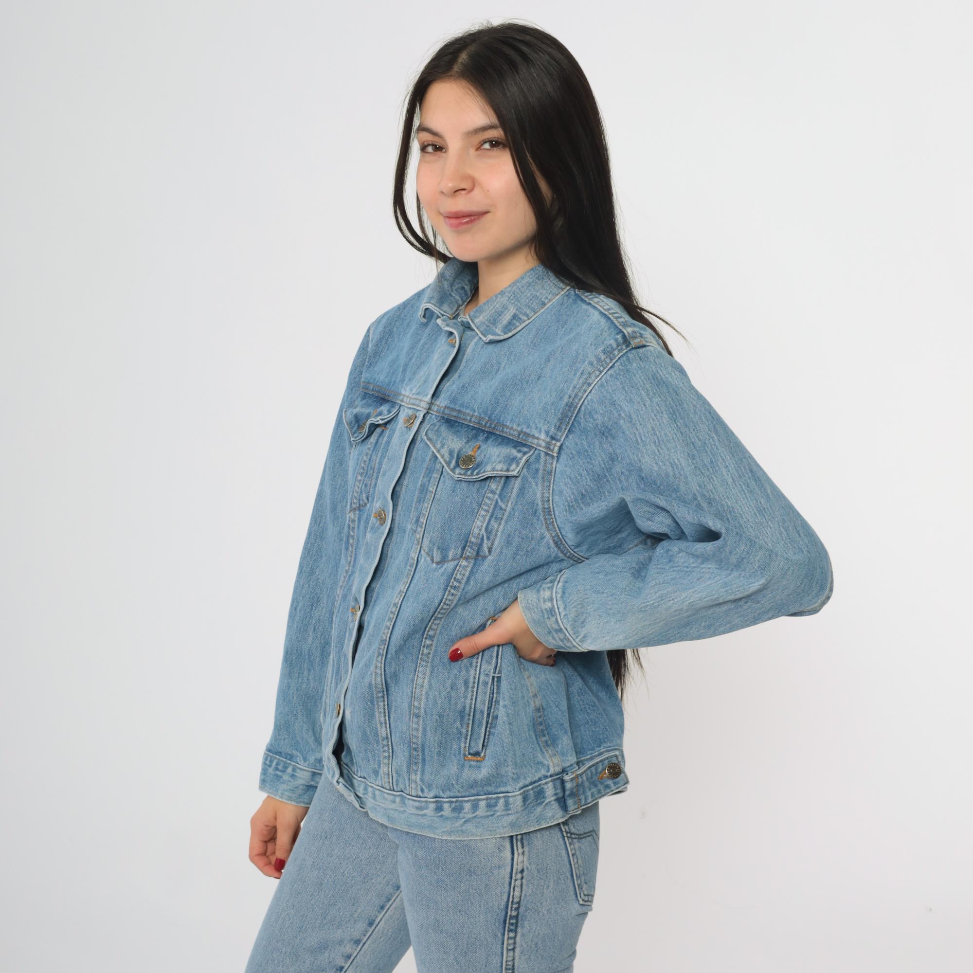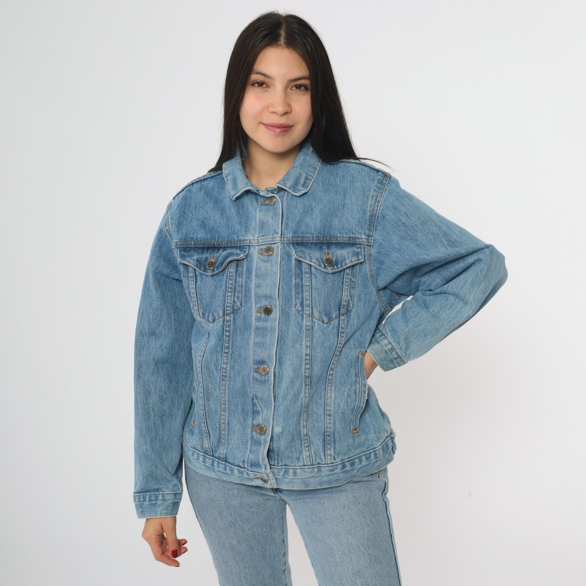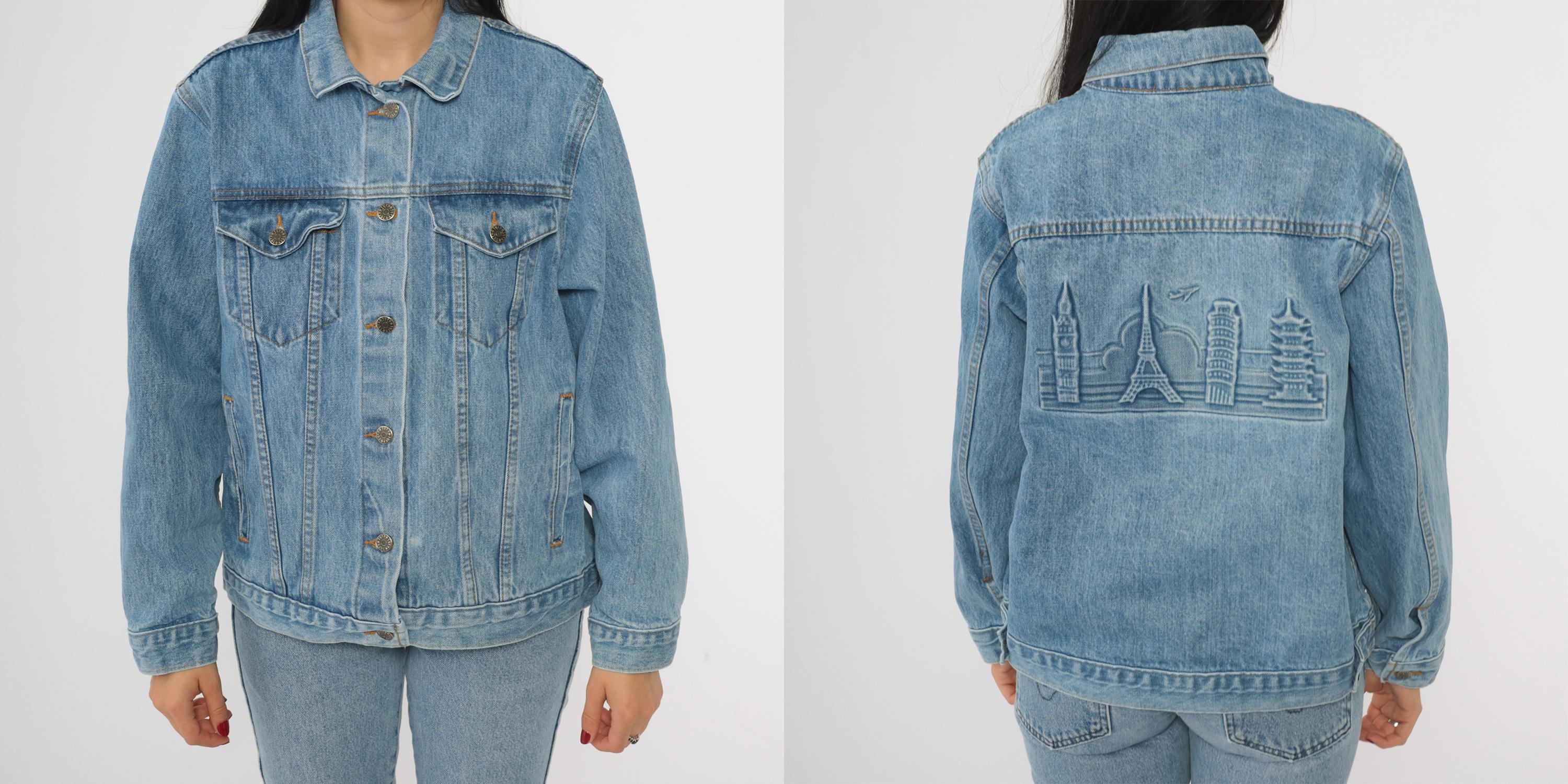 90s denim jacket with embossed world landmarks design on back featuring the Eiffel Tower, Big Ben, Pisa Tower, and other famous structures. Classic trucker style with button front closure, two chest pockets with button flaps, and side pockets.