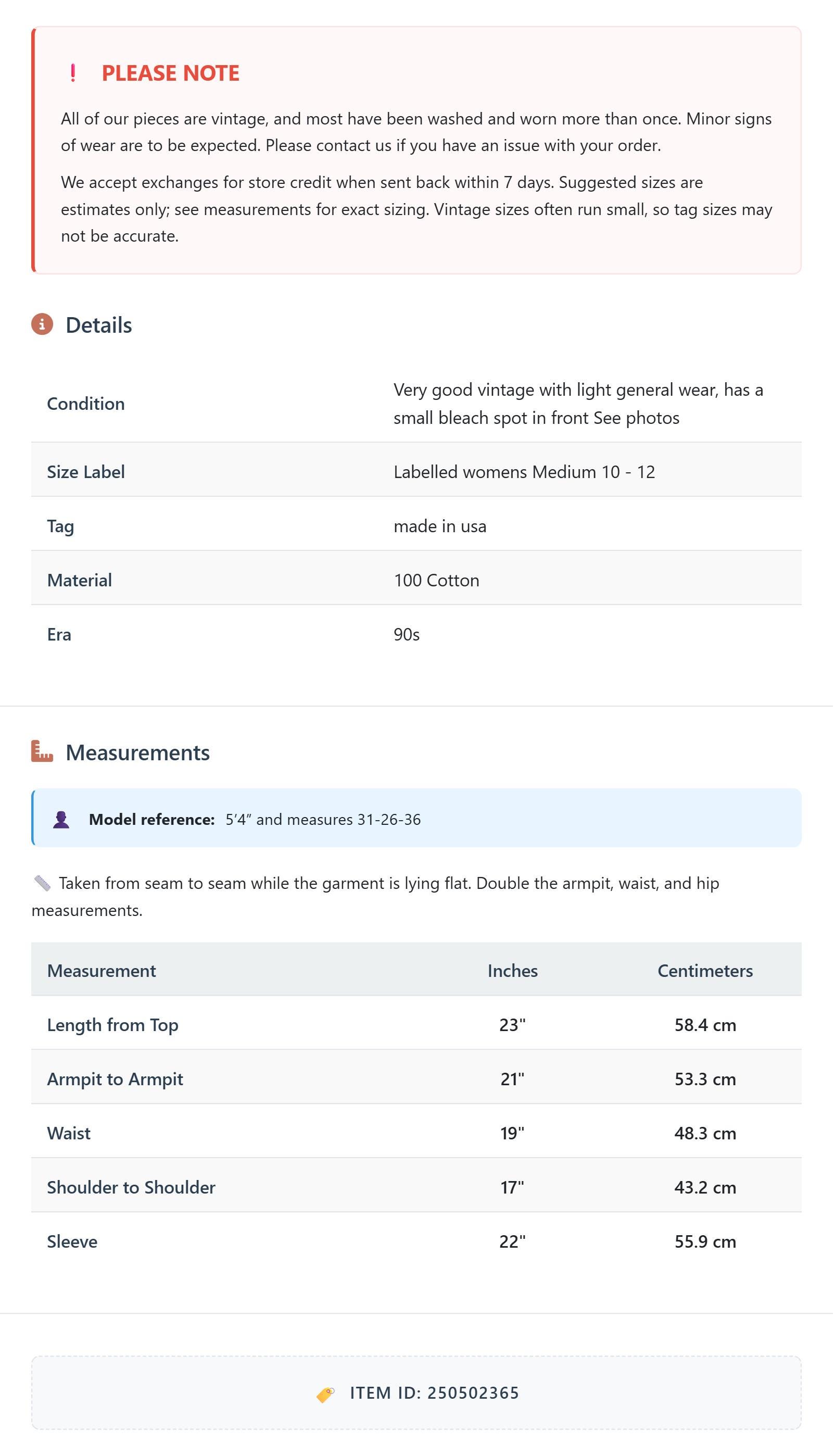 All of our pieces are vintage, and most have been washed and worn more than once. Minor signs of wear are to be expected. Please contact us if you have an issue with your order. We accept exchanges for store credit when sent back within 7 days.