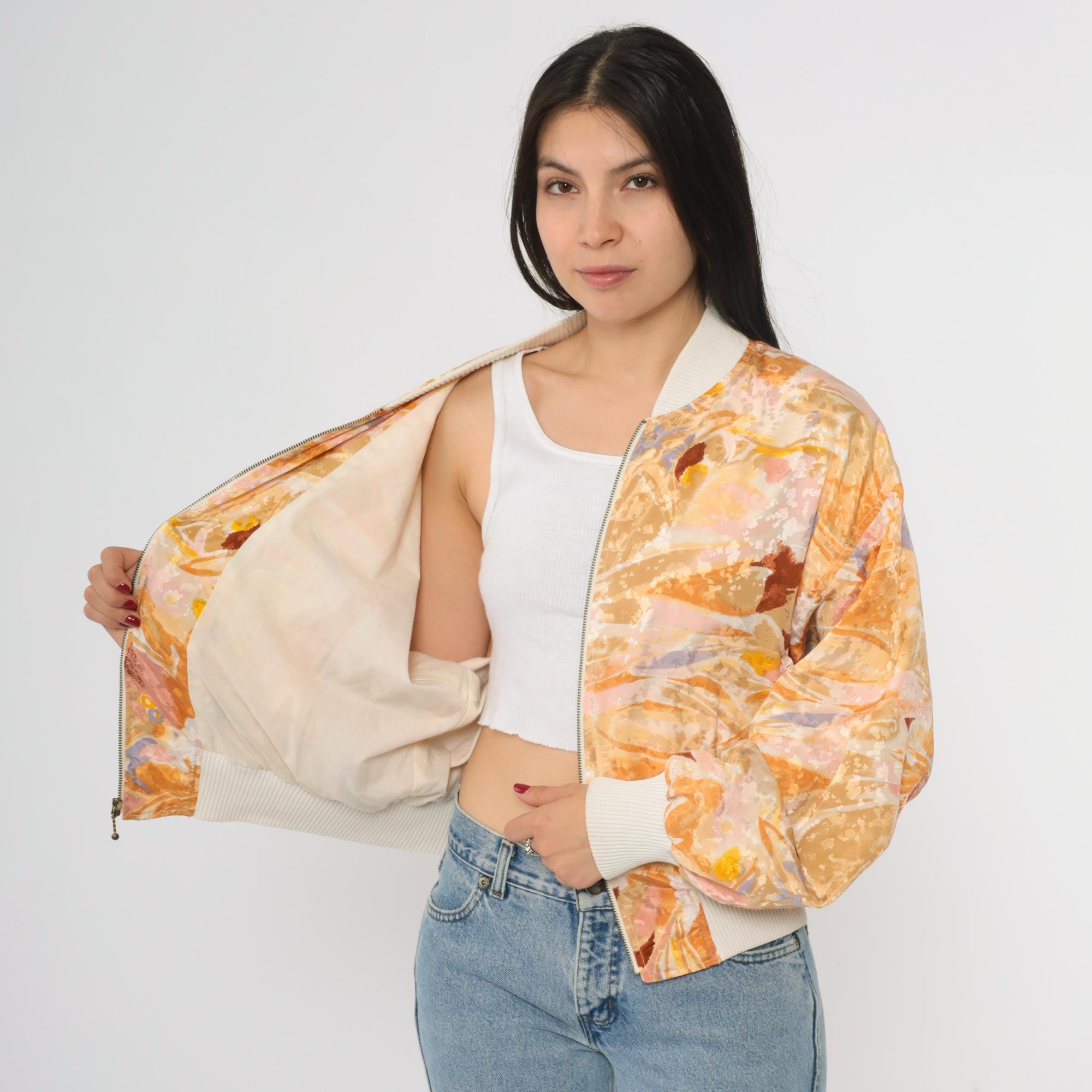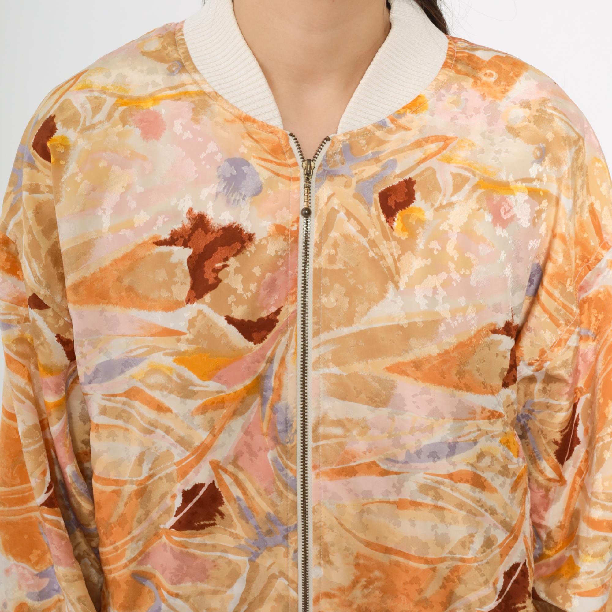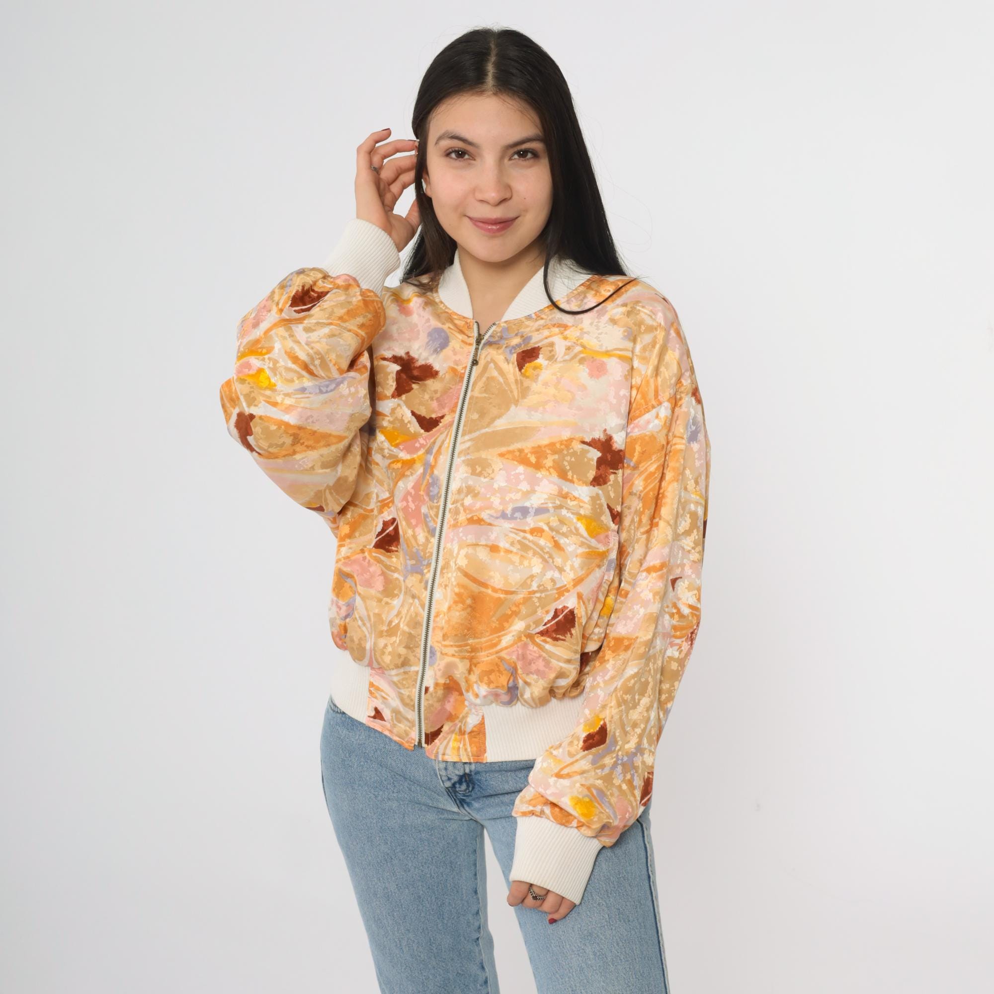 90s Hanasport bomber jacket in abstract watercolor print featuring peach, orange, pink, yellow, burgundy and lavender tones. Full zip front with cream ribbed collar, cuffs, and hem. Classic bomber silhouette with roomy sleeves. Fully lined in cream fabric.