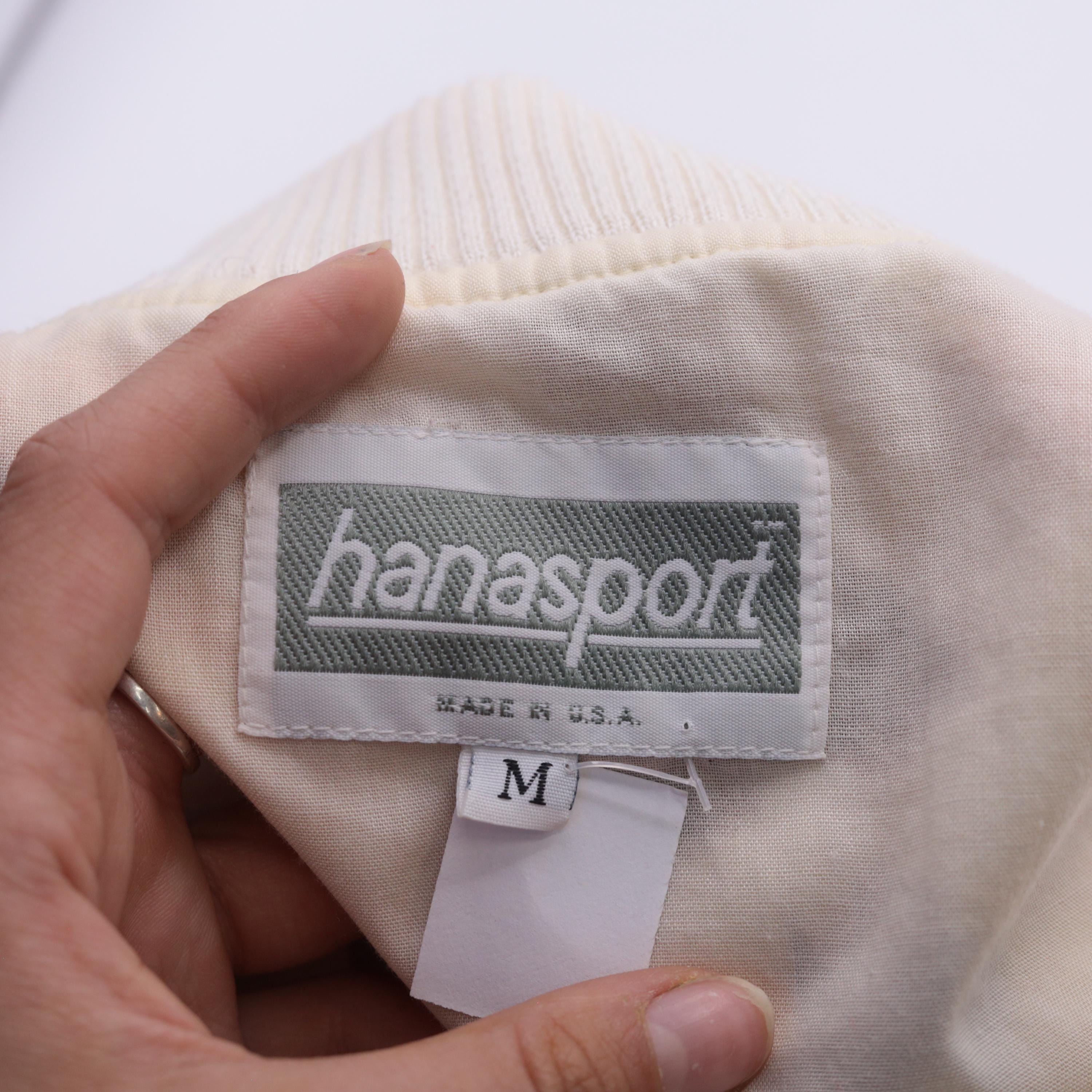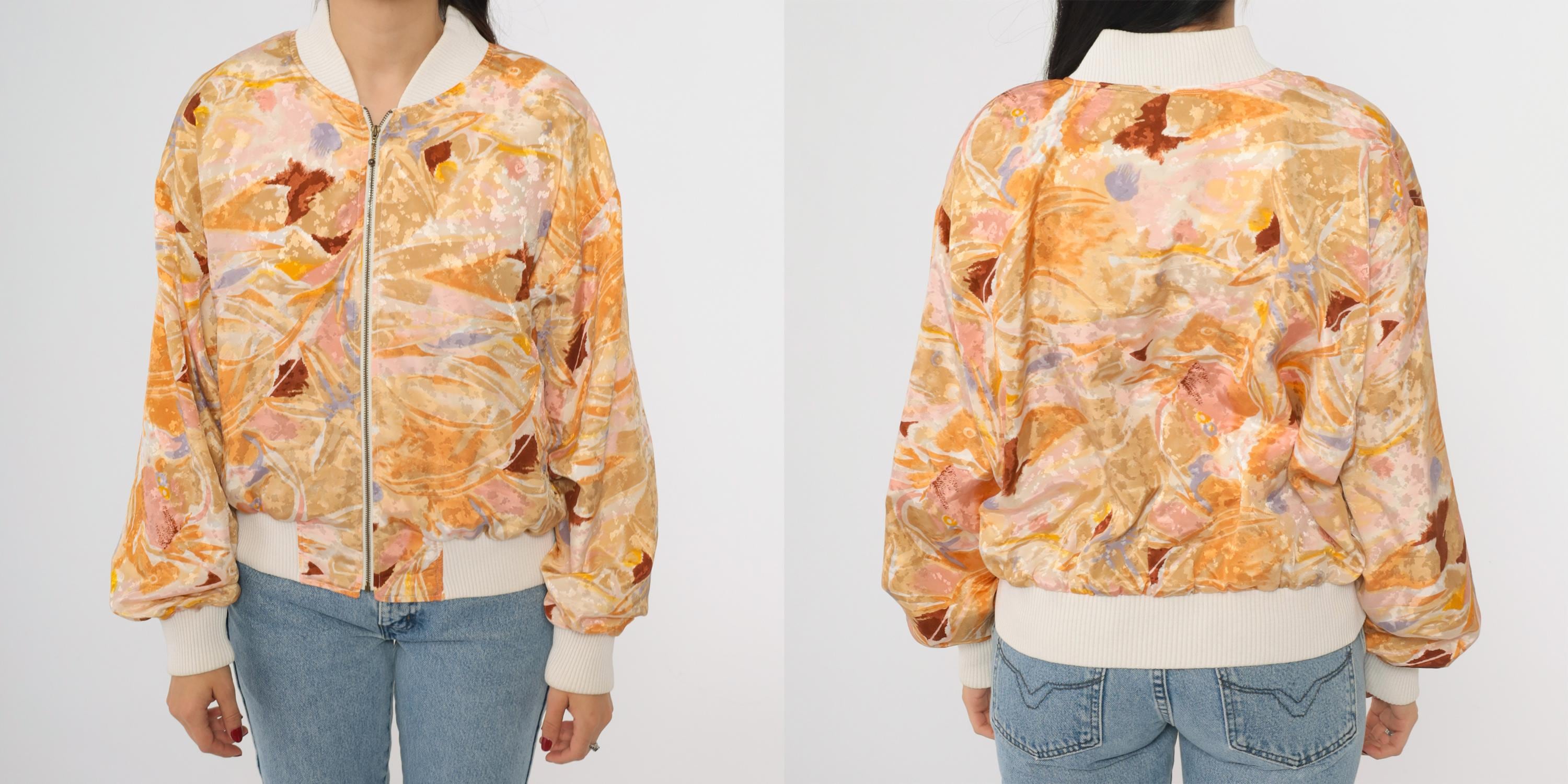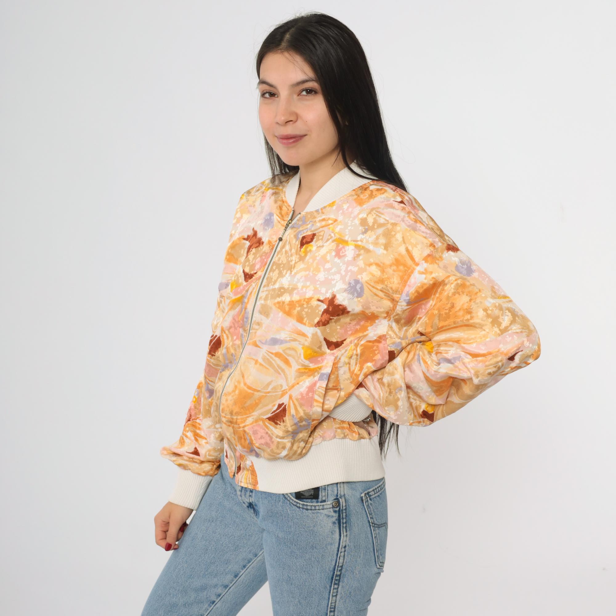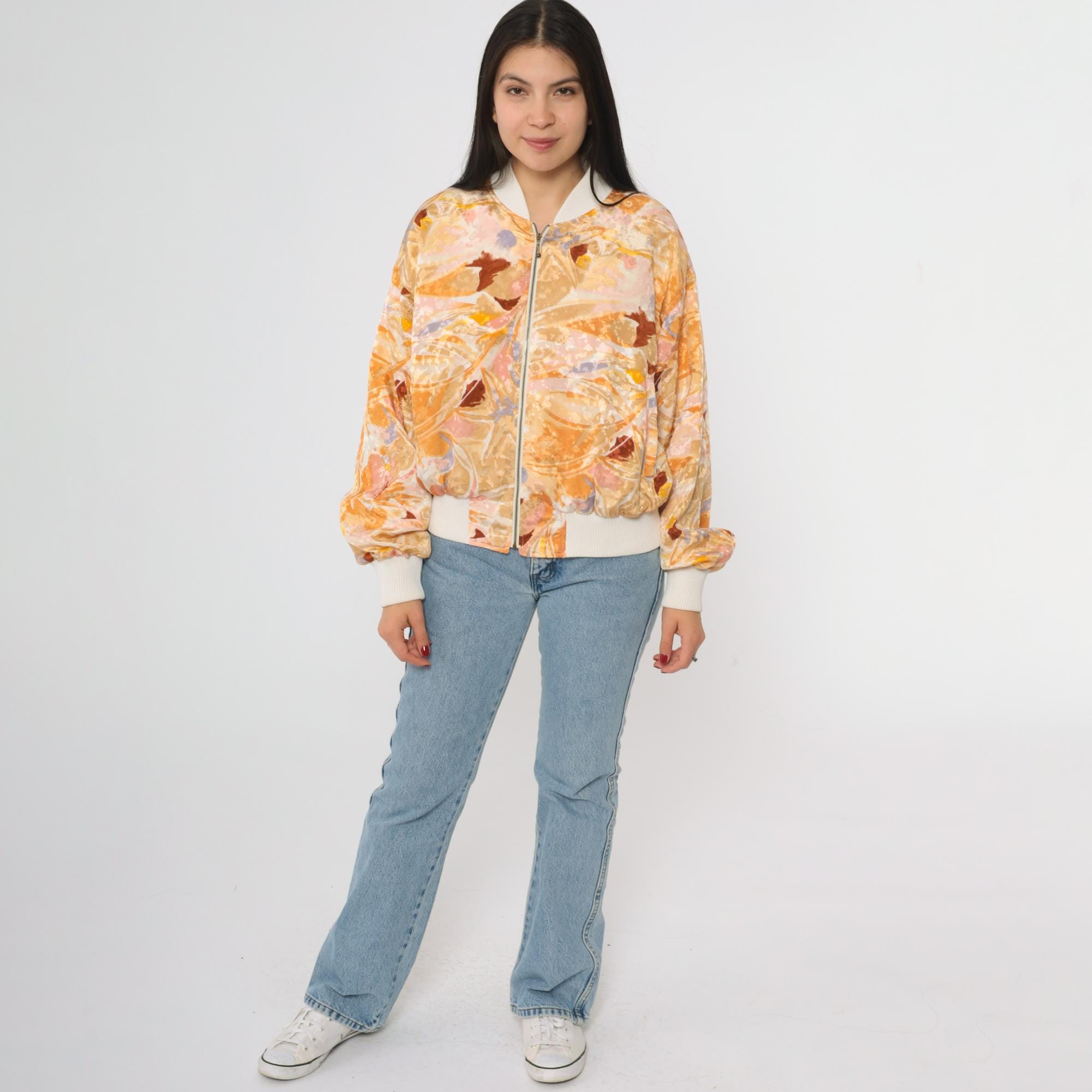 90s Hanasport bomber jacket in abstract watercolor print featuring peach, orange, pink, yellow, burgundy and lavender tones. Full zip front with cream ribbed collar, cuffs, and hem. Classic bomber silhouette with roomy sleeves. Fully lined in cream fabric.