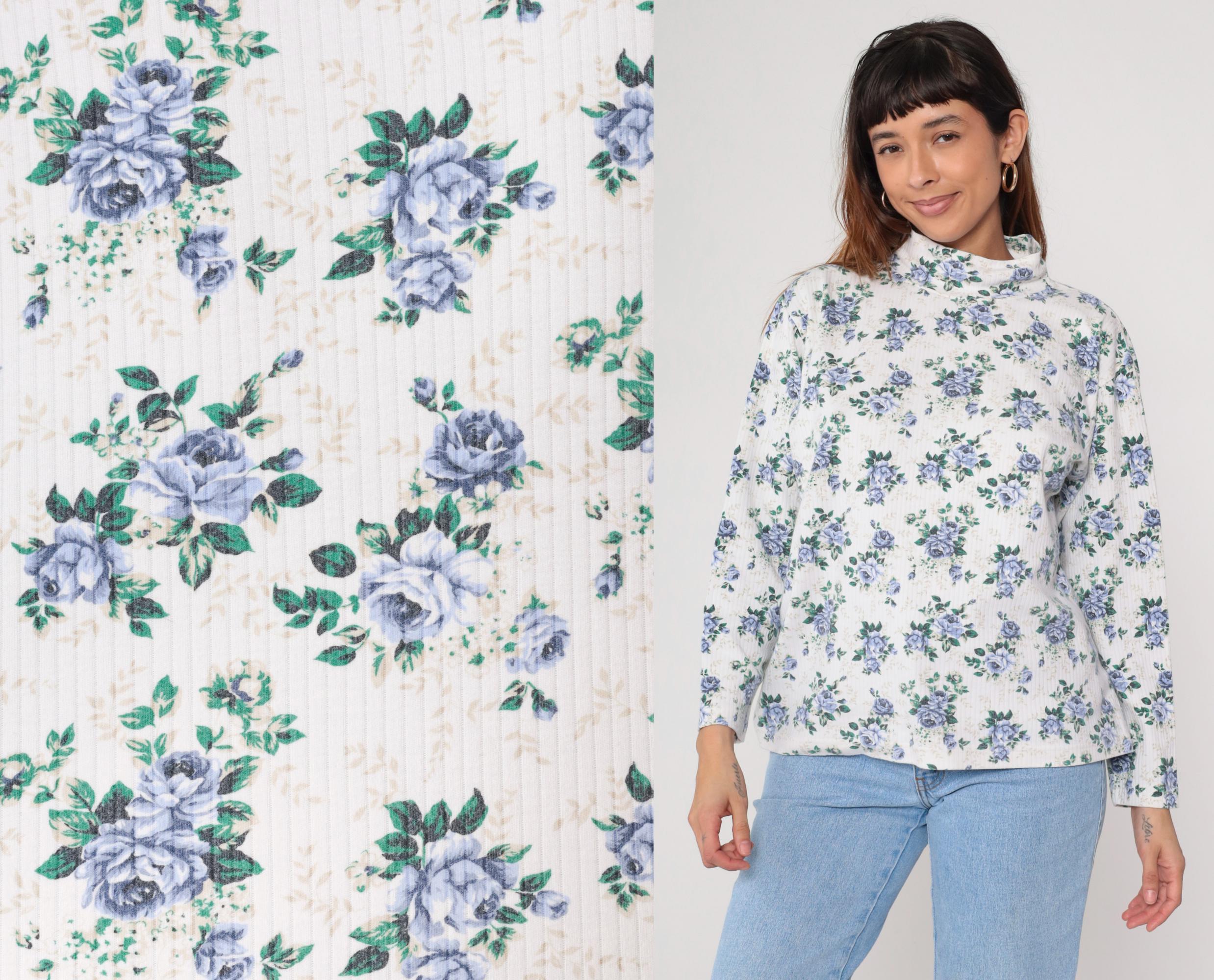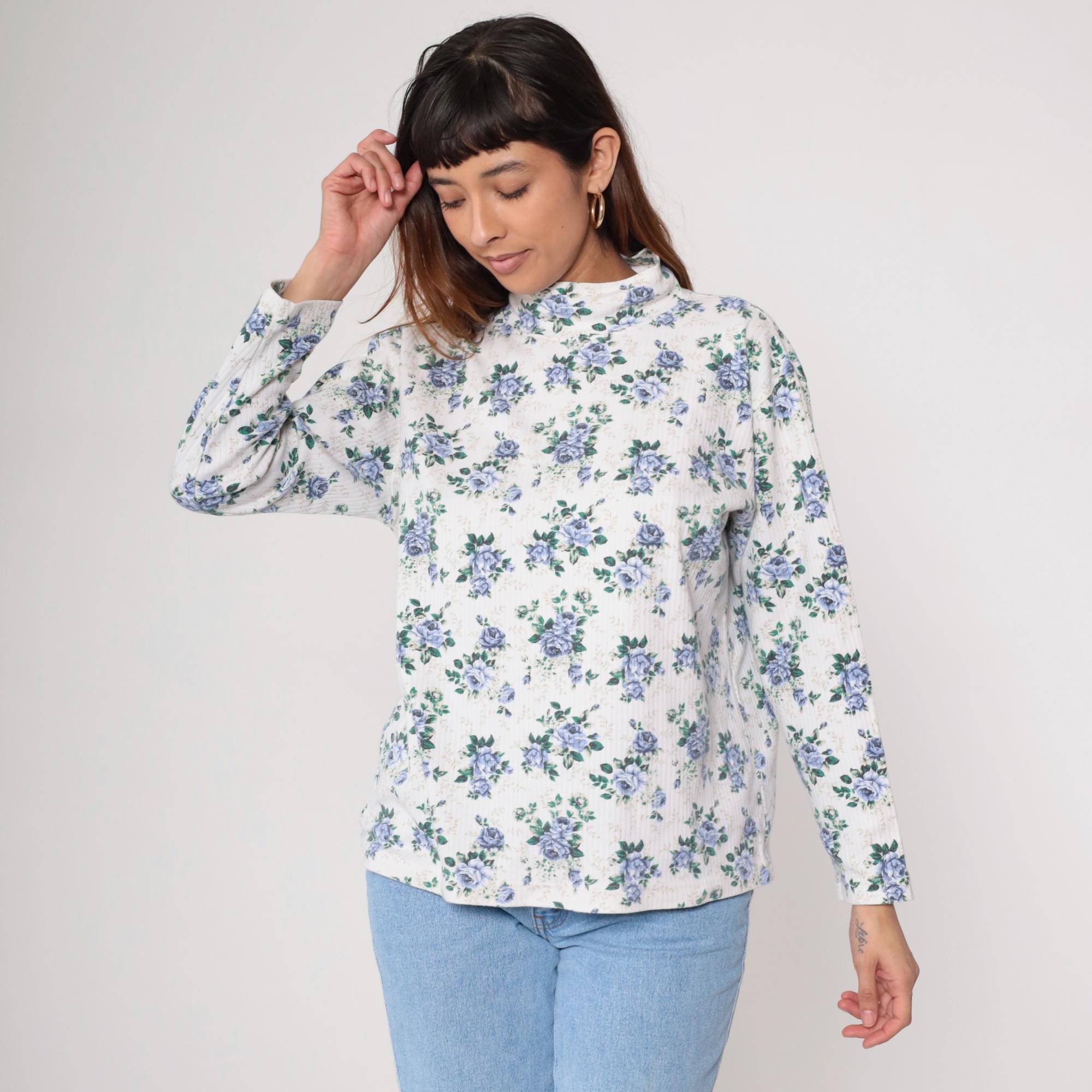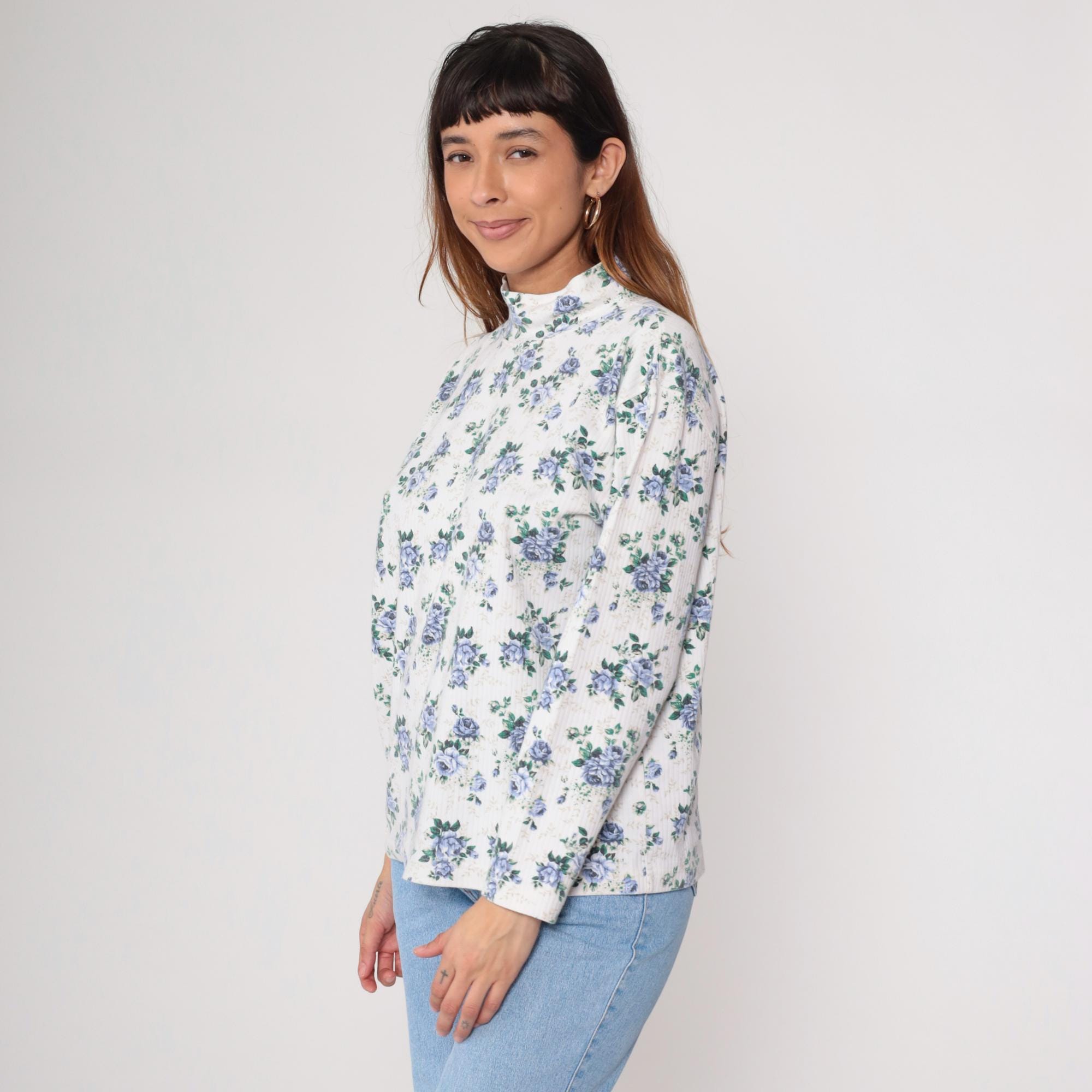 90s mock neck top featuring an all-over blue rose floral print on white textured fabric. This vintage piece has a high collar, long sleeves, and relaxed boxy fit.