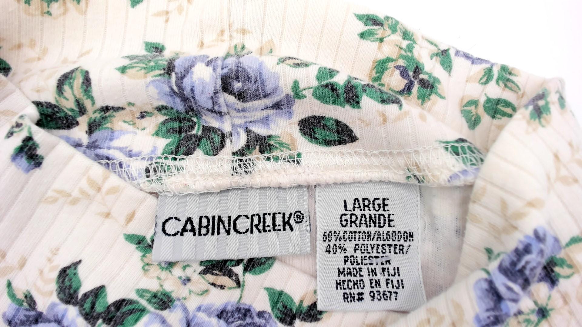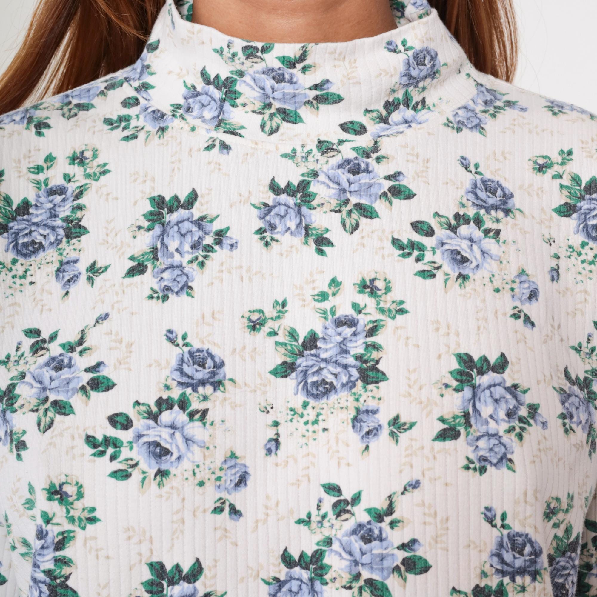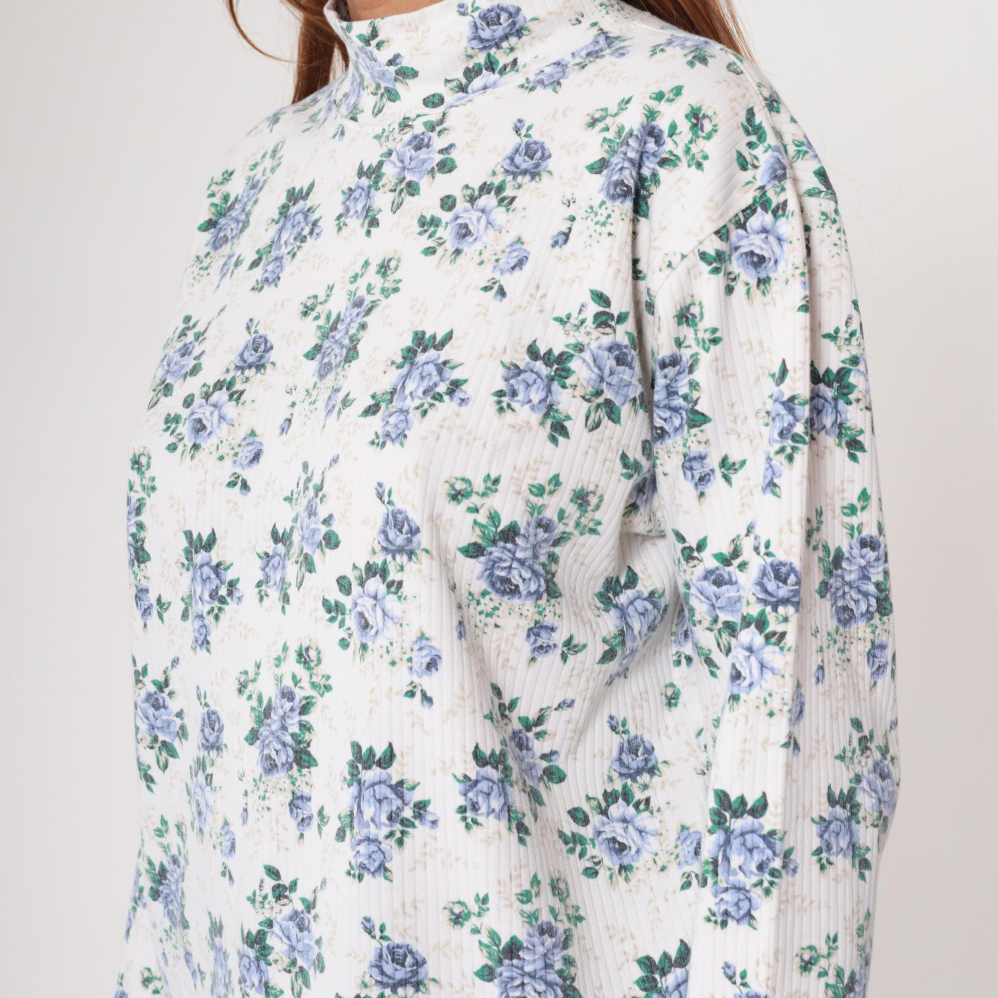90s mock neck top featuring an all-over blue rose floral print on white textured fabric. This vintage piece has a high collar, long sleeves, and relaxed boxy fit.