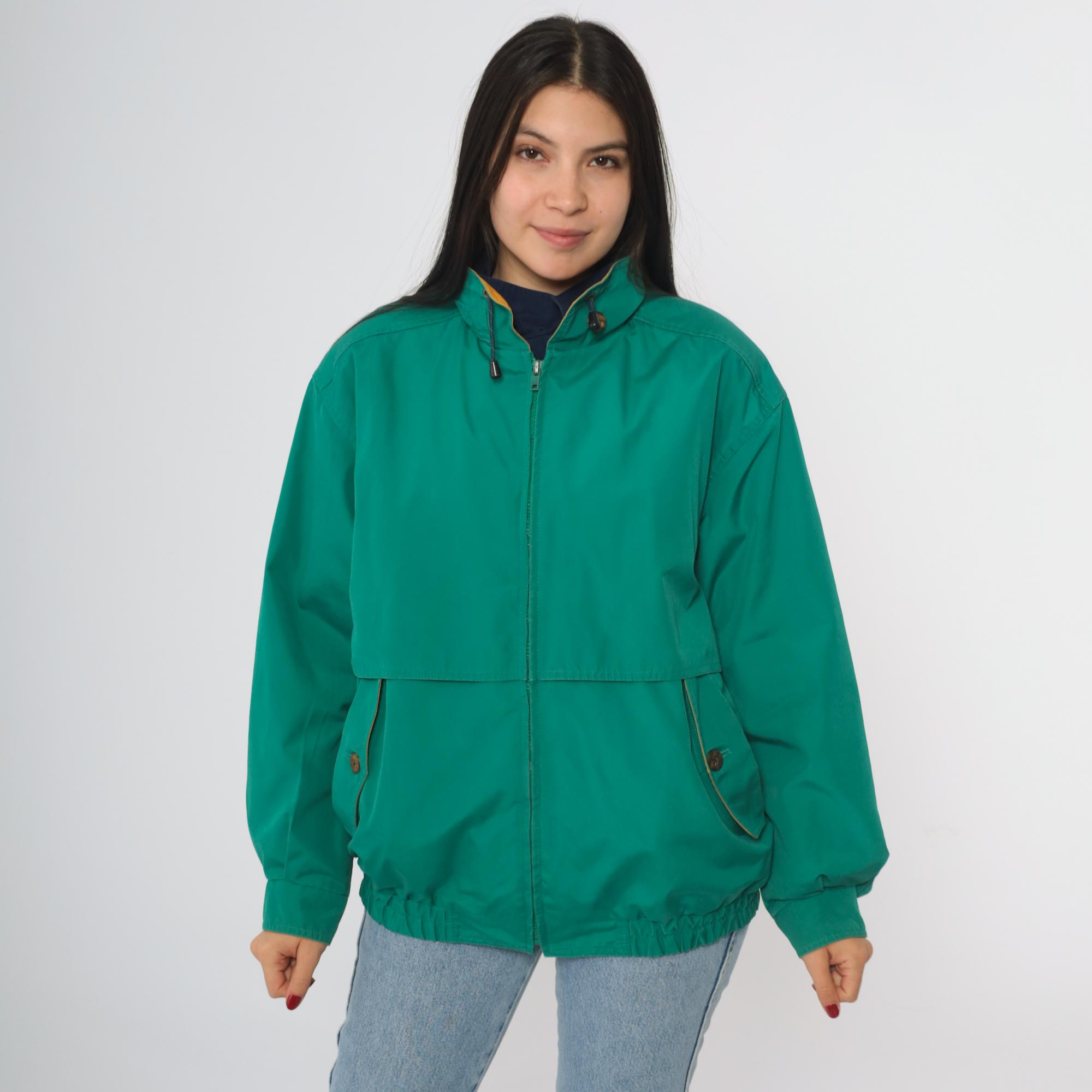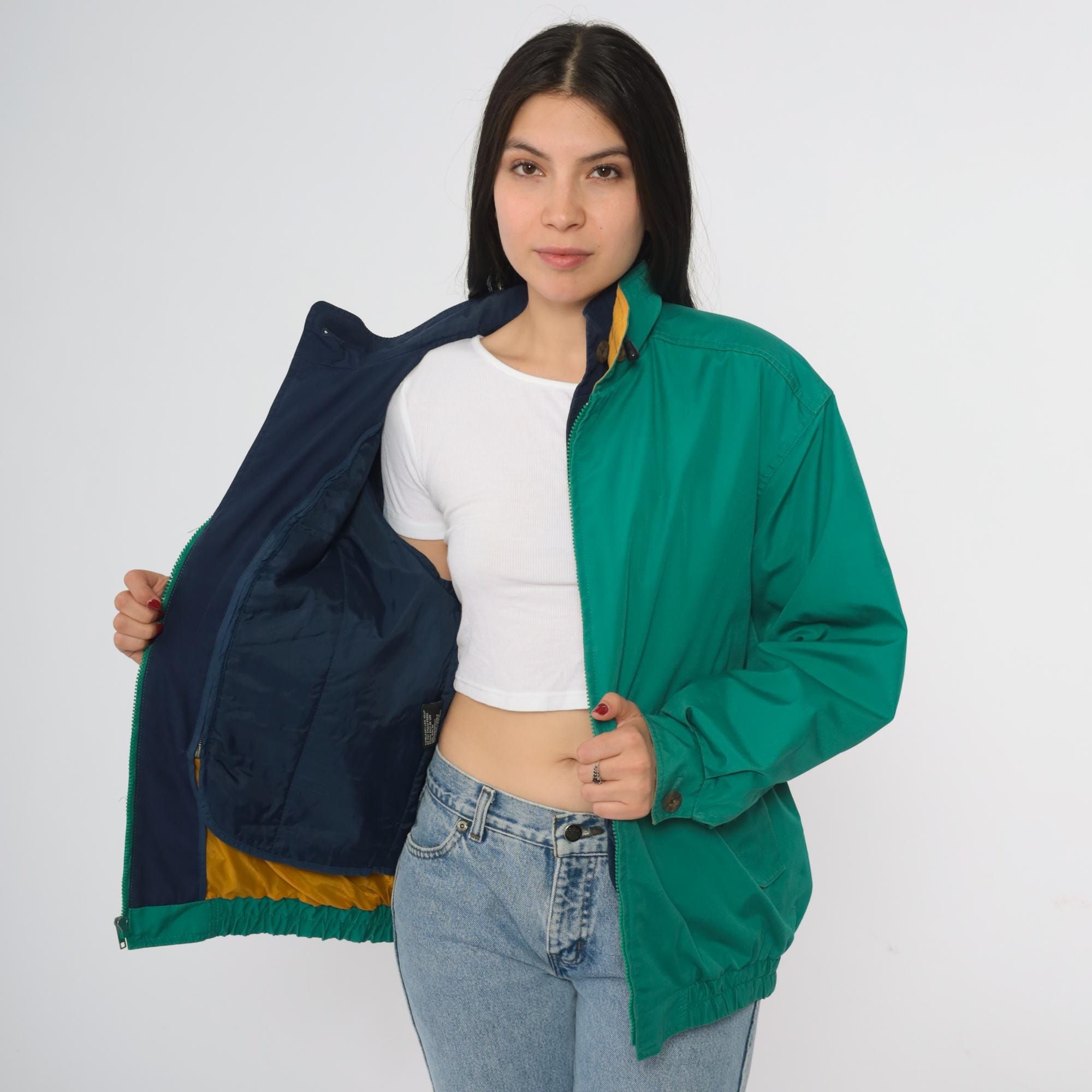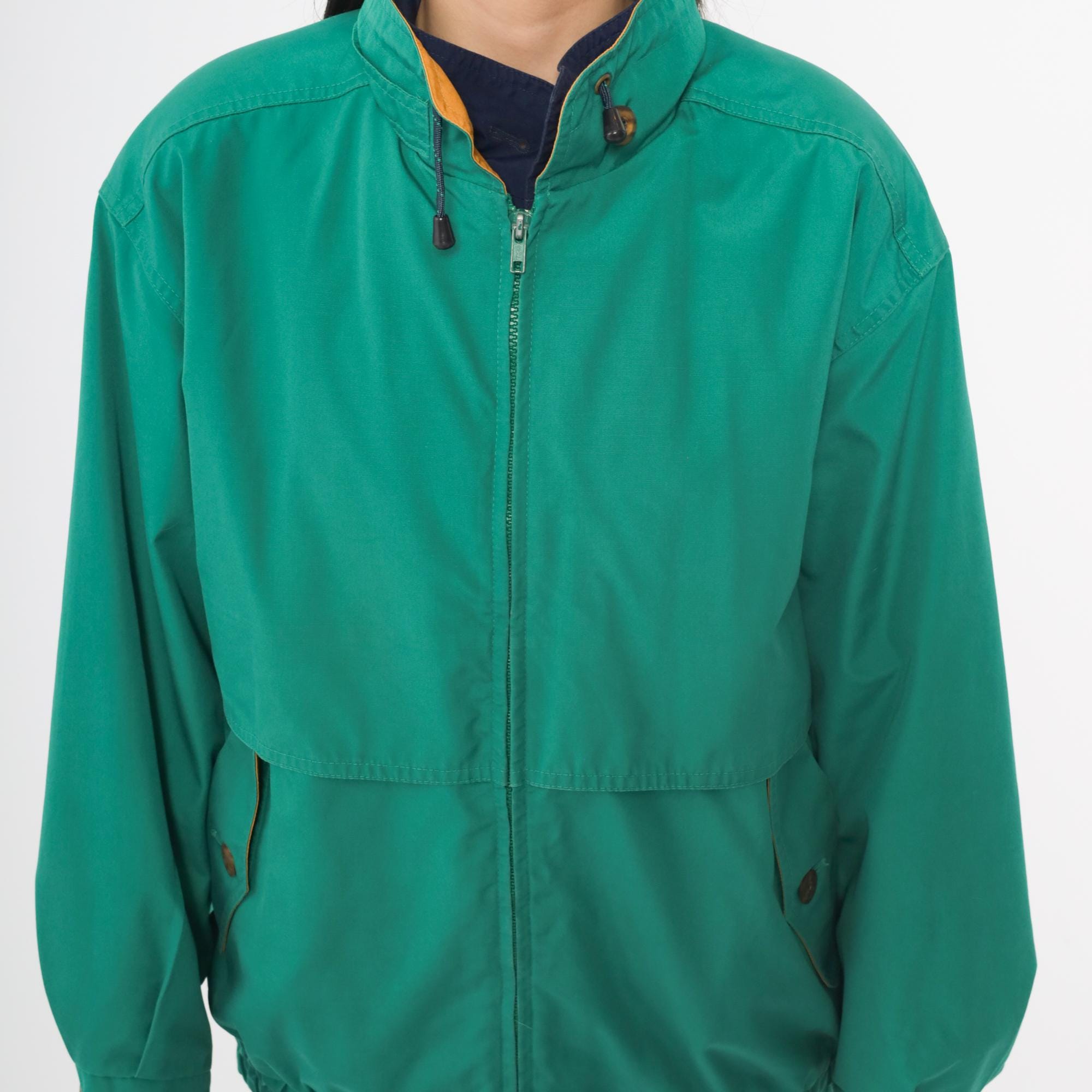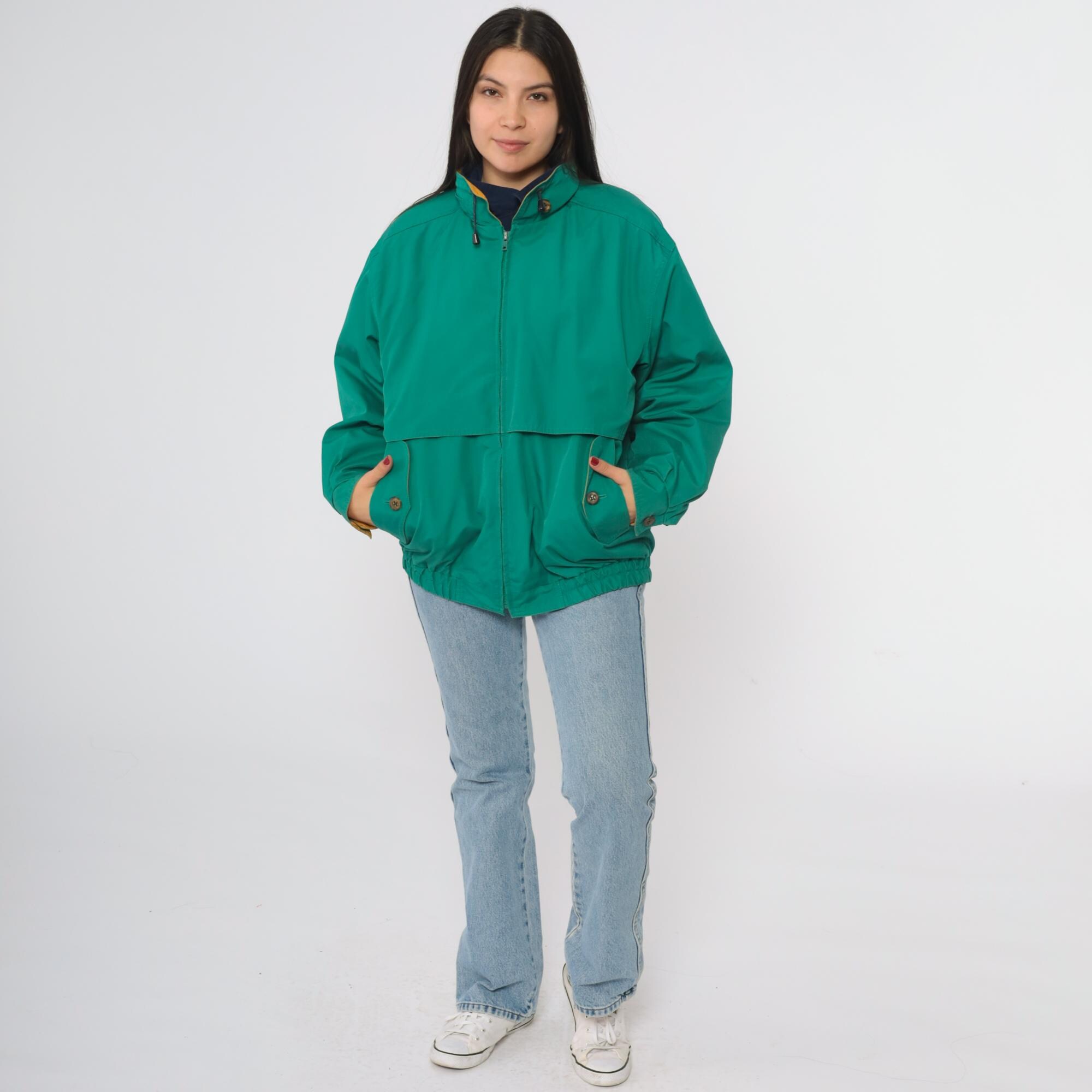 90s London Fog jacket in green nylon blend fabric with contrasting navy and gold lining. Features a zip front closure, stand collar with drawcord, buttoned side pockets, and elastic hem and cuffs.