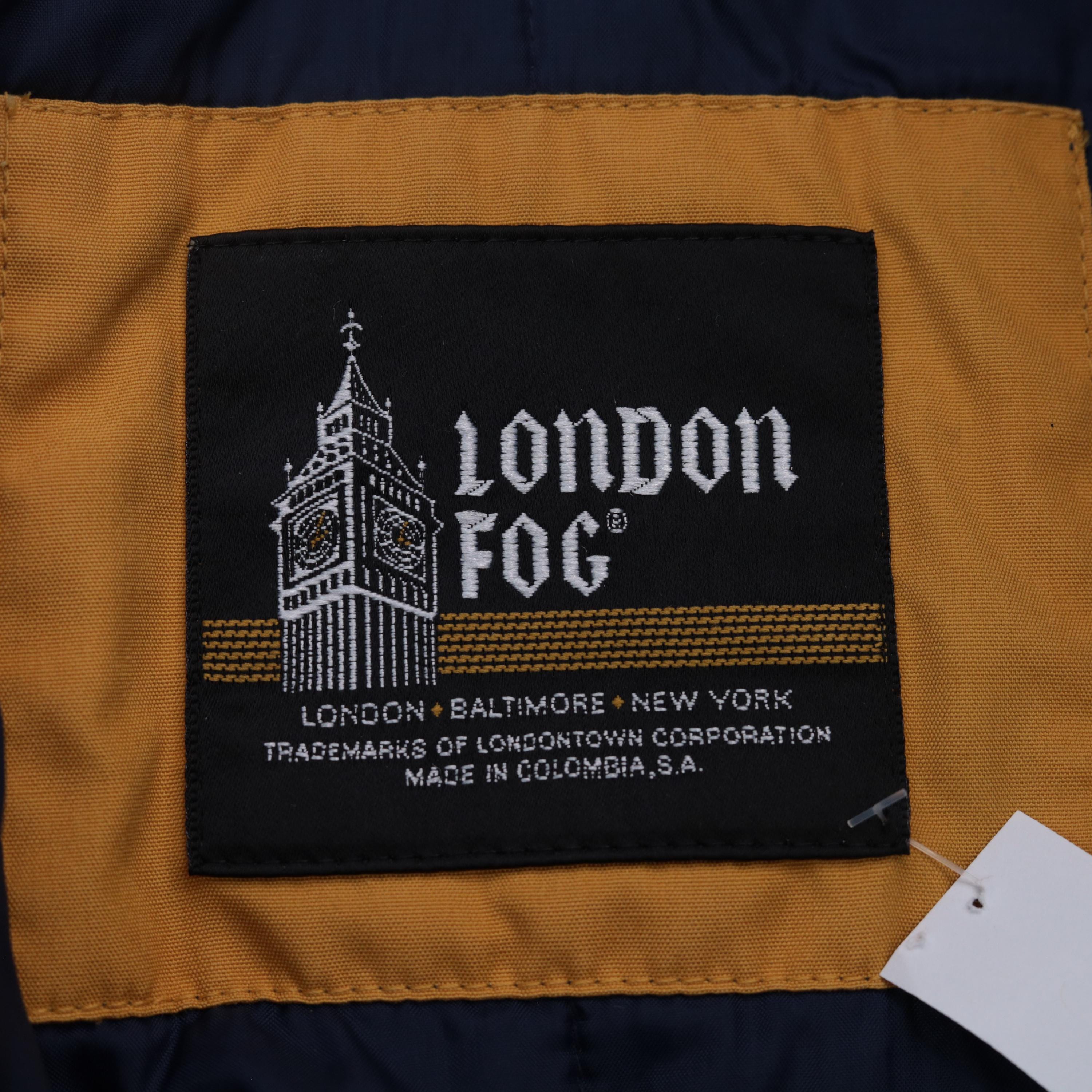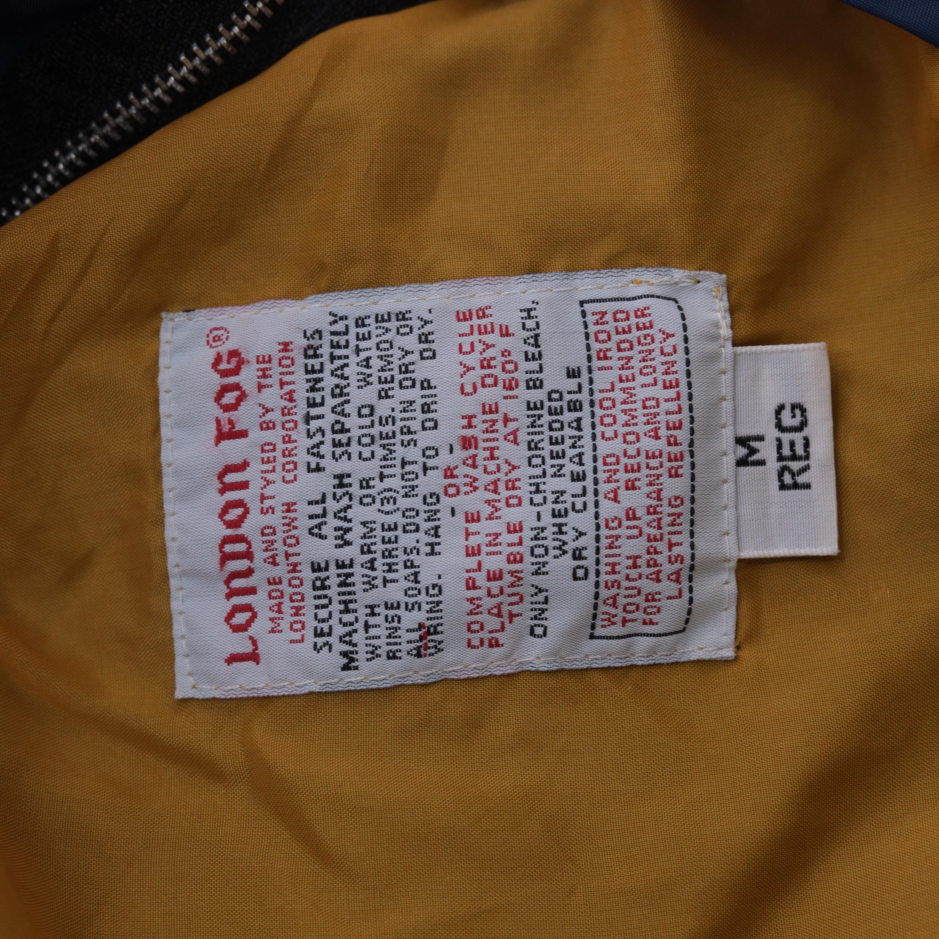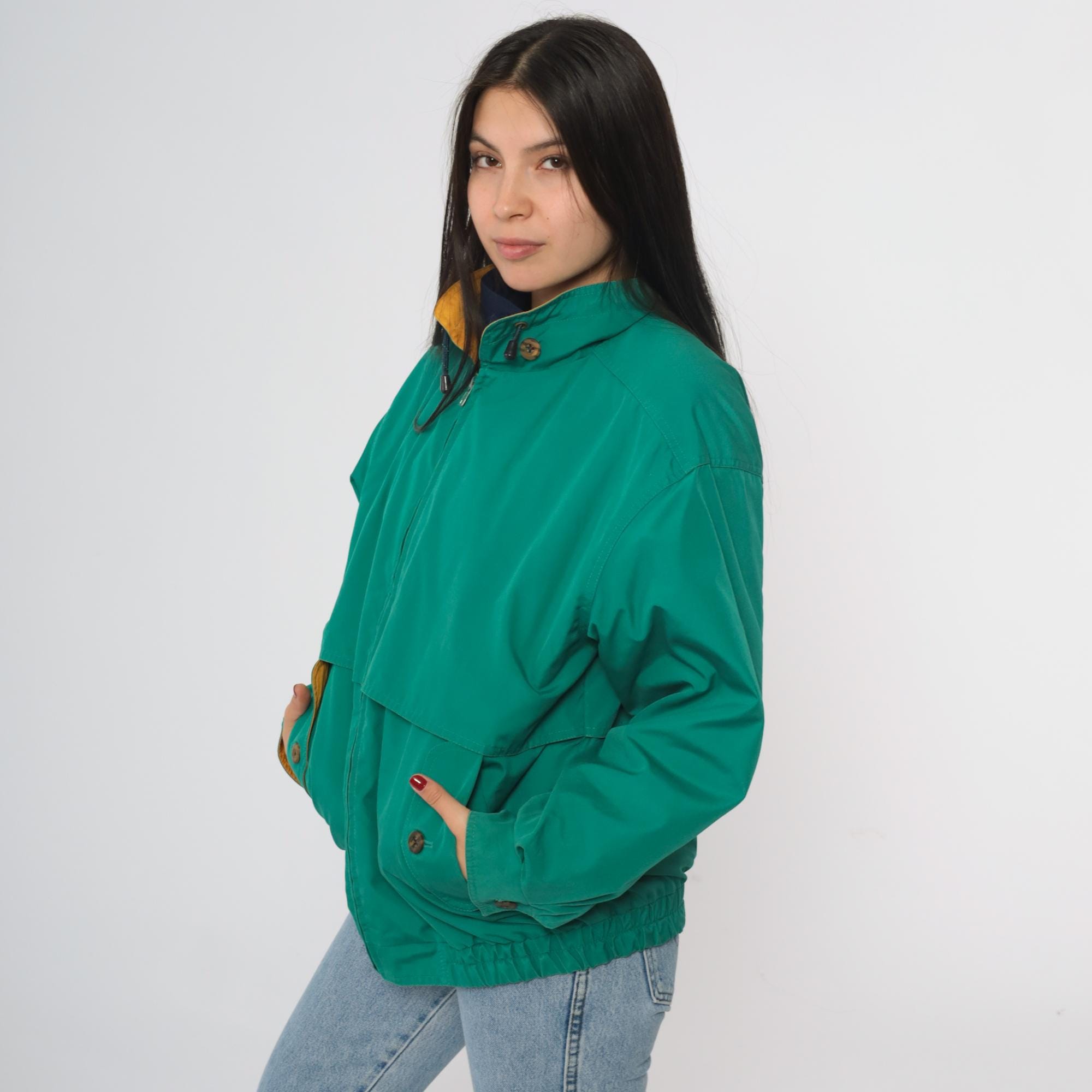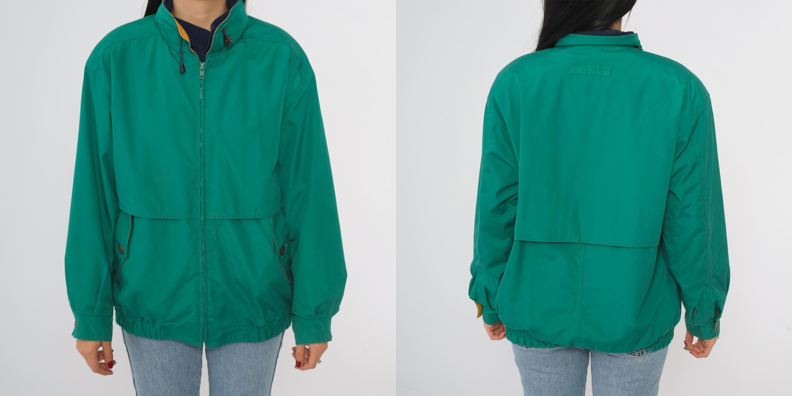 90s London Fog jacket in green nylon blend fabric with contrasting navy and gold lining. Features a zip front closure, stand collar with drawcord, buttoned side pockets, and elastic hem and cuffs.