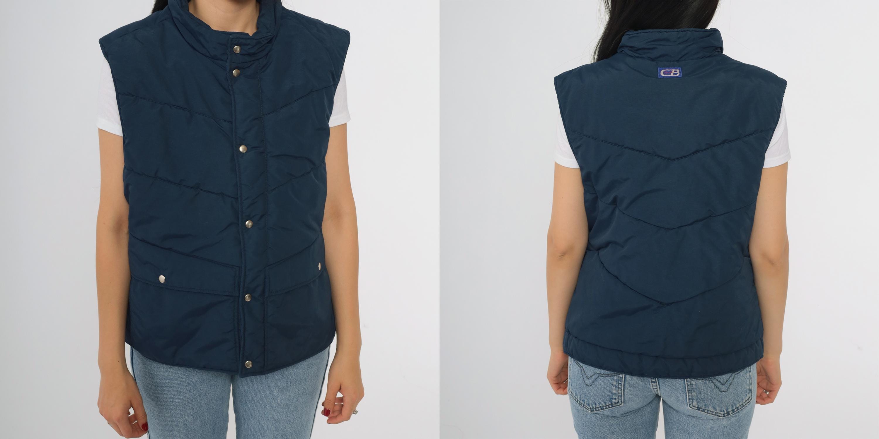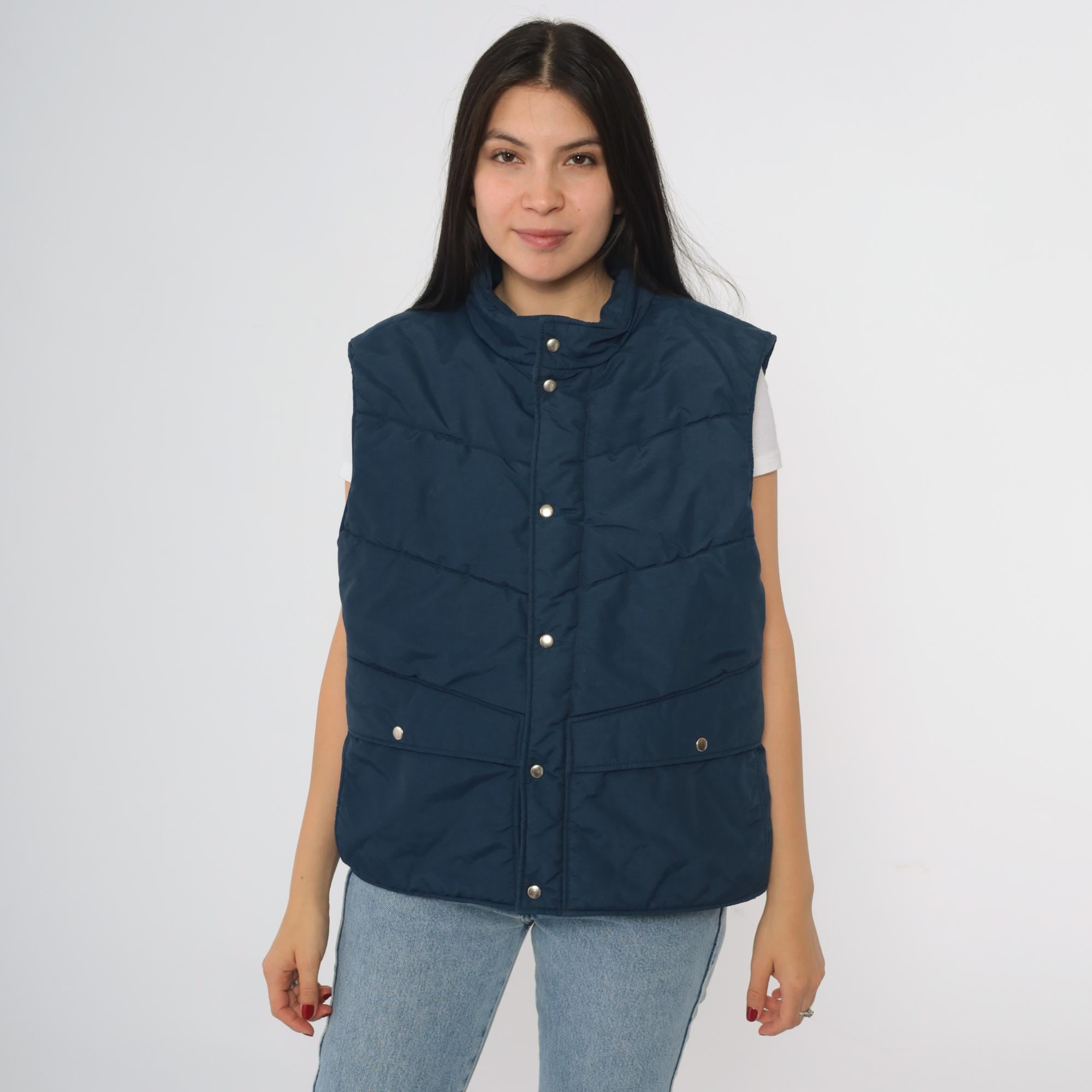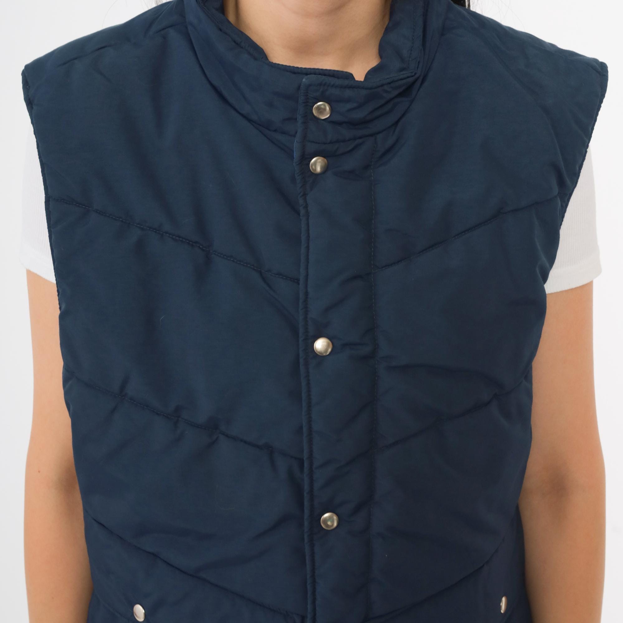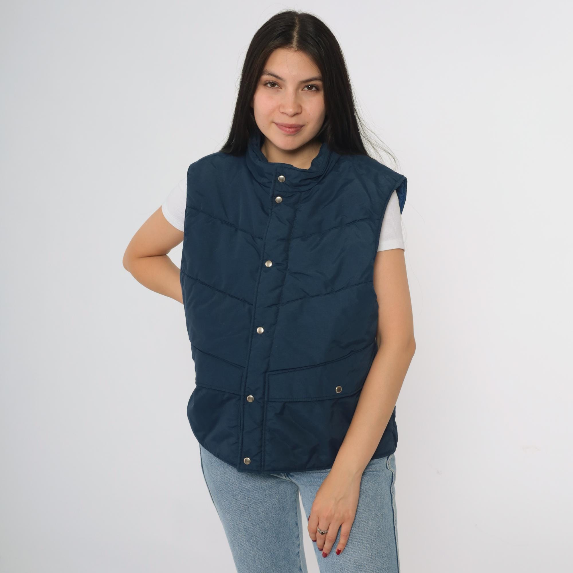 80s CB navy blue puffer vest featuring a quilted nylon shell and insulated interior. Designed with a high stand collar, snap front closure, and two front flap pockets.