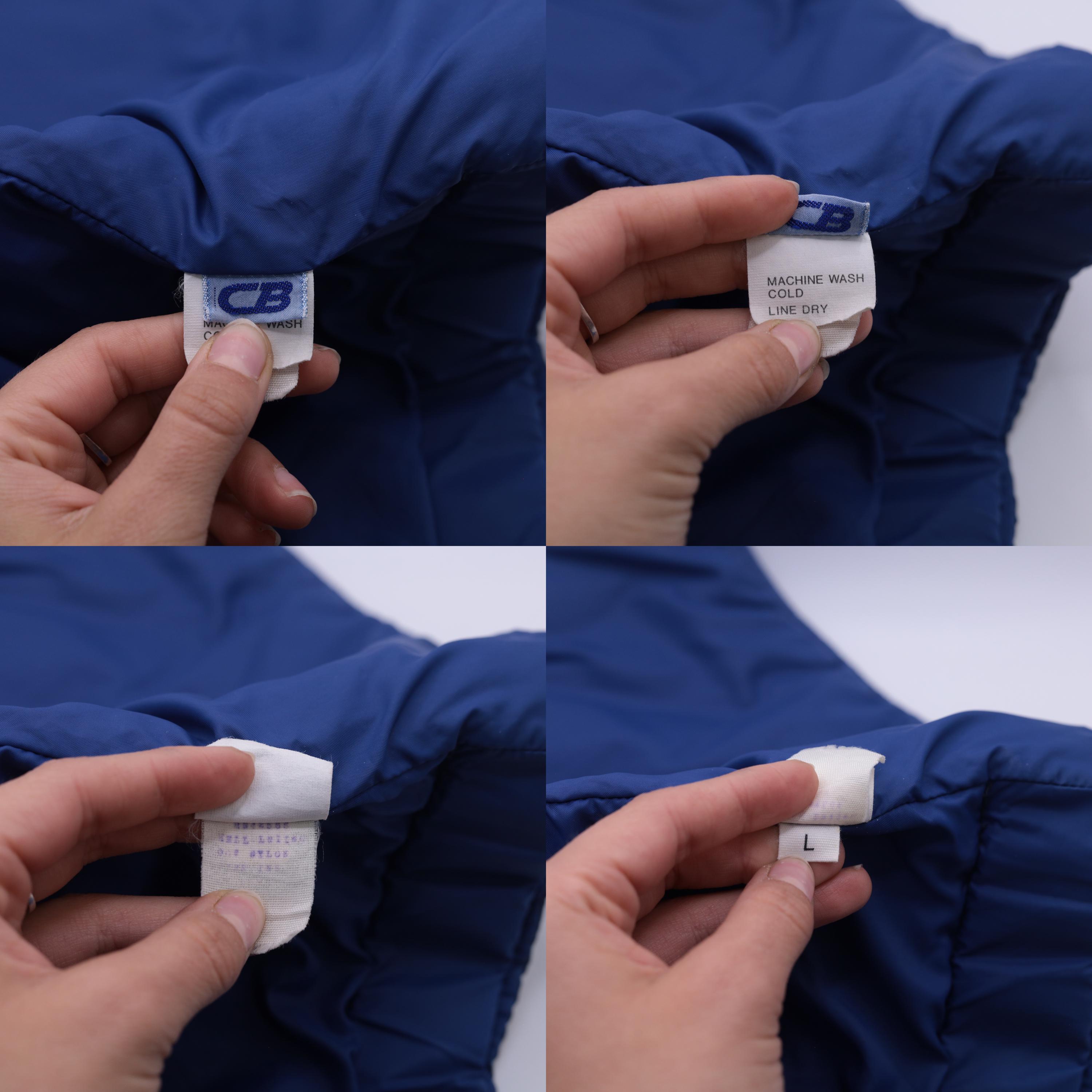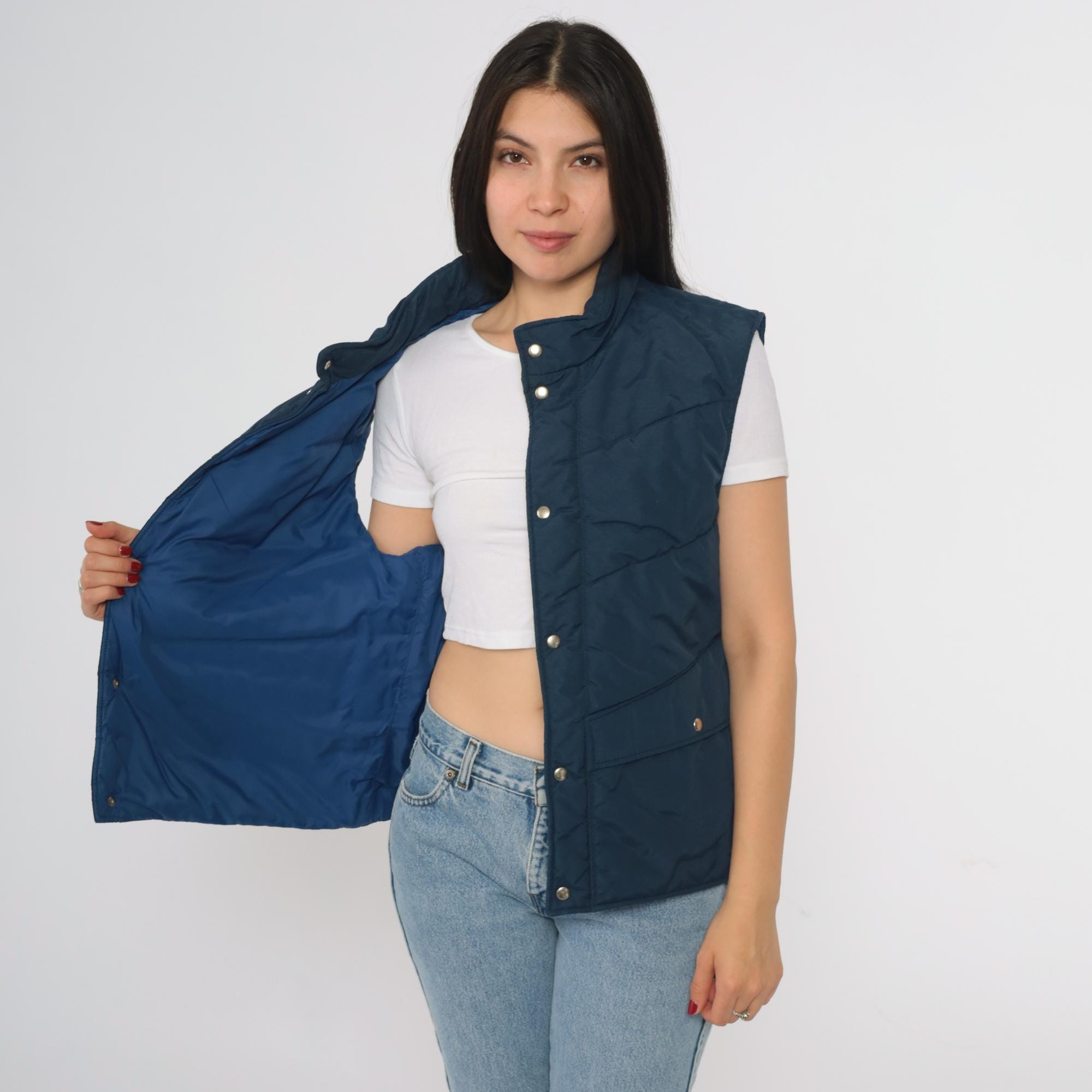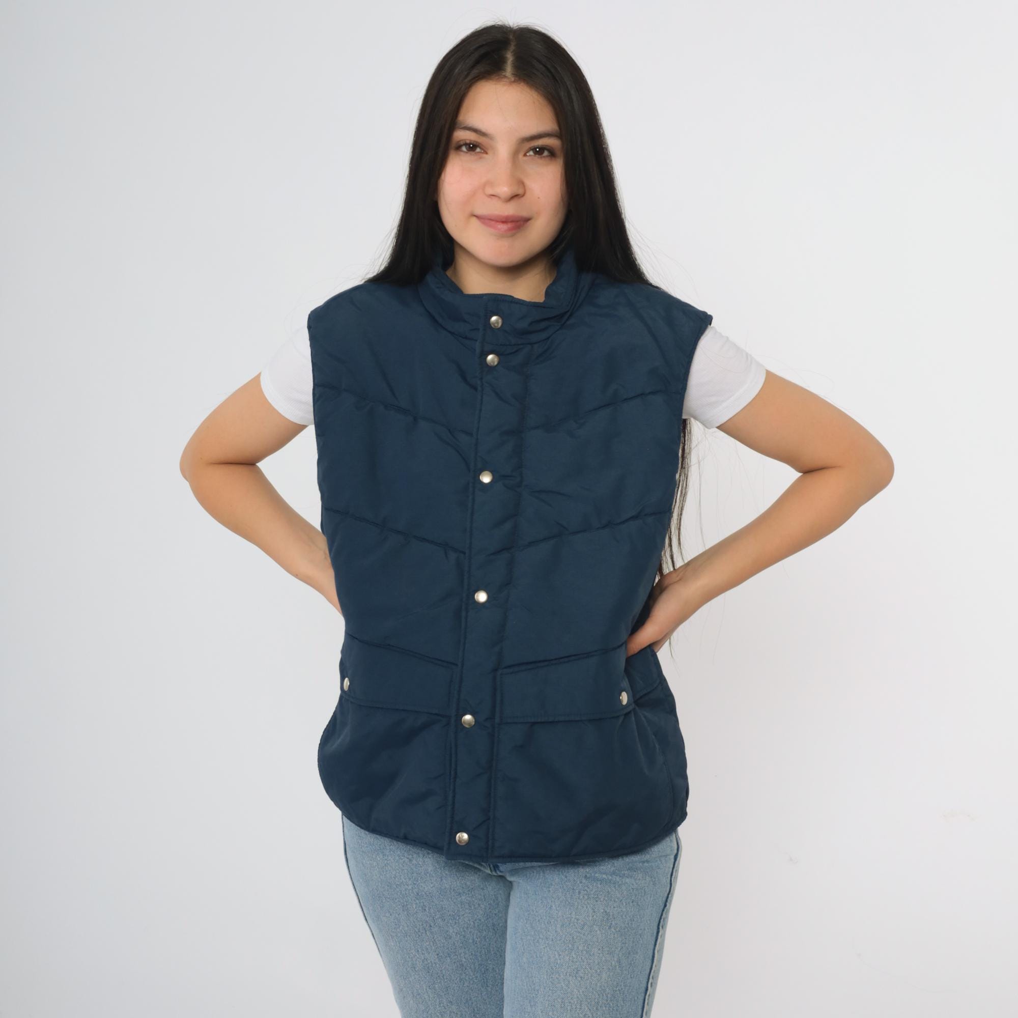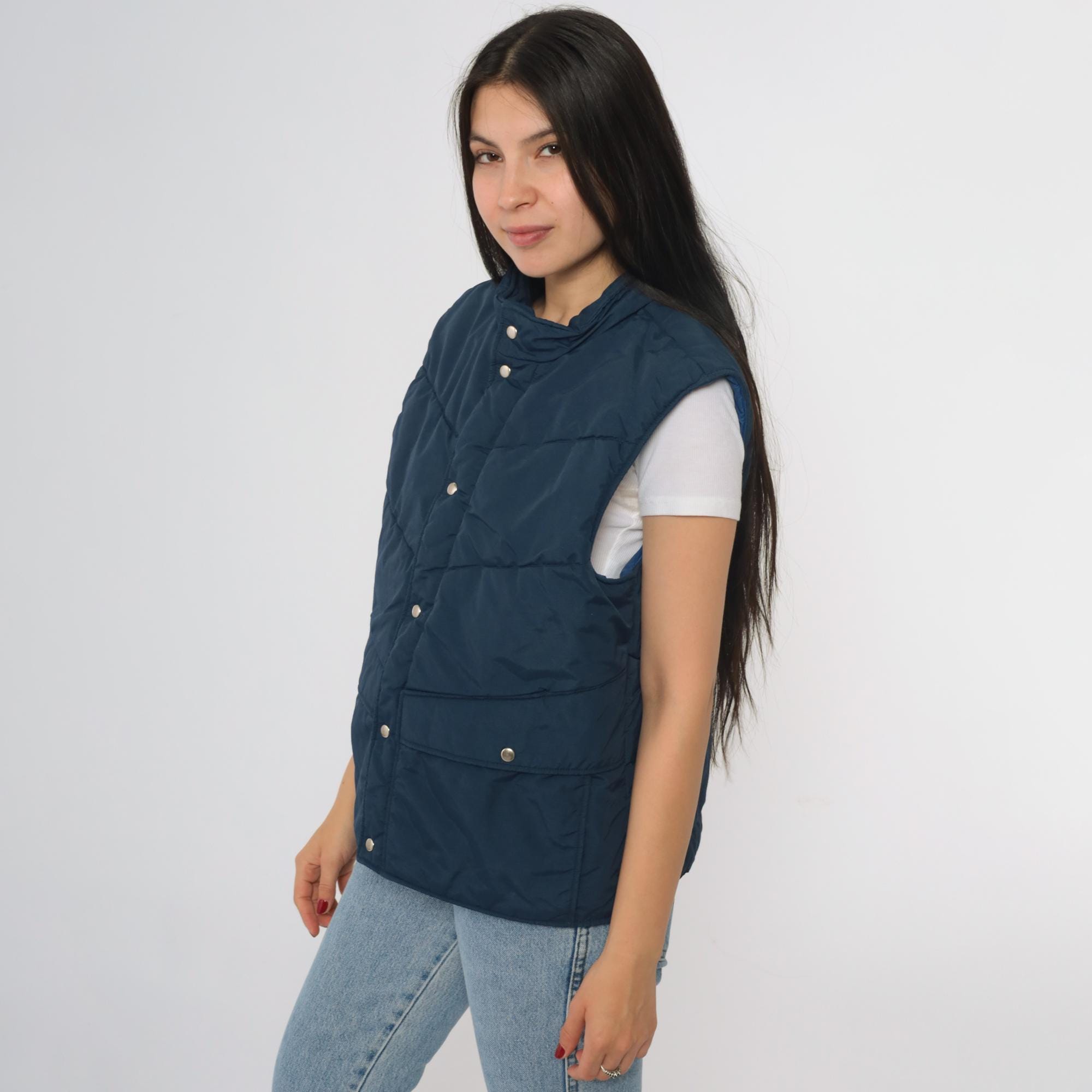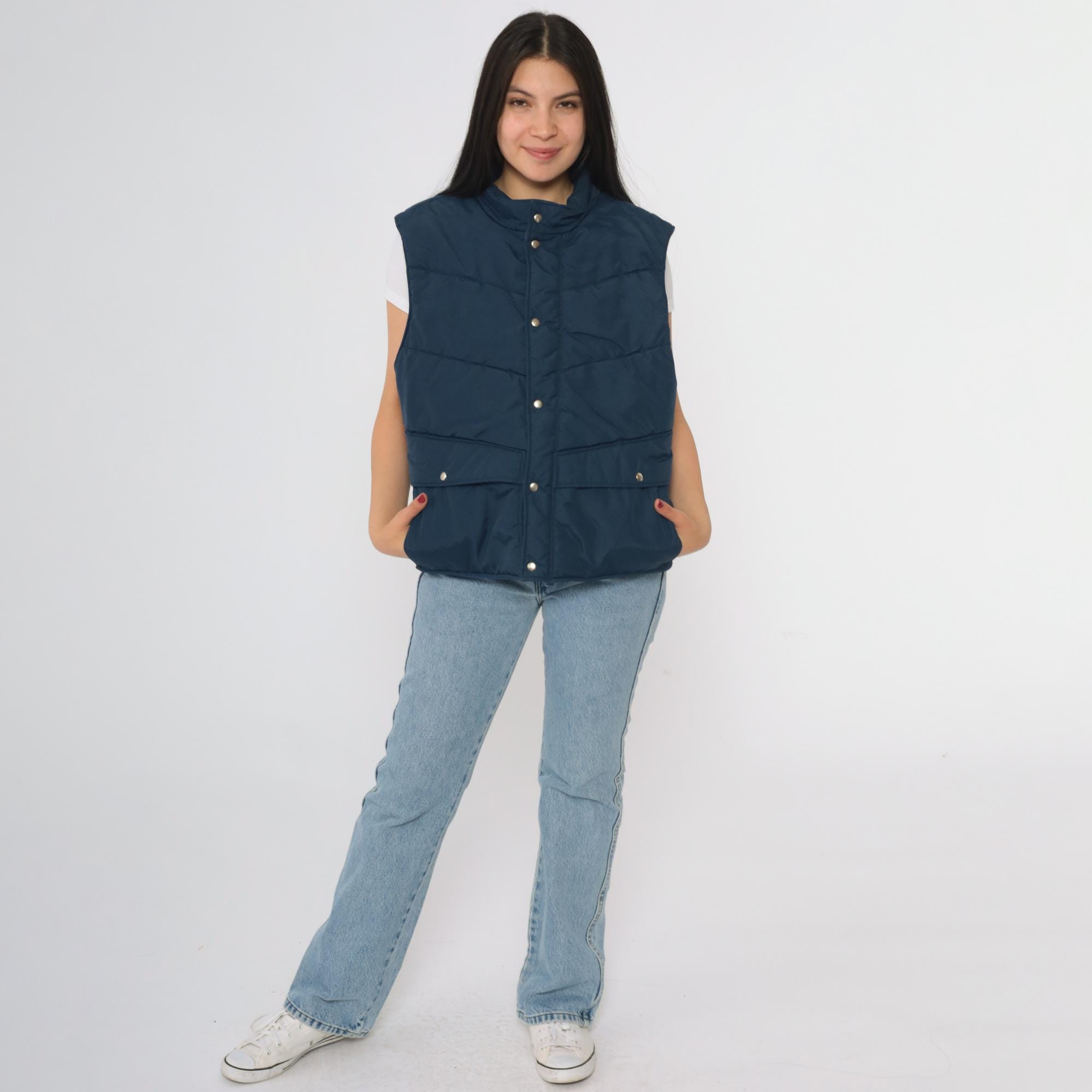 80s CB navy blue puffer vest featuring a quilted nylon shell and insulated interior. Designed with a high stand collar, snap front closure, and two front flap pockets.