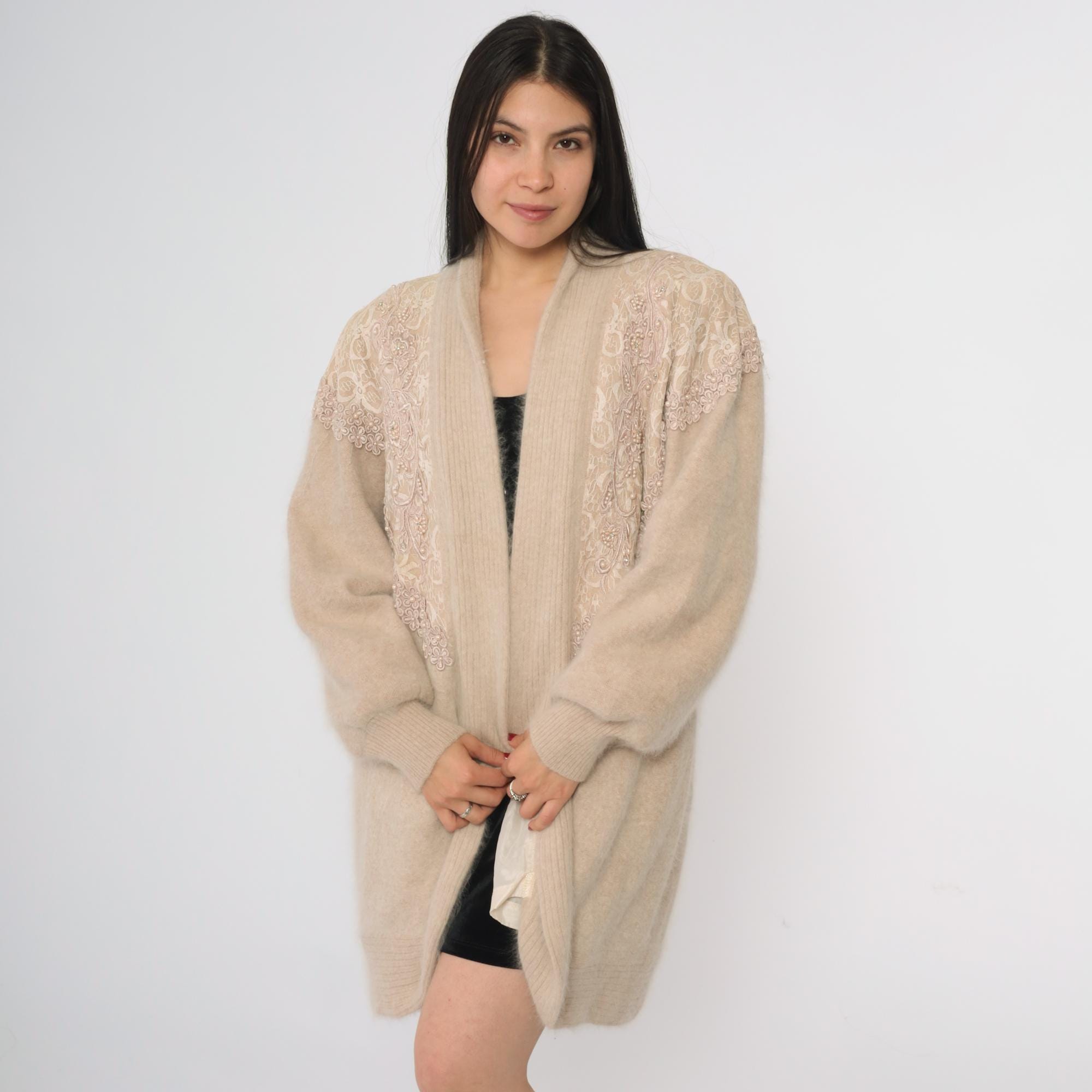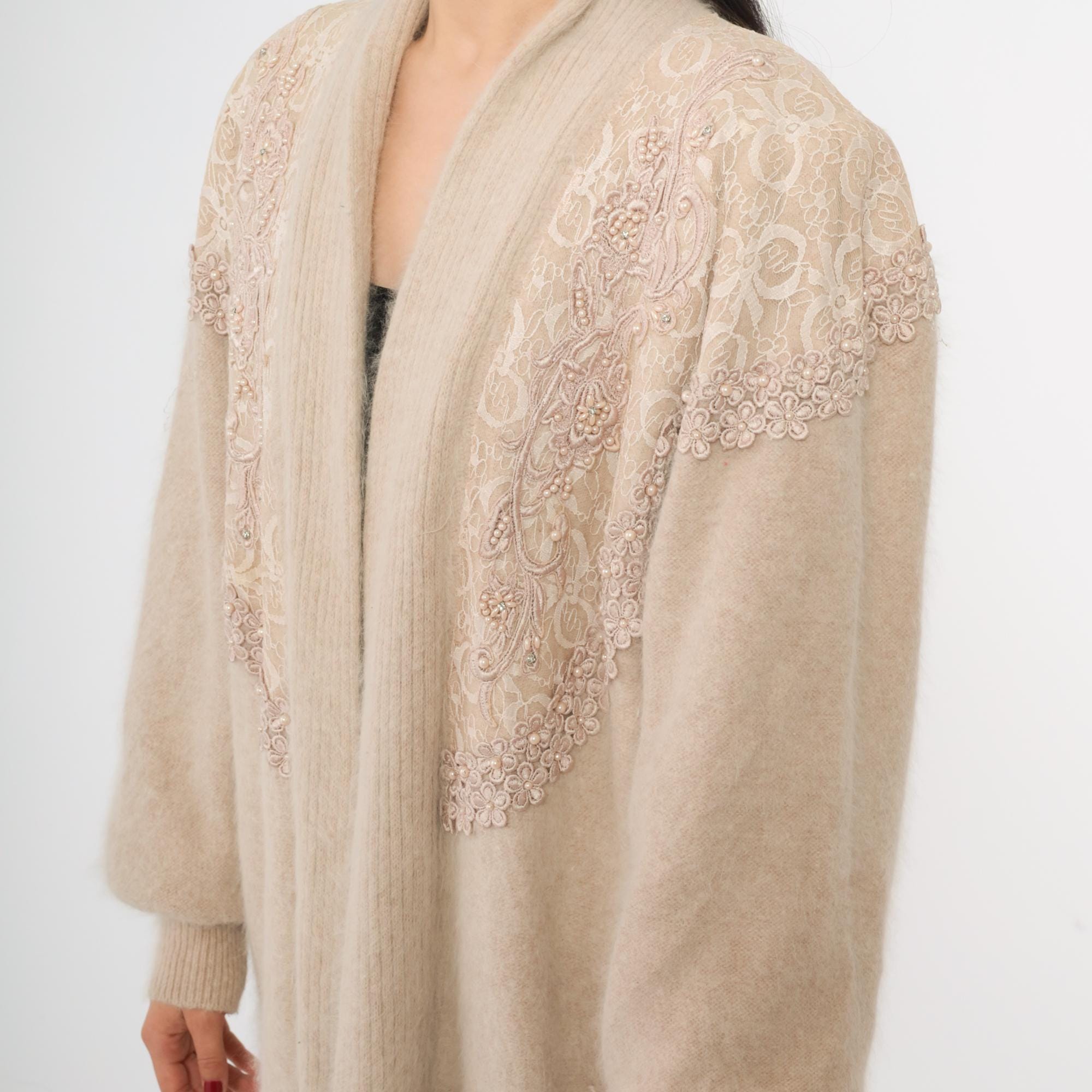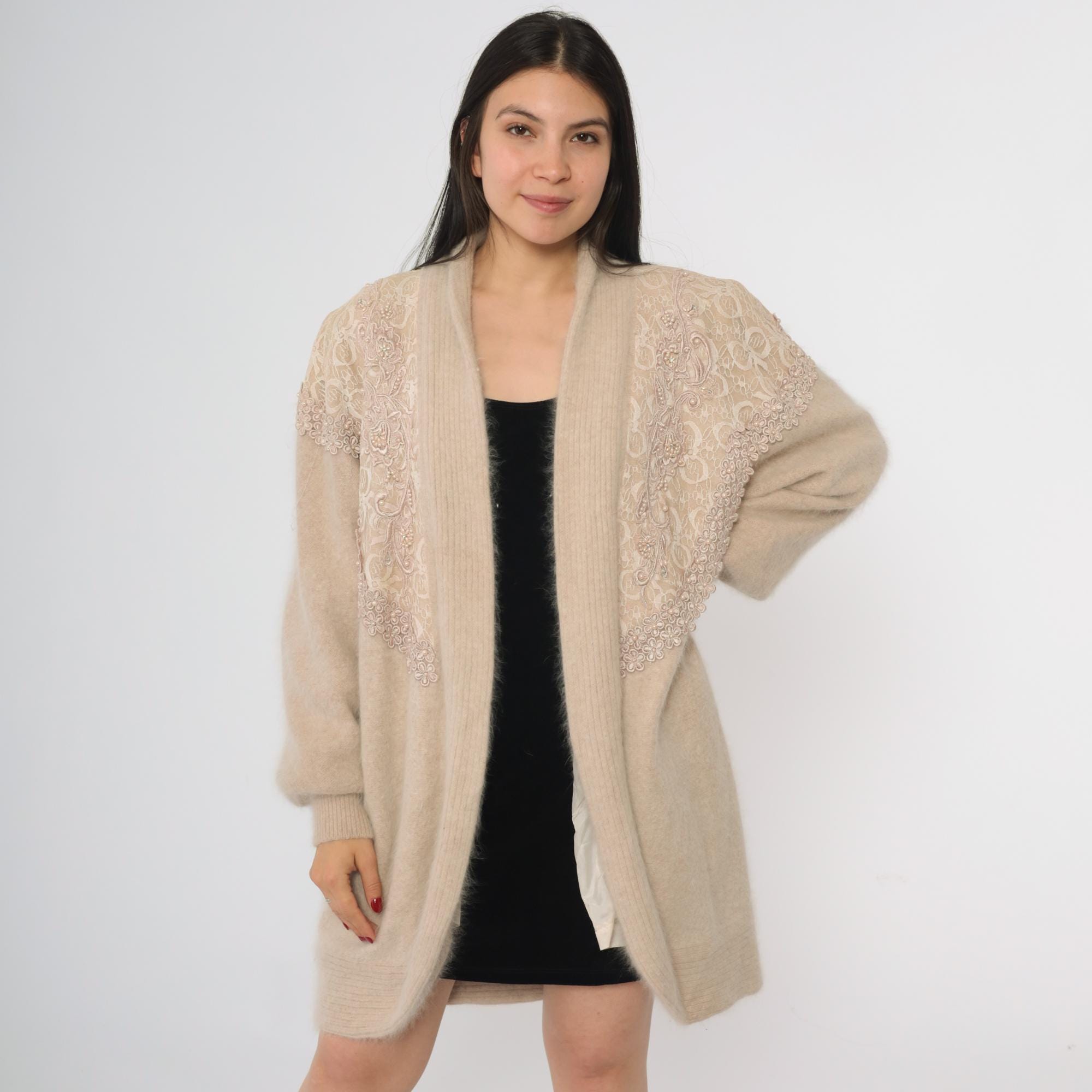 80s Belldini beige overcoat made from an angora and lambswool blend. Features a long open front silhouette with wide ribbed edges, balloon sleeves, and lace embroidered detailing across the shoulders and upper chest. Soft textured knit with a relaxed fit that falls to knee length.