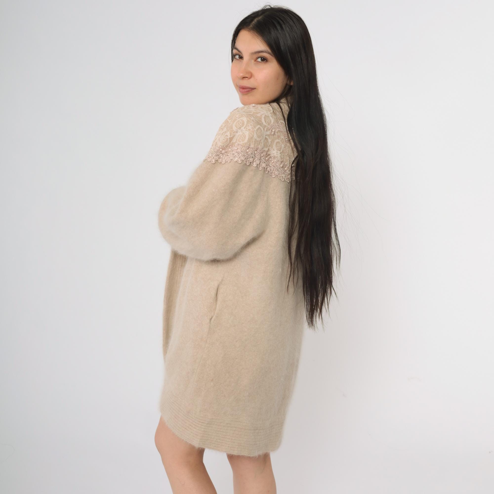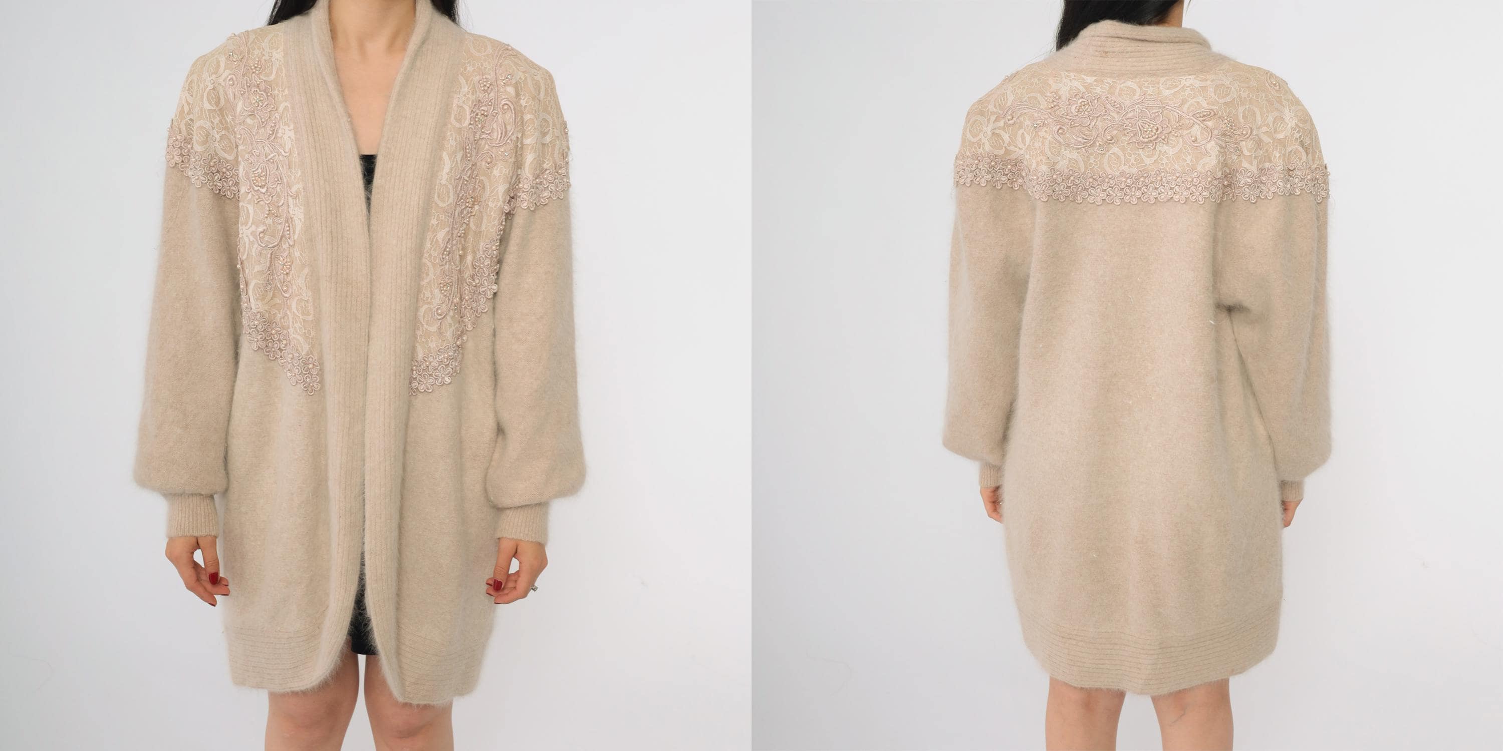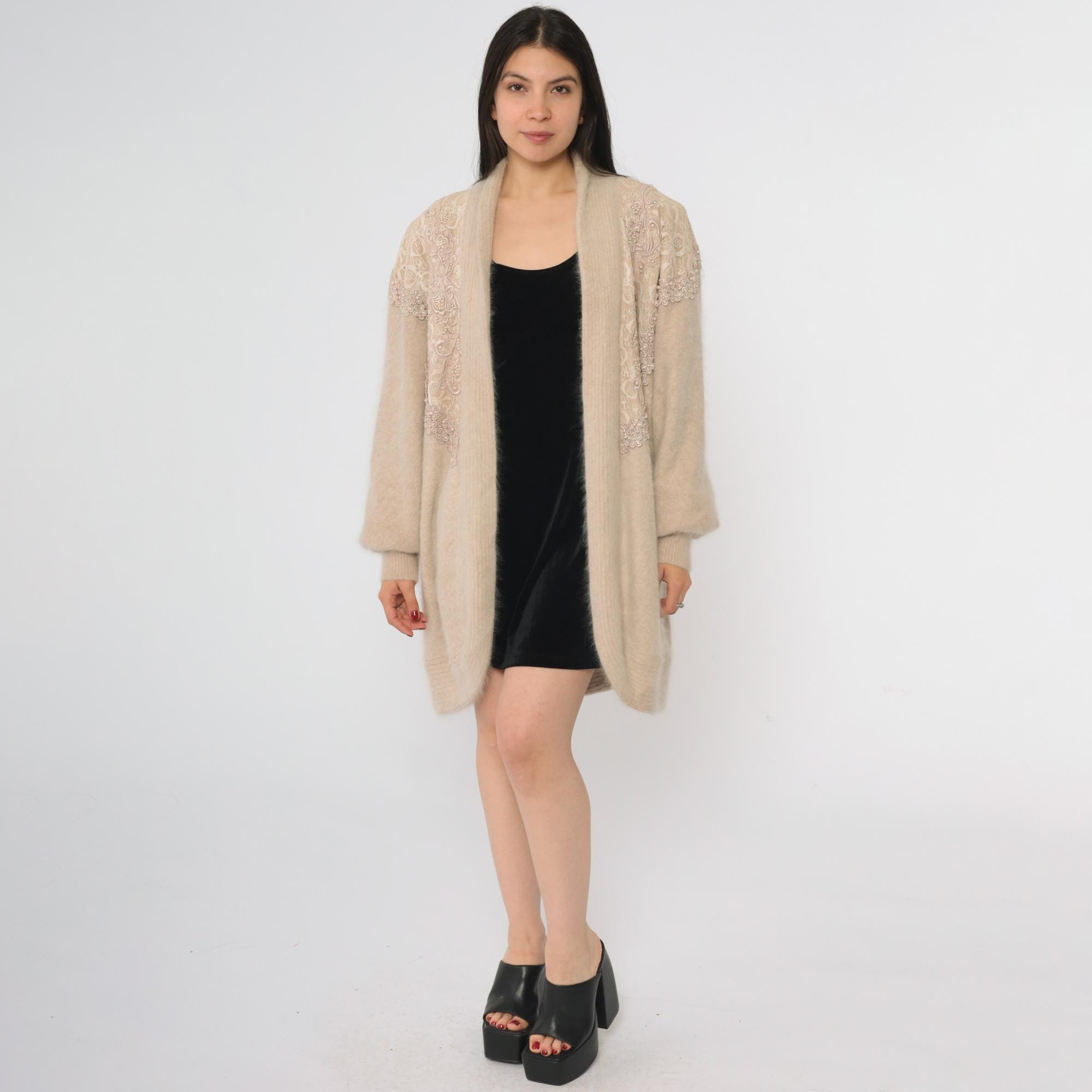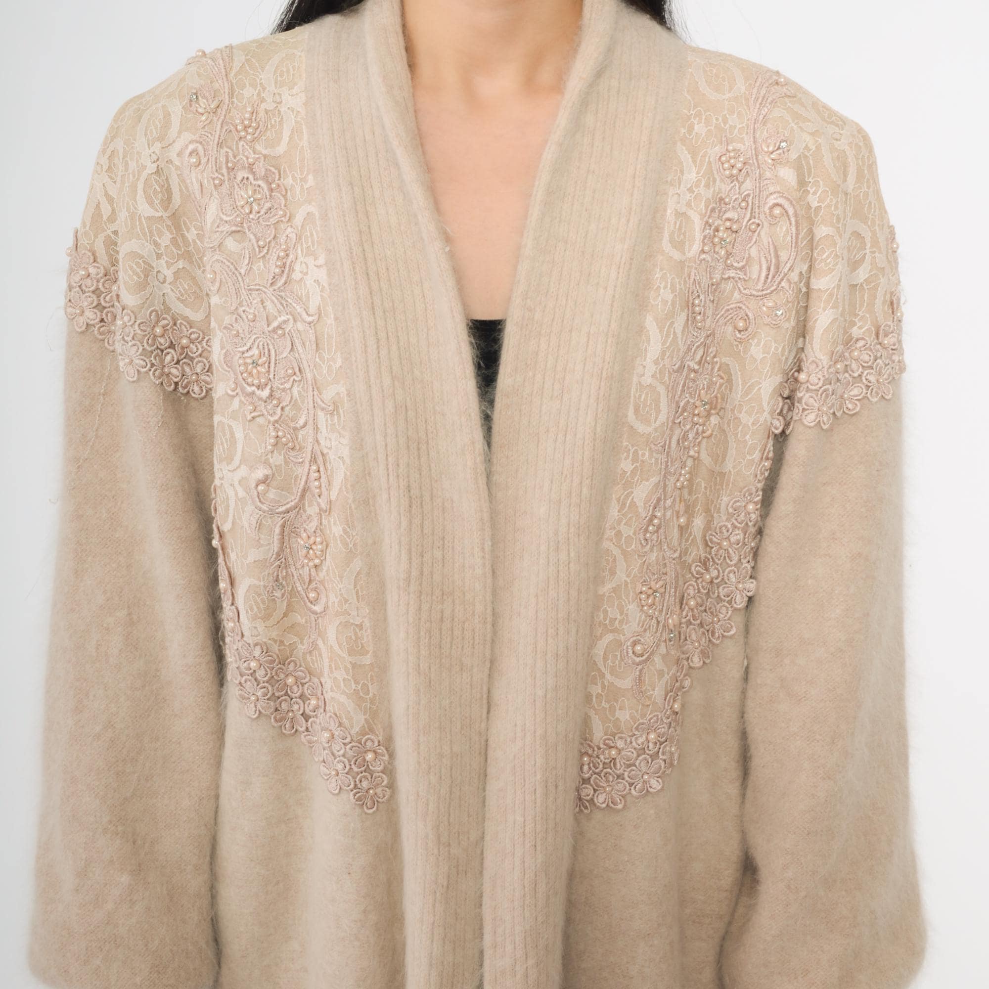 80s Belldini beige overcoat made from an angora and lambswool blend. Features a long open front silhouette with wide ribbed edges, balloon sleeves, and lace embroidered detailing across the shoulders and upper chest. Soft textured knit with a relaxed fit that falls to knee length.