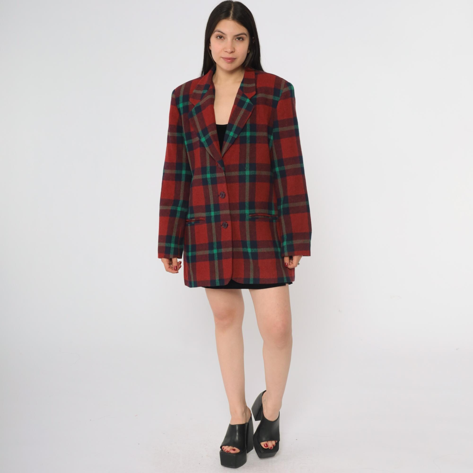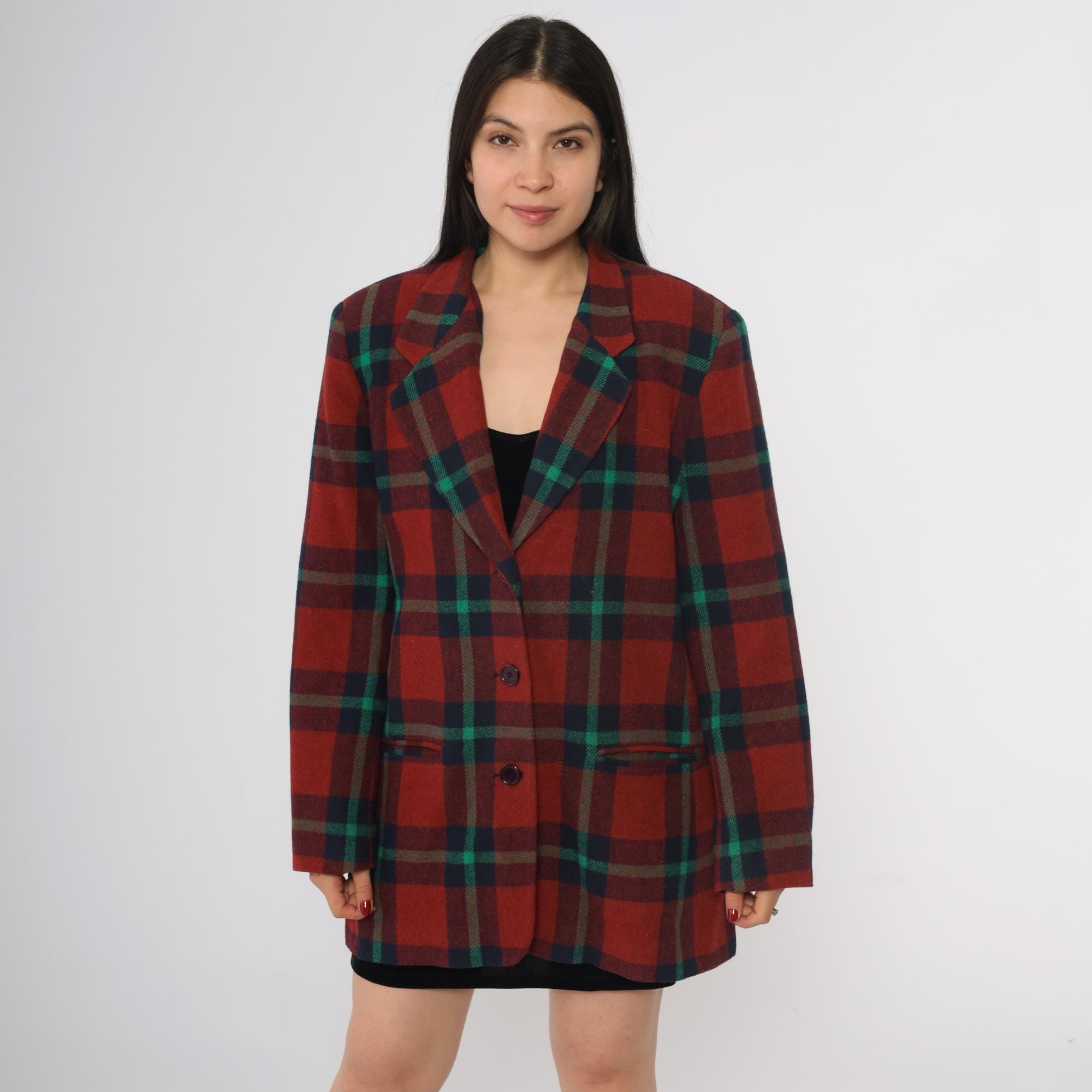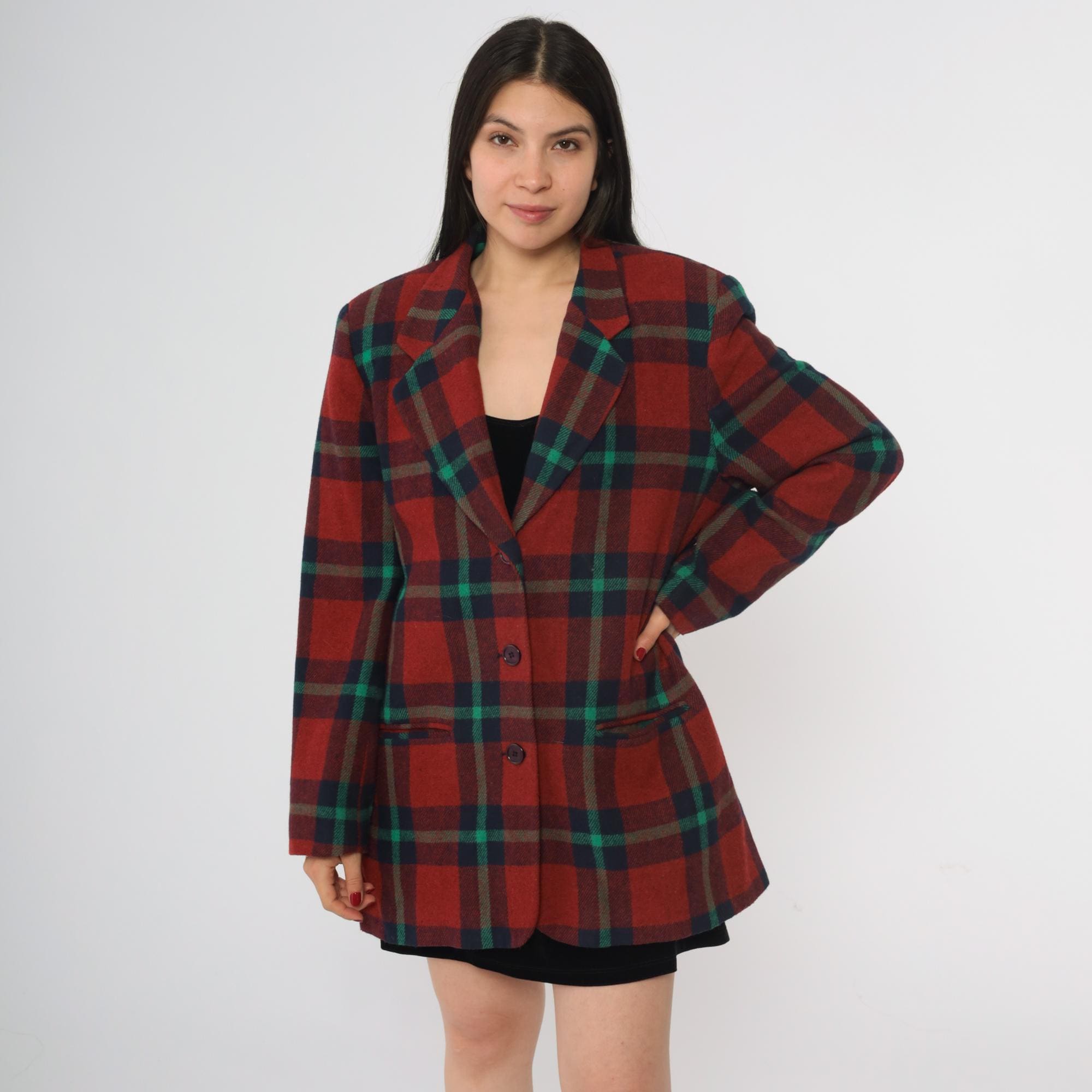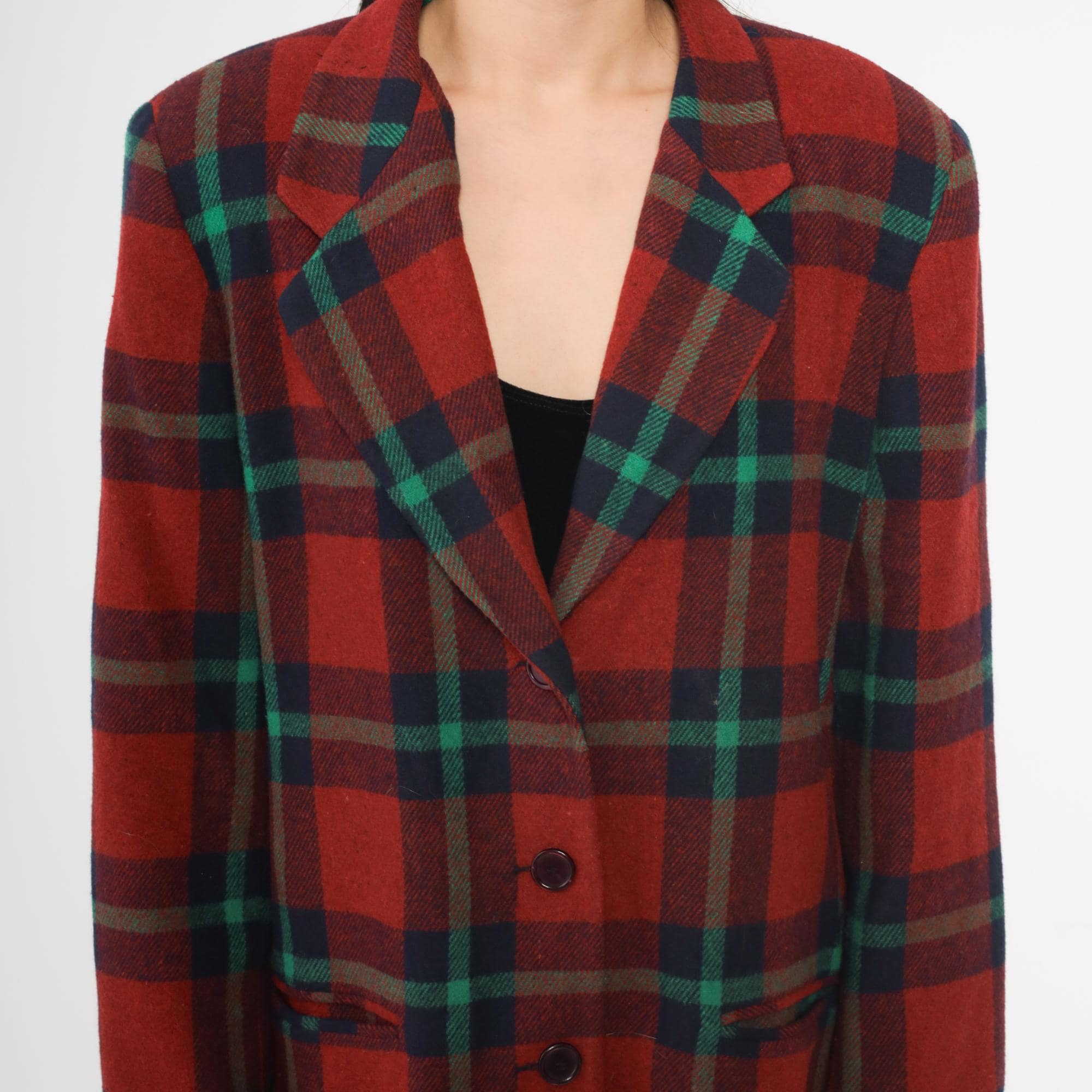 80s red and green plaid blazer by 955 Originals. Made from a soft wool blend with a full lining and structured shoulders. Features a two-button front closure, notched lapels, and front pockets.
