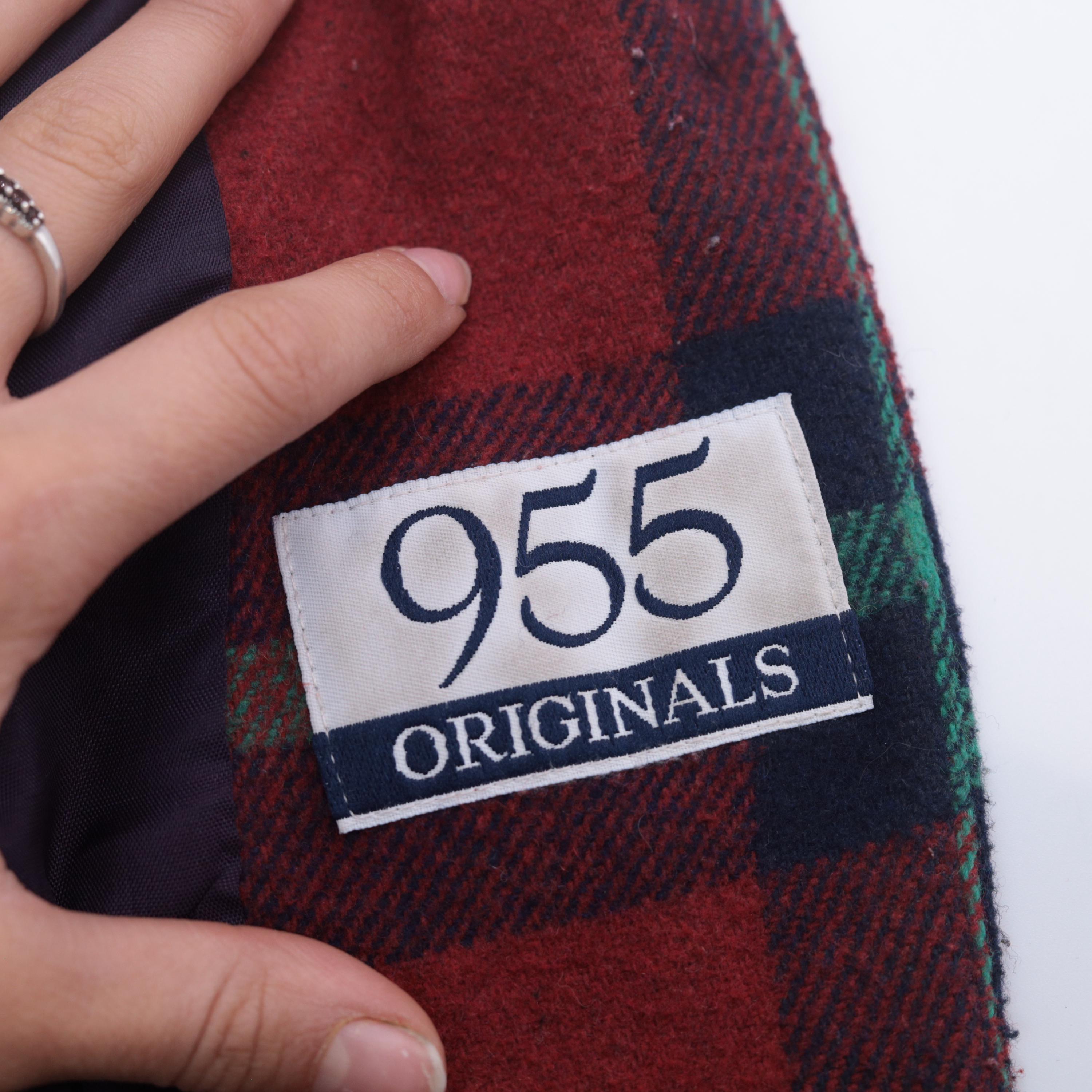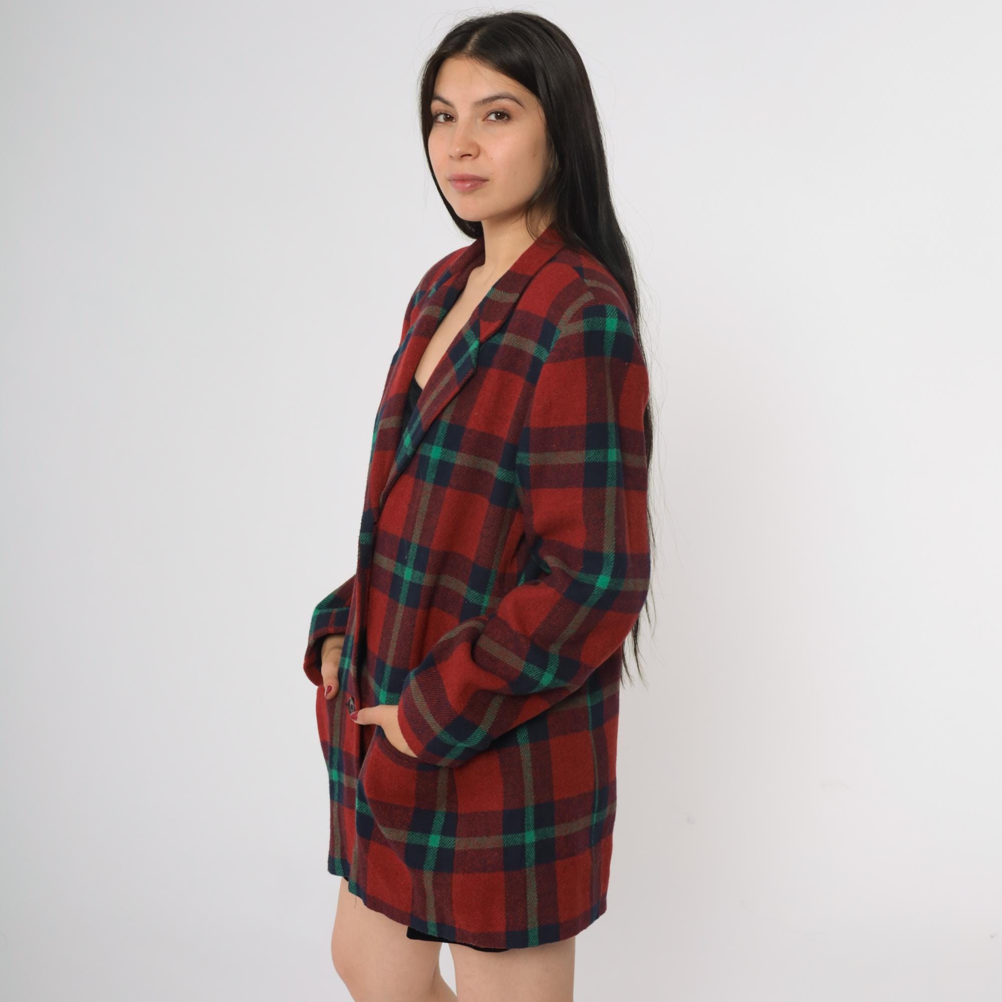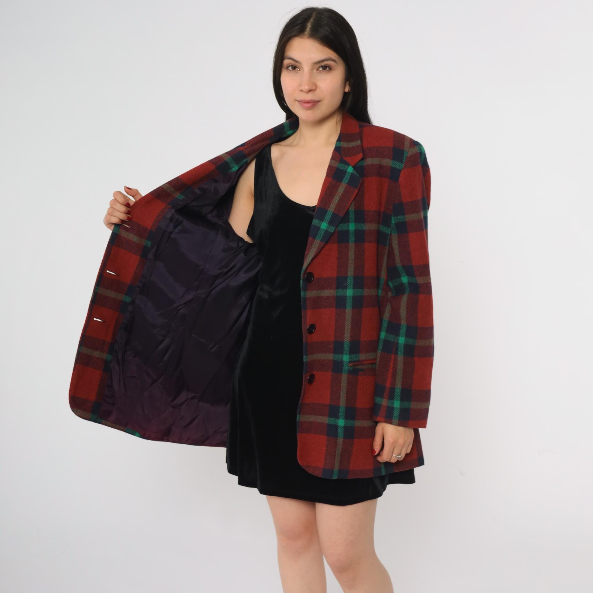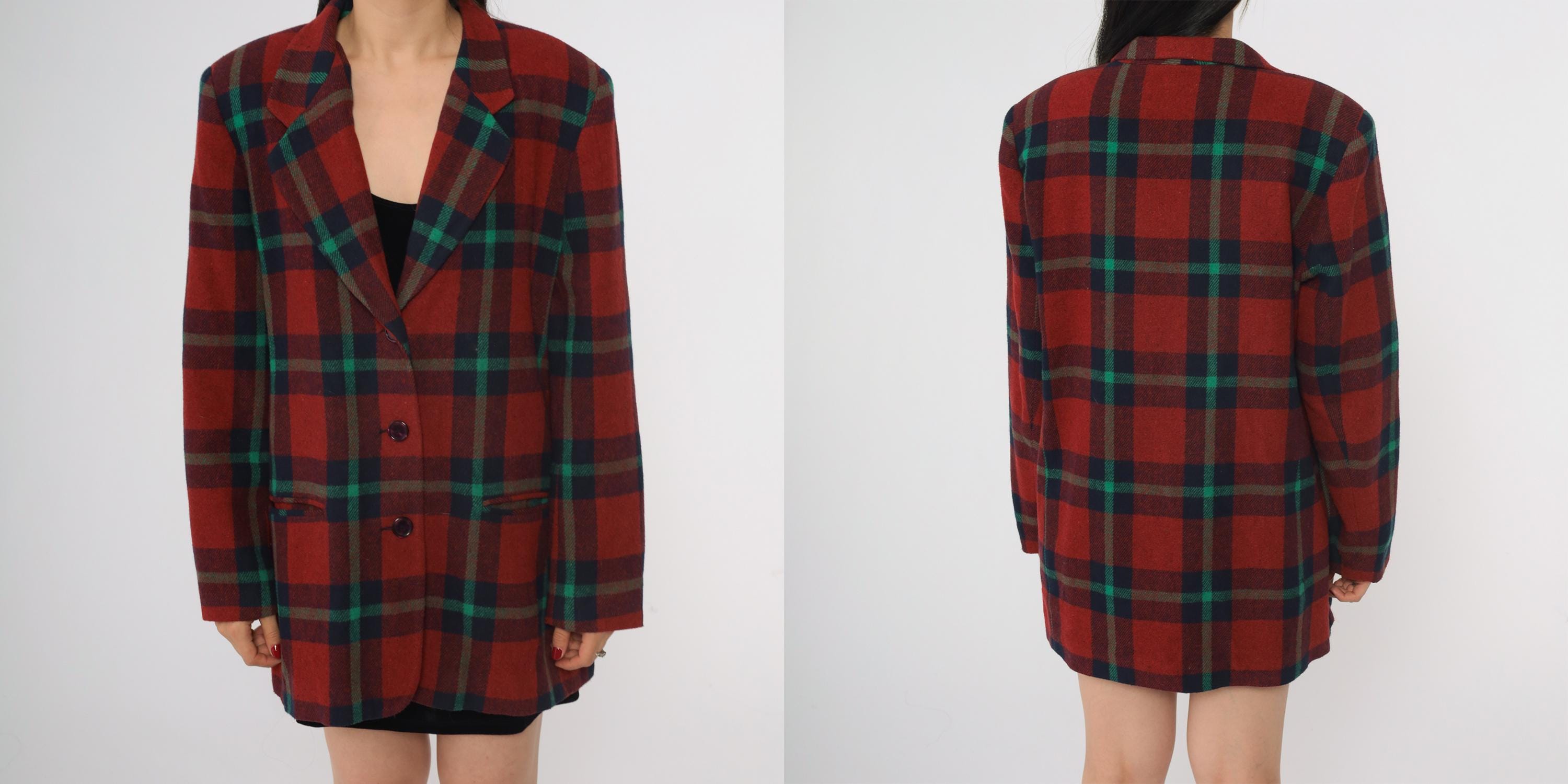 80s red and green plaid blazer by 955 Originals. Made from a soft wool blend with a full lining and structured shoulders. Features a two-button front closure, notched lapels, and front pockets.