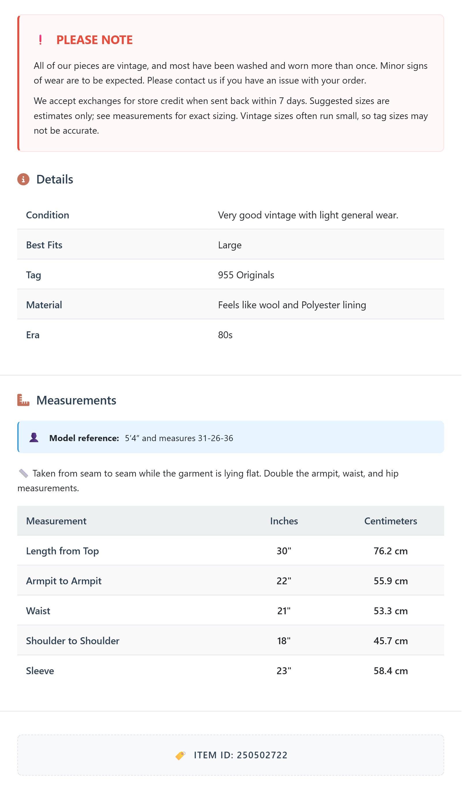 Suggested sizes are estimates only; see measurements for exact sizing. Vintage sizes often run small, so tag sizes may not be accurate.