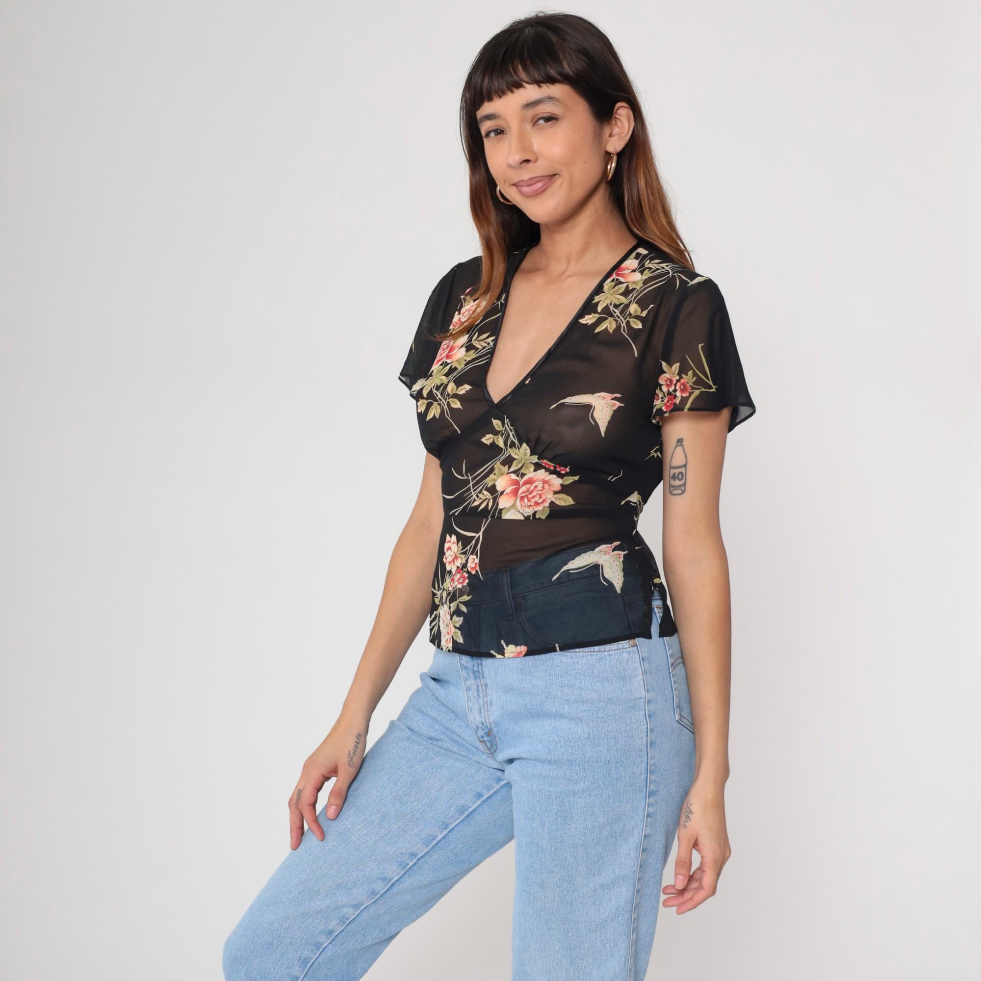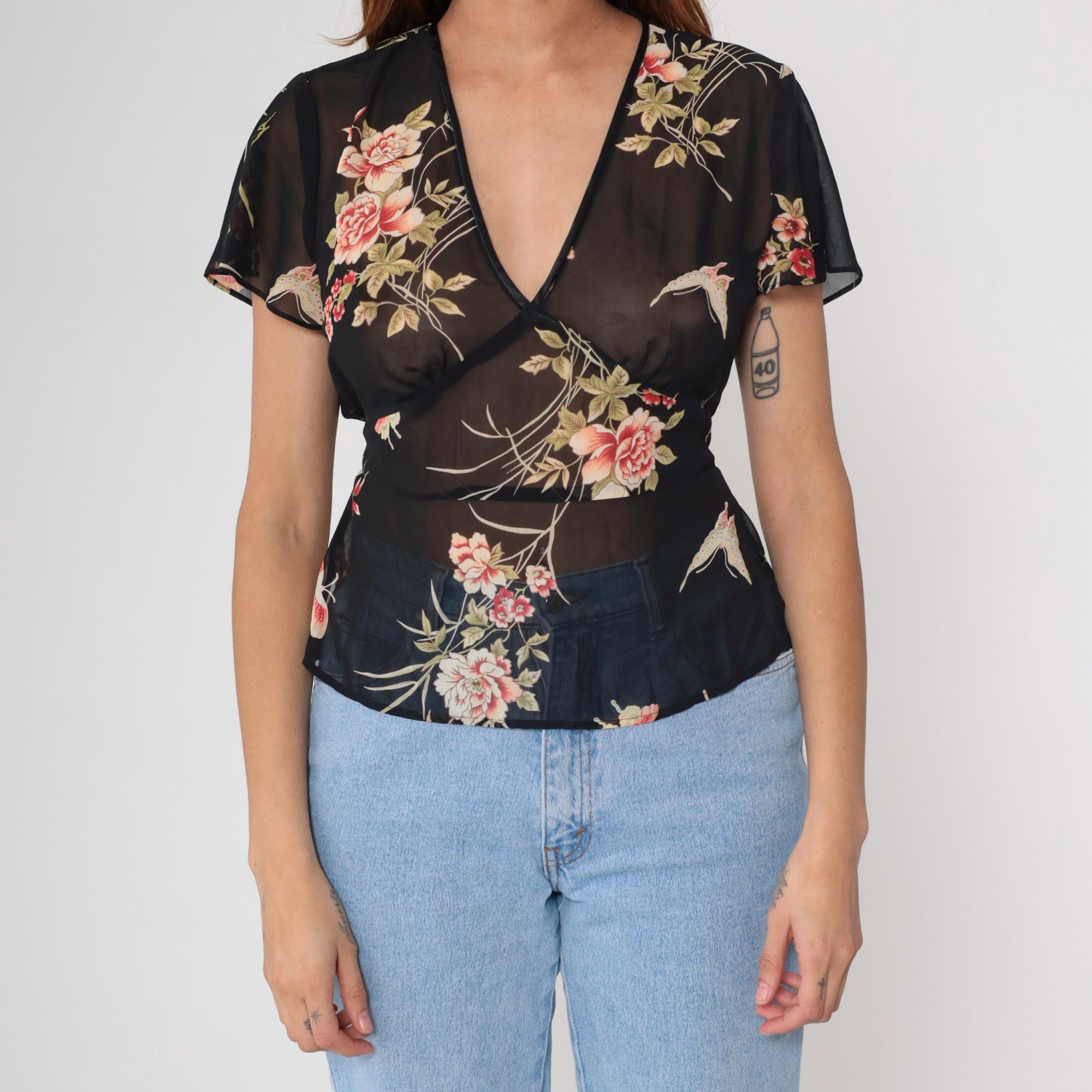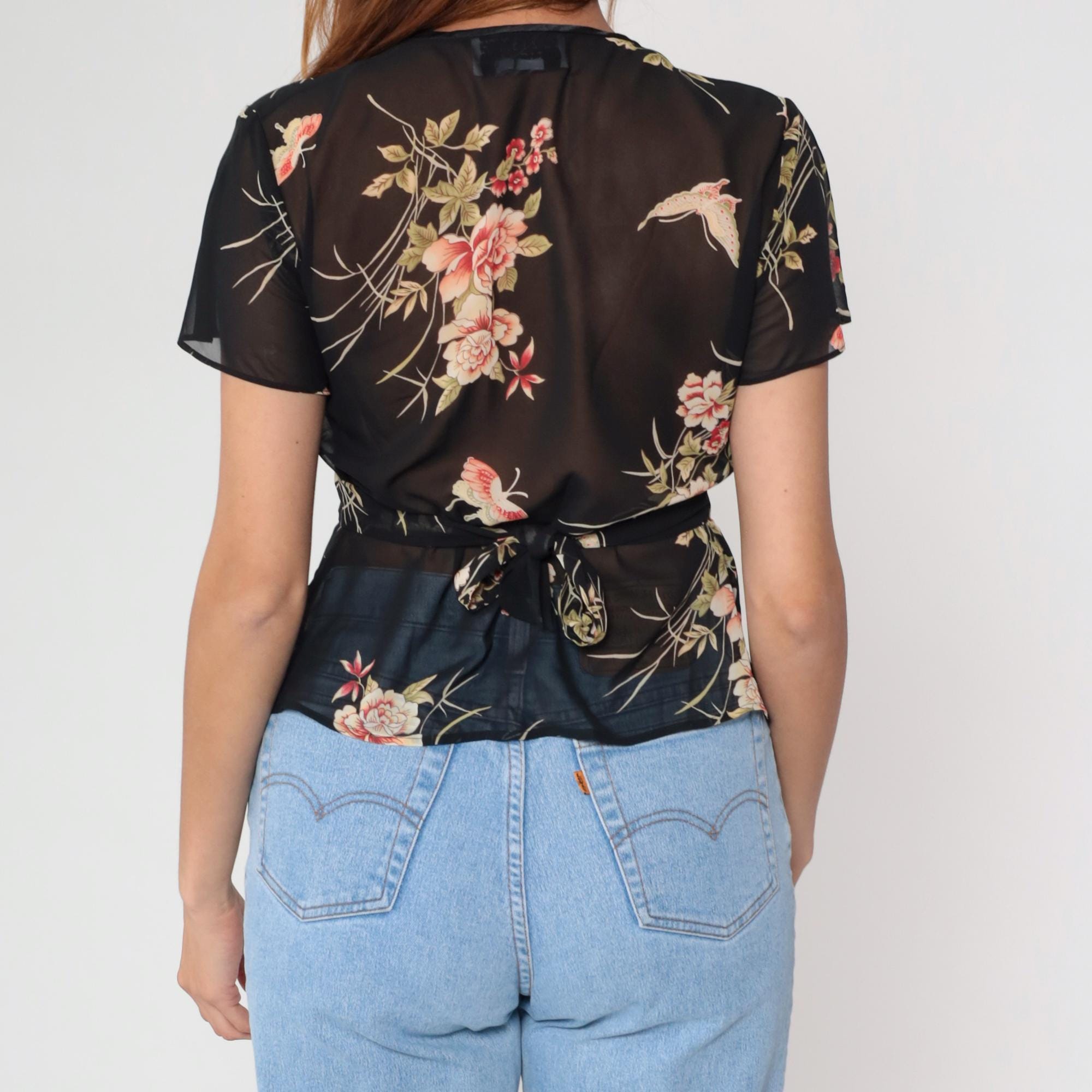 90s black sheer wrap top featuring pink rose print and flying birds. Deep V neckline with crossover front design. Short flutter sleeves. Back tie closure.