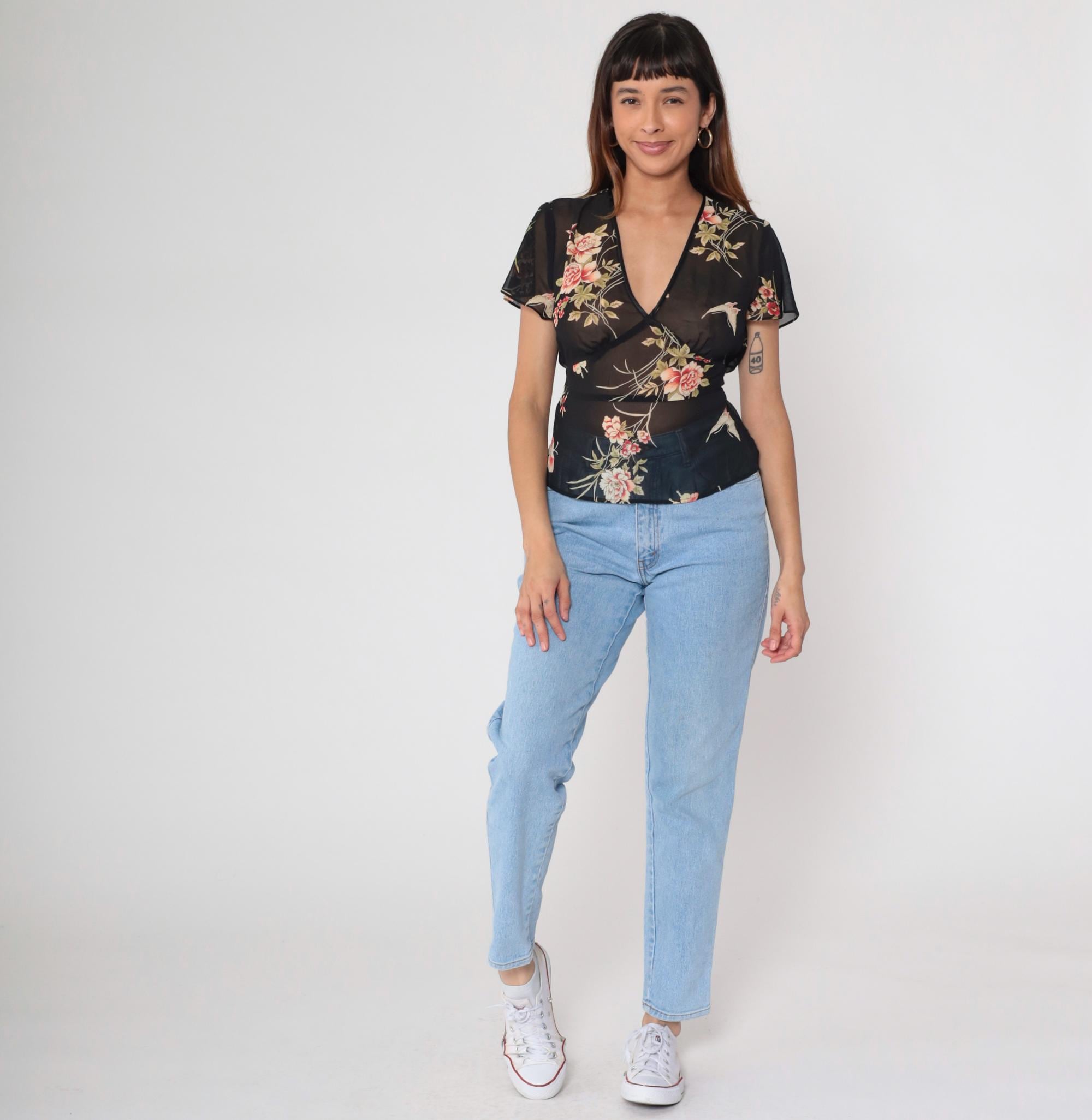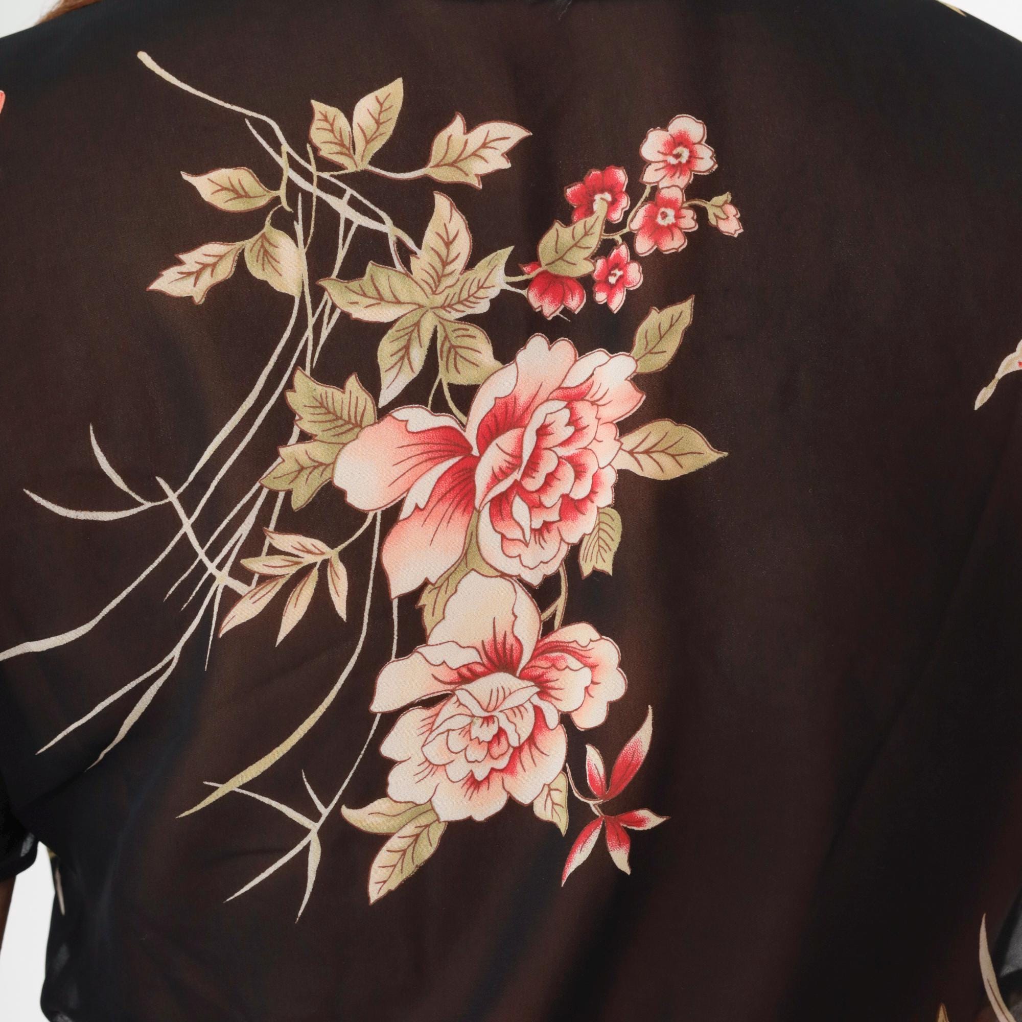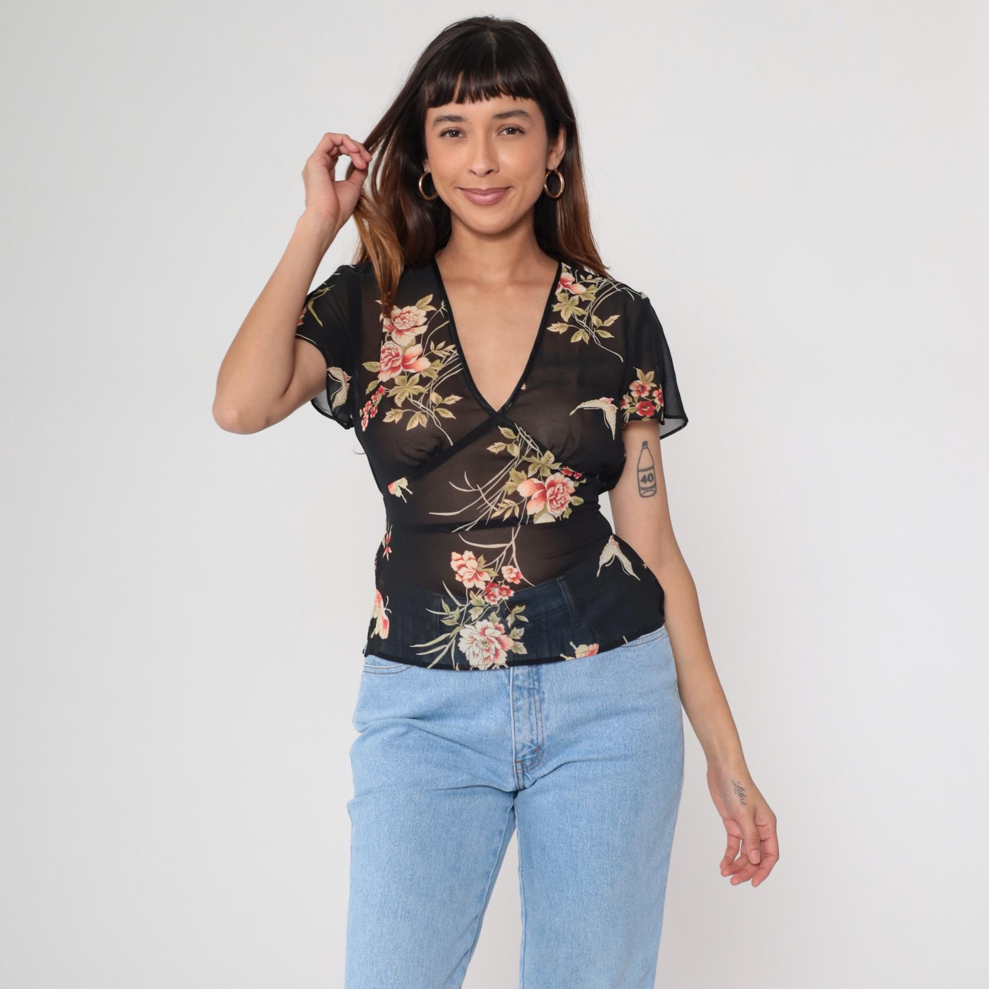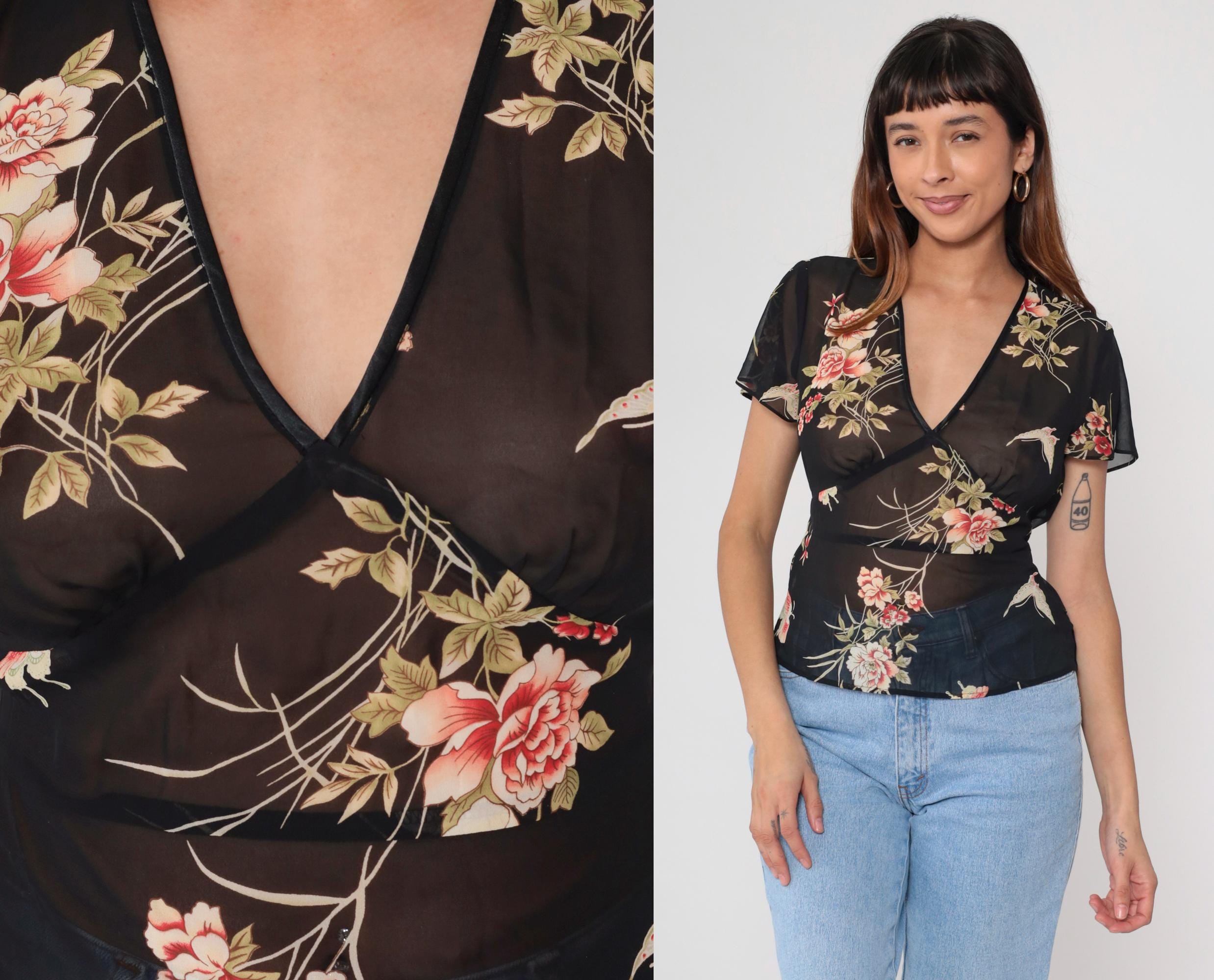 90s black sheer wrap top featuring pink rose print and flying birds. Deep V neckline with crossover front design. Short flutter sleeves. Back tie closure.