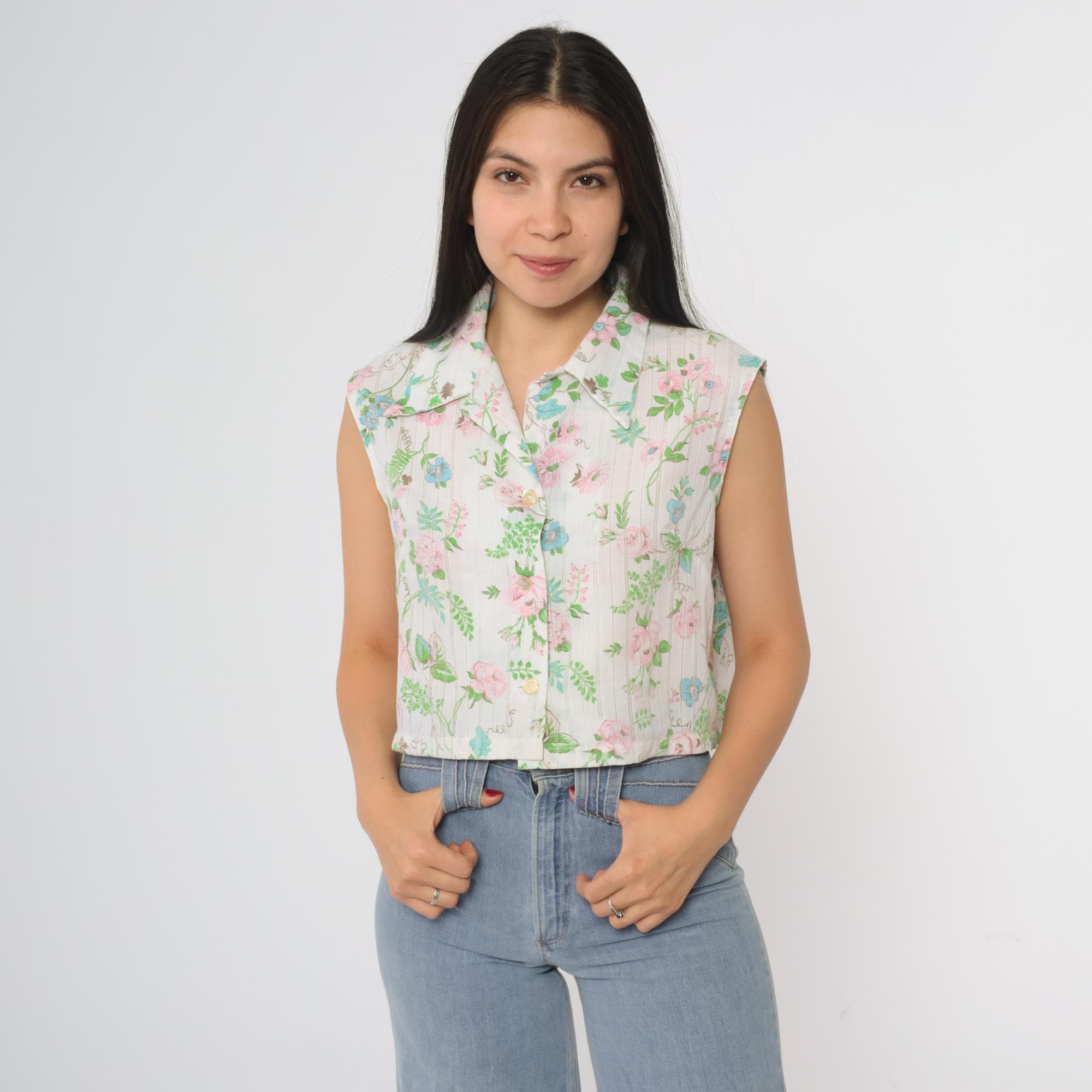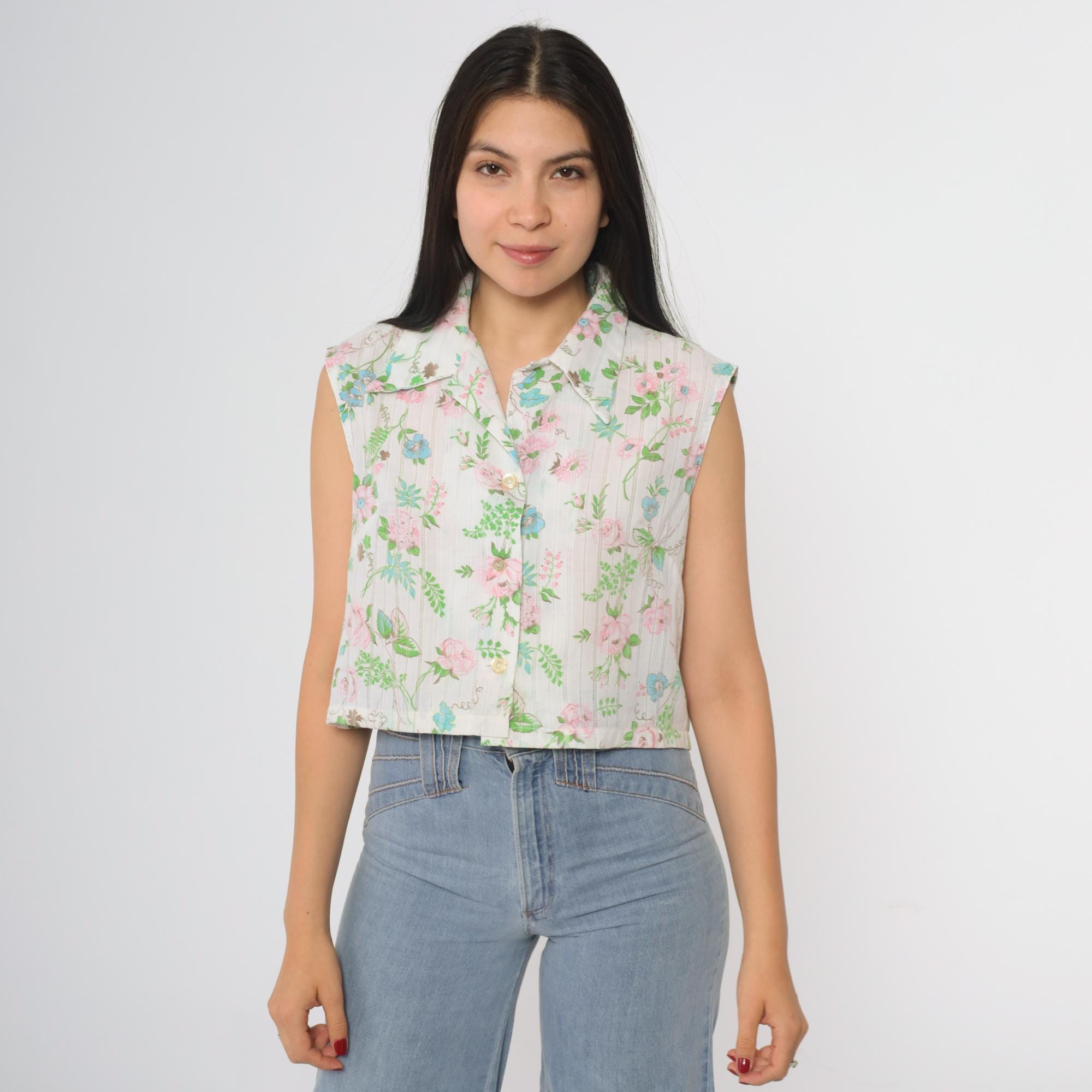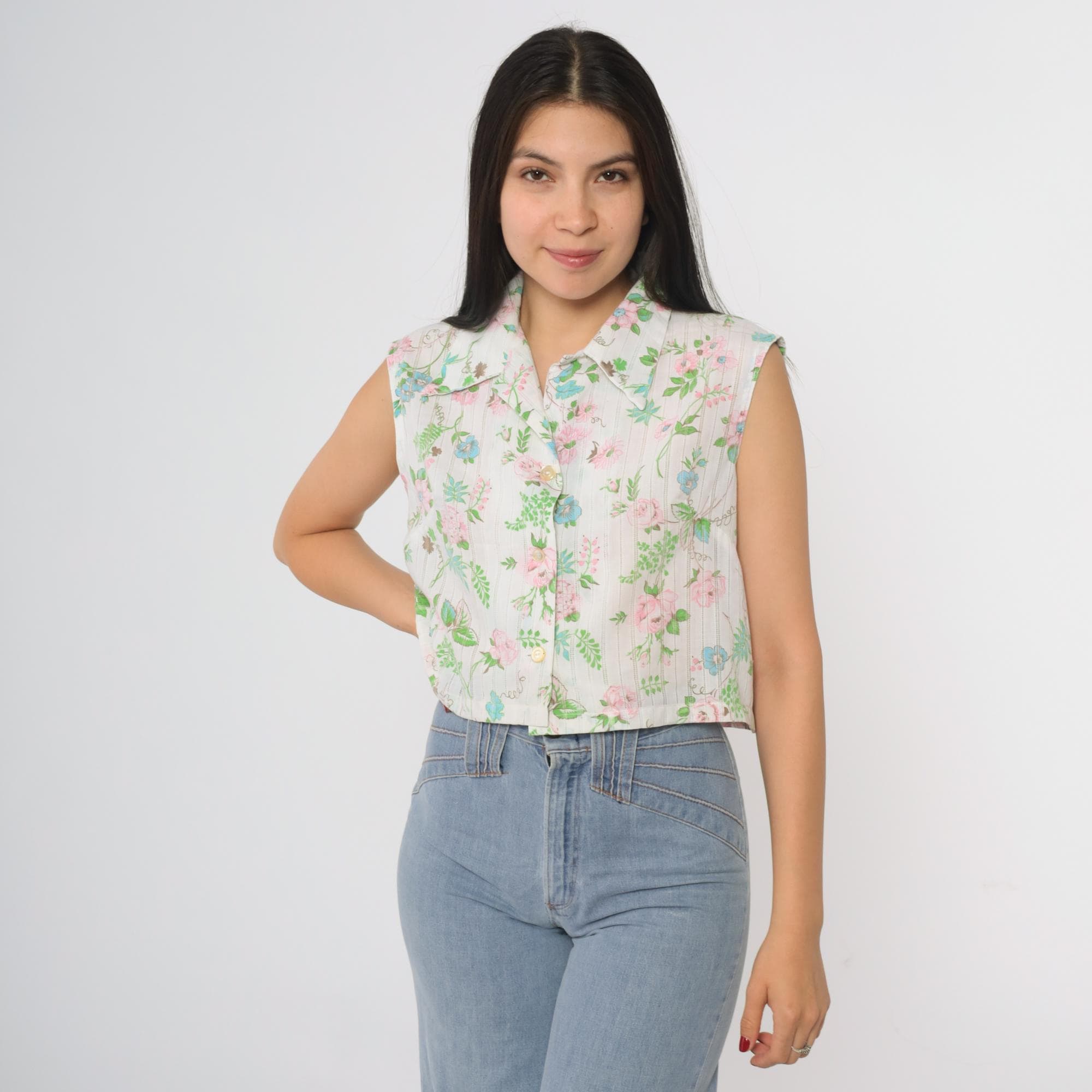 70s cropped blouse by Lori Lynn. Features delicate floral print with pink roses, blue flowers and green foliage on white striped background. Collared neckline with full button front closure.