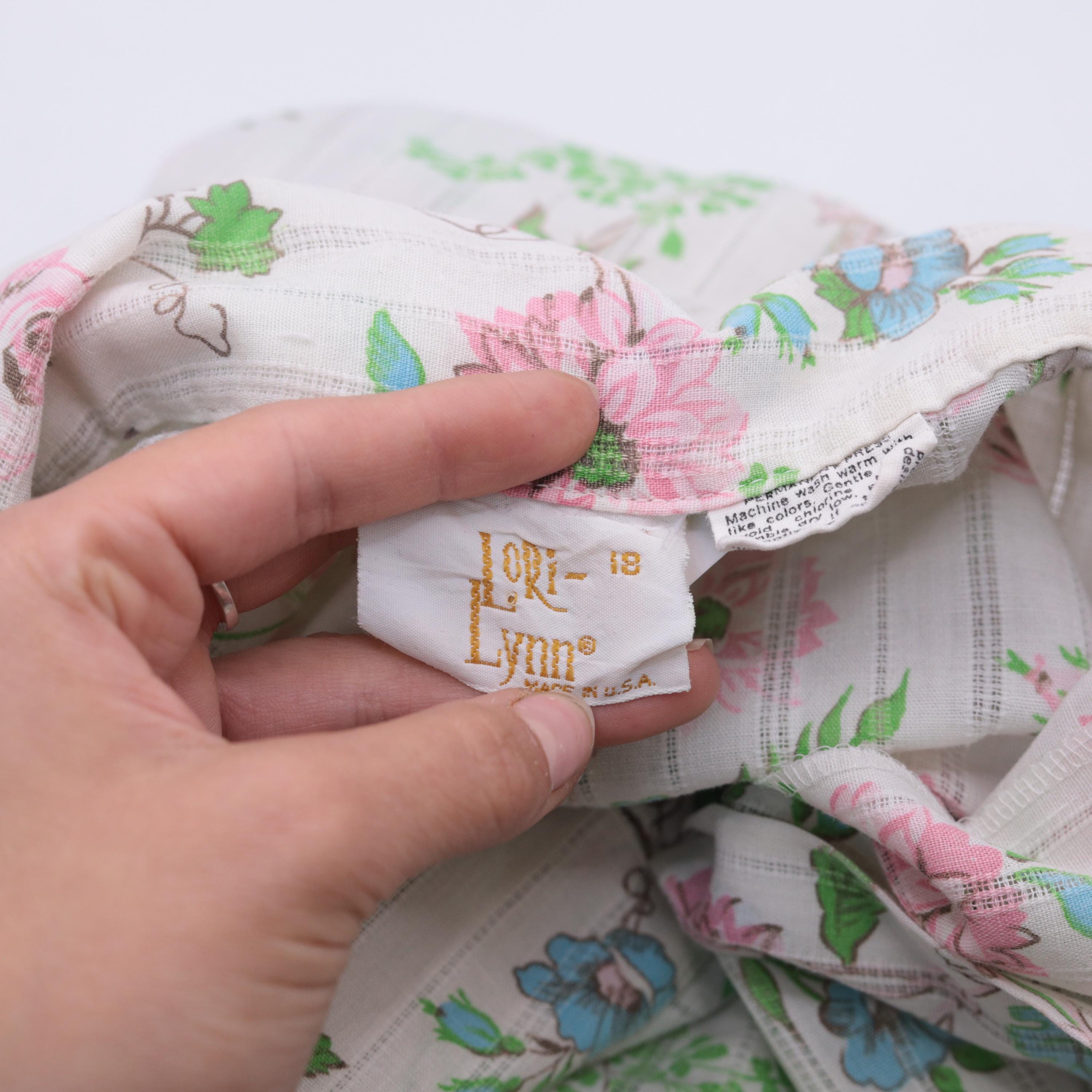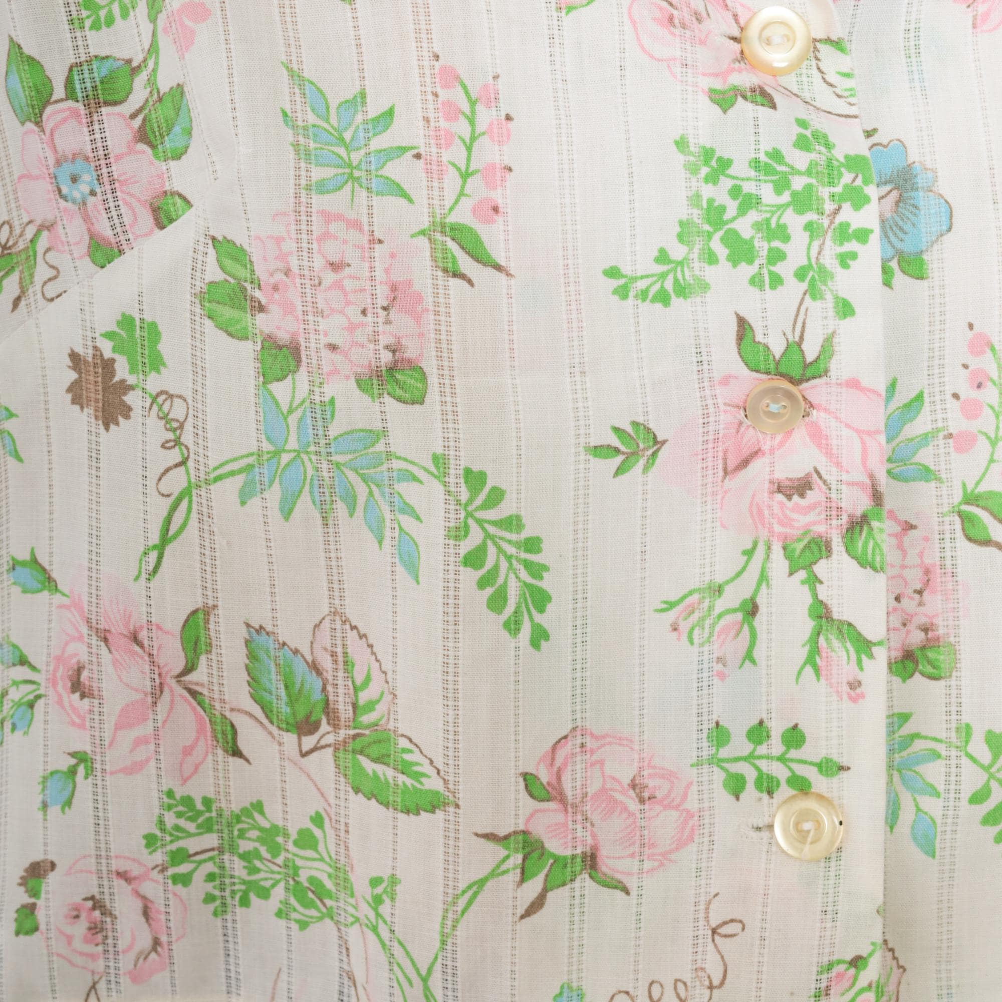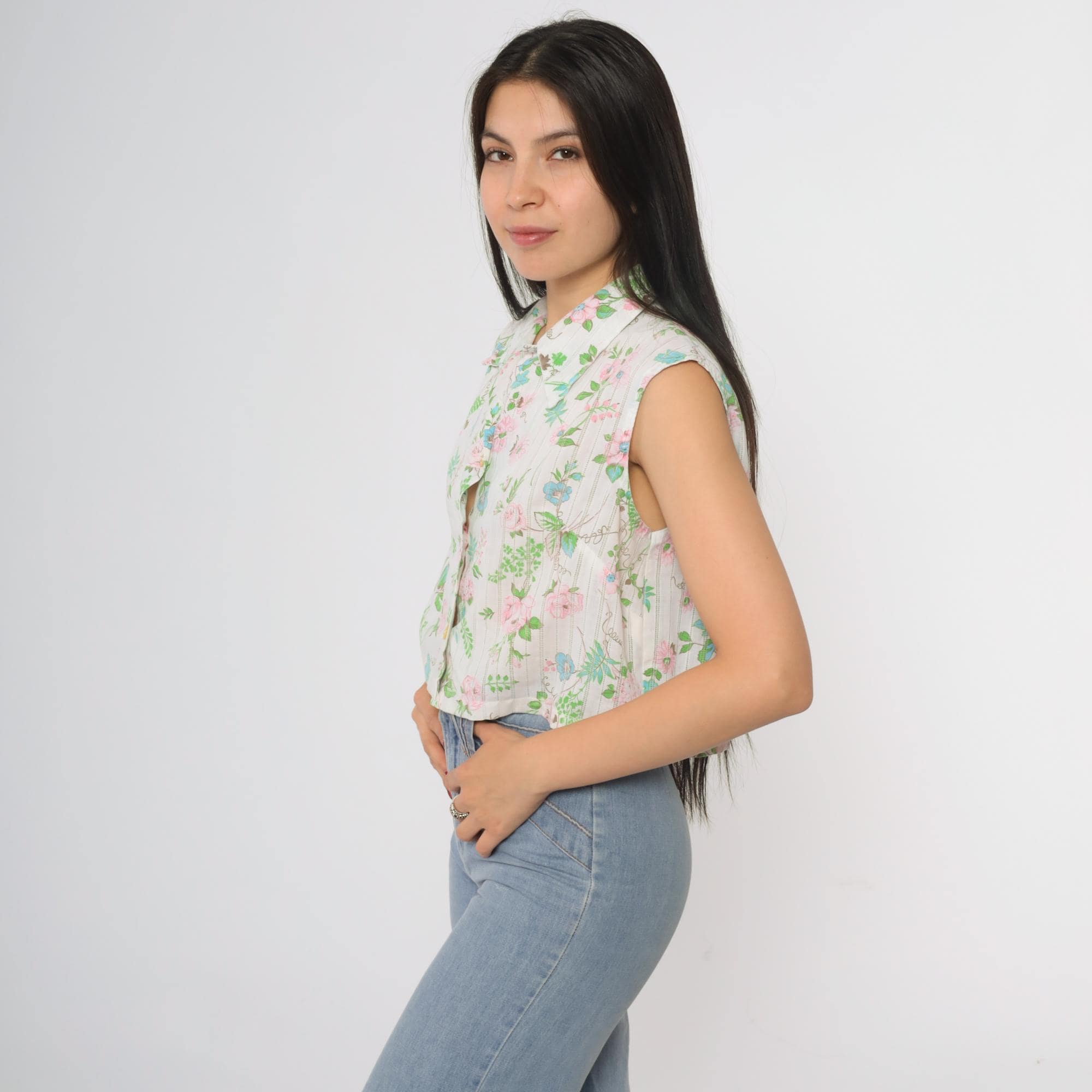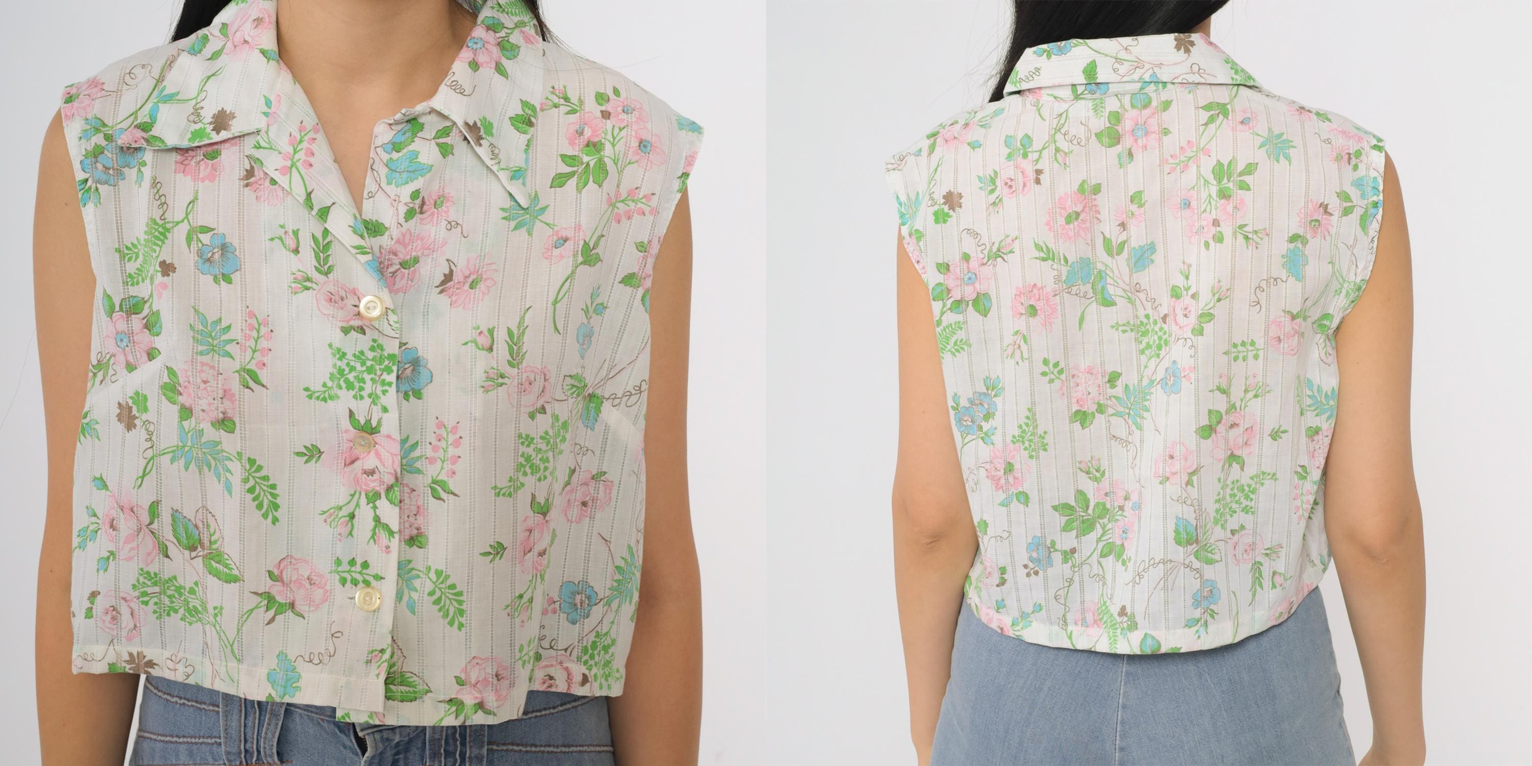 70s cropped blouse by Lori Lynn. Features delicate floral print with pink roses, blue flowers and green foliage on white striped background. Collared neckline with full button front closure.