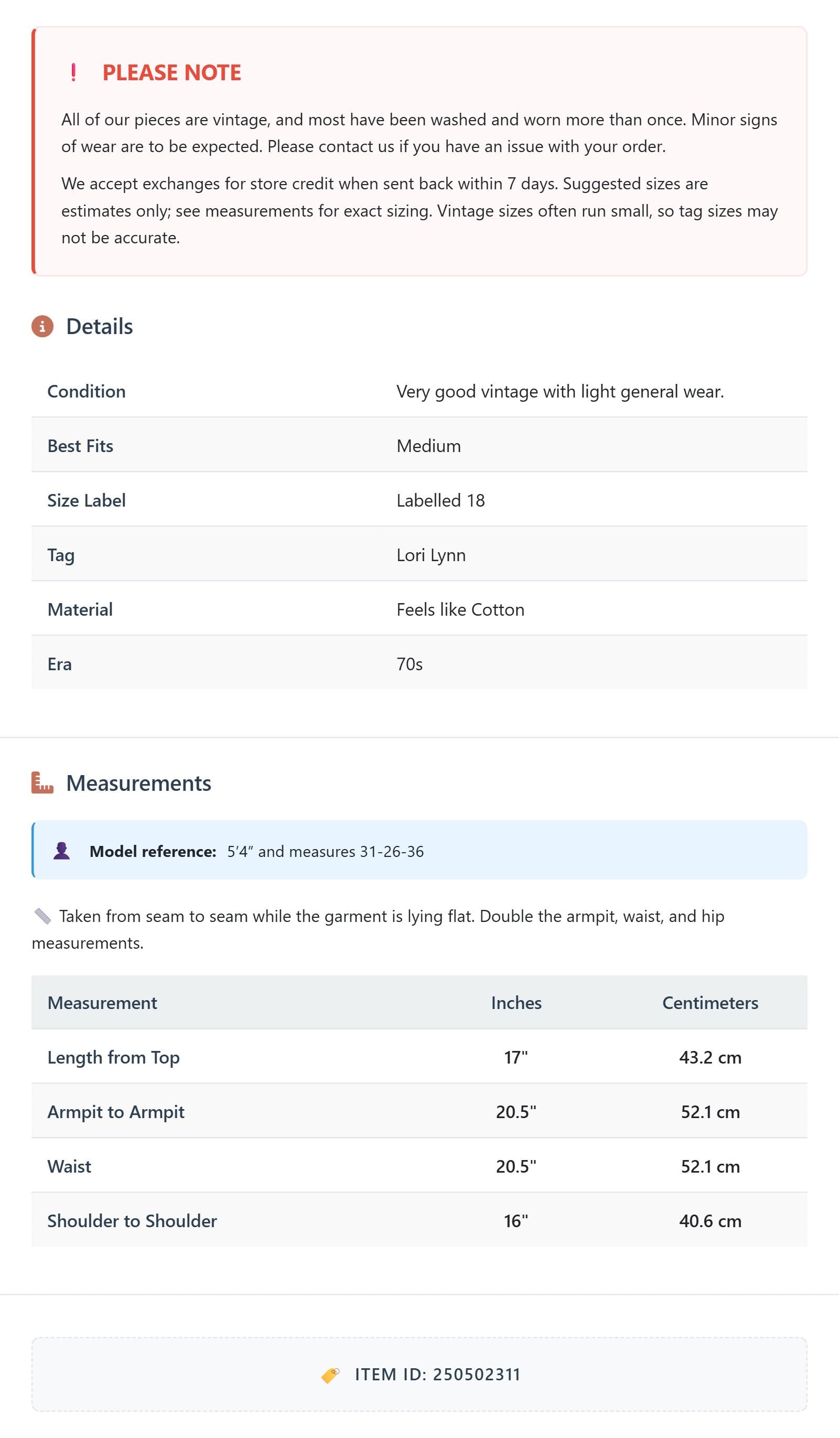 All of our pieces are vintage, and most have been washed and worn more than once. Minor signs of wear are to be expected. Please contact us if you have an issue with your order. We accept exchanges for store credit when sent back within 7 days.