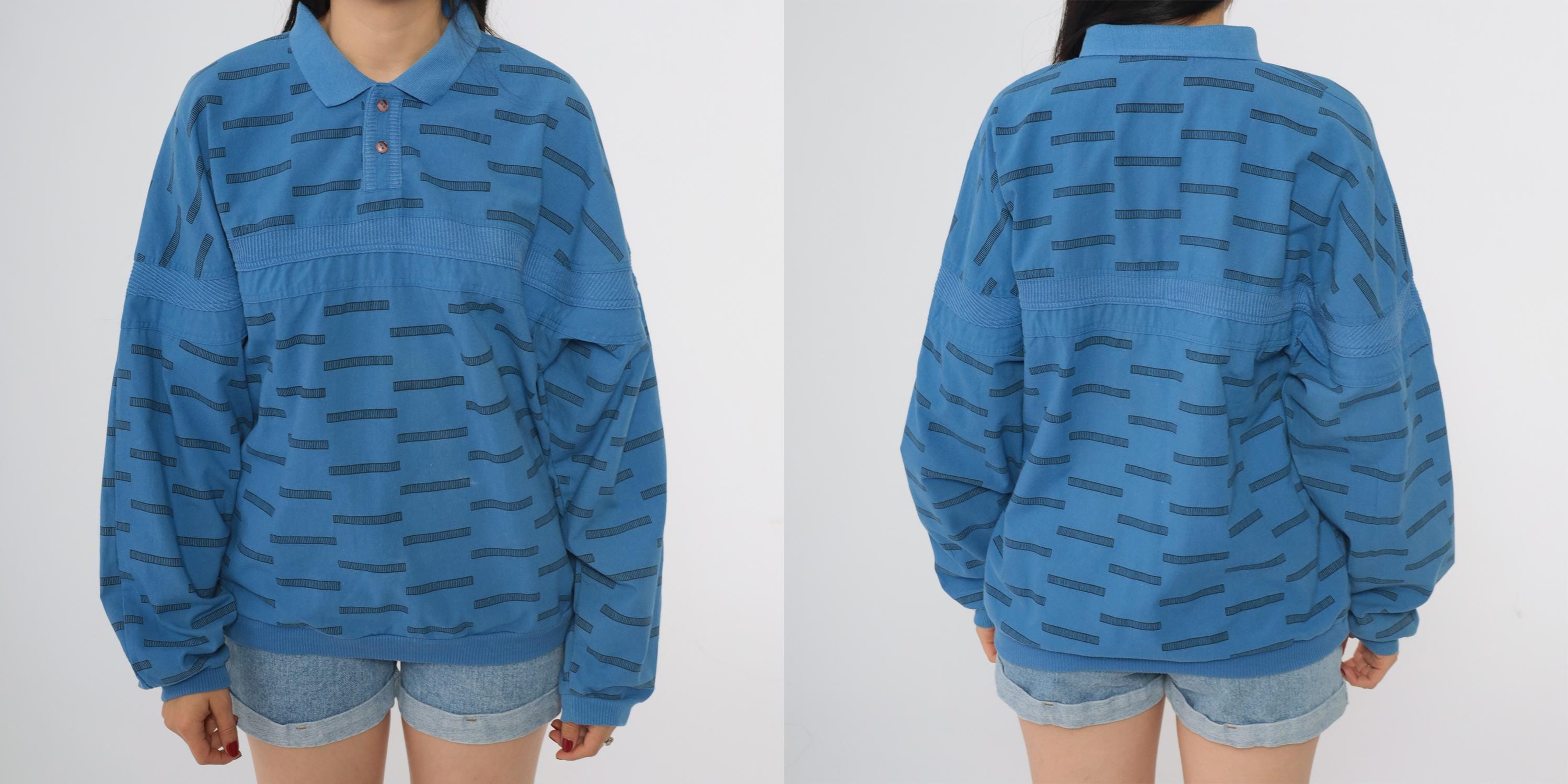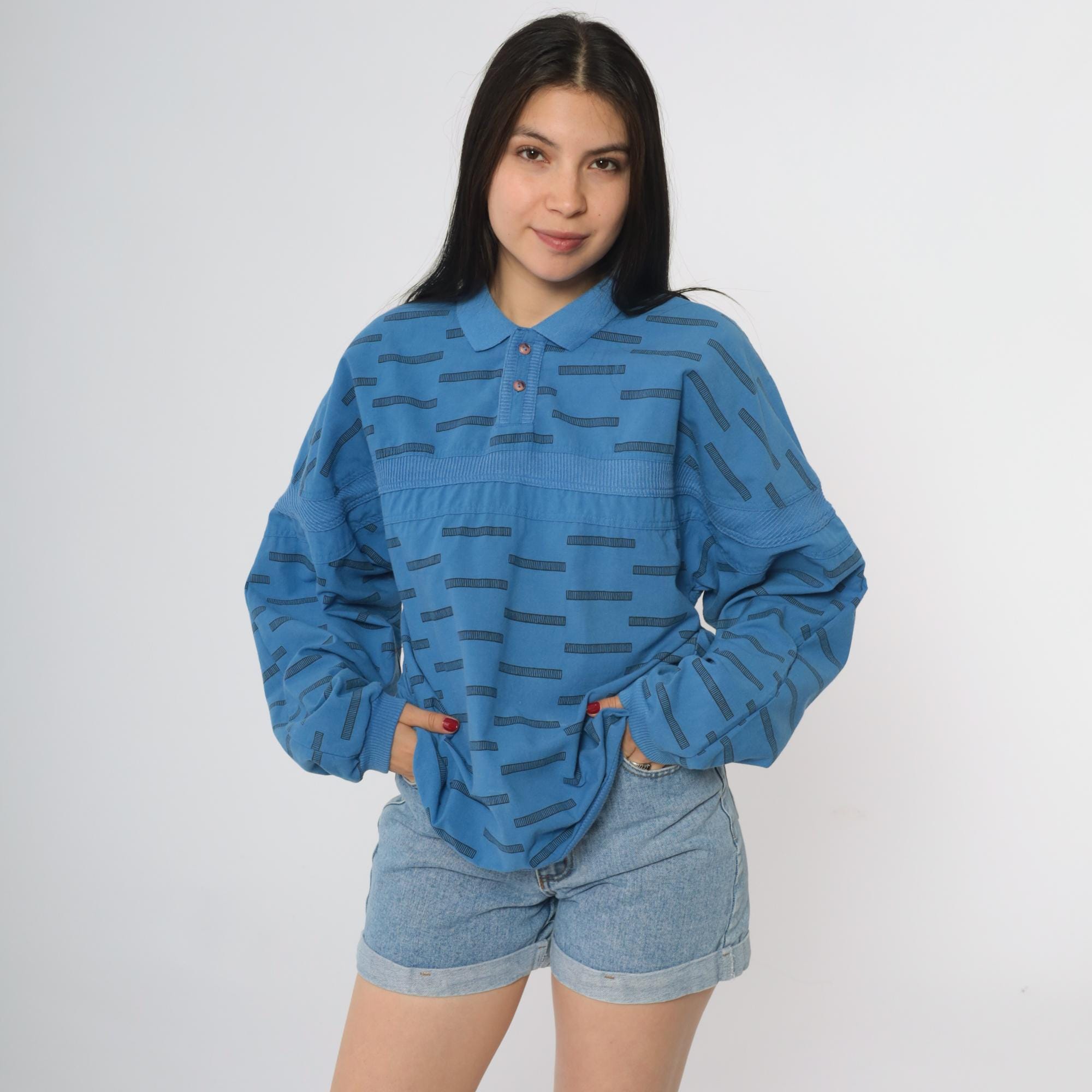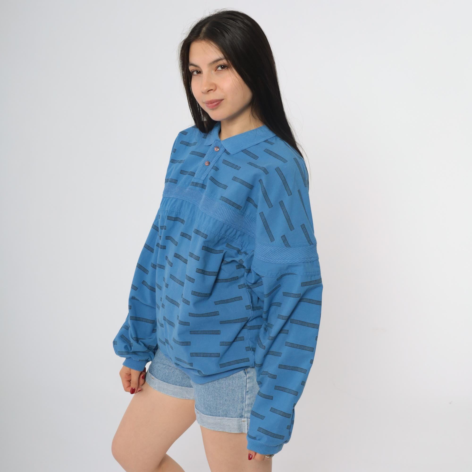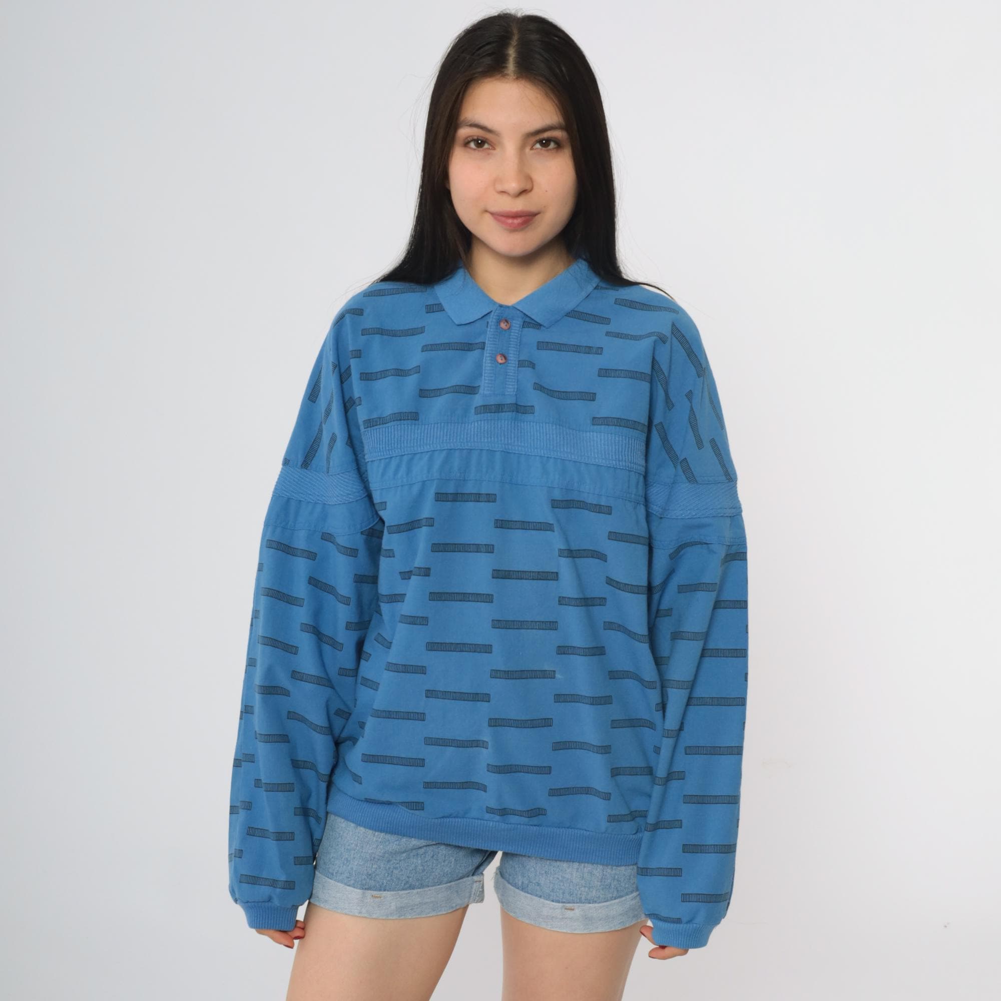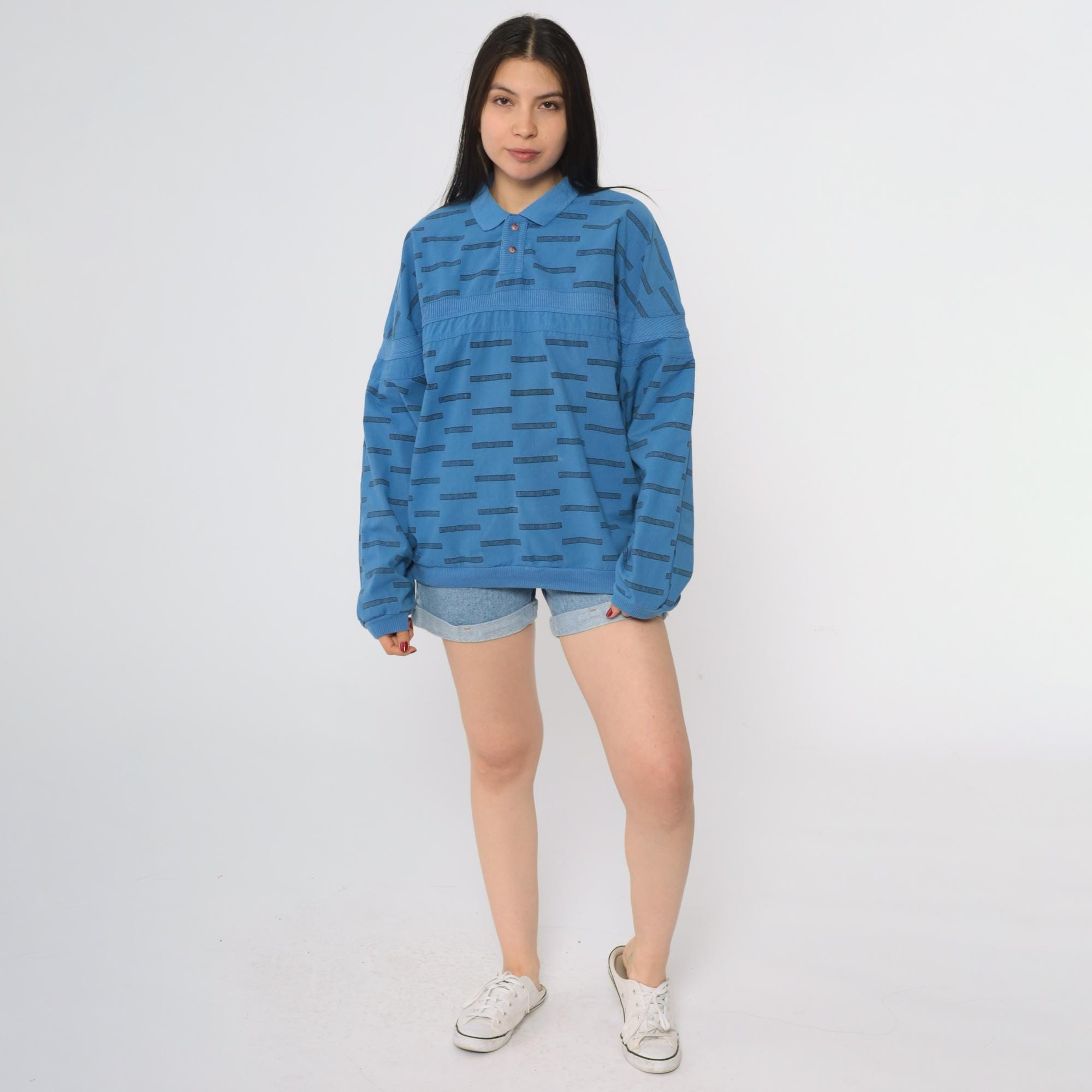 90s blue polo sweatshirt by Street Scenes. Features unique geometric linear pattern throughout in dark blue on medium blue background. Collared neckline with two-button placket. Long sleeves with ribbed cuffs. Horizontal ribbed panel across chest. Ribbed hem.