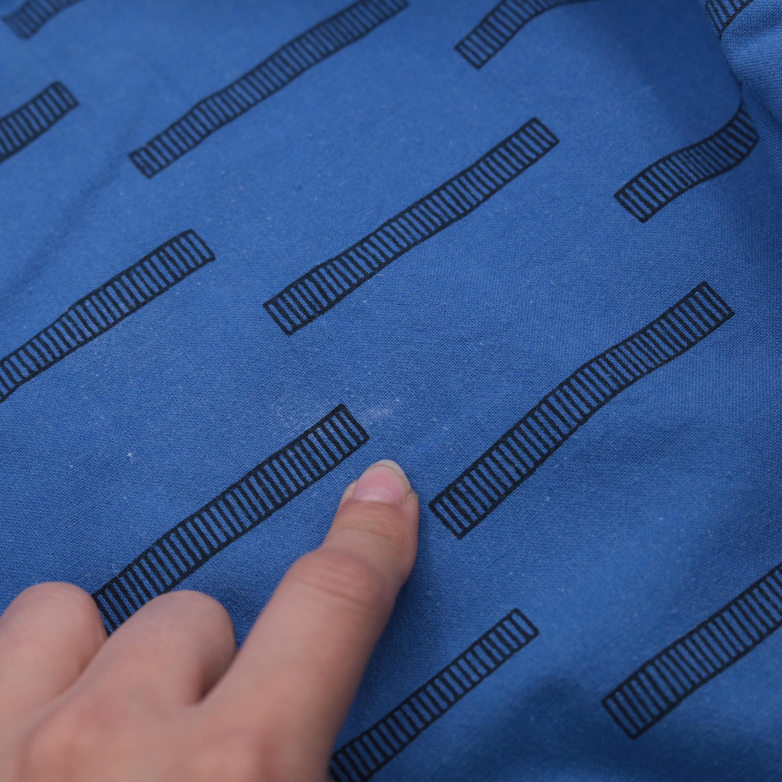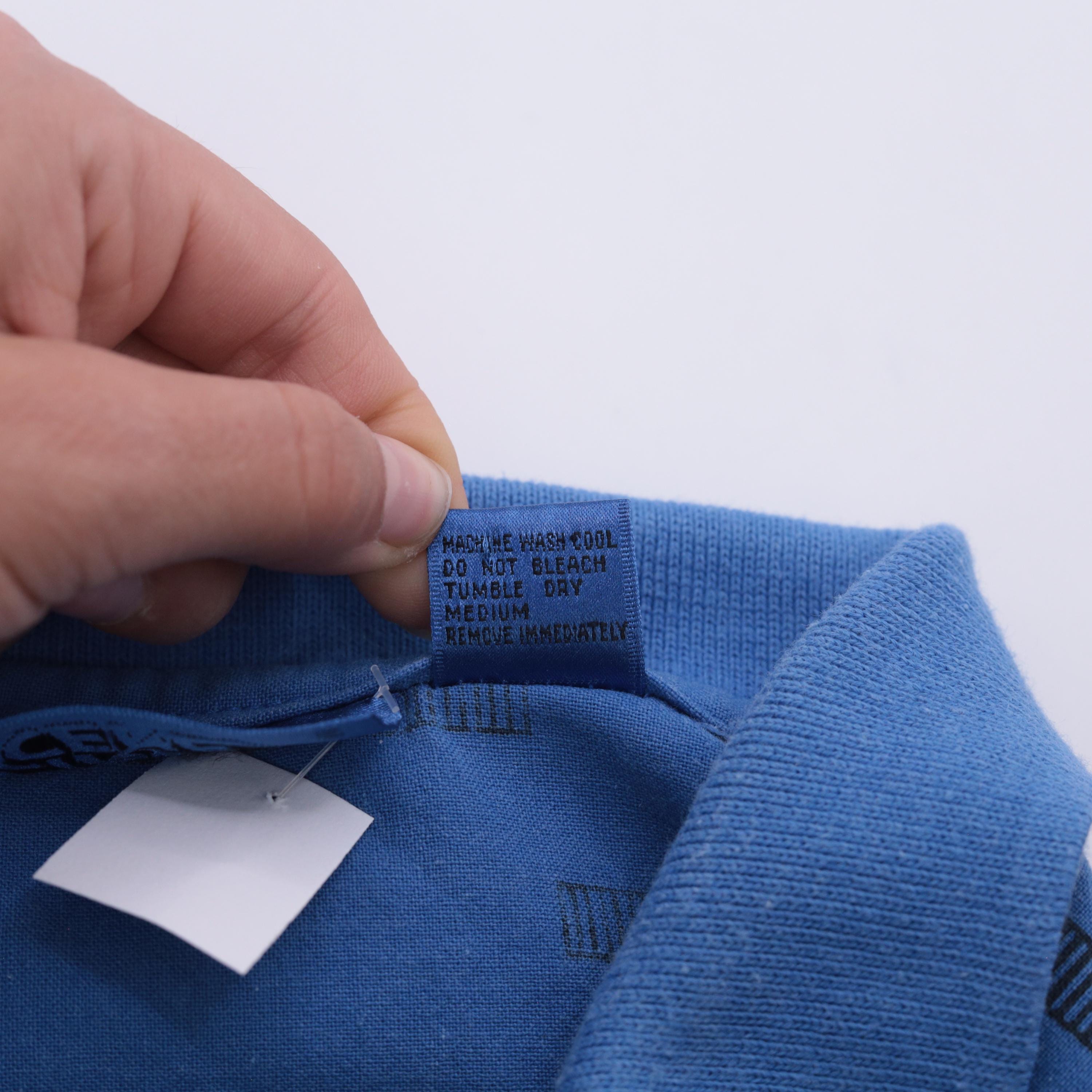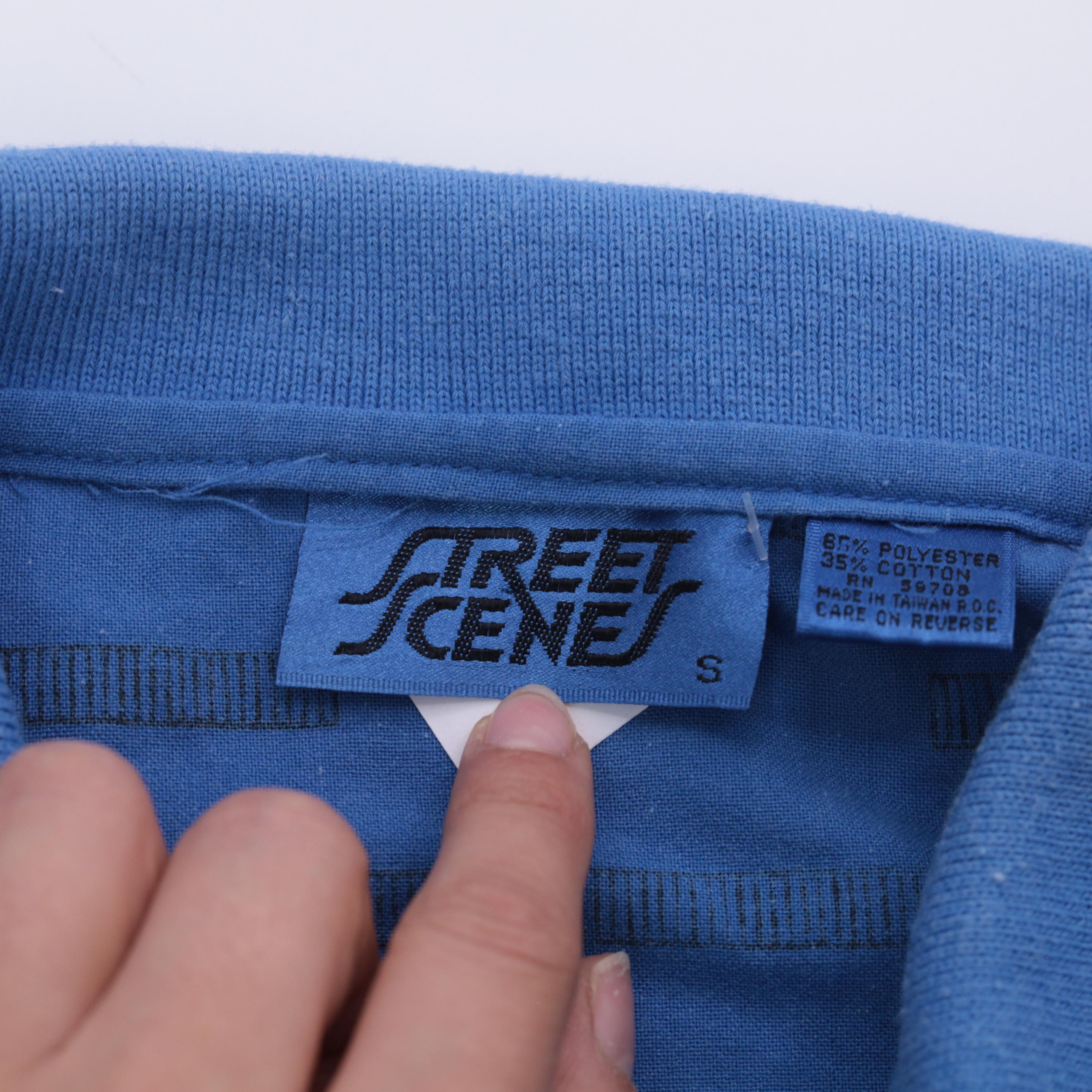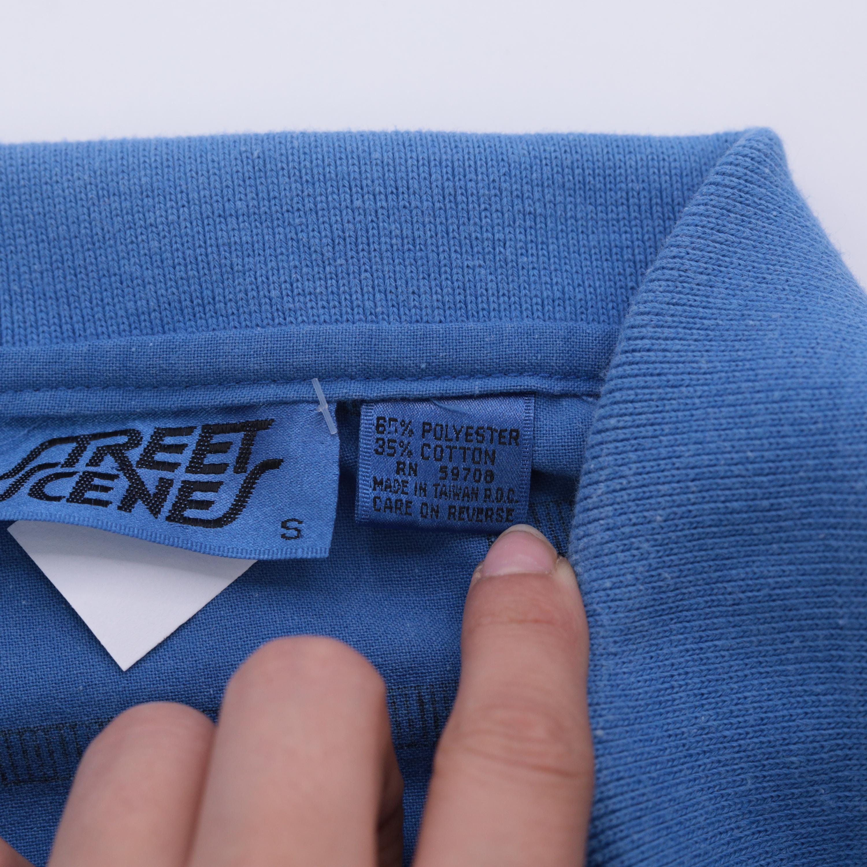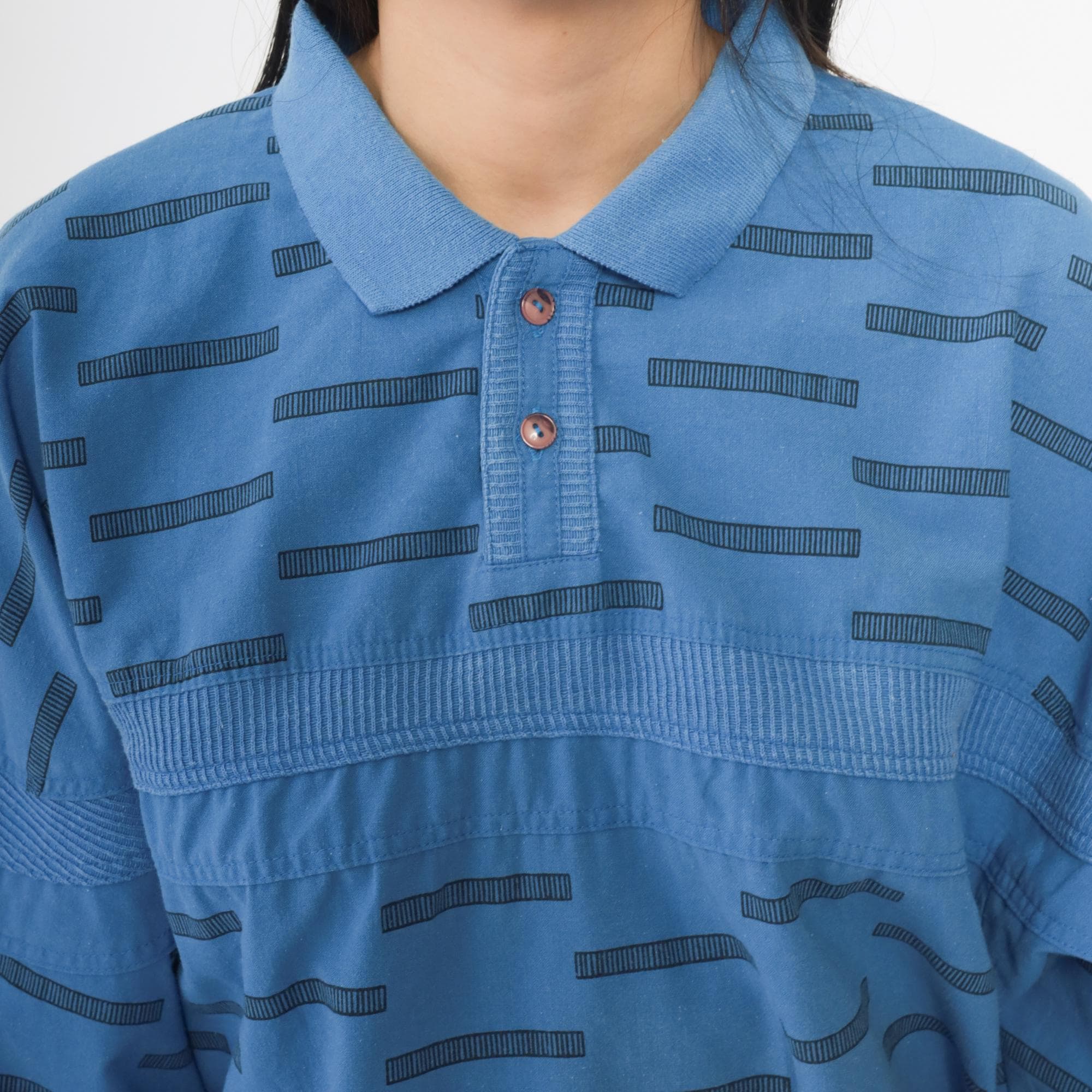 90s blue polo sweatshirt by Street Scenes. Features unique geometric linear pattern throughout in dark blue on medium blue background. Collared neckline with two-button placket. Long sleeves with ribbed cuffs. Horizontal ribbed panel across chest. Ribbed hem.