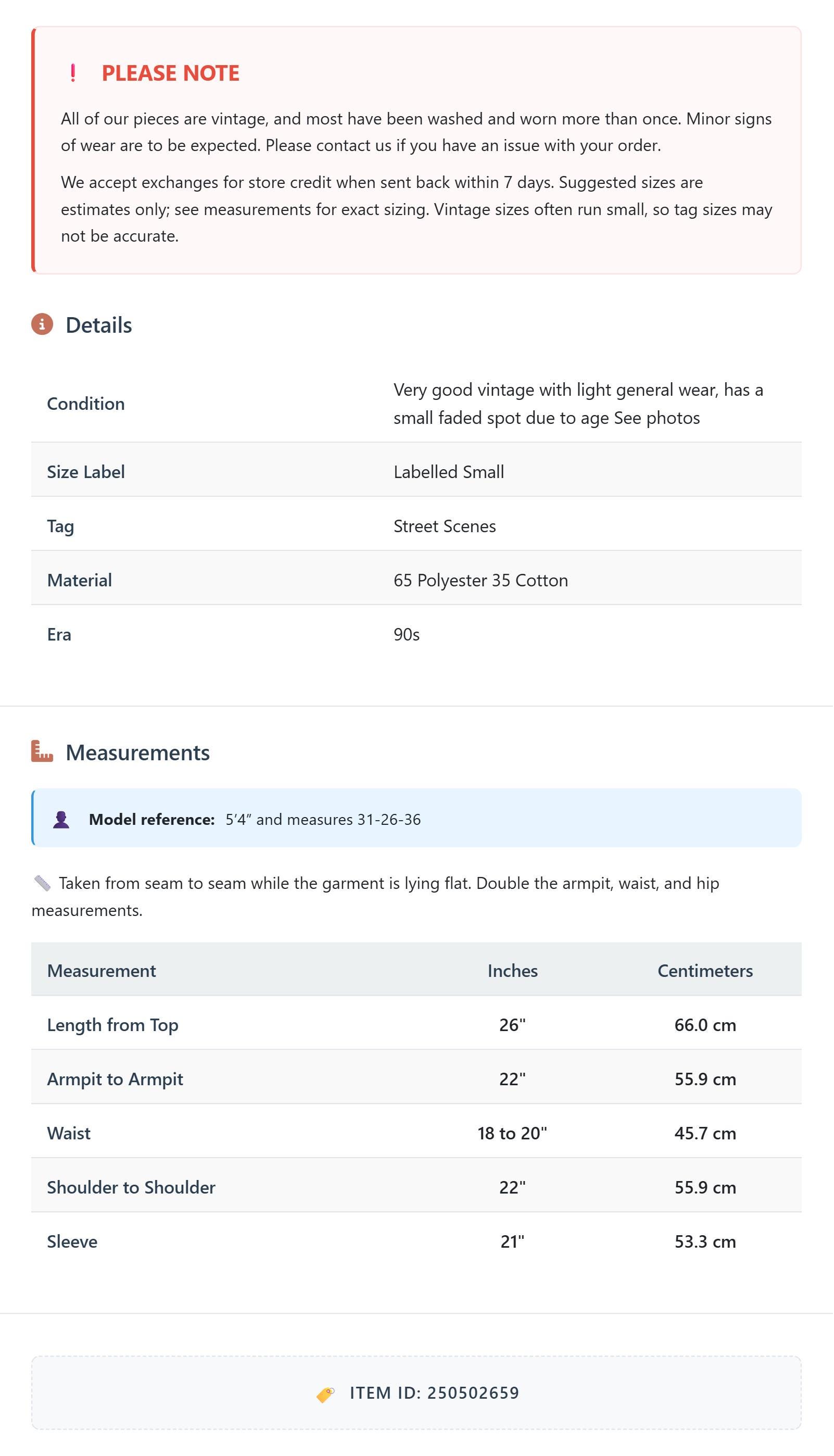 All of our pieces are vintage, and most have been washed and worn more than once. Minor signs of wear are to be expected. Please contact us if you have an issue with your order. We accept exchanges for store credit when sent back within 7 days.