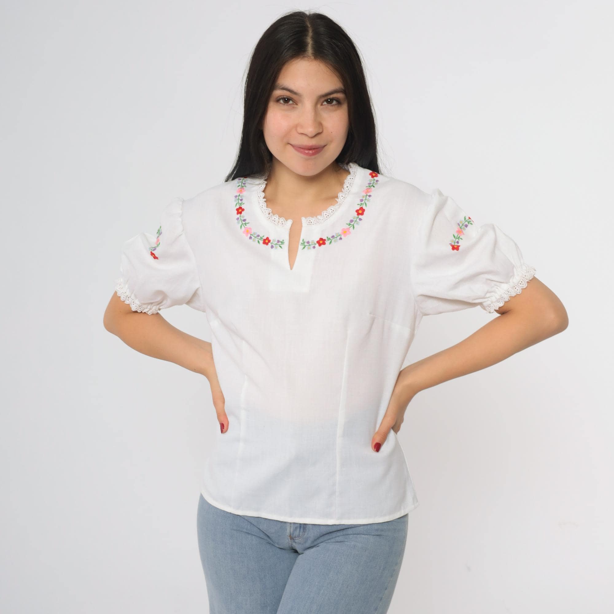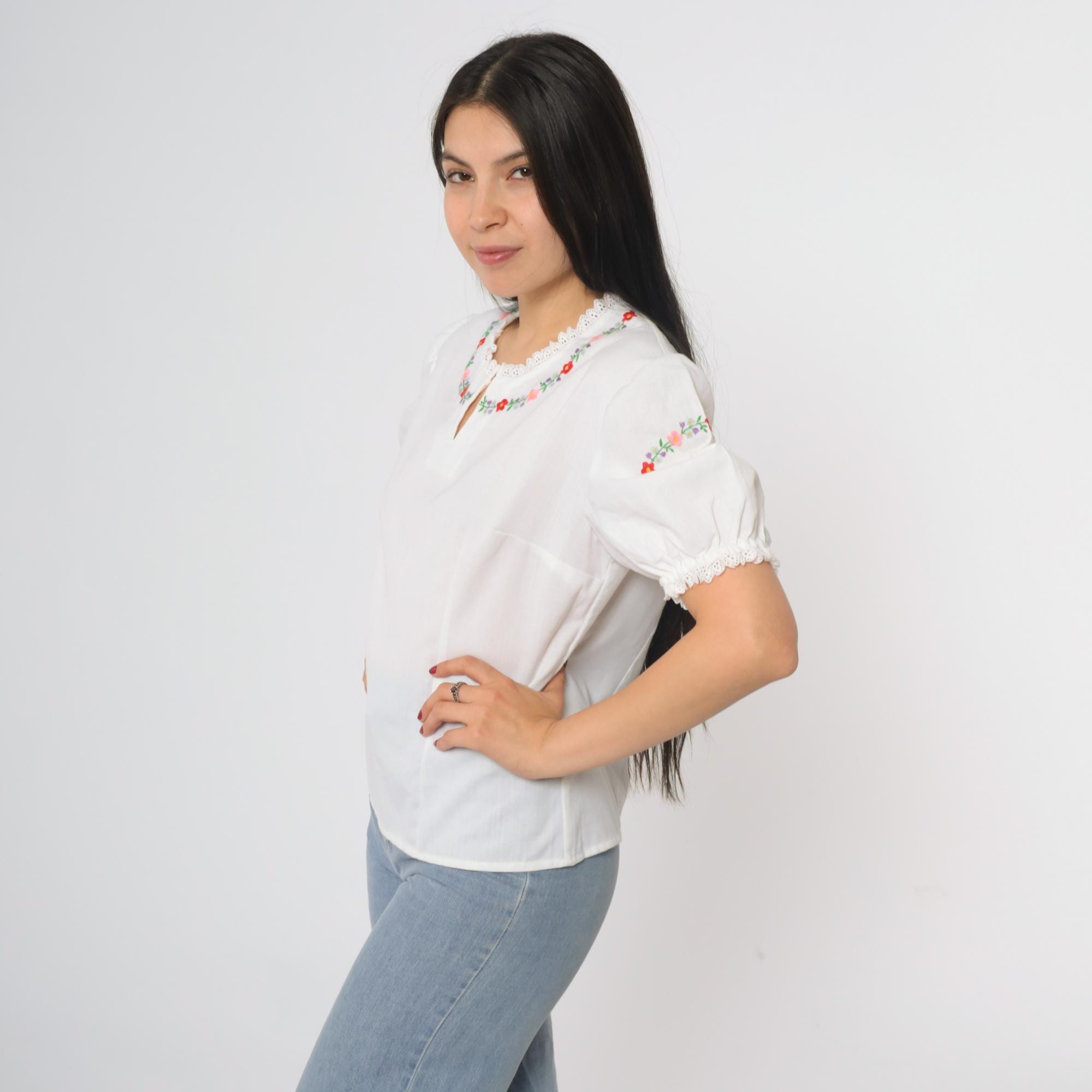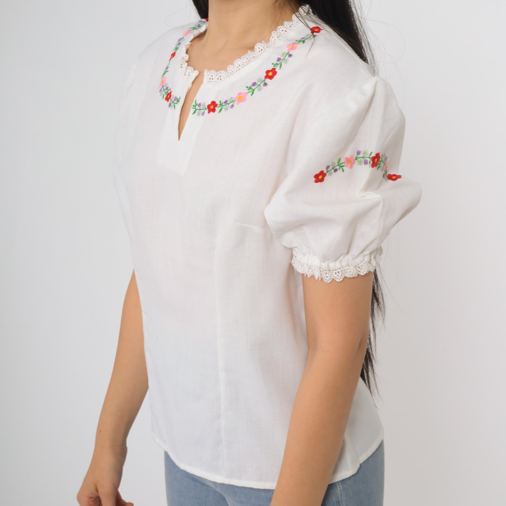 70s Hungarian-style peasant blouse in white cotton. Features colorful floral embroidery around neckline and shoulders in red, pink, and purple. Notched neckline with delicate eyelet lace trim. Short puff sleeves with matching lace trim.