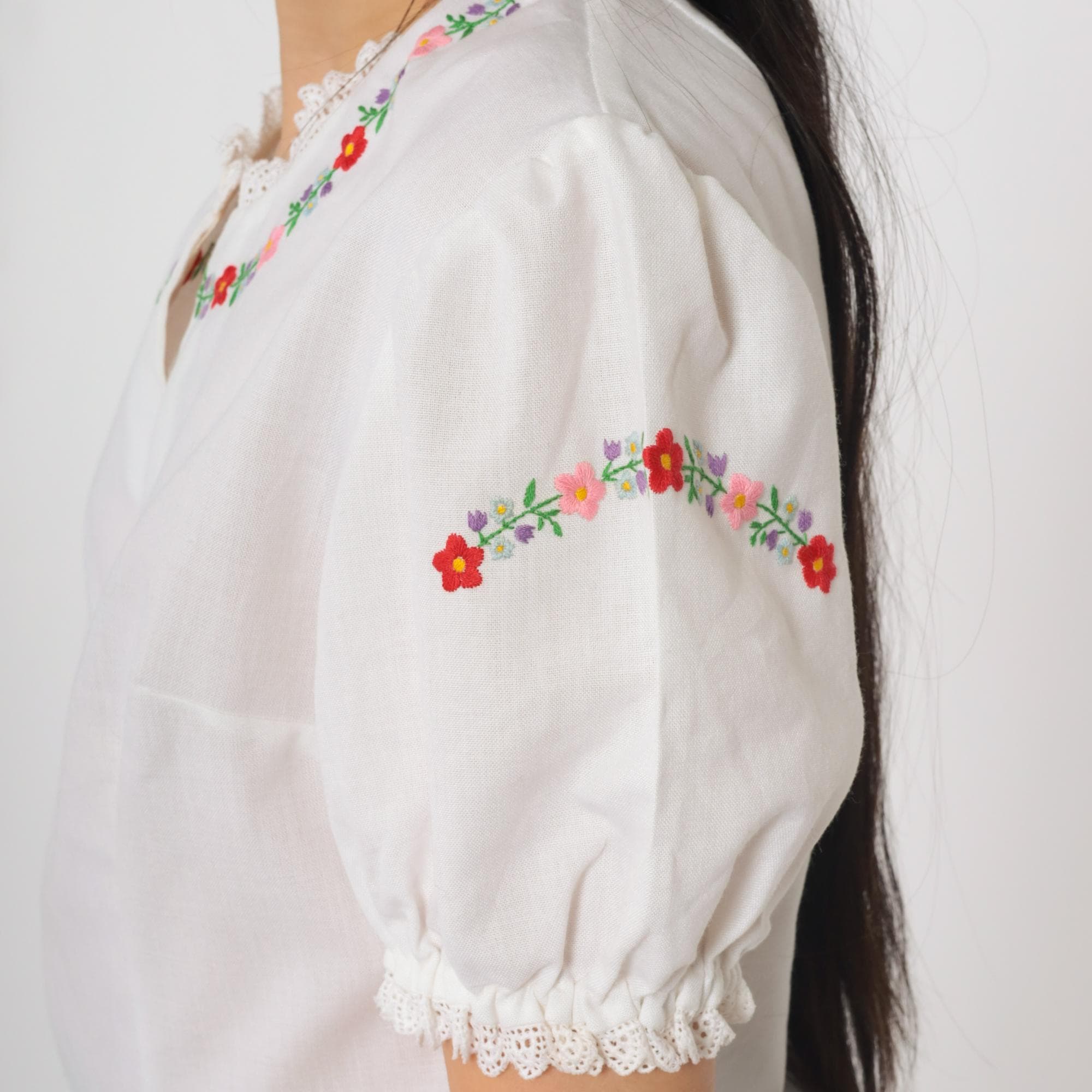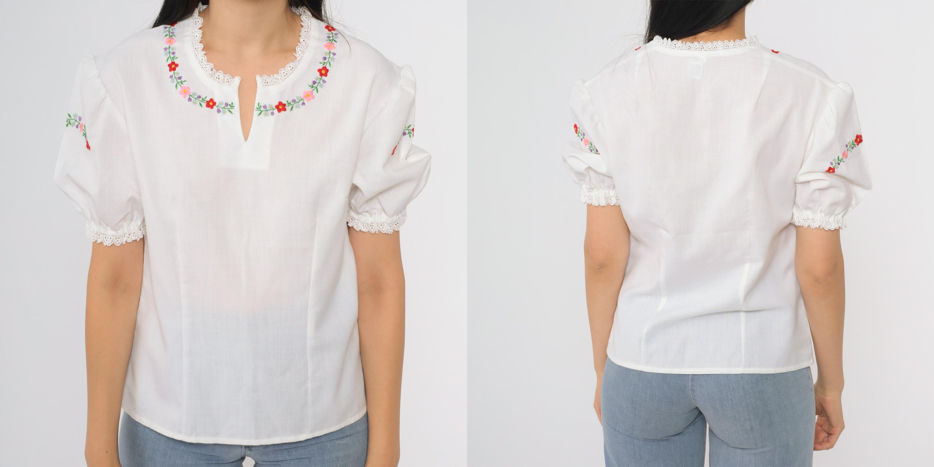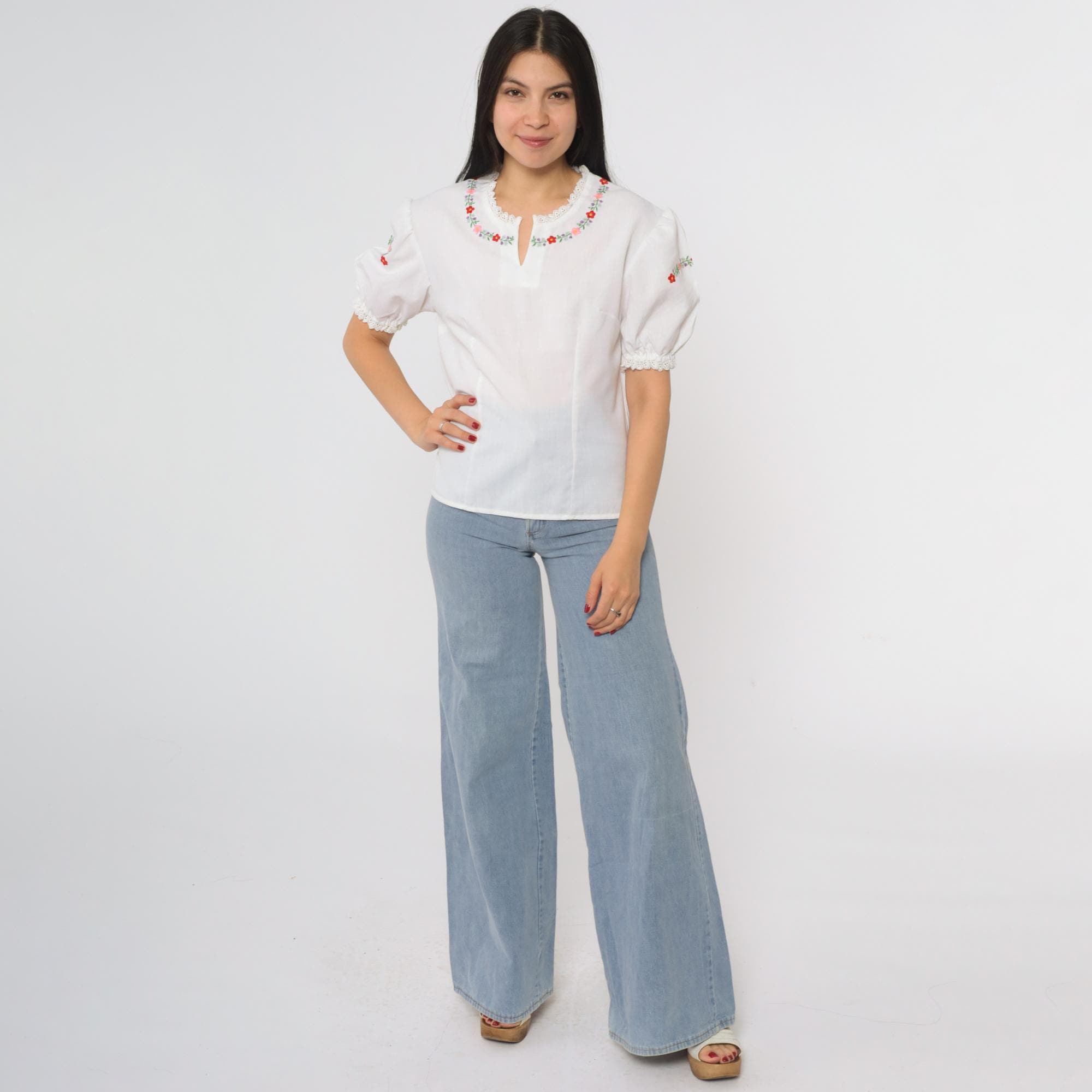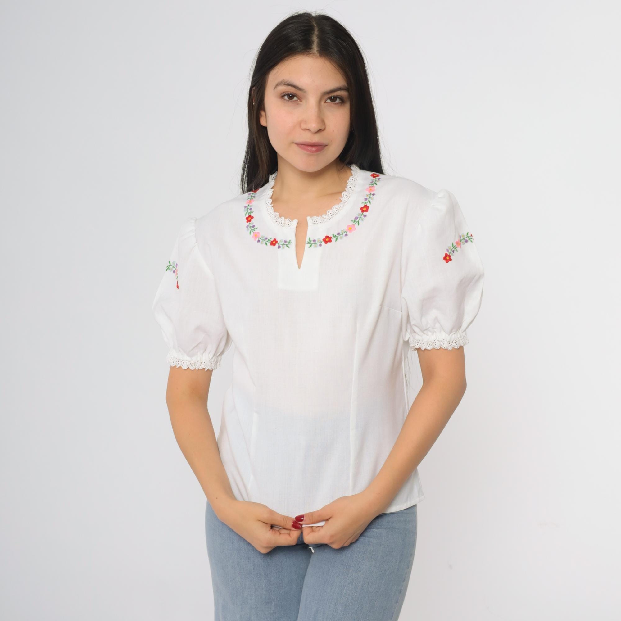 70s Hungarian-style peasant blouse in white cotton. Features colorful floral embroidery around neckline and shoulders in red, pink, and purple. Notched neckline with delicate eyelet lace trim. Short puff sleeves with matching lace trim.