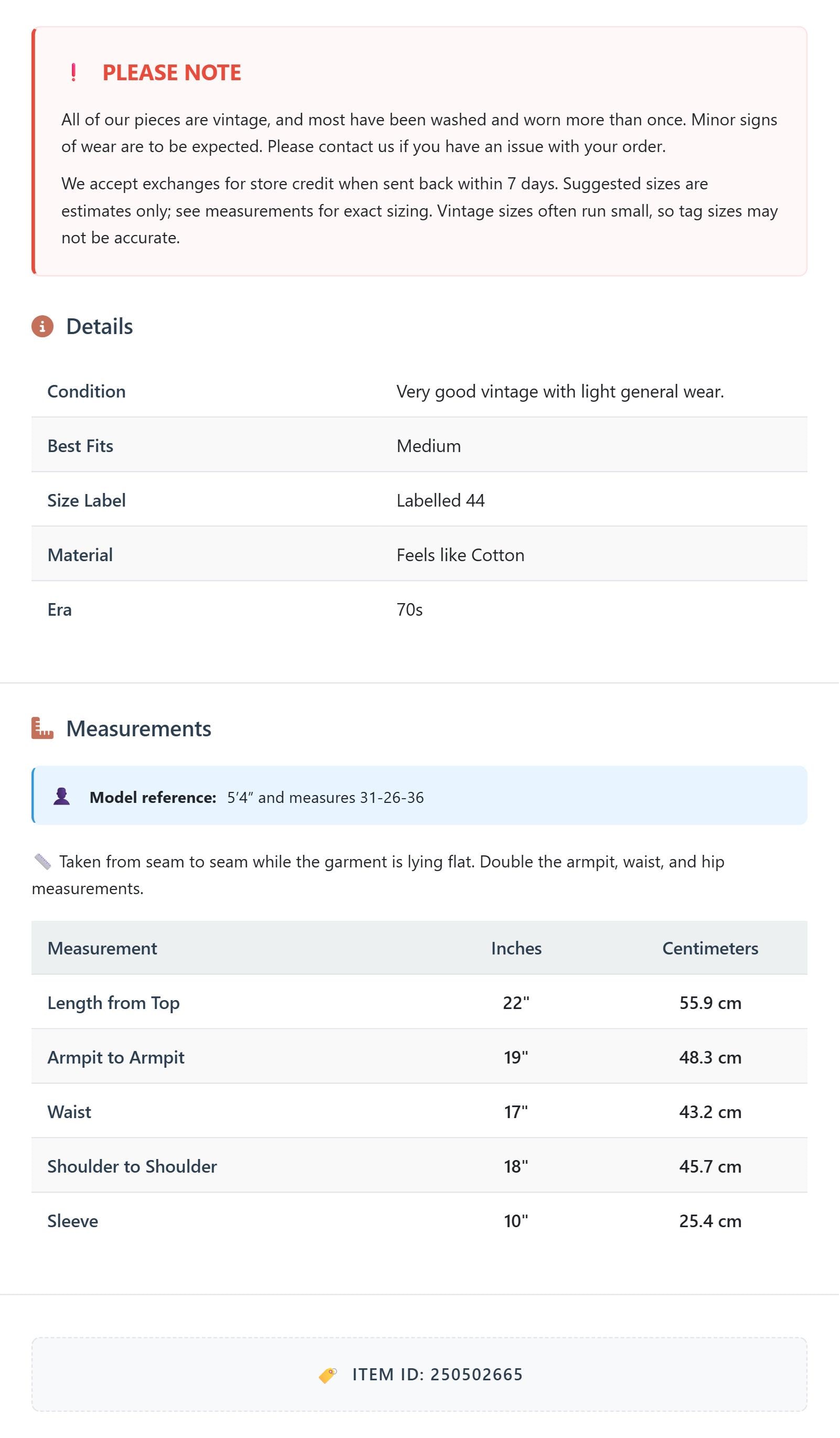 All of our pieces are vintage, and most have been washed and worn more than once. Minor signs of wear are to be expected. Please contact us if you have an issue with your order. We accept exchanges for store credit when sent back within 7 days.
