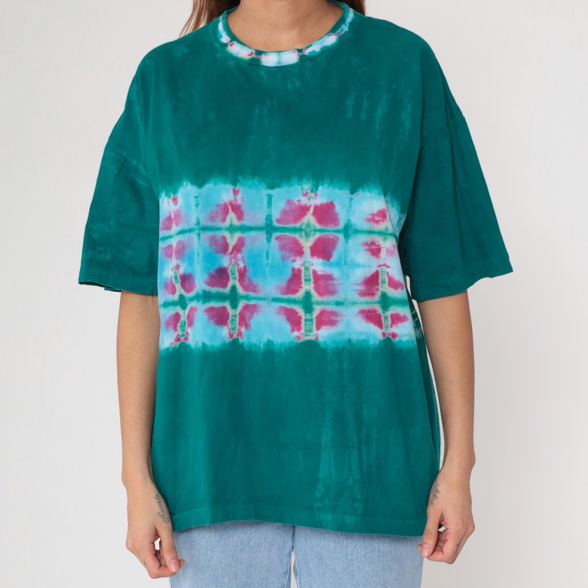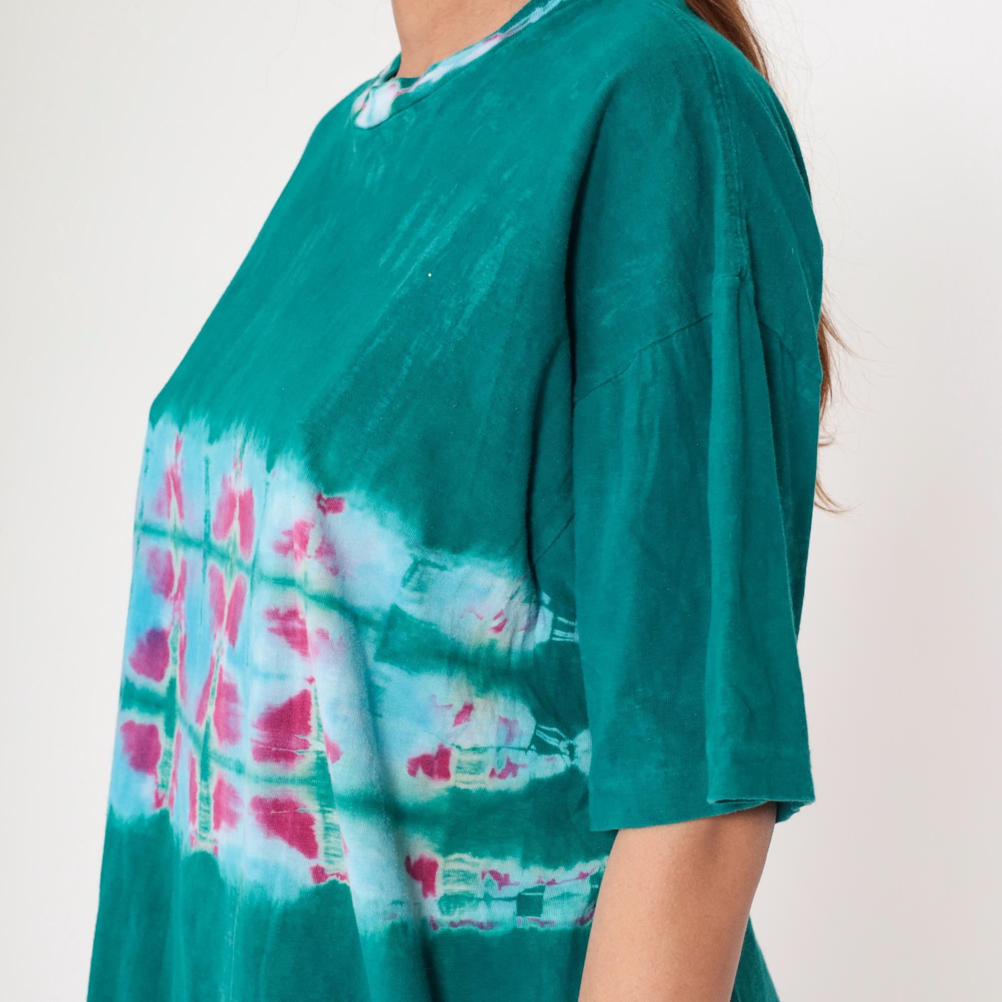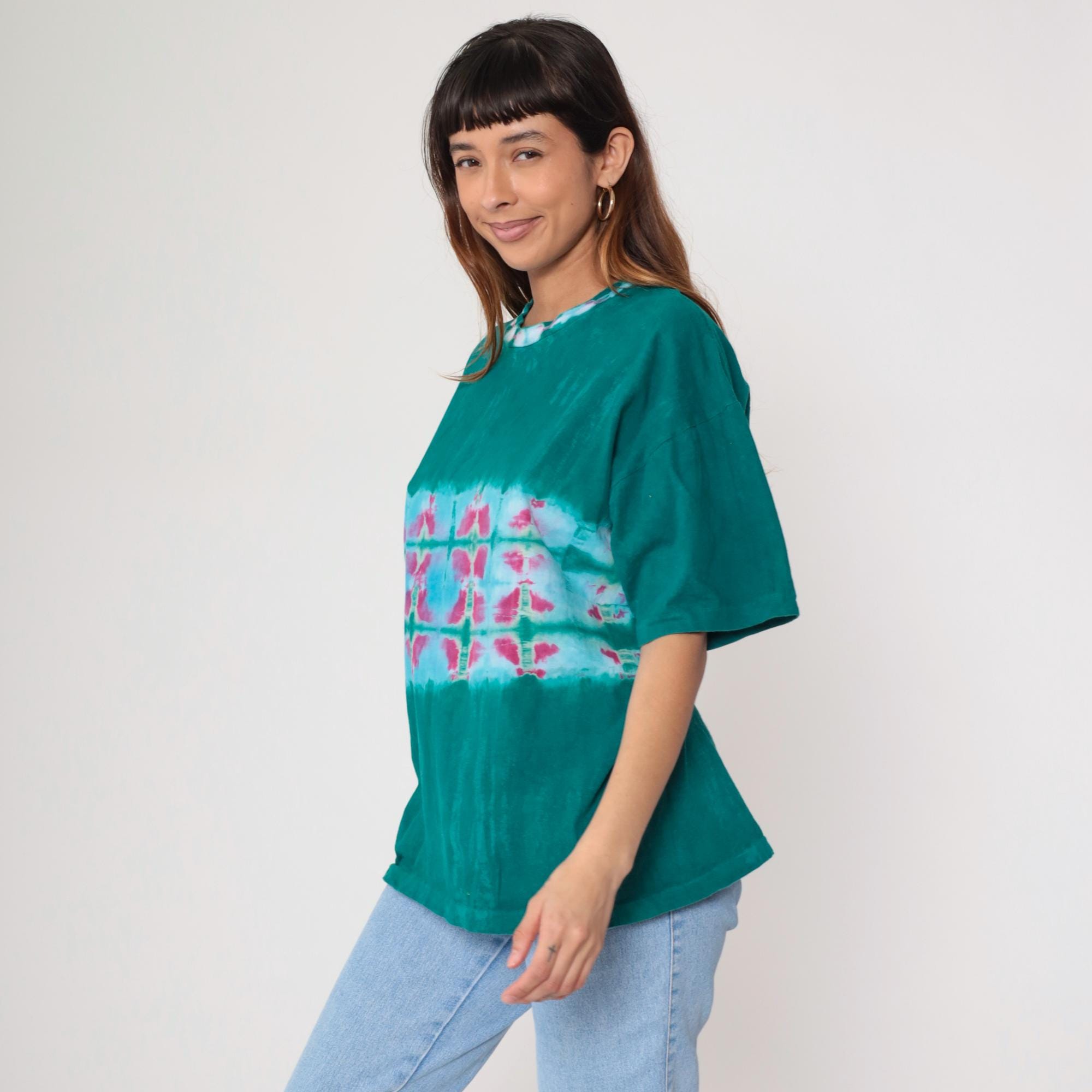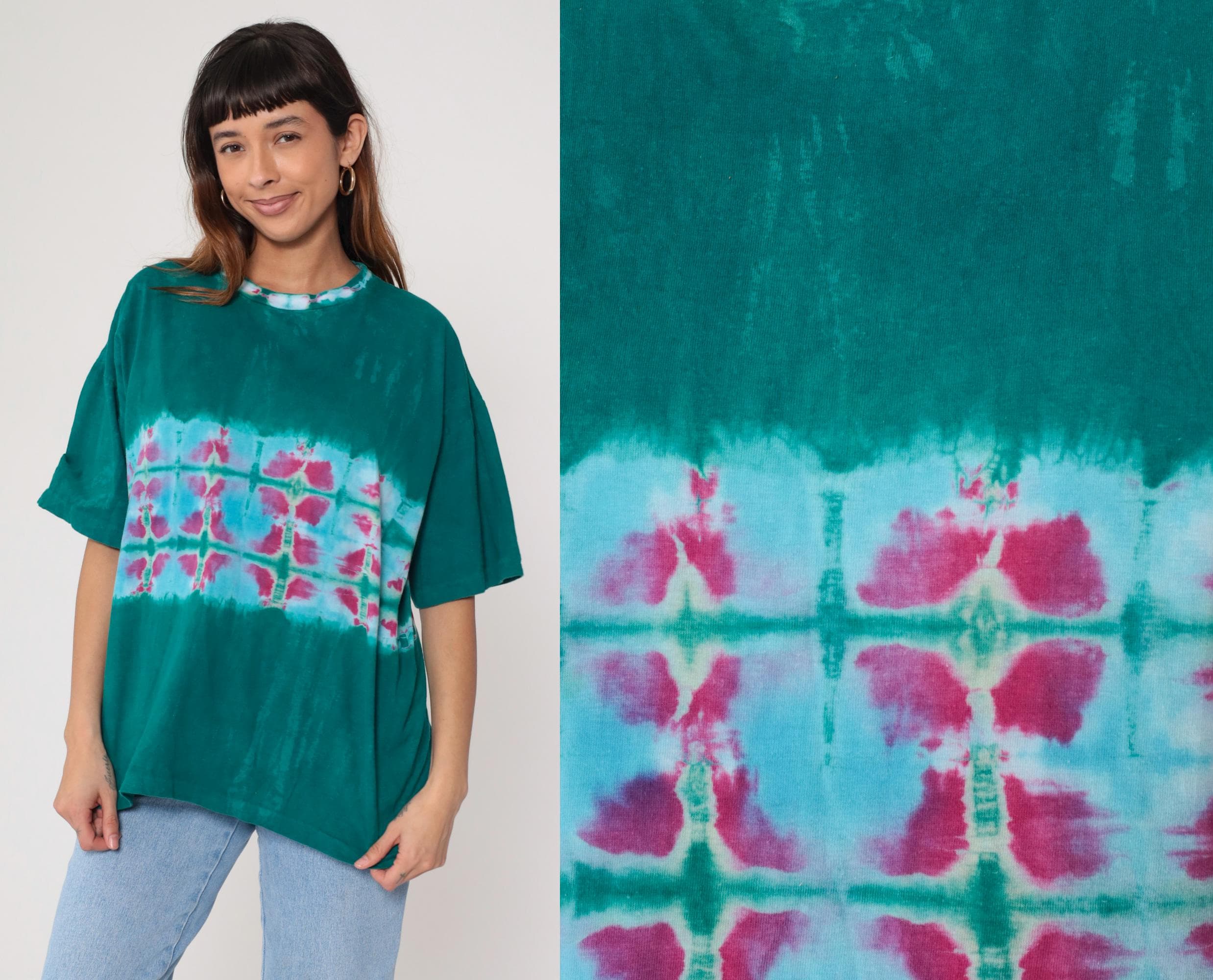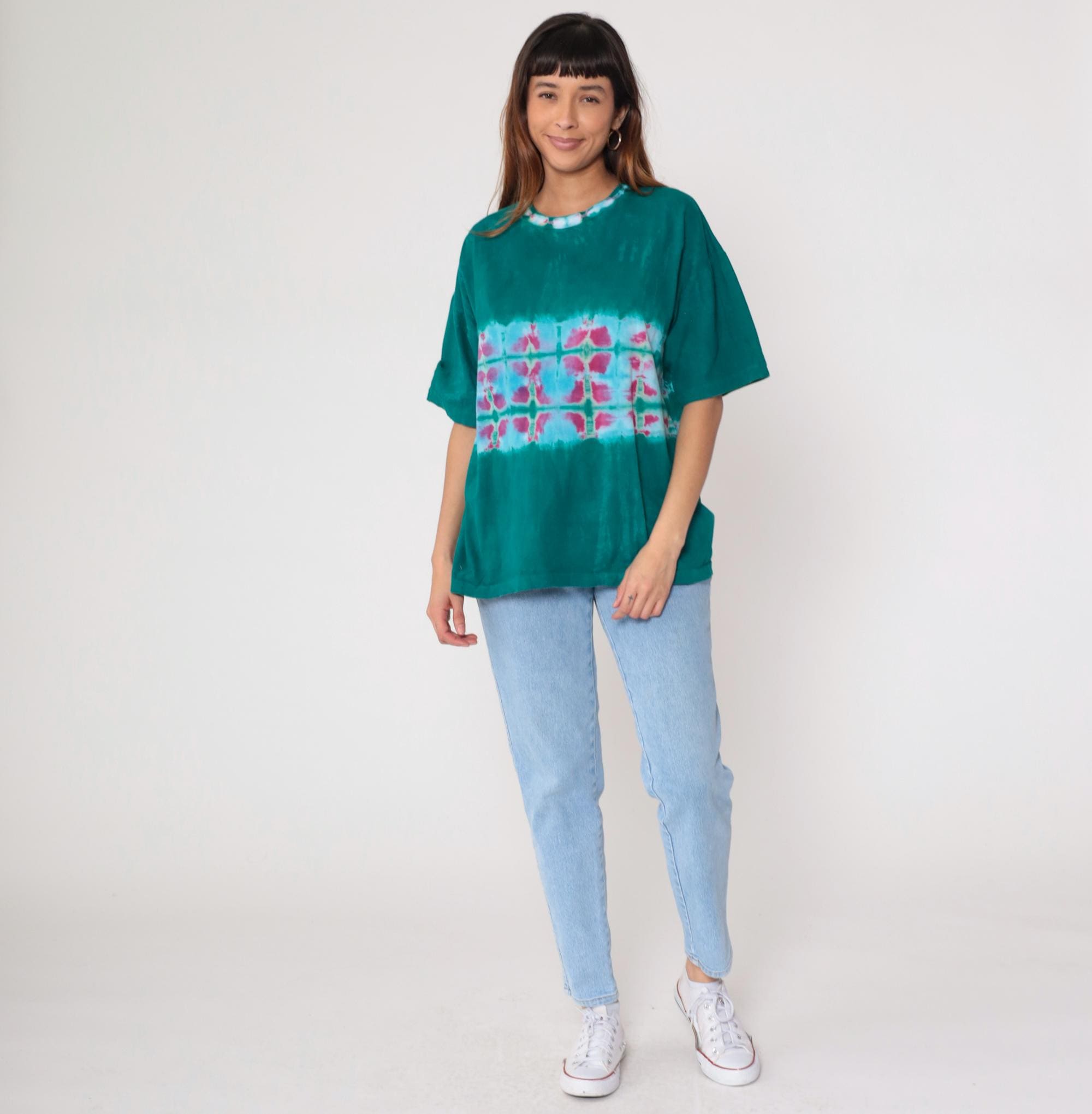 90s oversized t-shirt featuring horizontal tie dye pattern with teal background and pink shibori center stripe. Crew neck with short sleeves and boxy fit.
