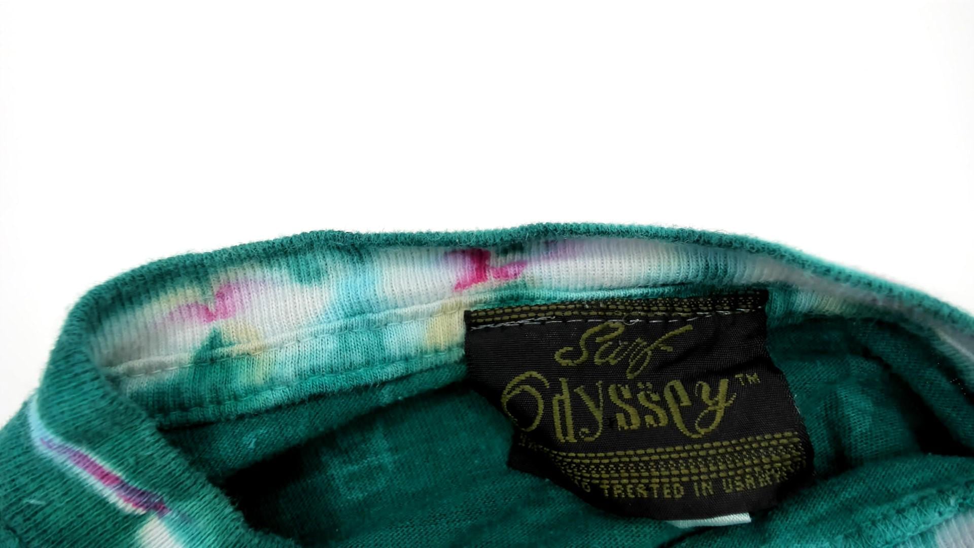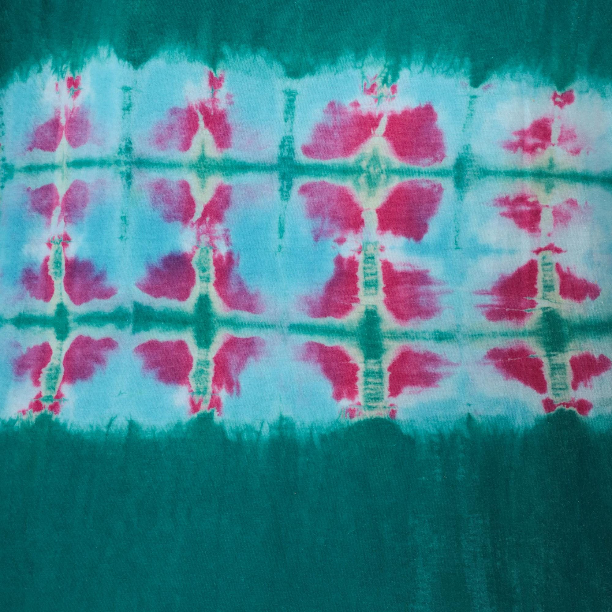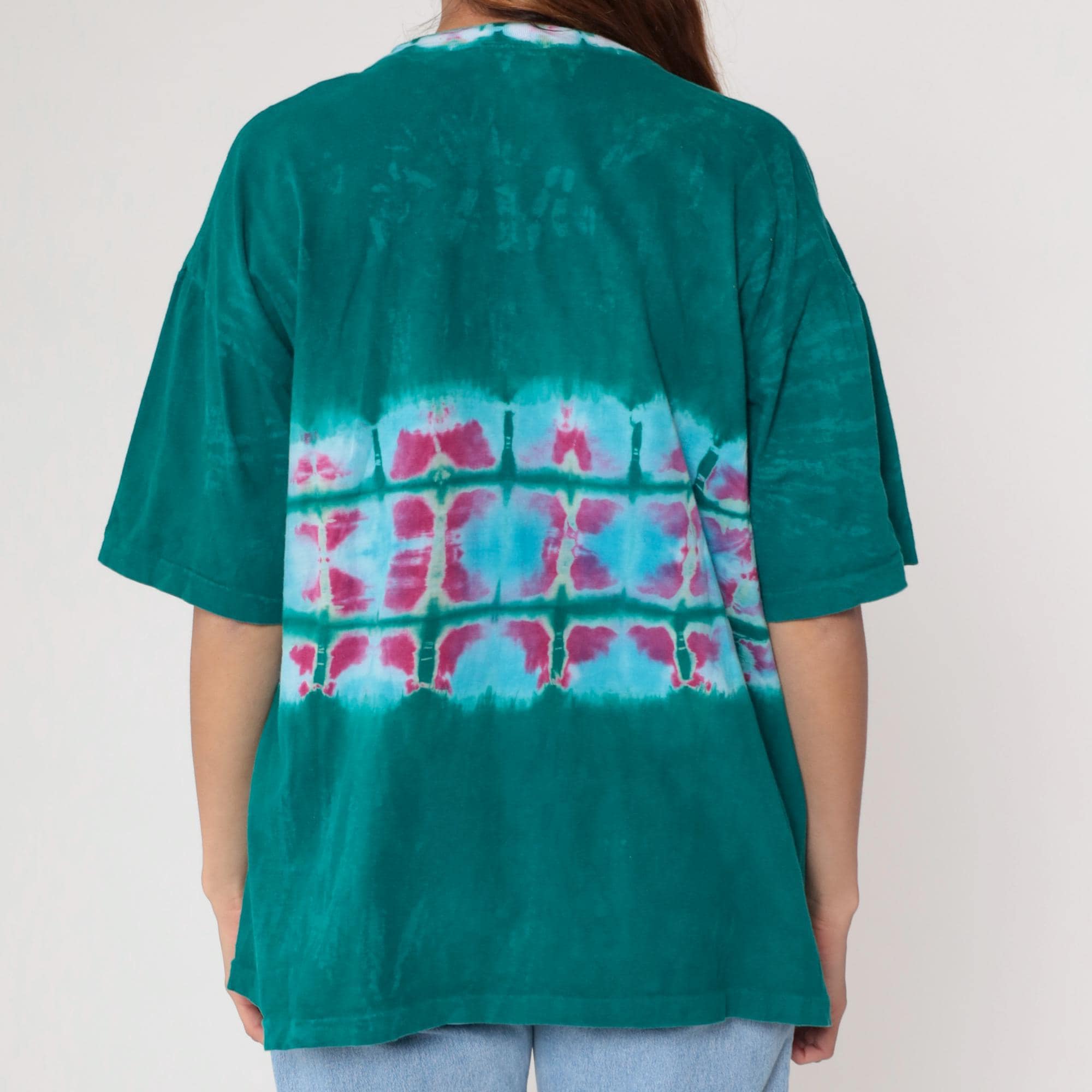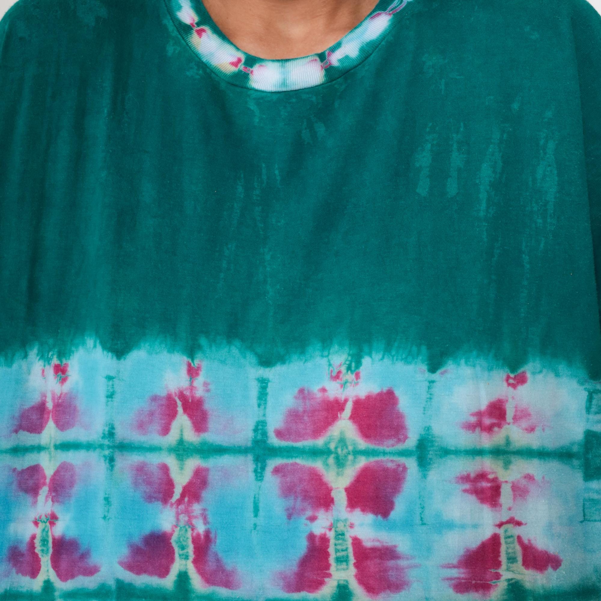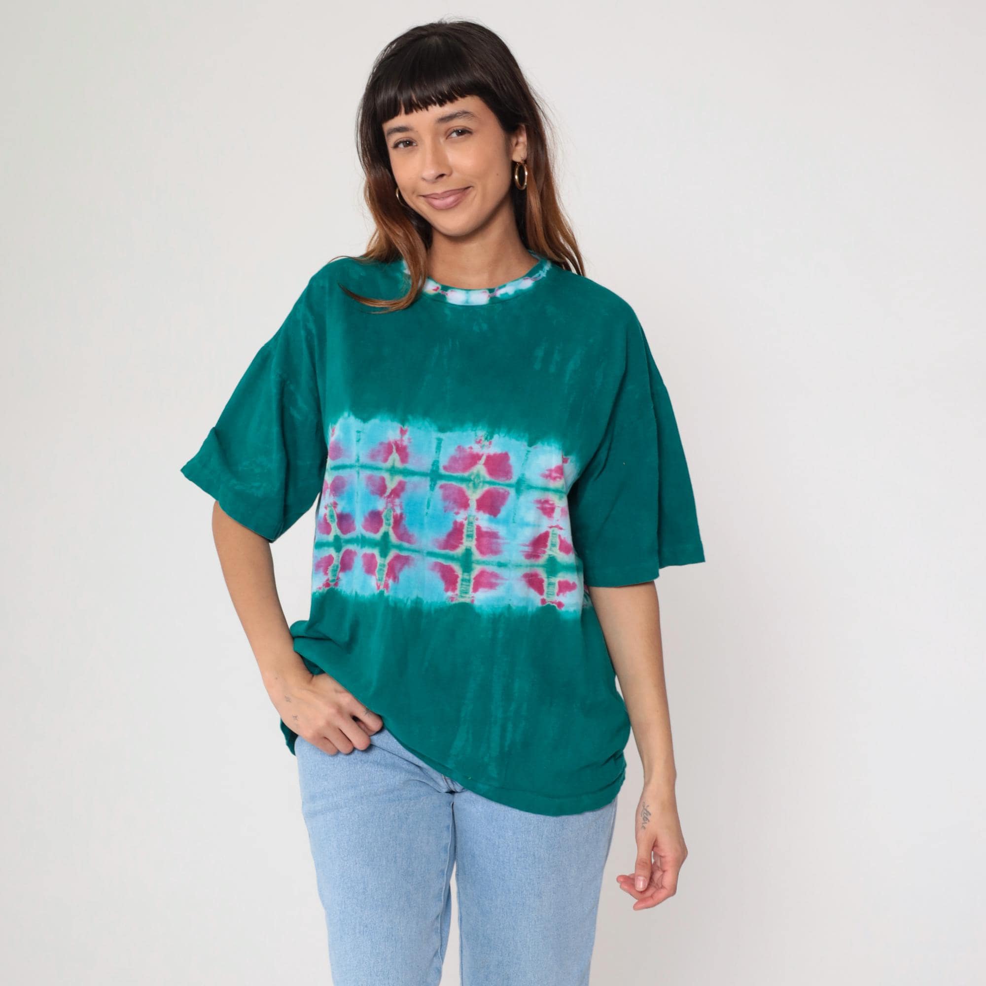 90s oversized t-shirt featuring horizontal tie dye pattern with teal background and pink shibori center stripe. Crew neck with short sleeves and boxy fit.