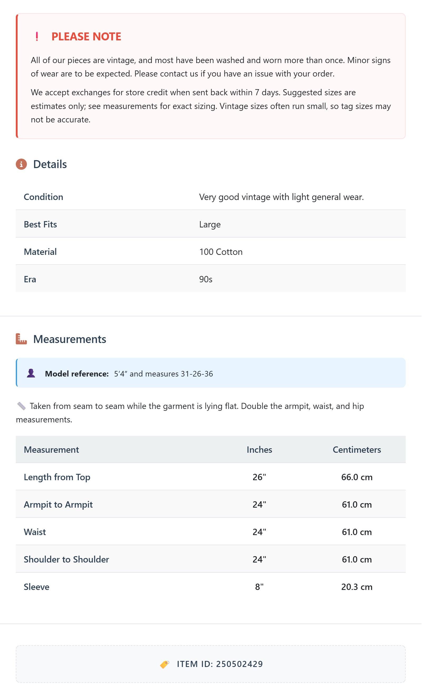 All of our pieces are vintage, and most have been washed and worn more than once. Minor signs of wear are to be expected. Please contact us if you have an issue with your order. We accept exchanges for store credit when sent back within 7 days.