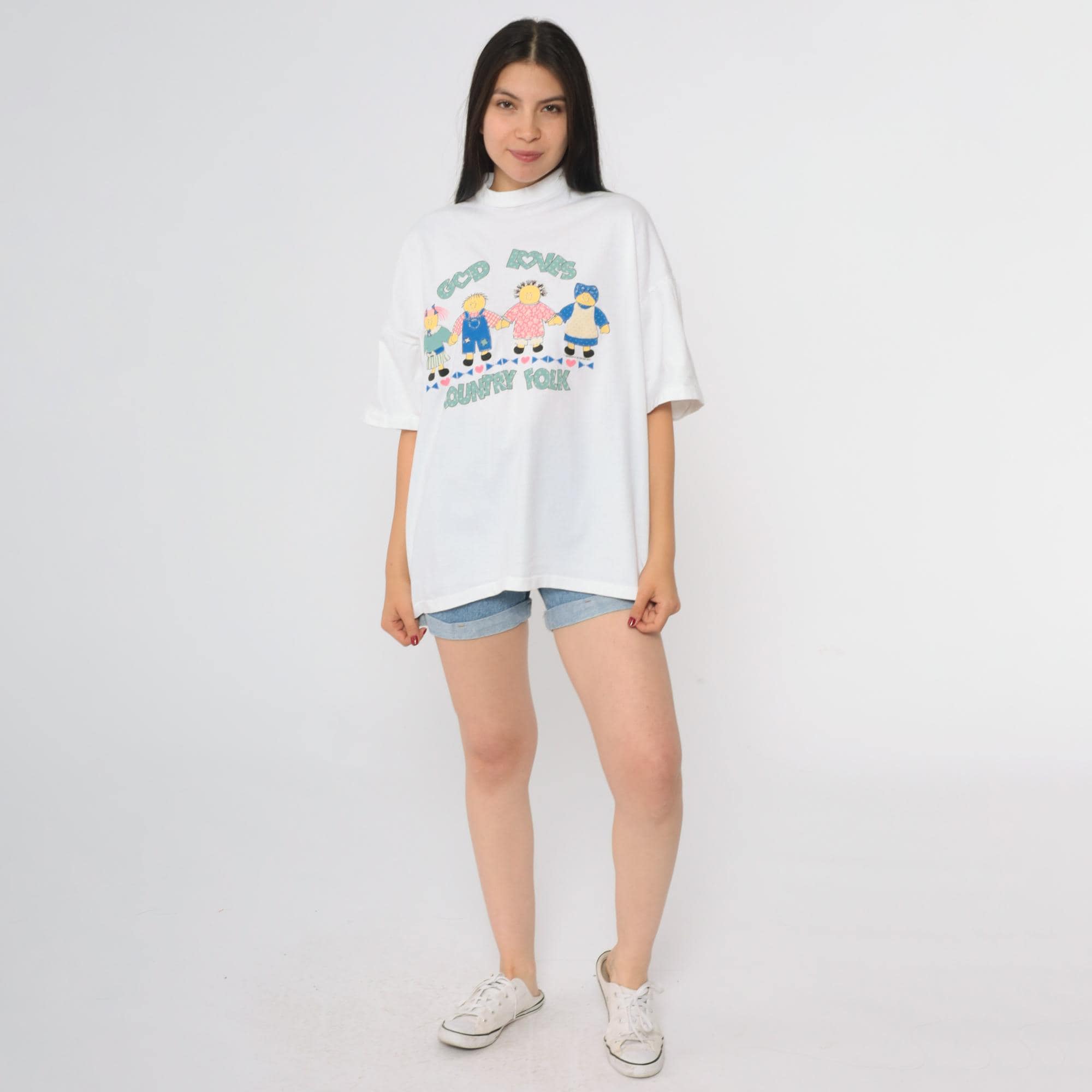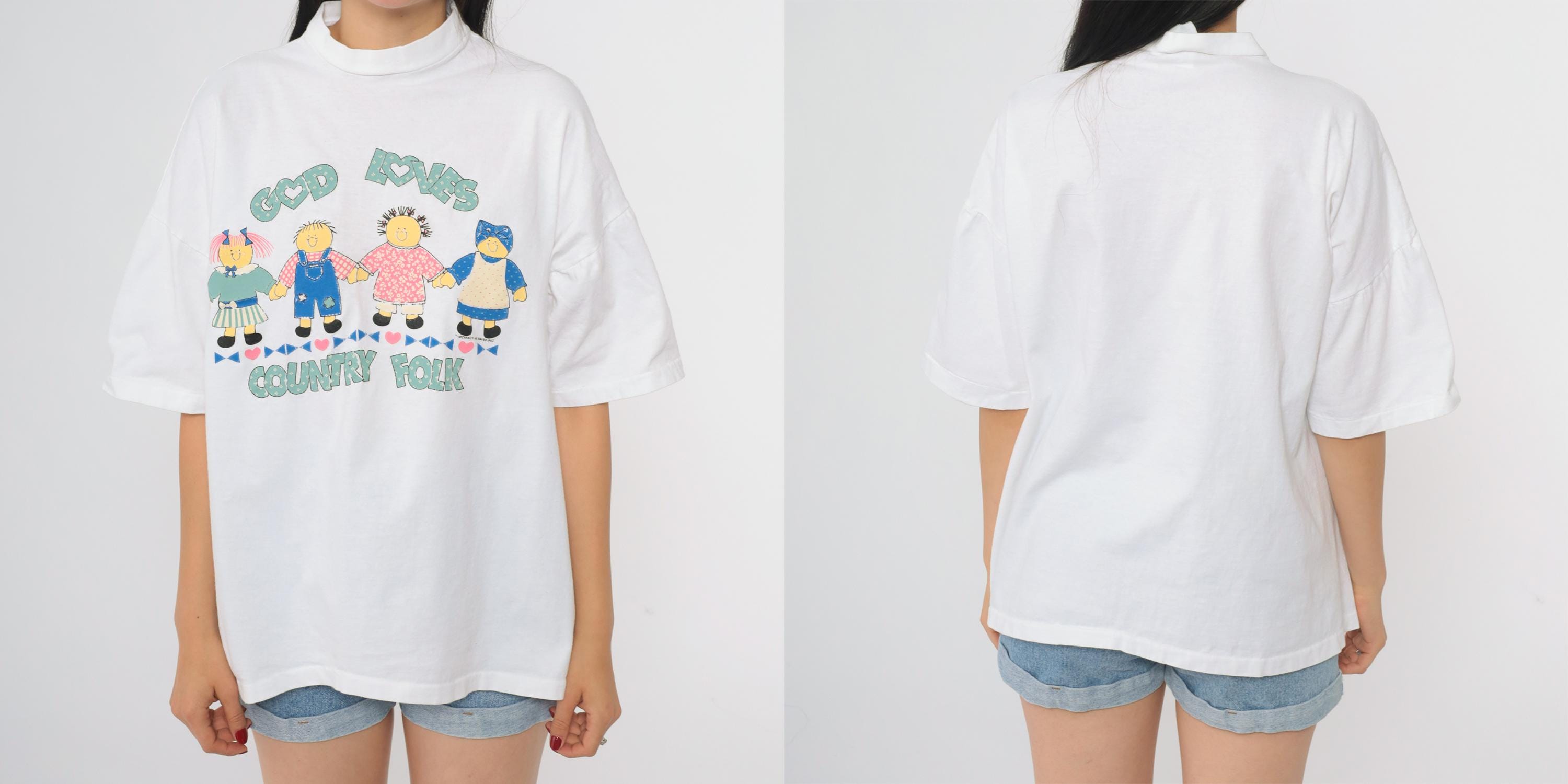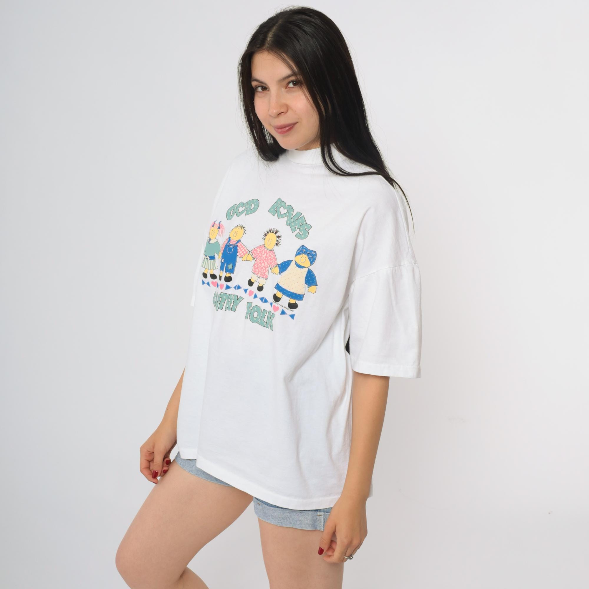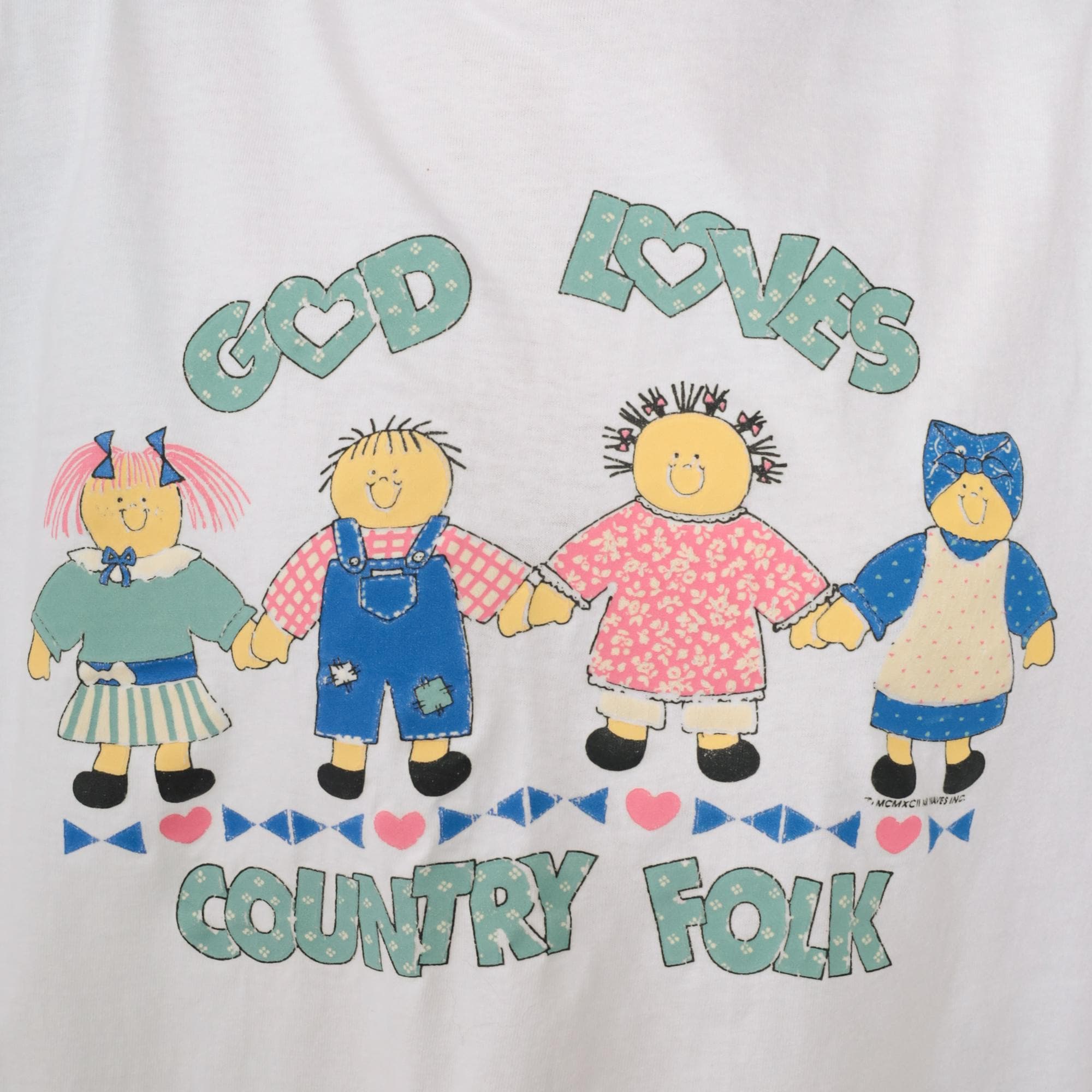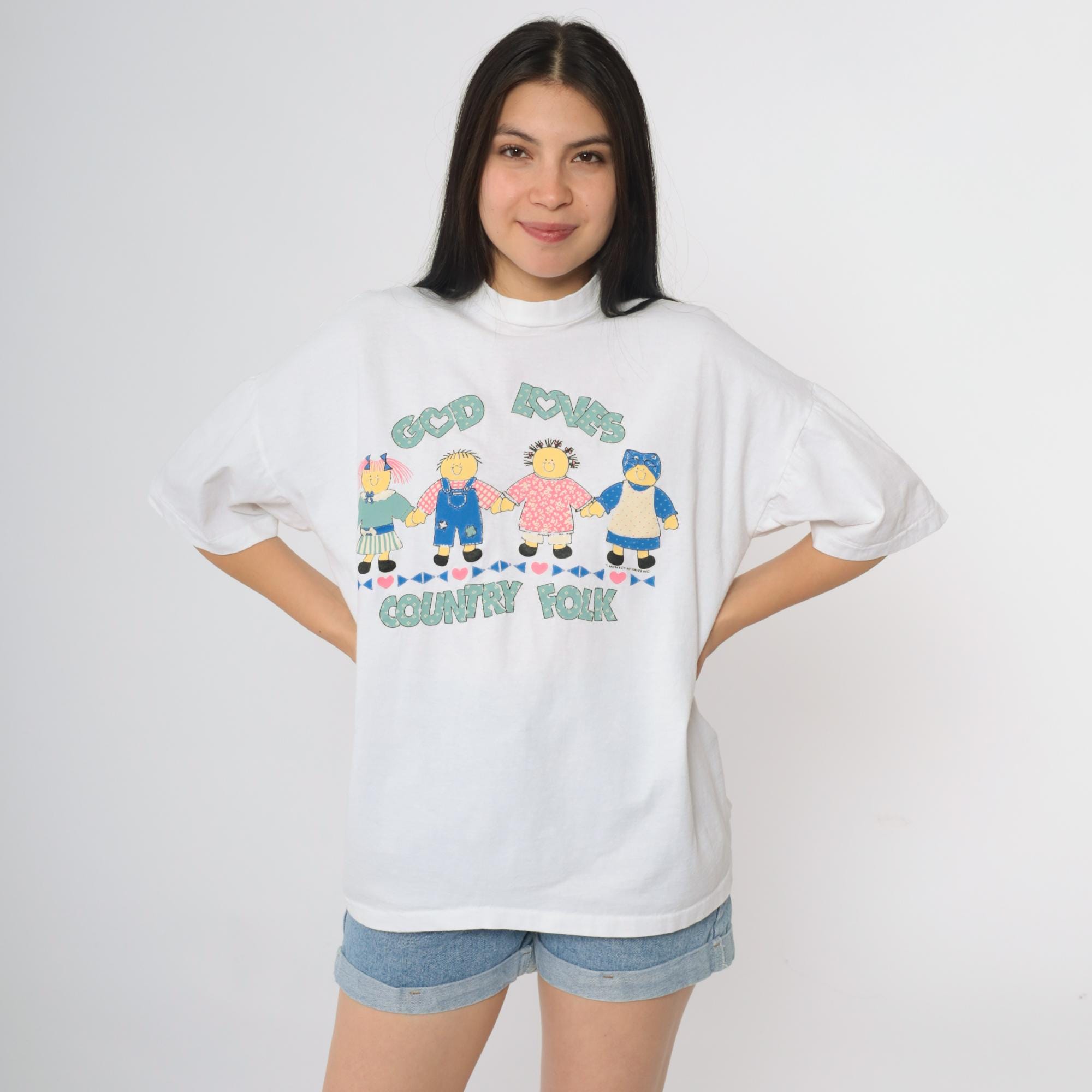 90s Christian t-shirt featuring "God Loves Country Folk" graphic. White cotton shirt with cute cartoon doll figures holding hands across the front. Text in mint green with heart details. Children figures in colorful outfits including blue overalls, pink dress, and green/blue attire.