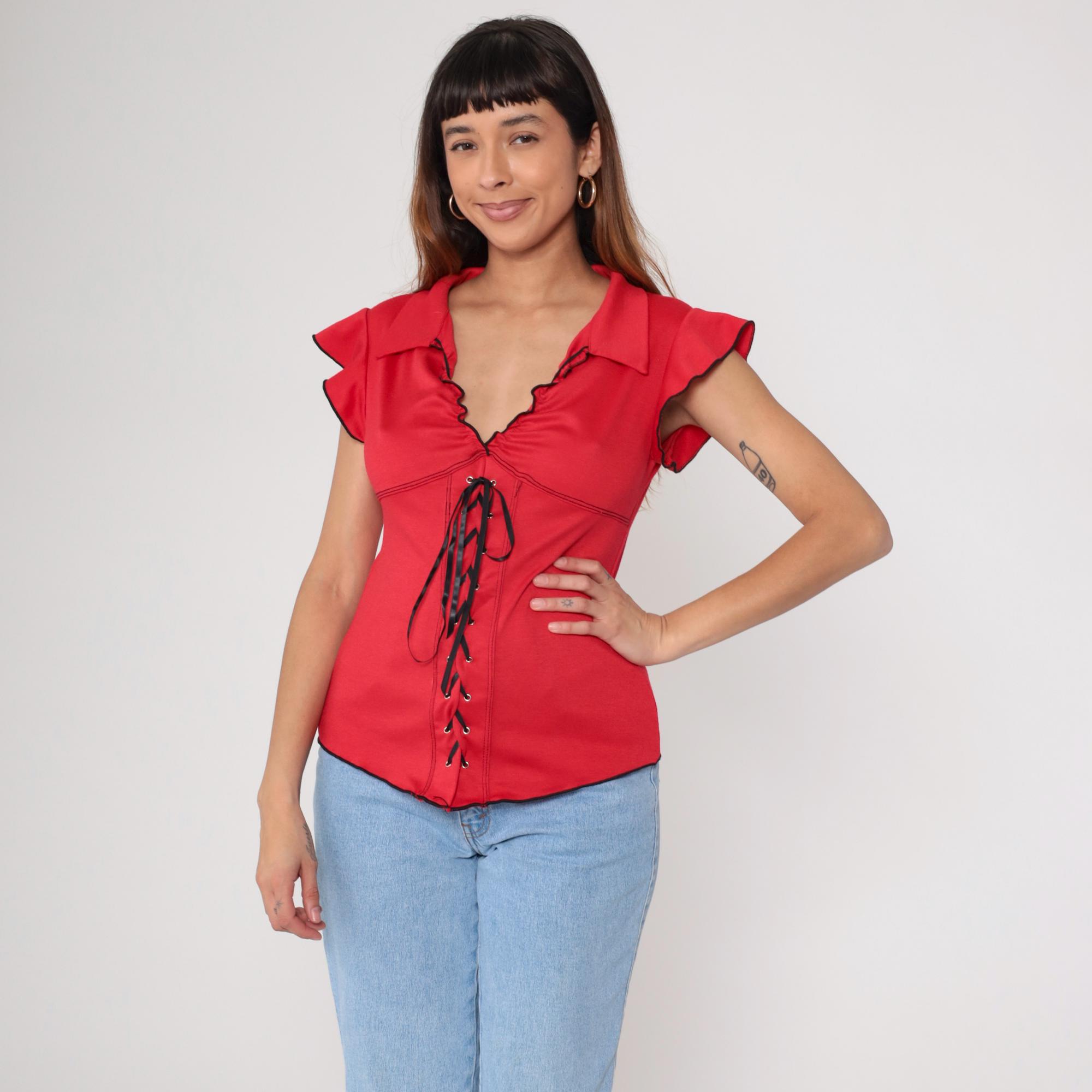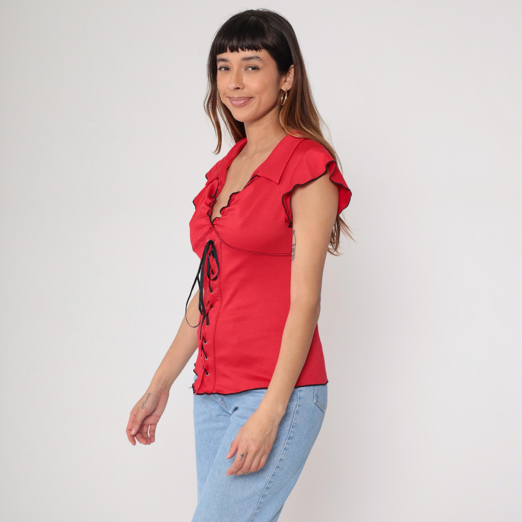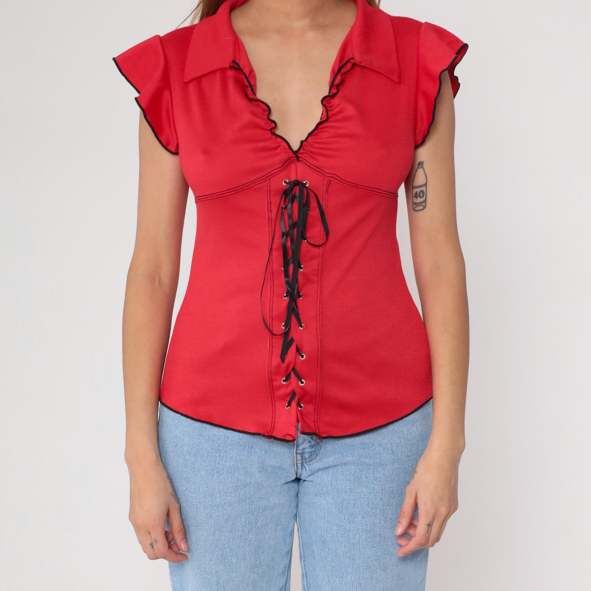 Y2K red top featuring black trim and corset-style lace-up front with grommets. Pointed collar with ruffle cap sleeves and deep V neckline.