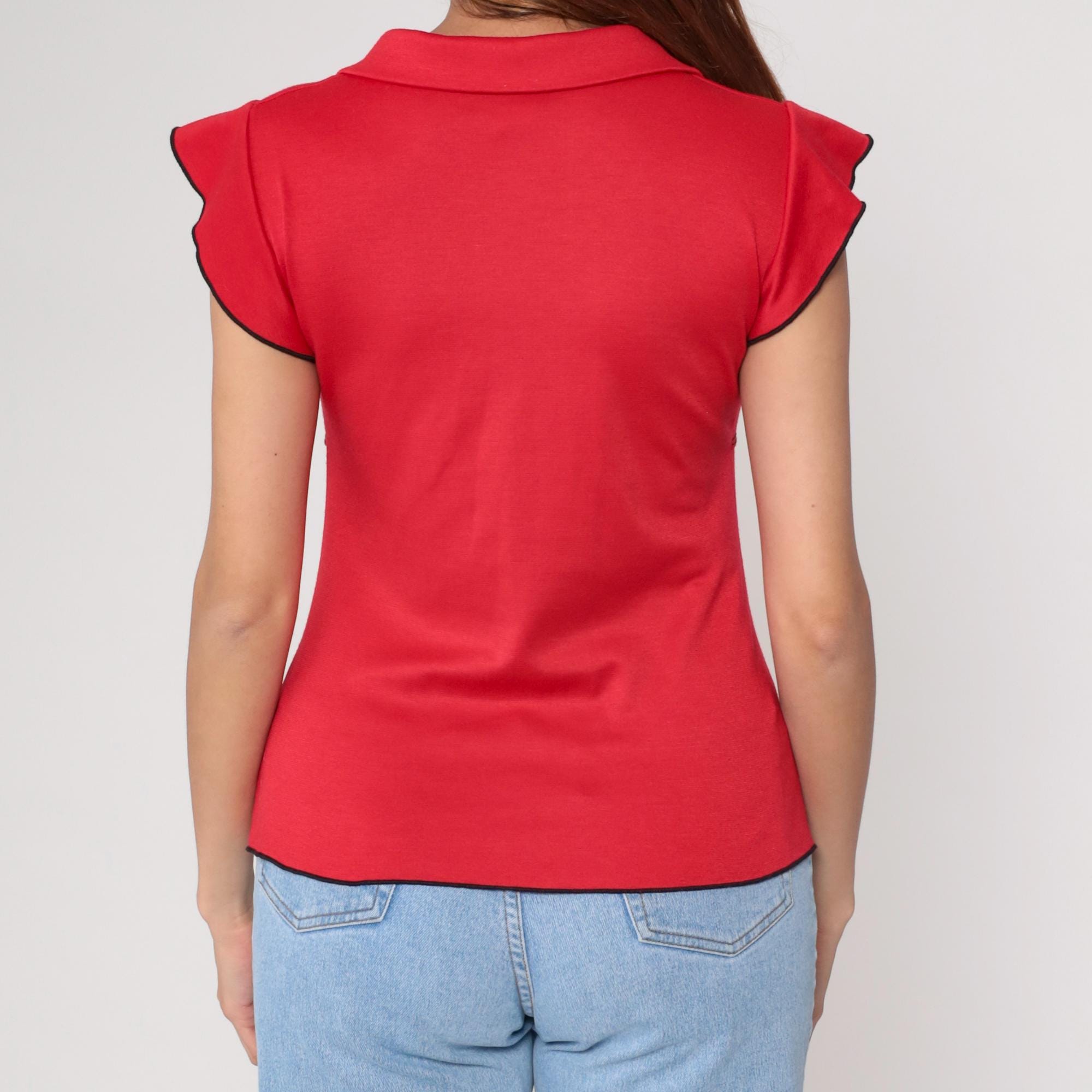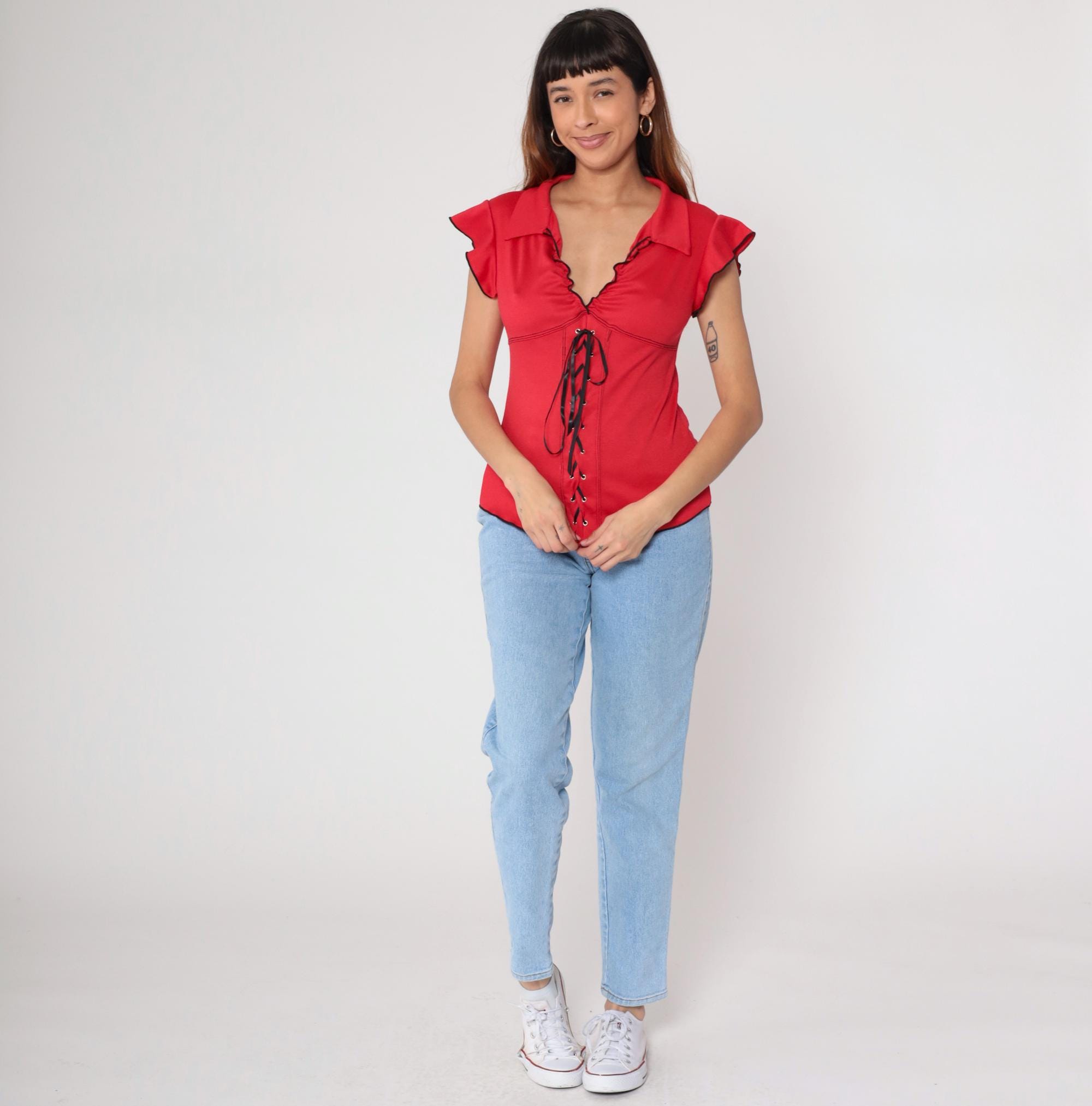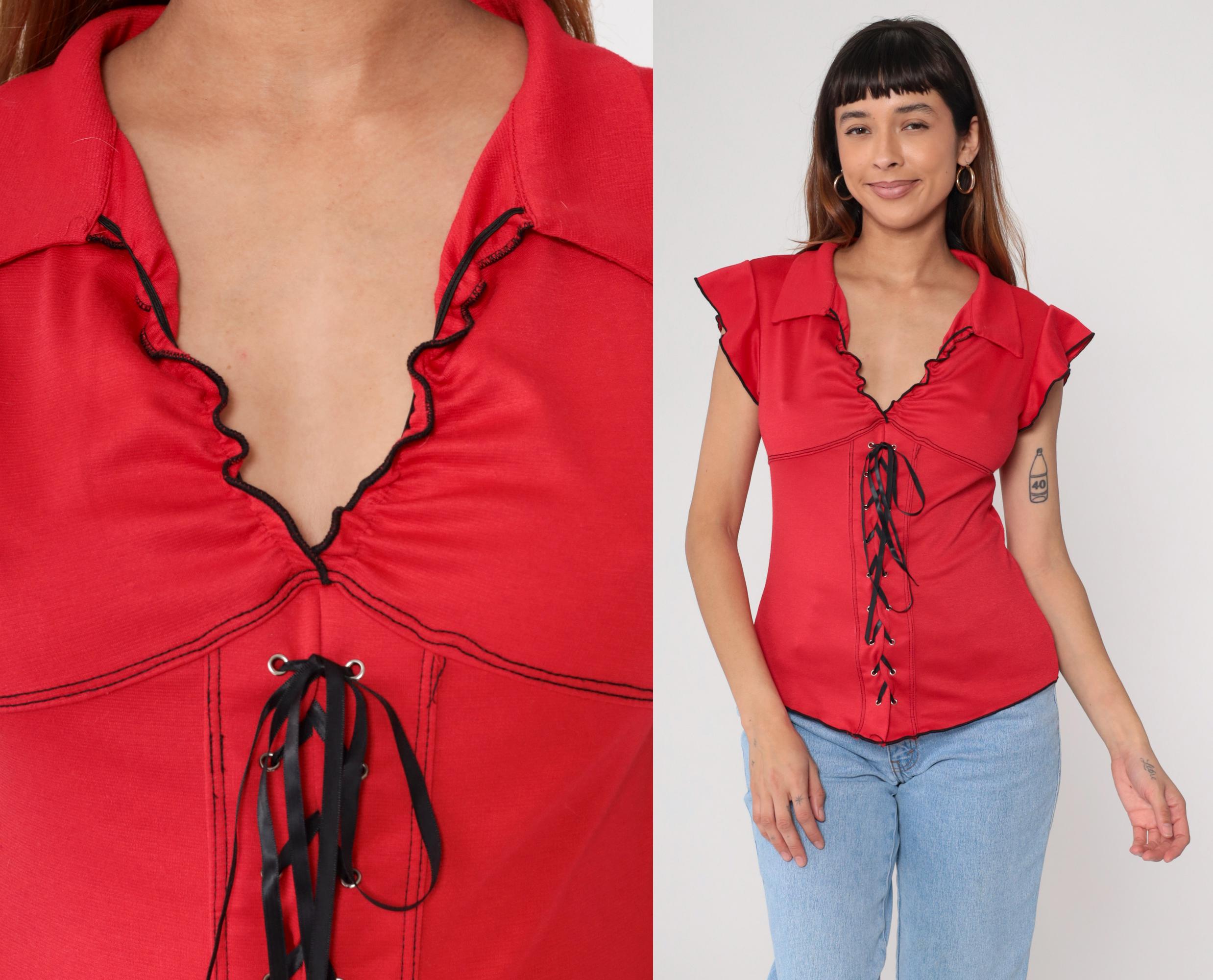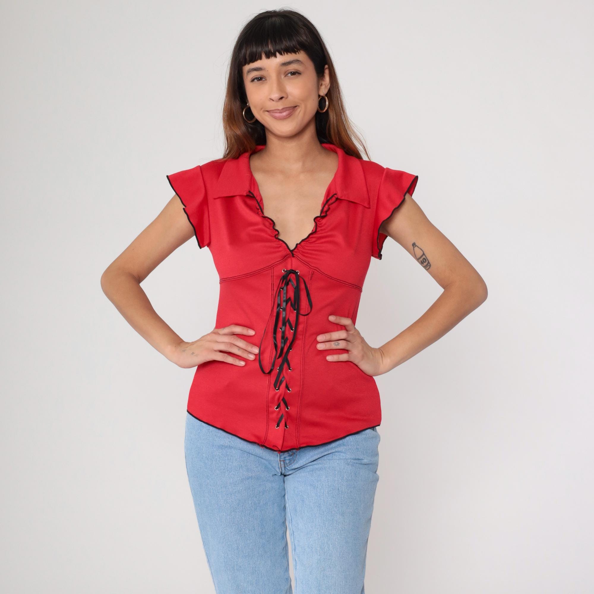 Y2K red top featuring black trim and corset-style lace-up front with grommets. Pointed collar with ruffle cap sleeves and deep V neckline.