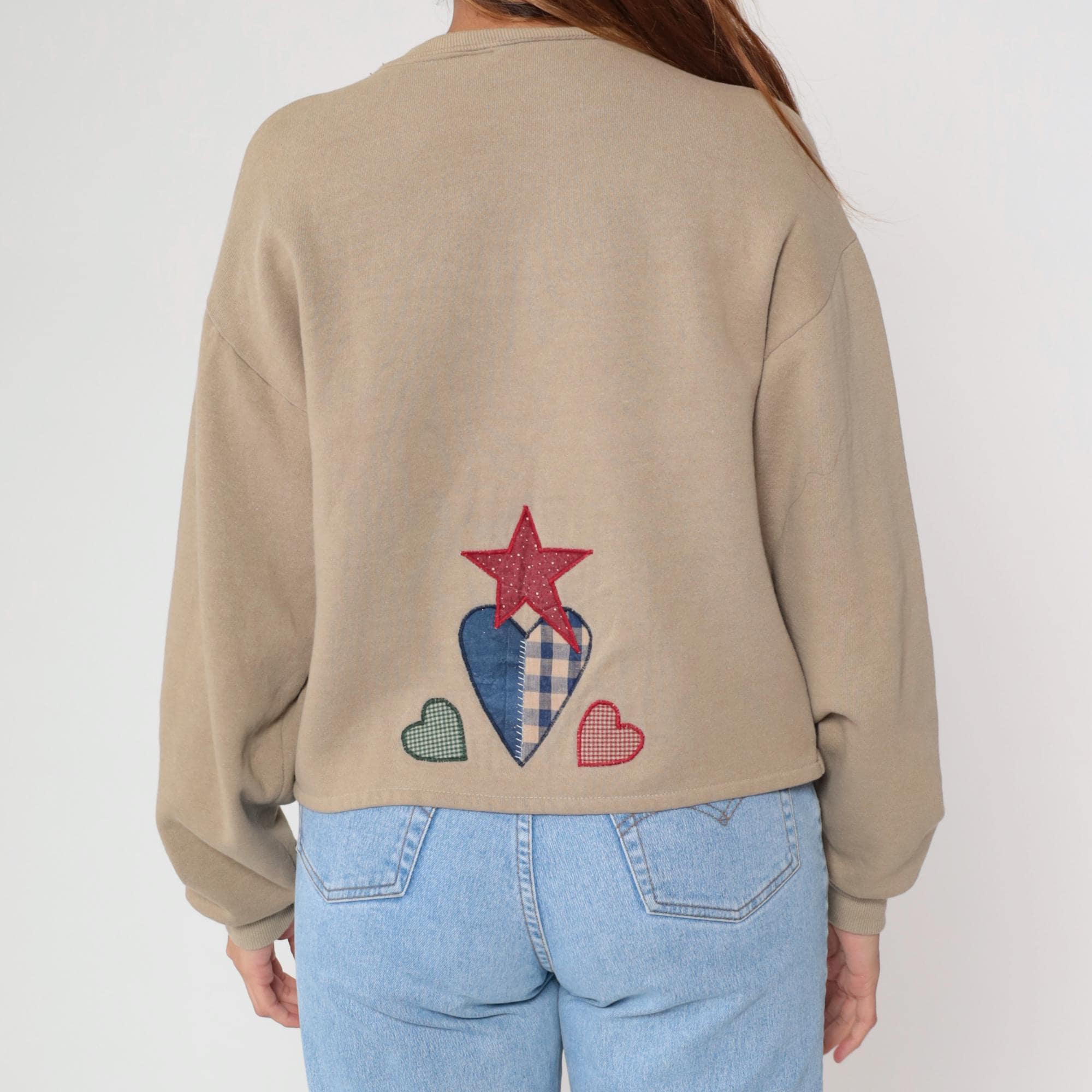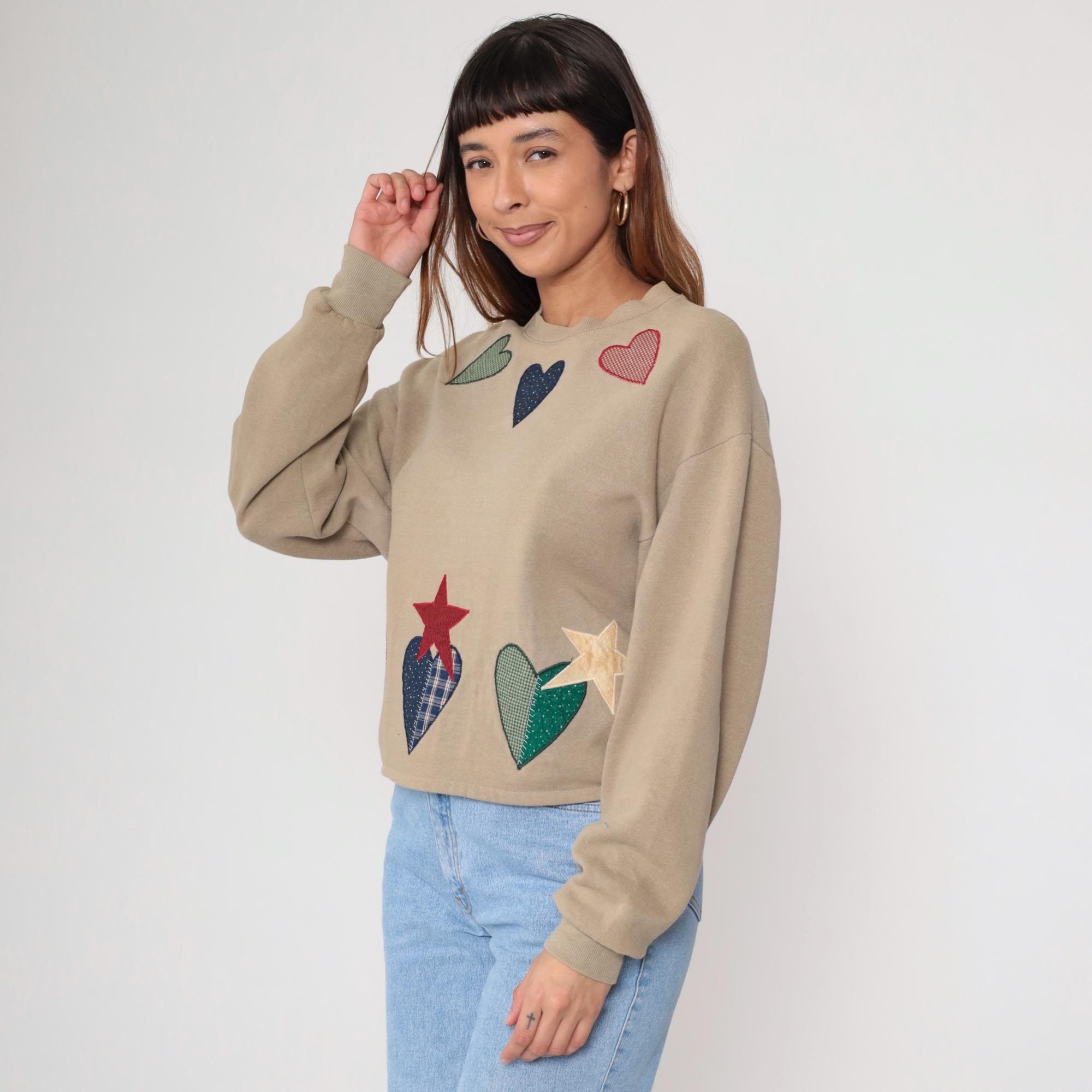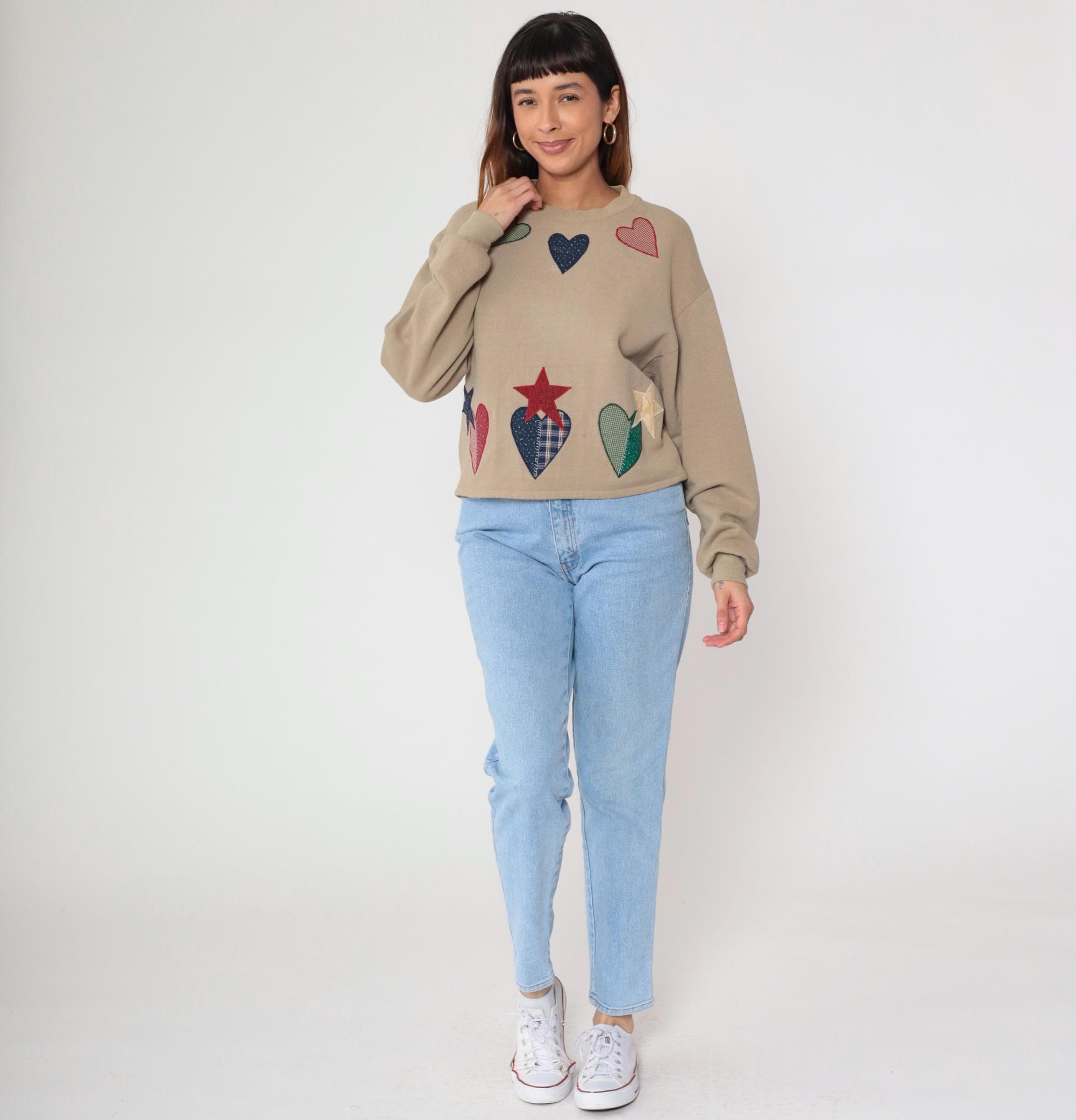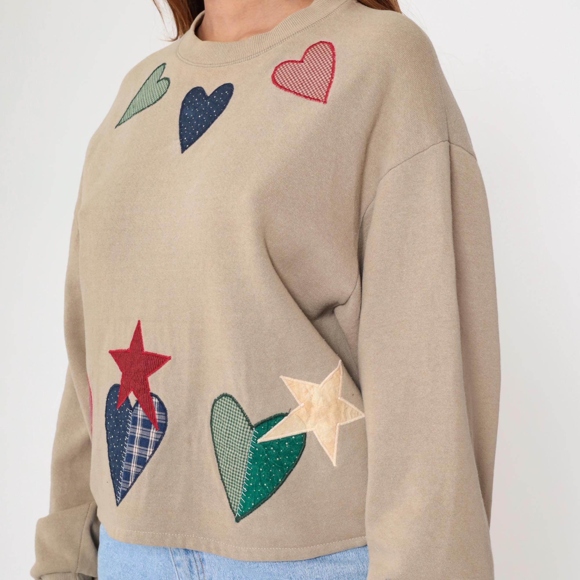 90s tan cropped sweatshirt featuring applique hearts and stars in multiple patterns. Designs include green gingham, navy dotted, blue plaid, and red checkered fabrics. Heart and star appliques on front, back and sleeves.
