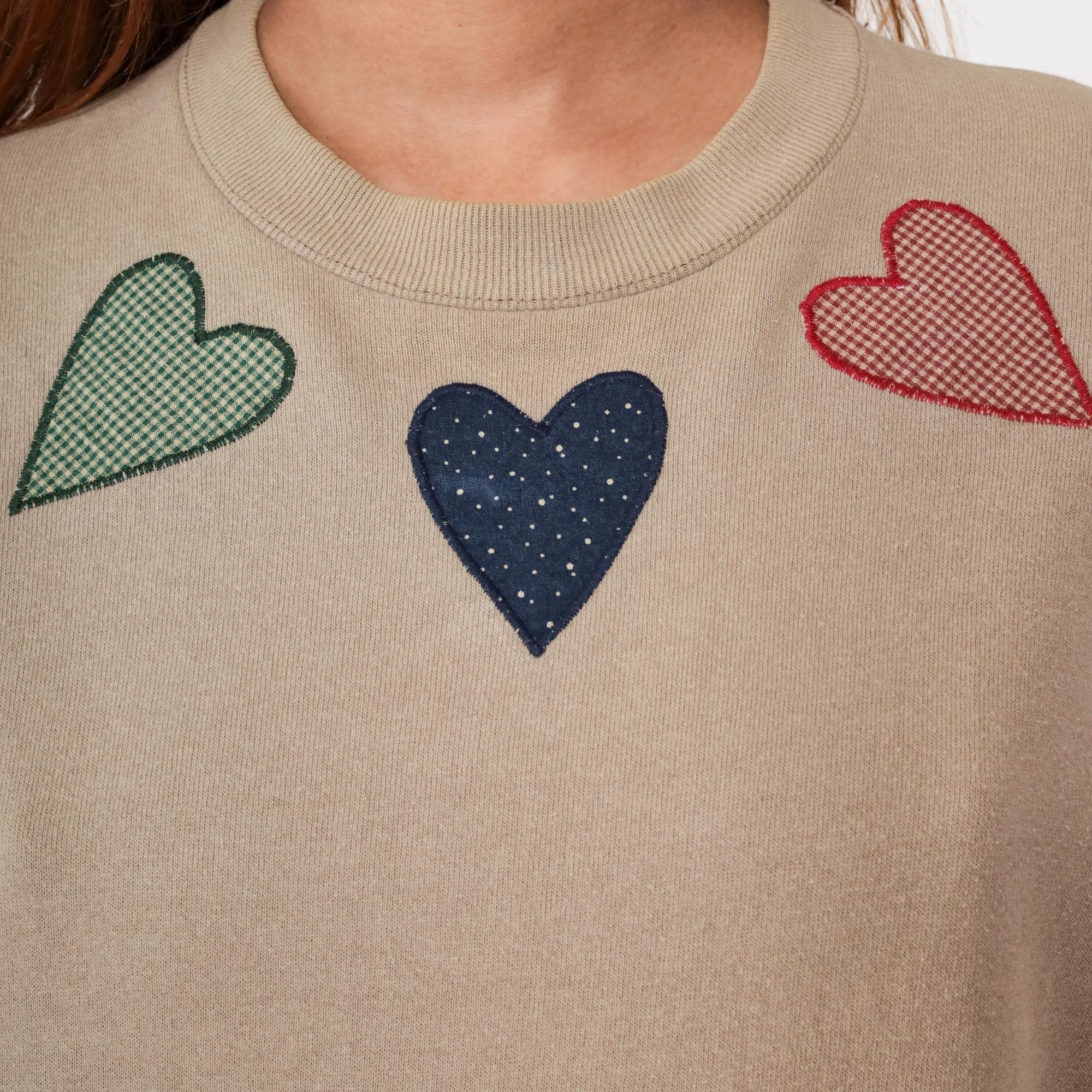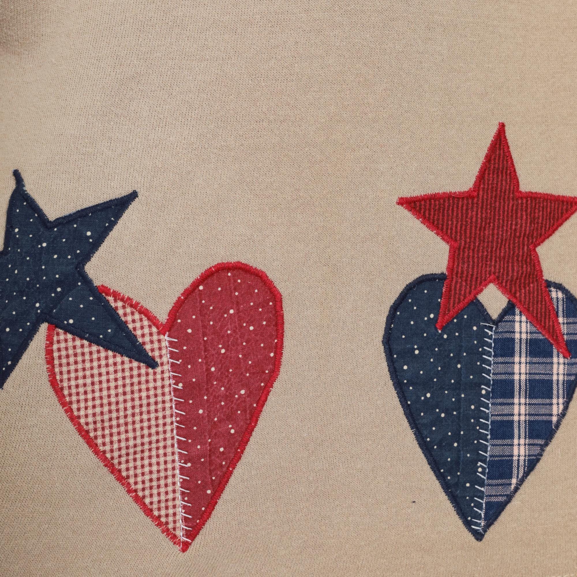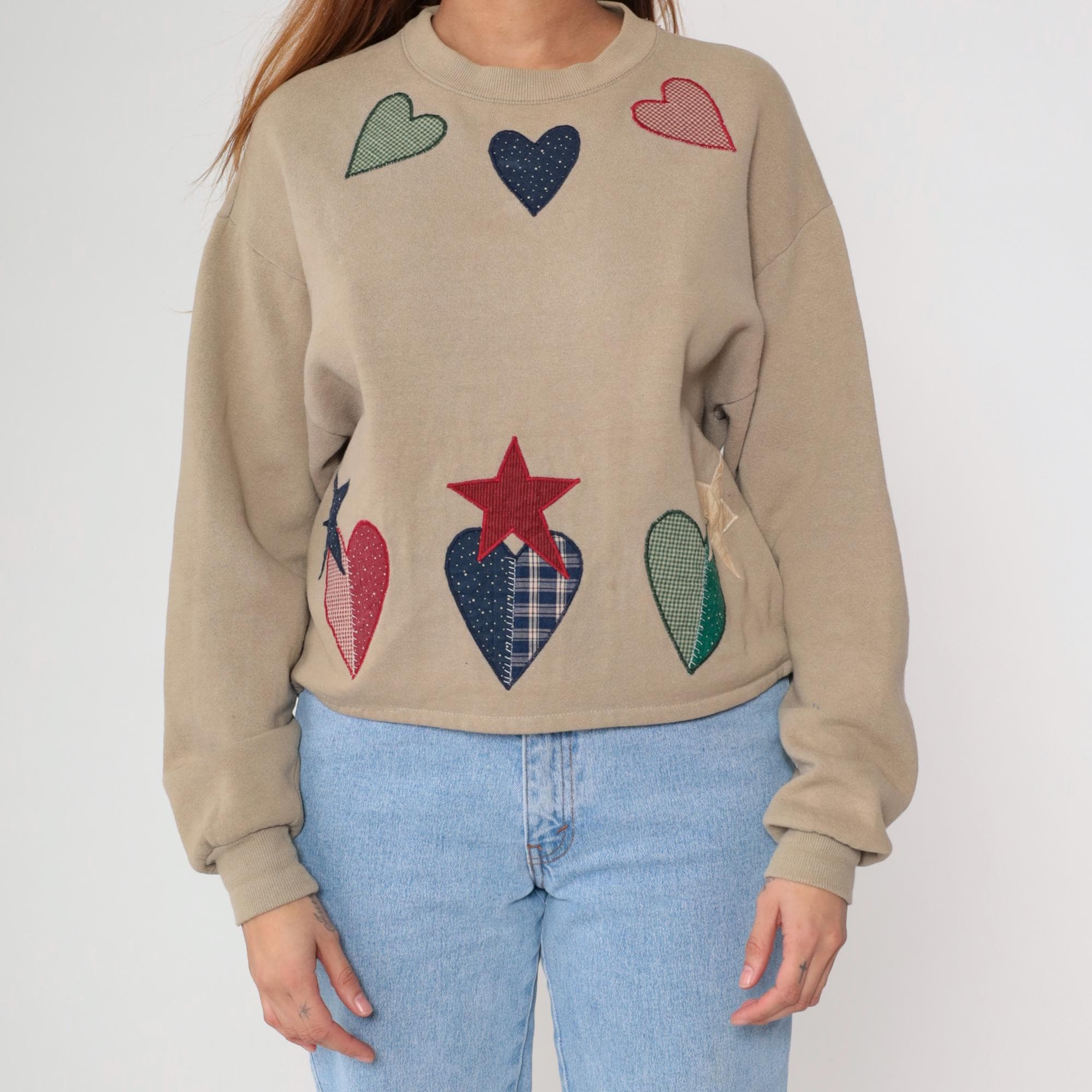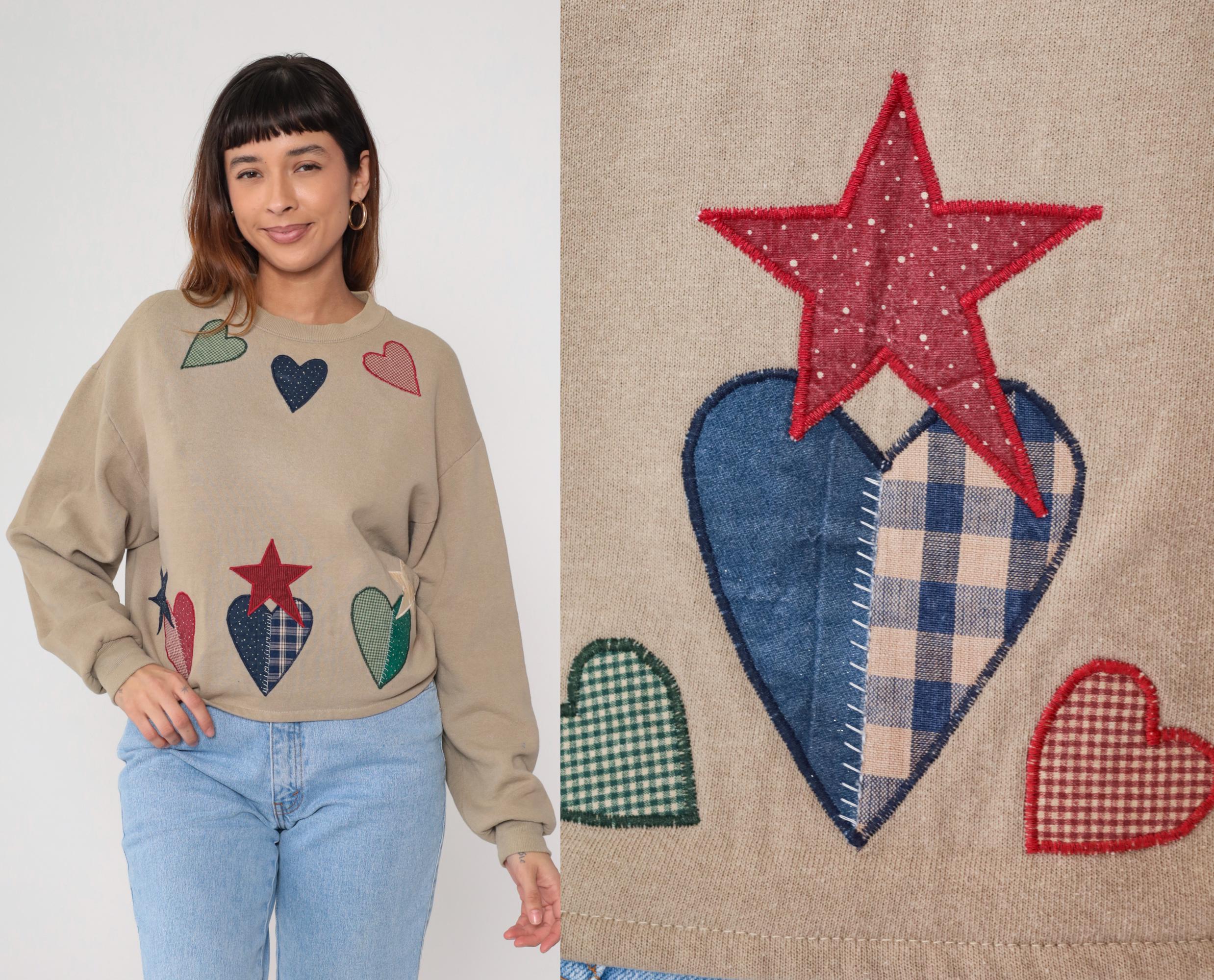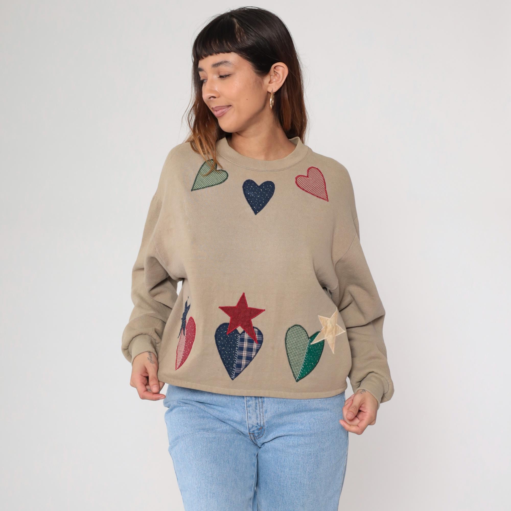 90s tan cropped sweatshirt featuring applique hearts and stars in multiple patterns. Designs include green gingham, navy dotted, blue plaid, and red checkered fabrics. Heart and star appliques on front, back and sleeves.