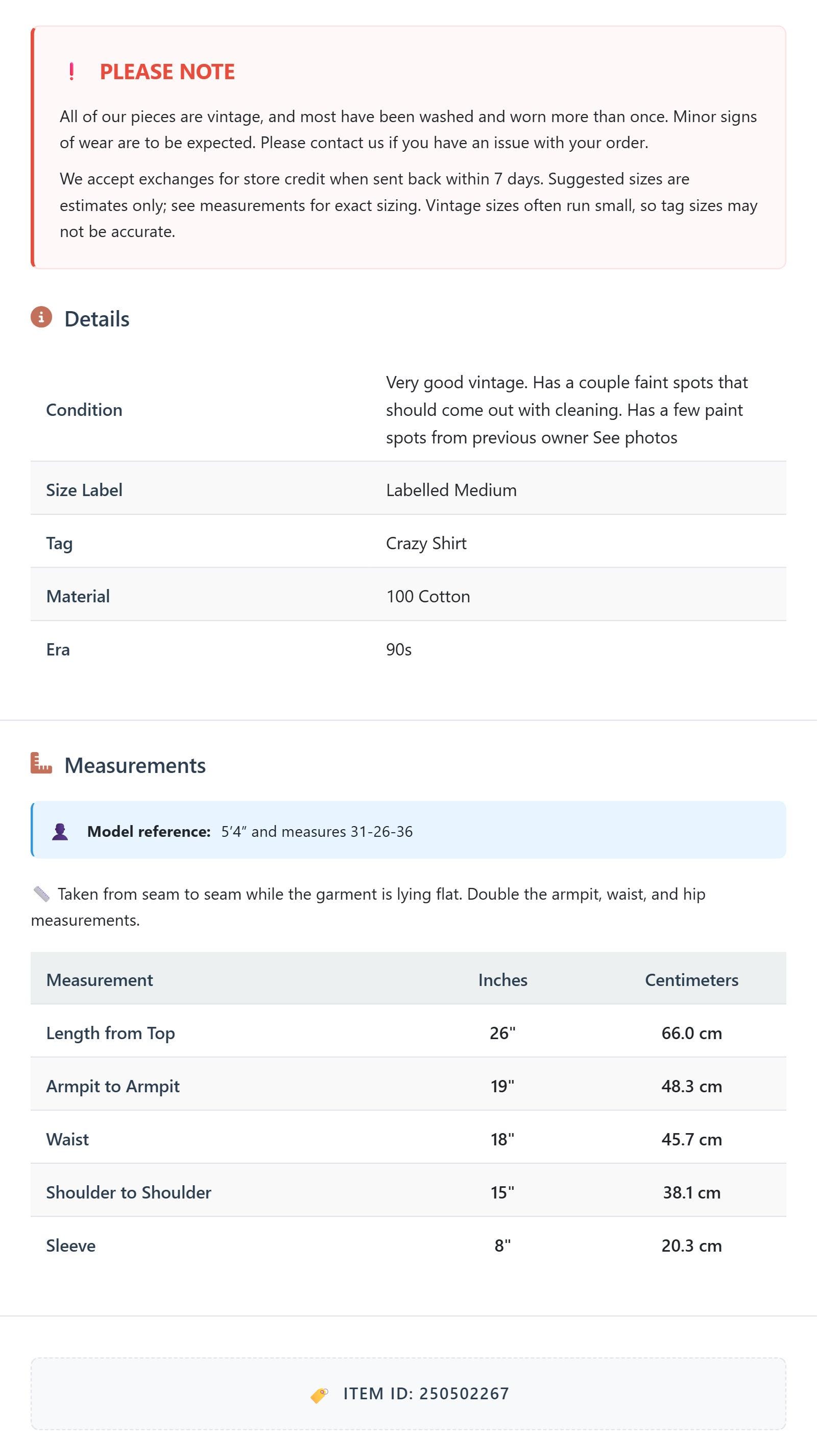 All of our pieces are vintage, and most have been washed and worn more than once. Minor signs of wear are to be expected. Please contact us if you have an issue with your order. We accept exchanges for store credit when sent back within 7 days.