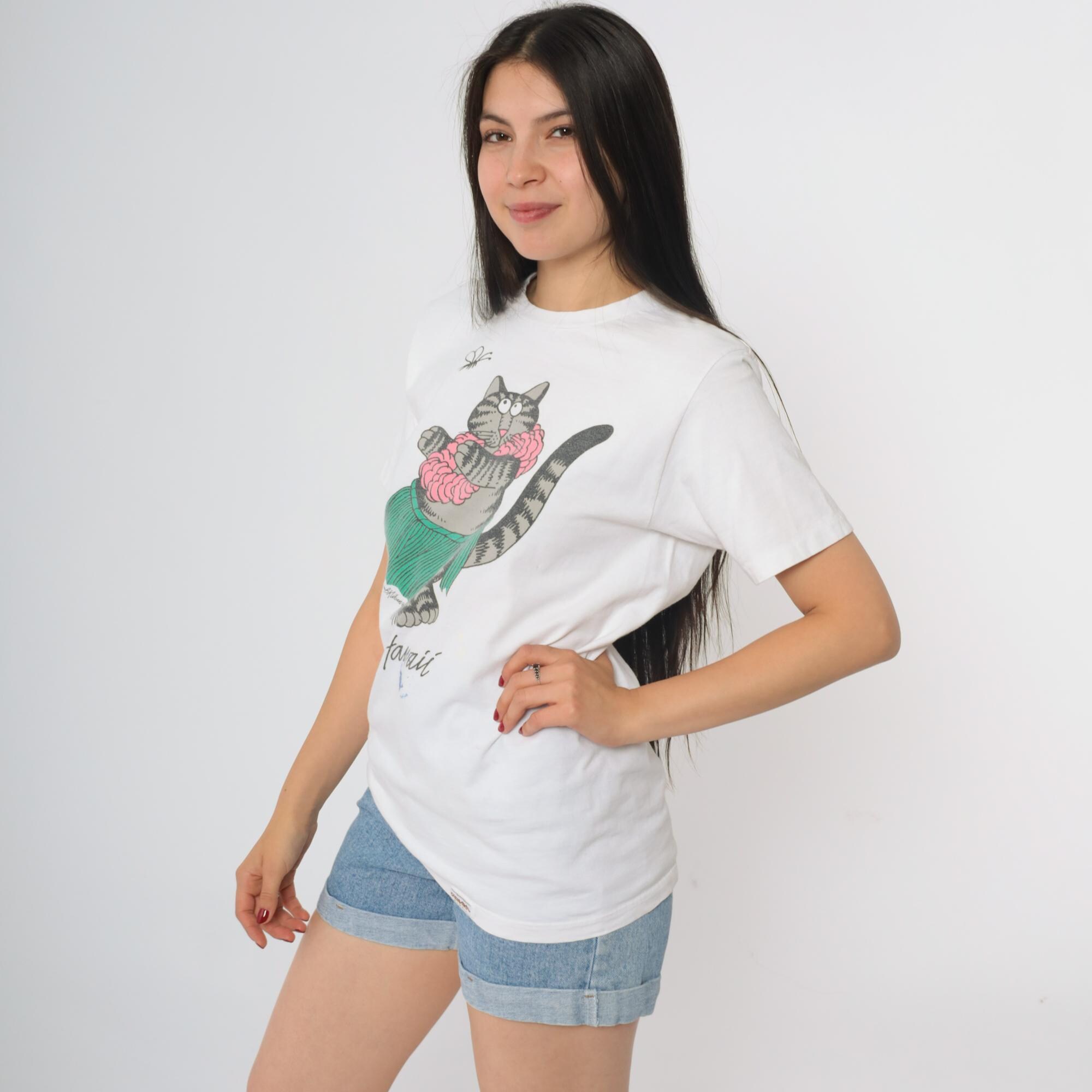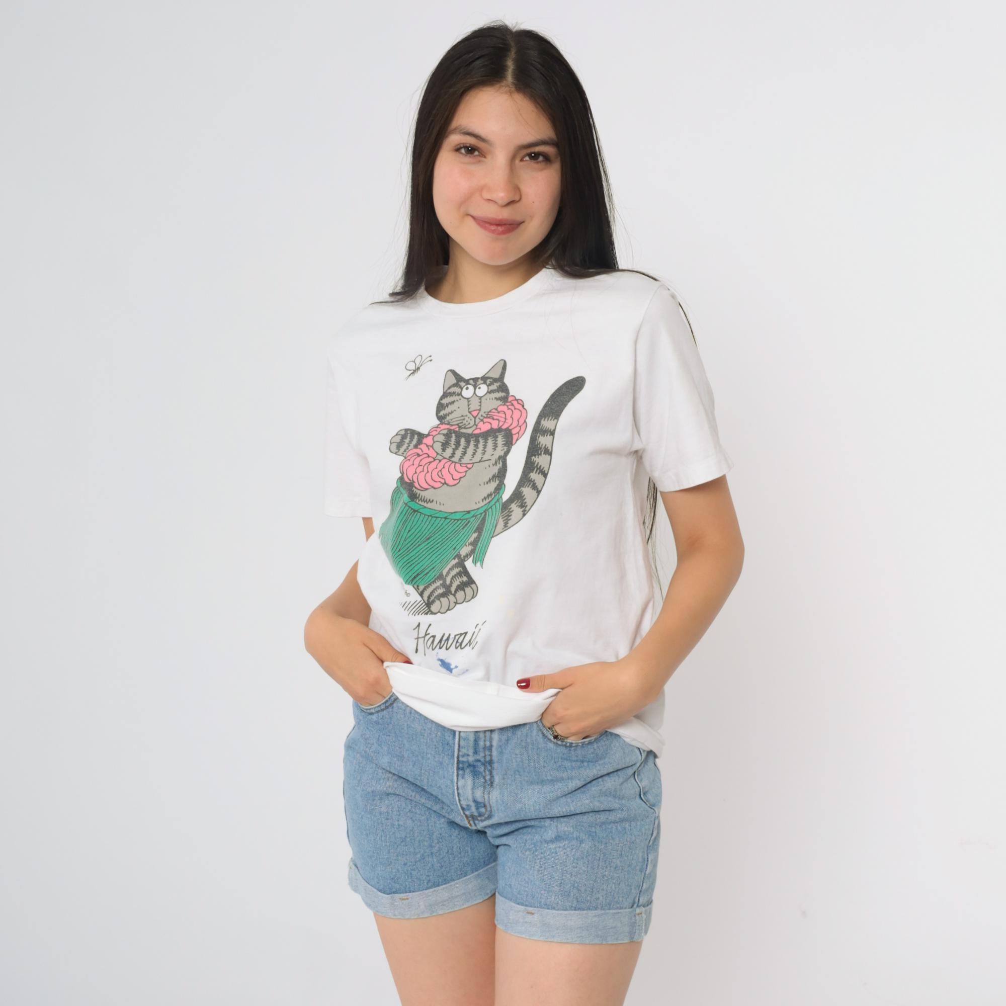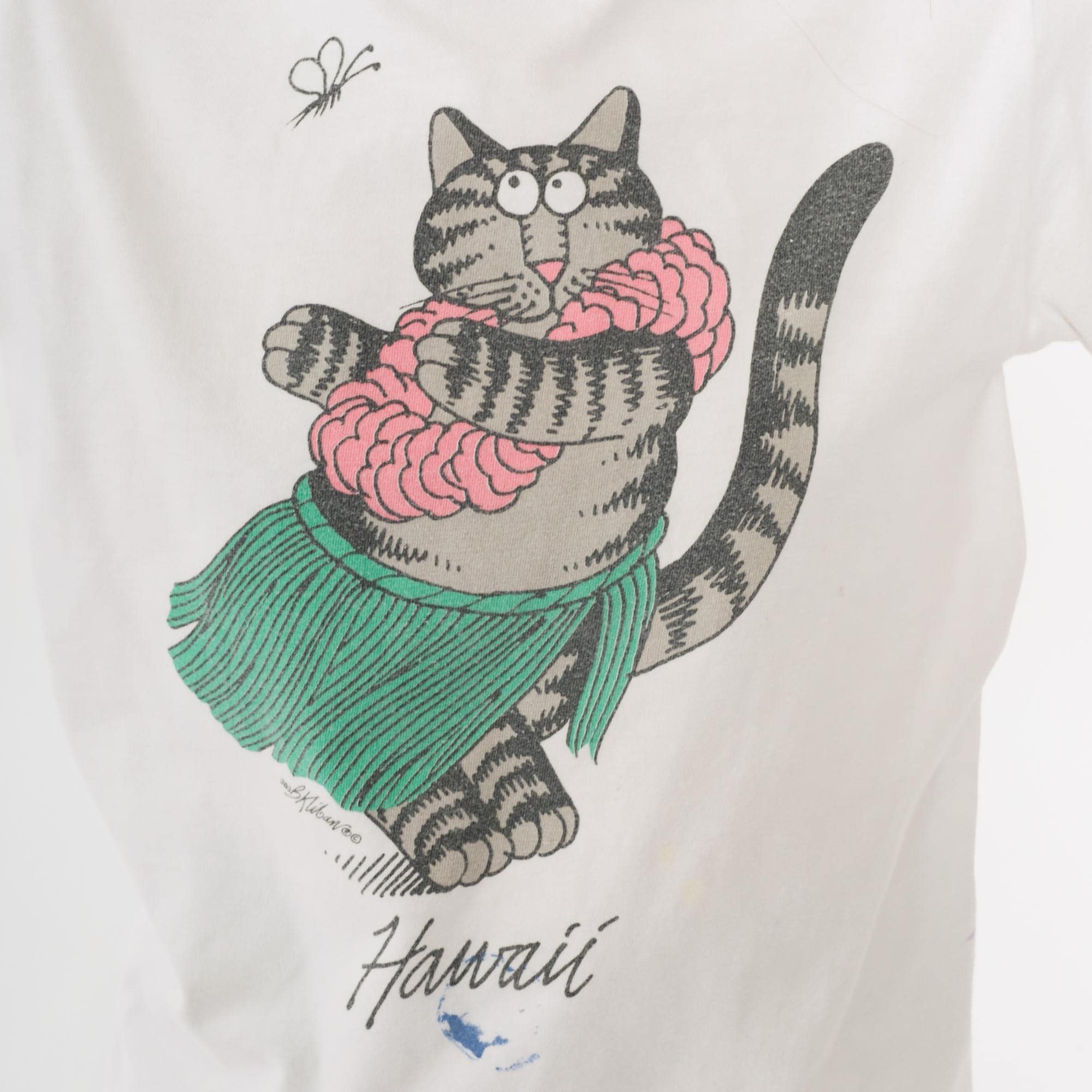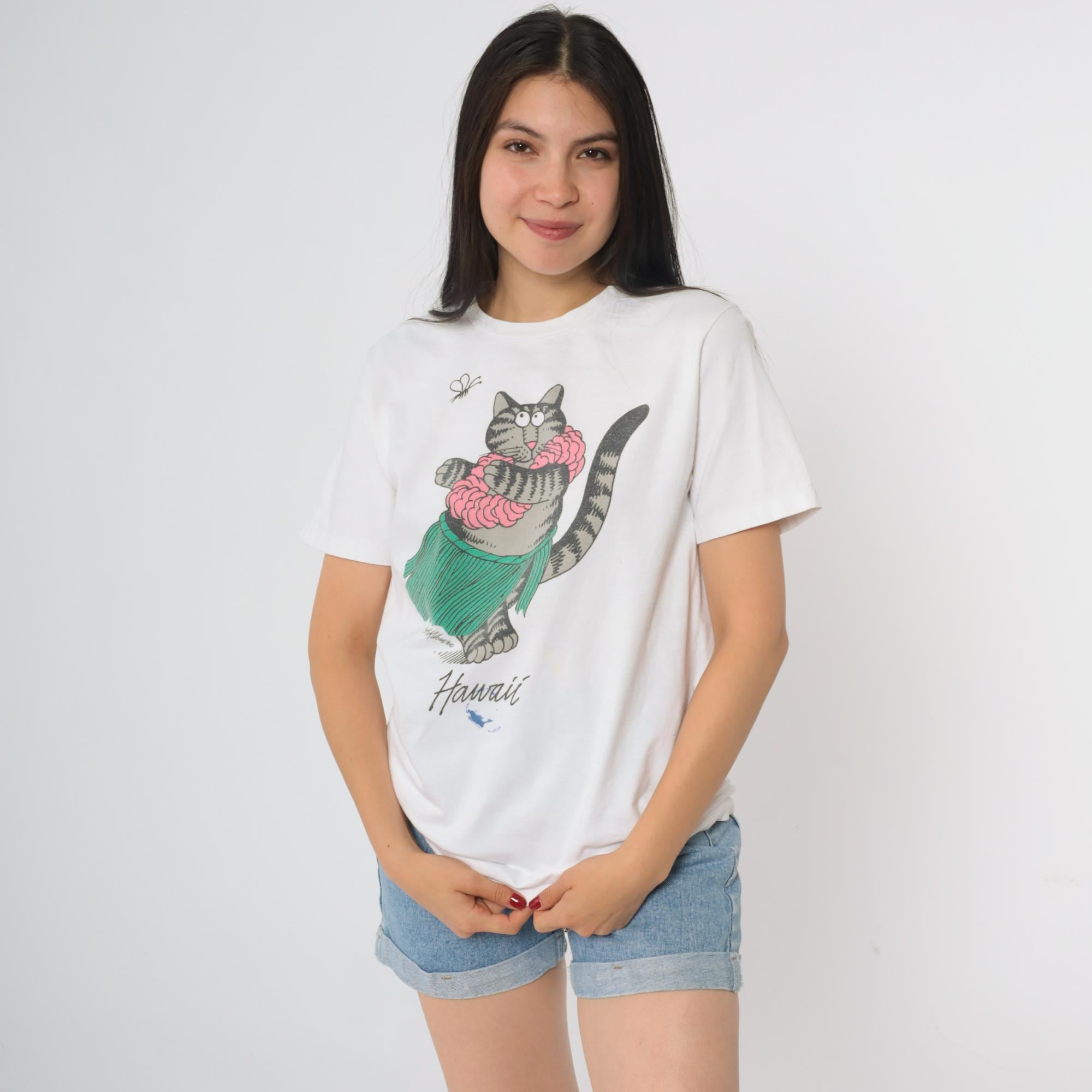 90s Hawaii souvenir t-shirt by Crazy Shirt featuring a cartoon tabby cat wearing a green grass hula skirt and pink lei. Classic novelty design in the style of B. Kliban's famous cat cartoons. Front and back print of the playful hula-dancing cat with a small butterfly. Classic crew neck with short sleeves.