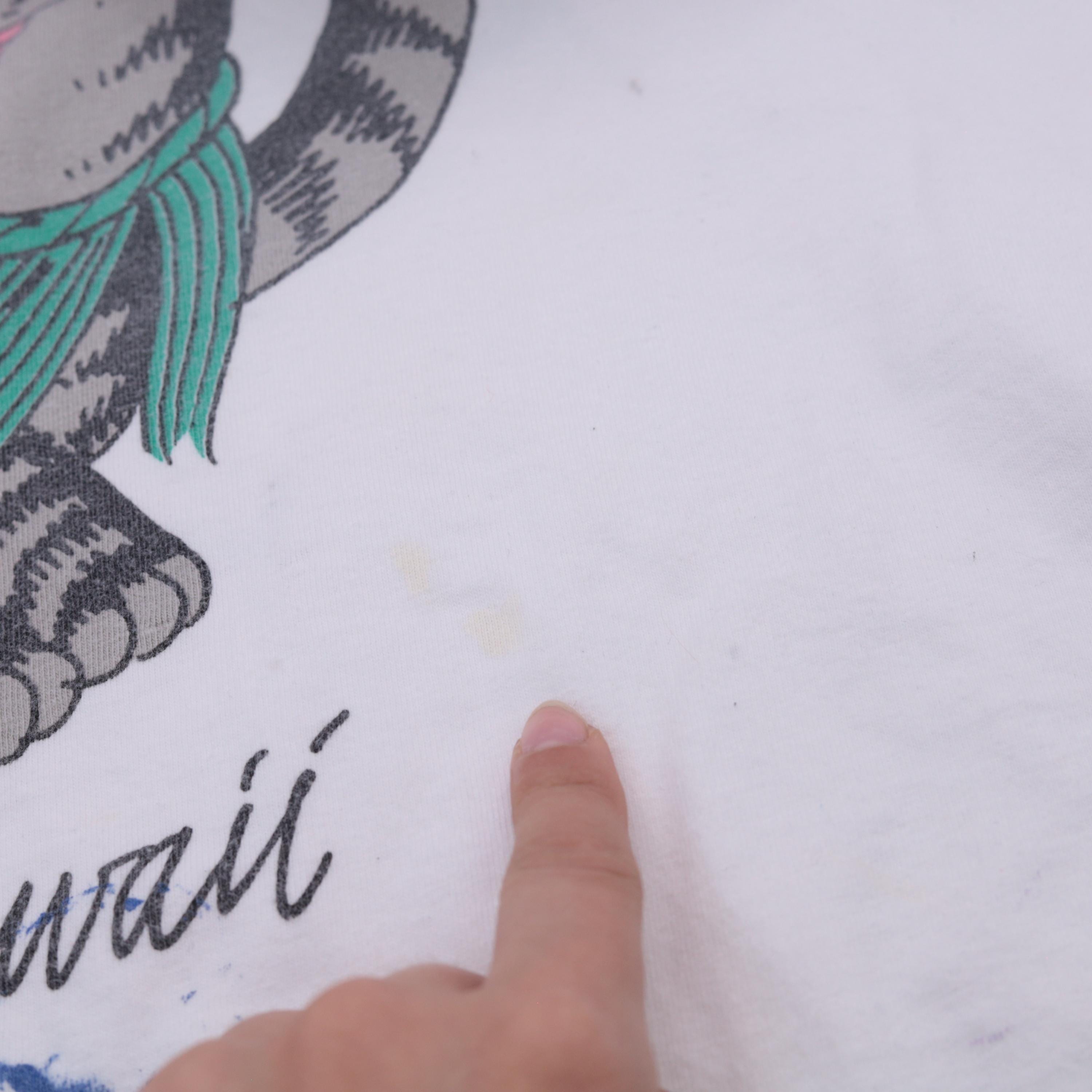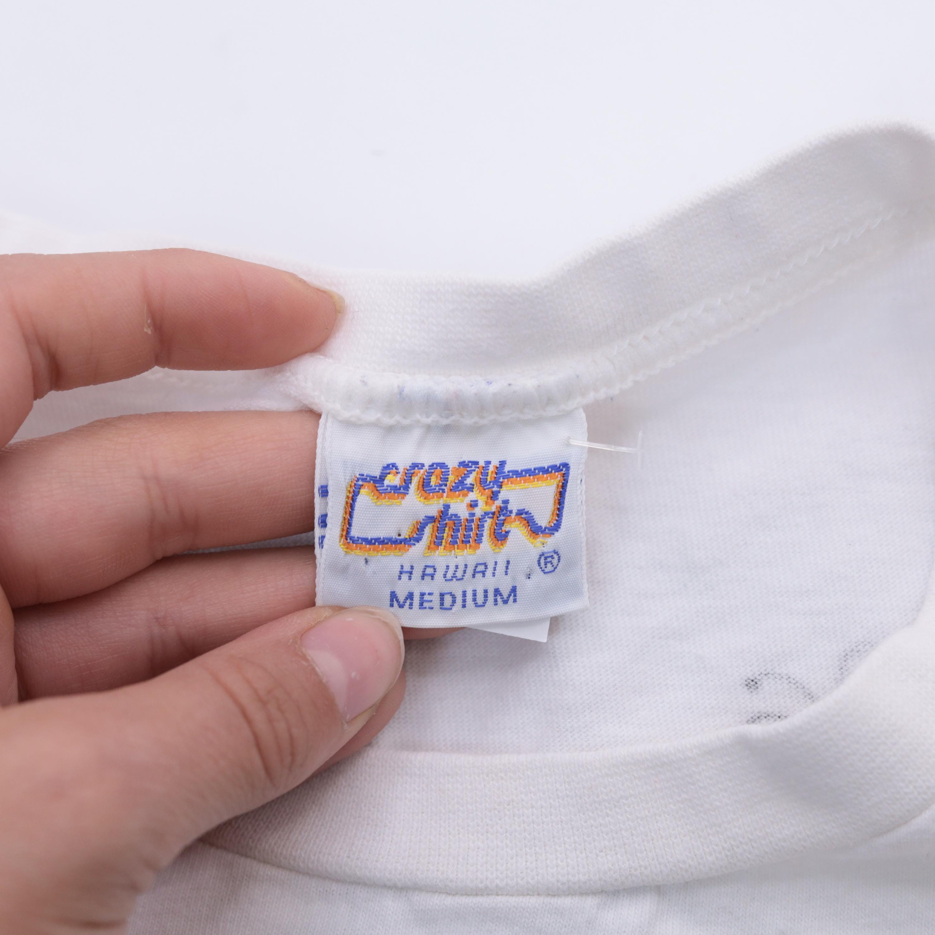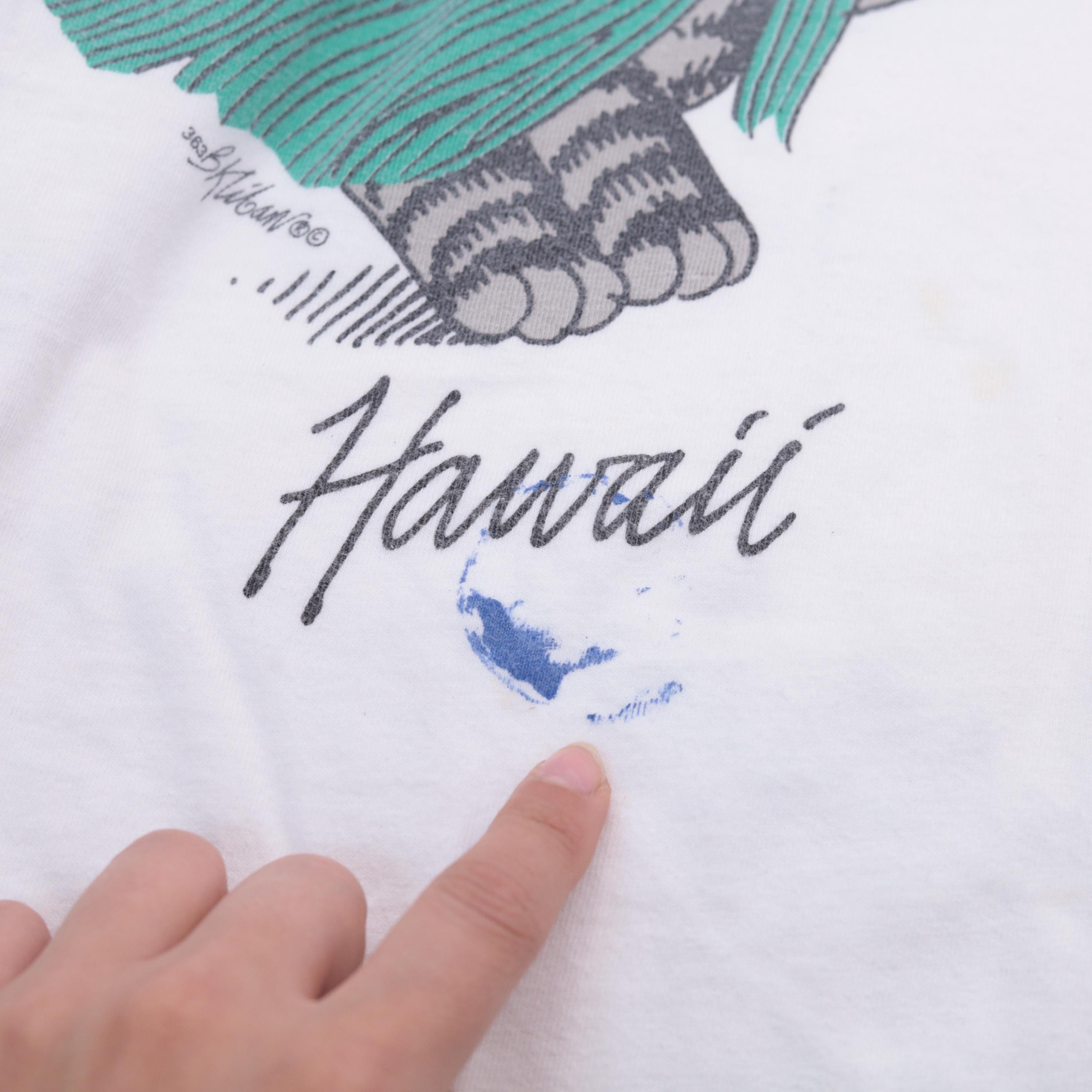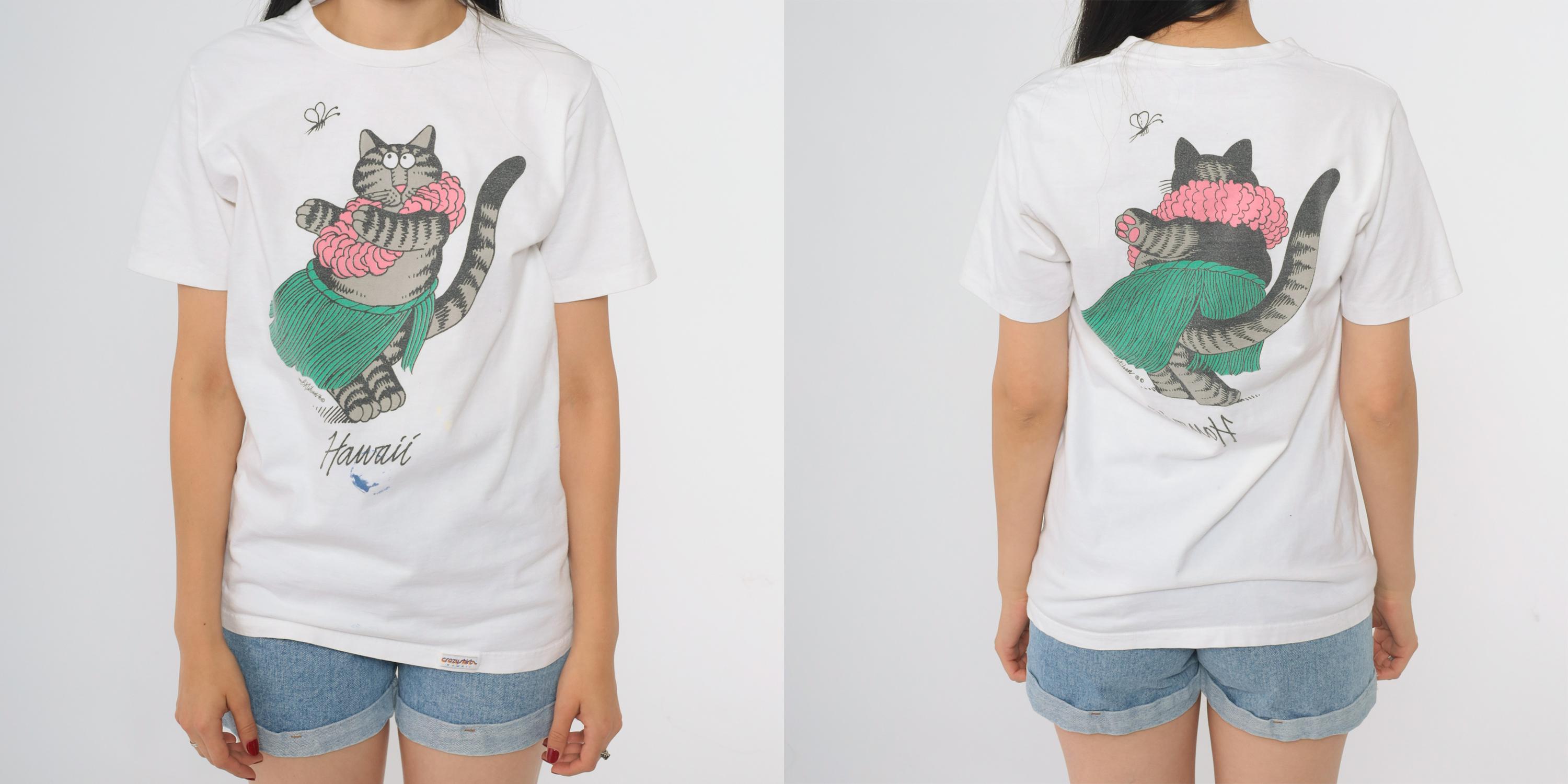 90s Hawaii souvenir t-shirt by Crazy Shirt featuring a cartoon tabby cat wearing a green grass hula skirt and pink lei. Classic novelty design in the style of B. Kliban's famous cat cartoons. Front and back print of the playful hula-dancing cat with a small butterfly. Classic crew neck with short sleeves.