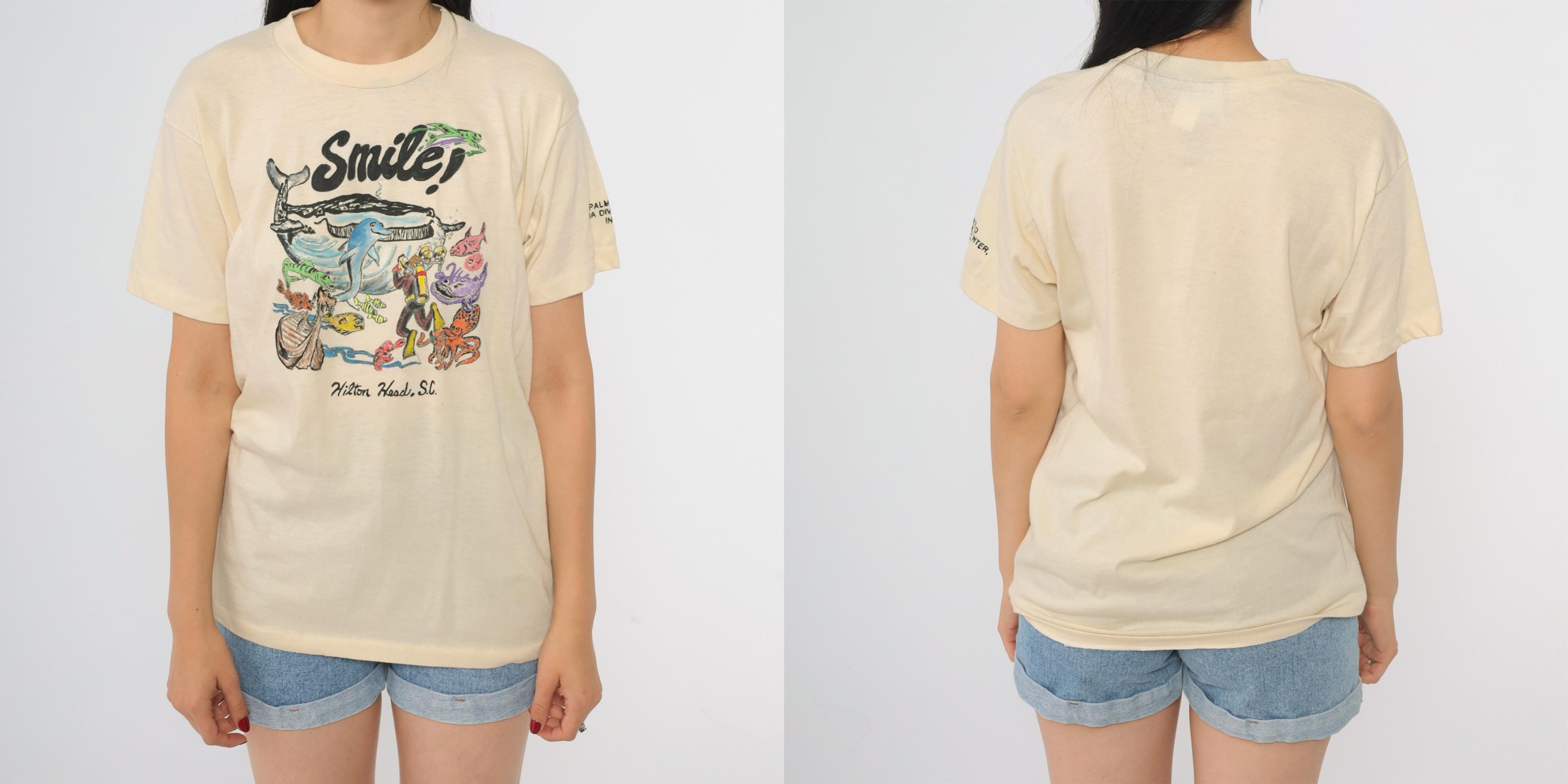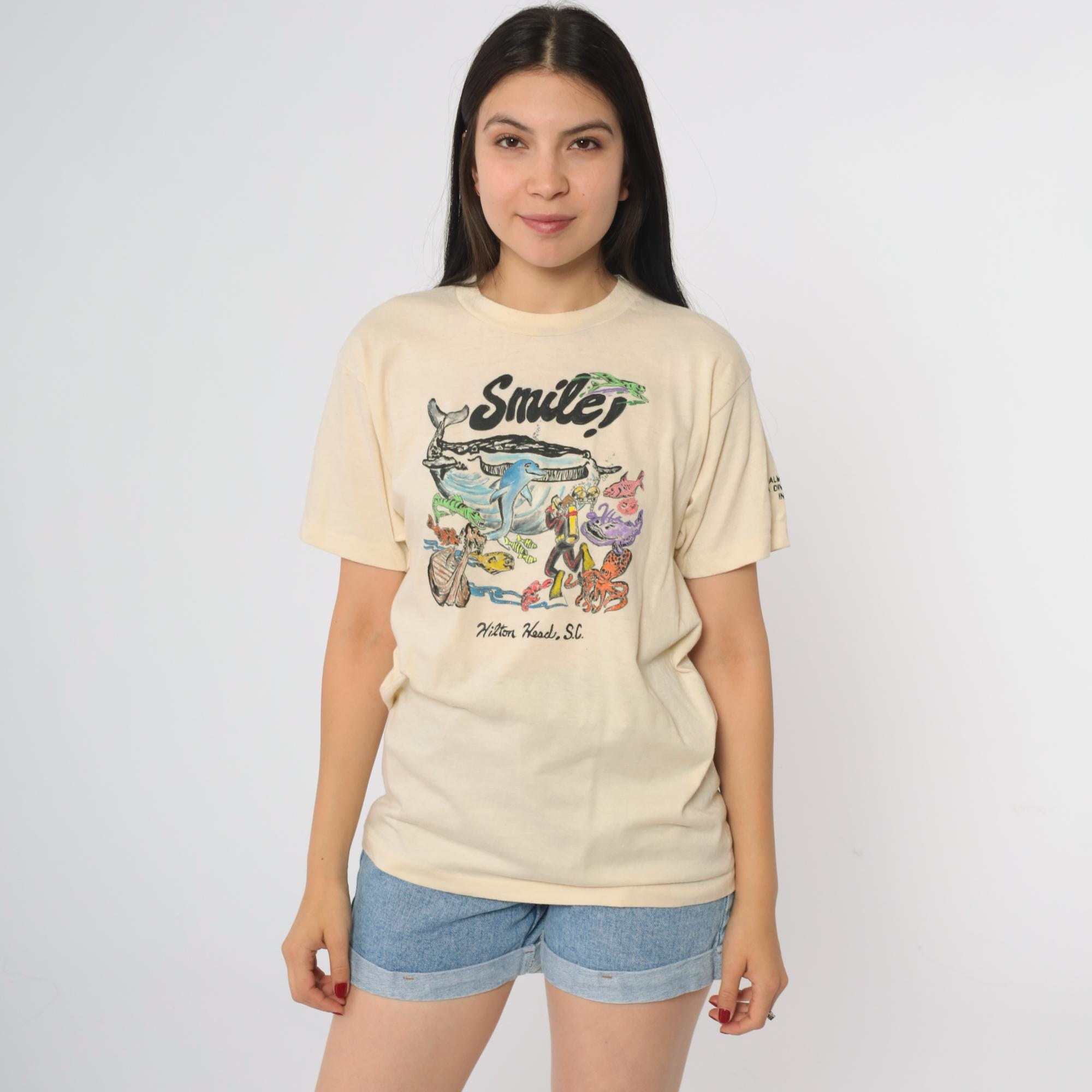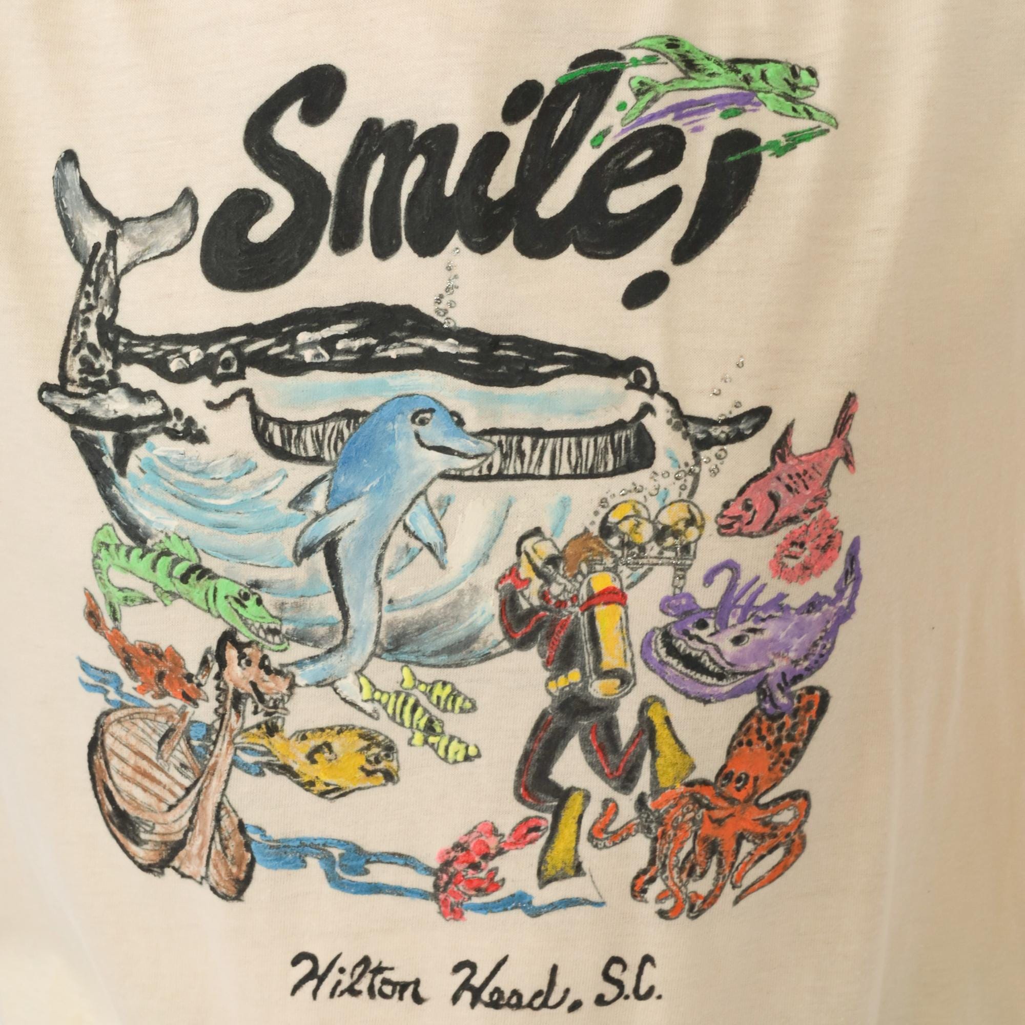 80s scuba diving t-shirt from Hilton Head, South Carolina. Features colorful underwater scene with blue dolphin, whale, octopus, fish, and scuba diver surrounded by vibrant sea life. "Smile!" text at top with Hilton Head, SC at bottom.