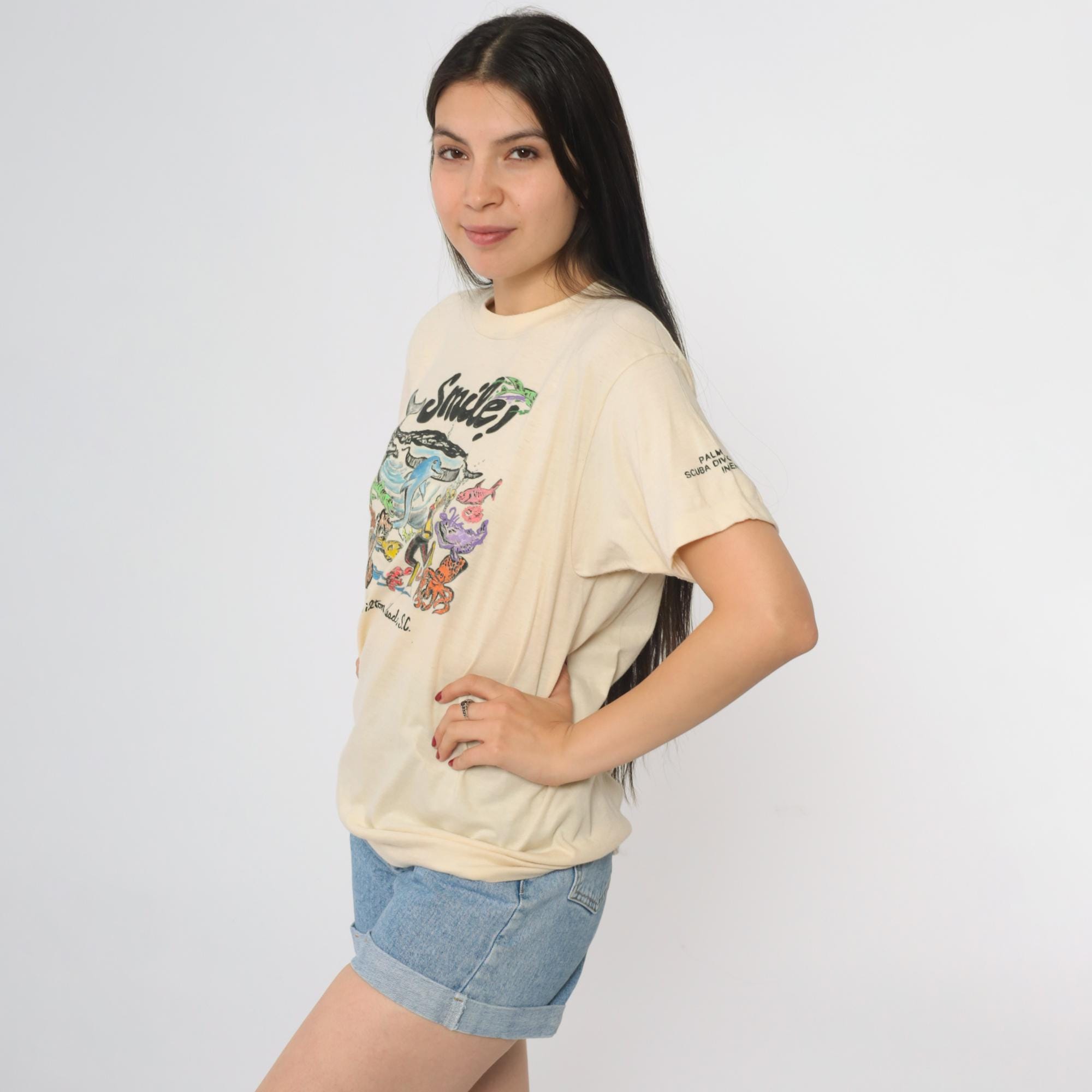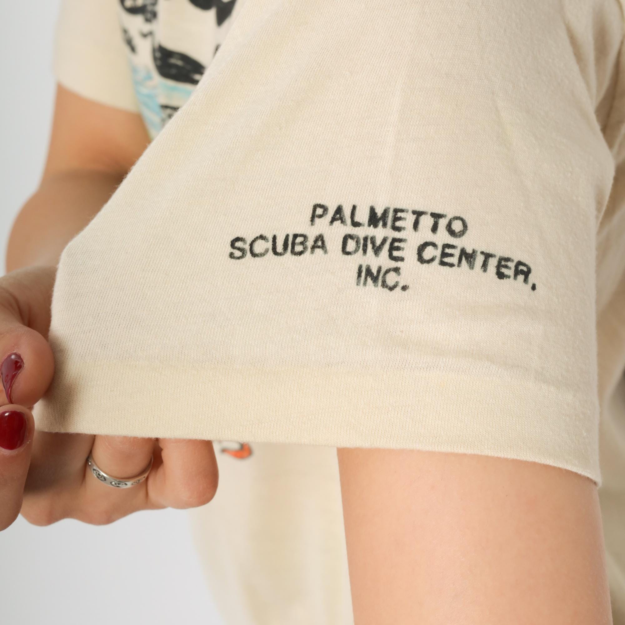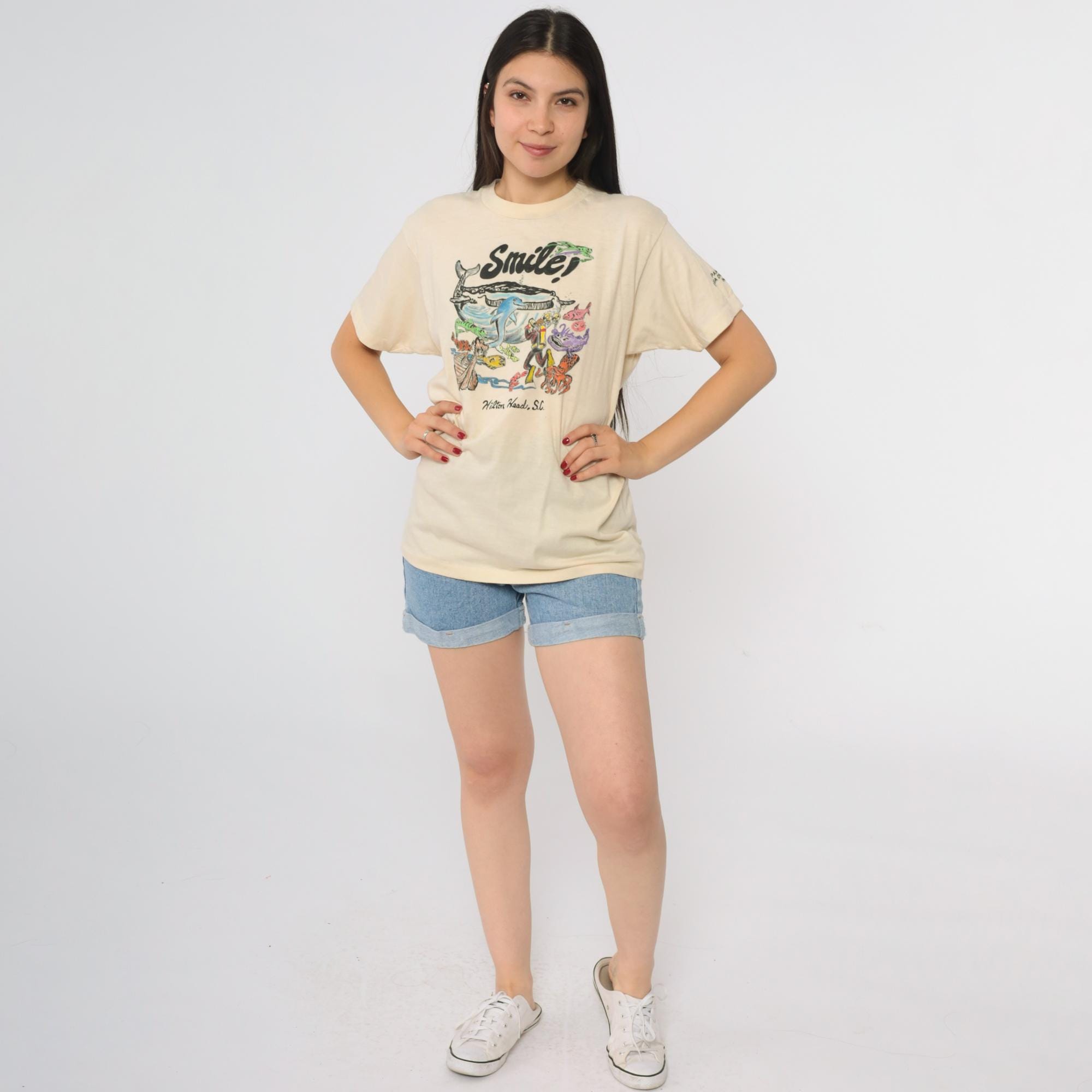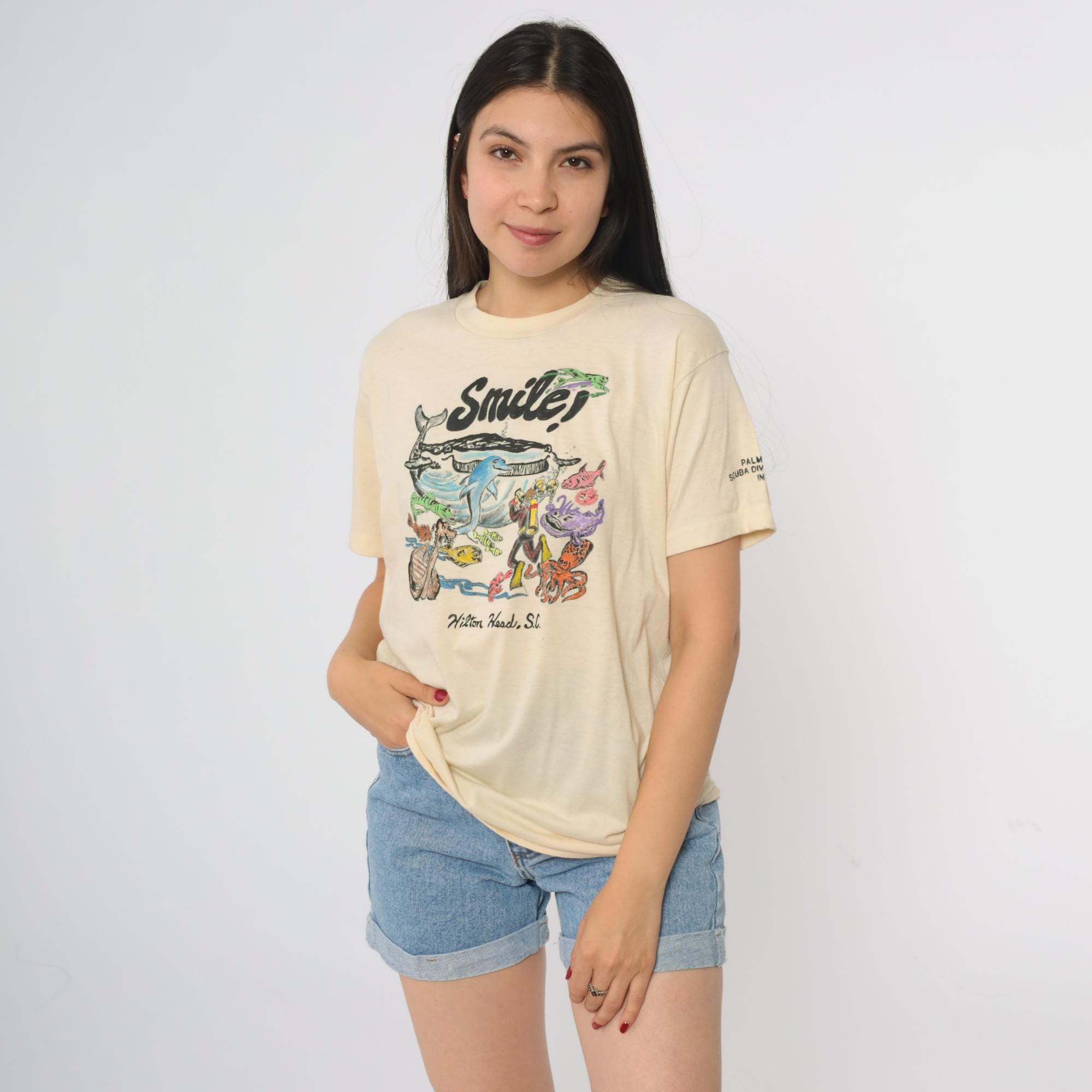 80s scuba diving t-shirt from Hilton Head, South Carolina. Features colorful underwater scene with blue dolphin, whale, octopus, fish, and scuba diver surrounded by vibrant sea life. "Smile!" text at top with Hilton Head, SC at bottom.