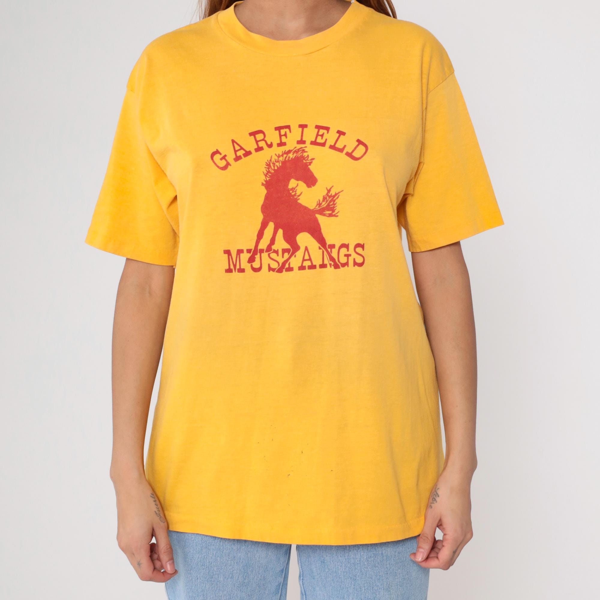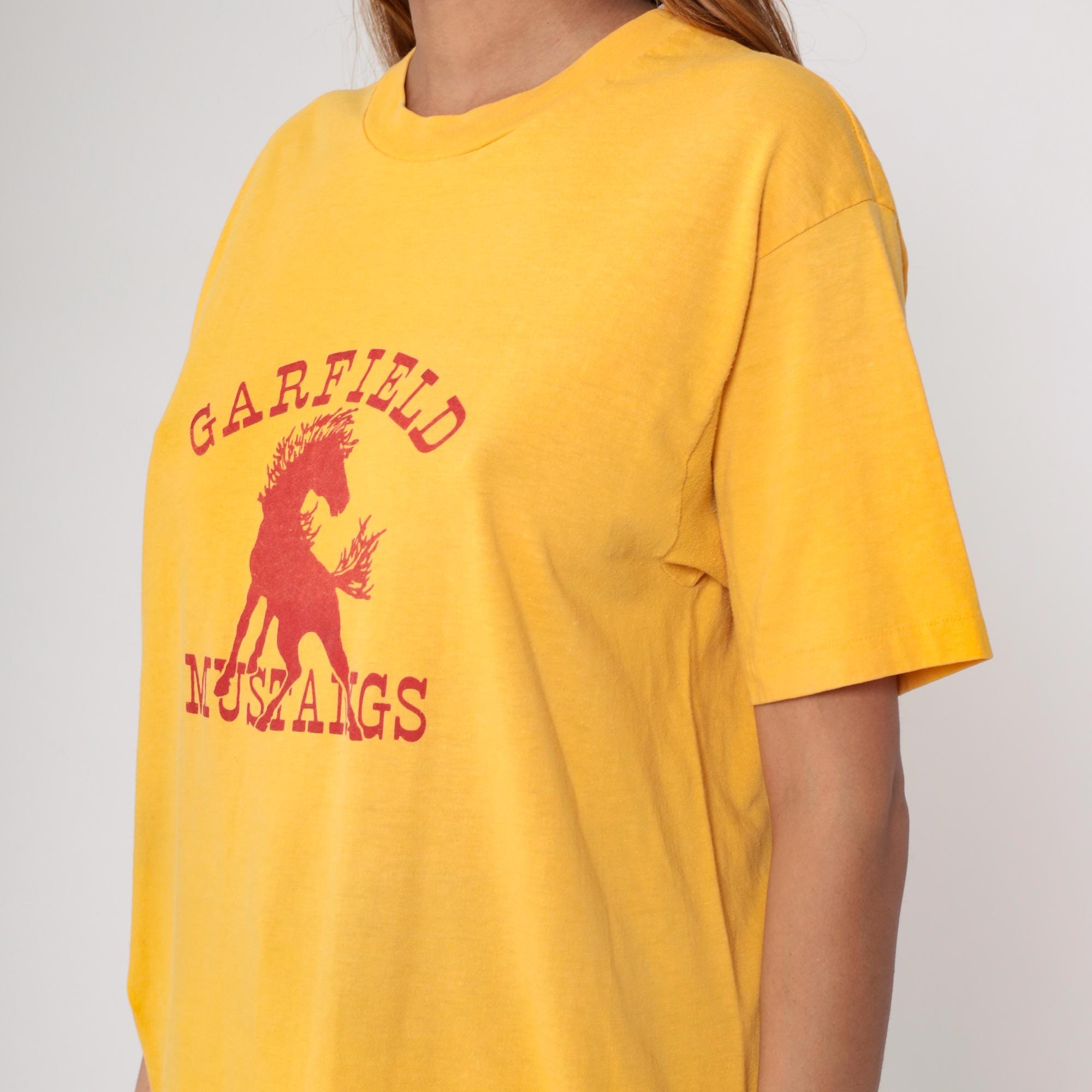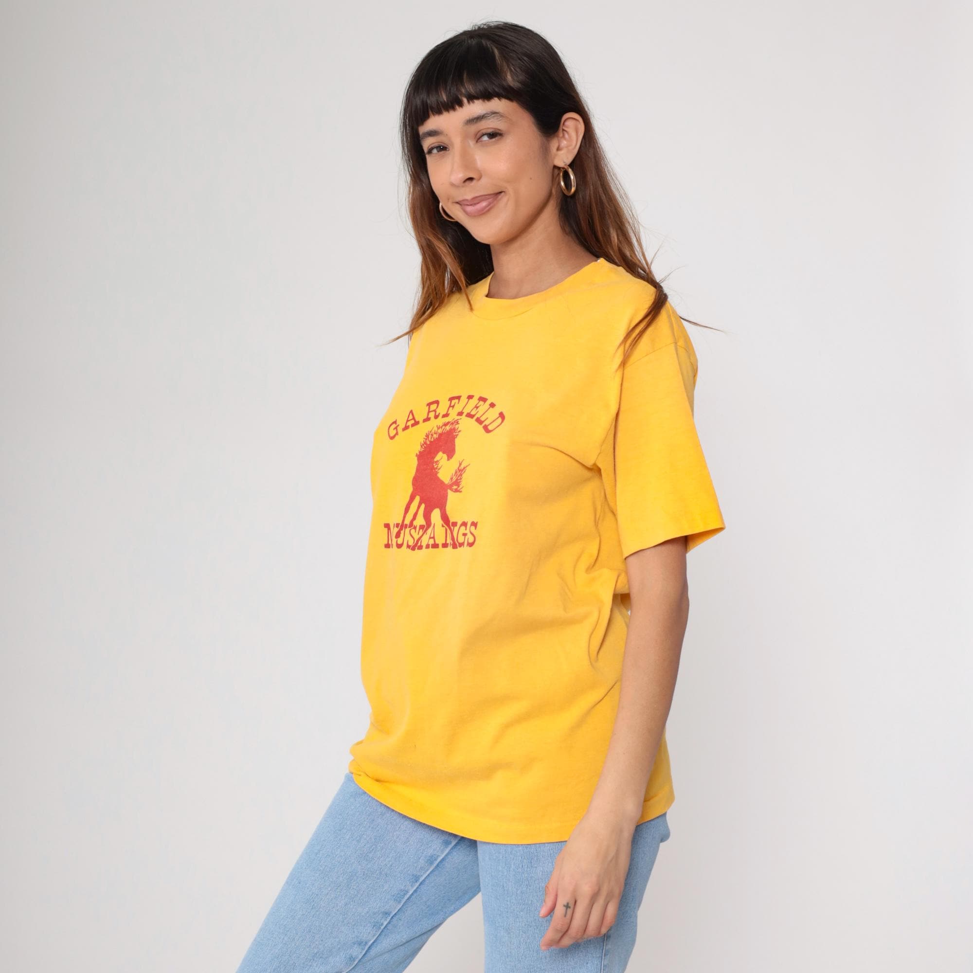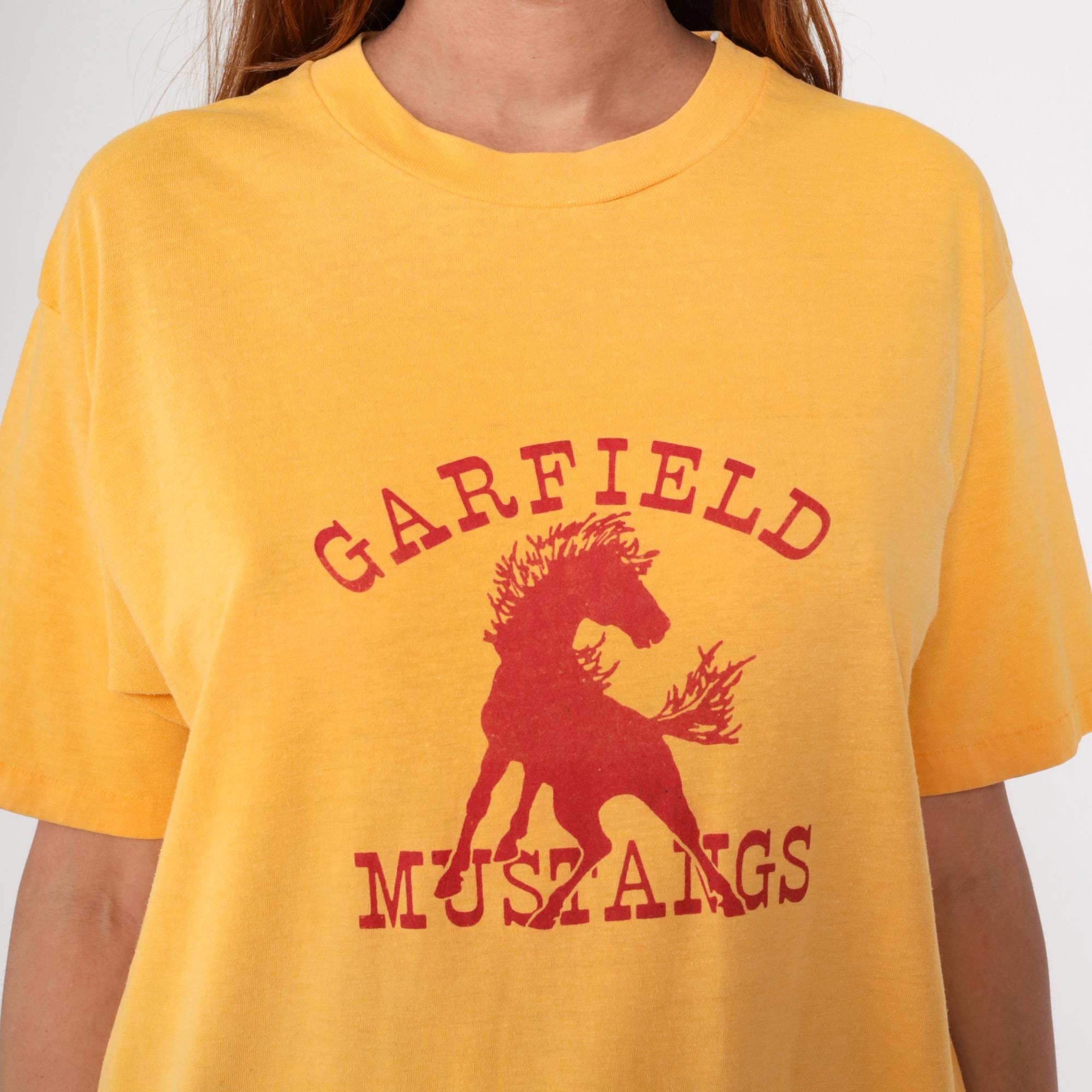 90s yellow t-shirt featuring Garfield County Mustangs high school mascot in red. Horse silhouette graphic with school name from Jordan, Montana.