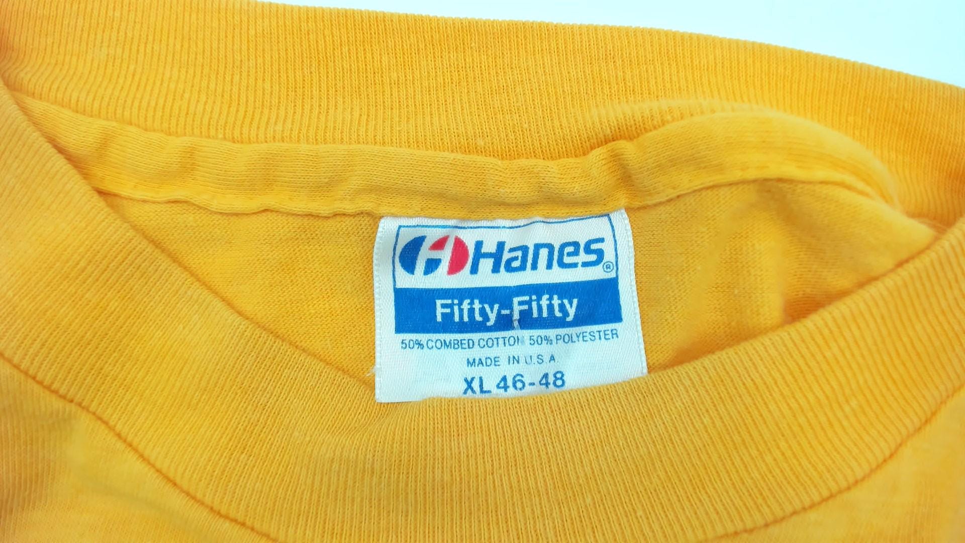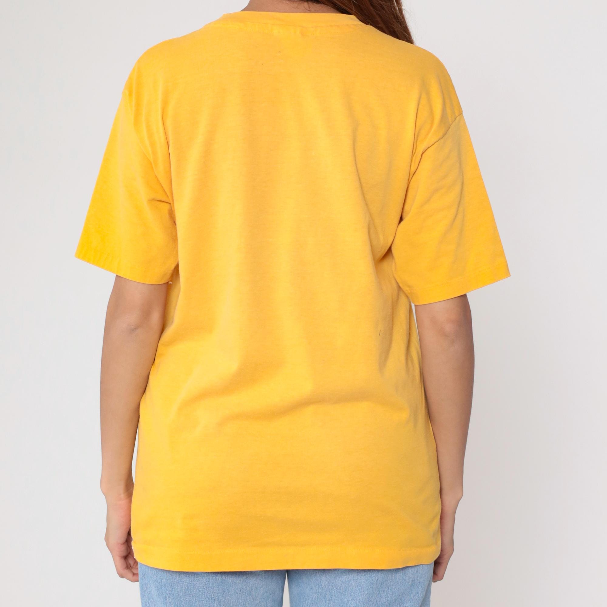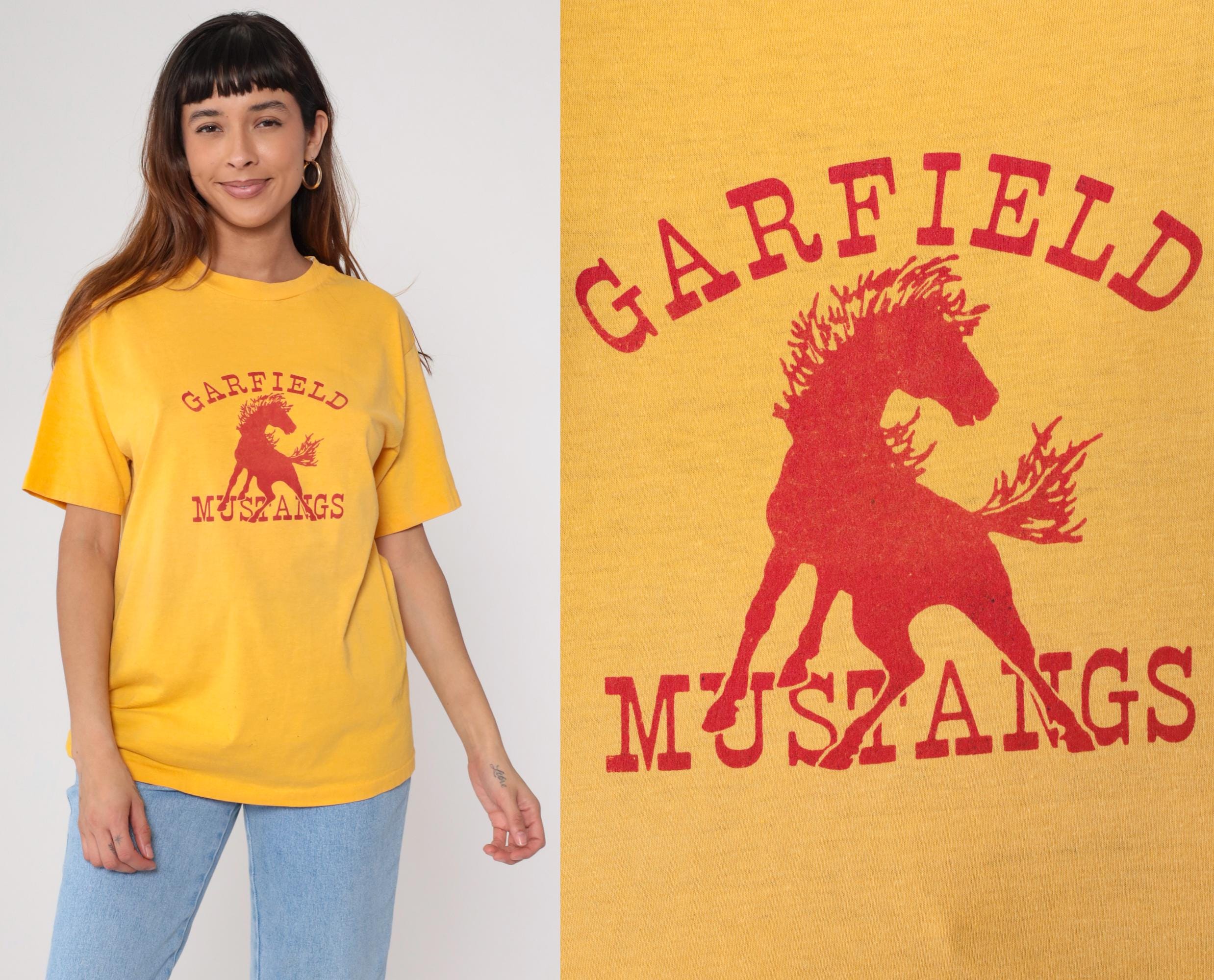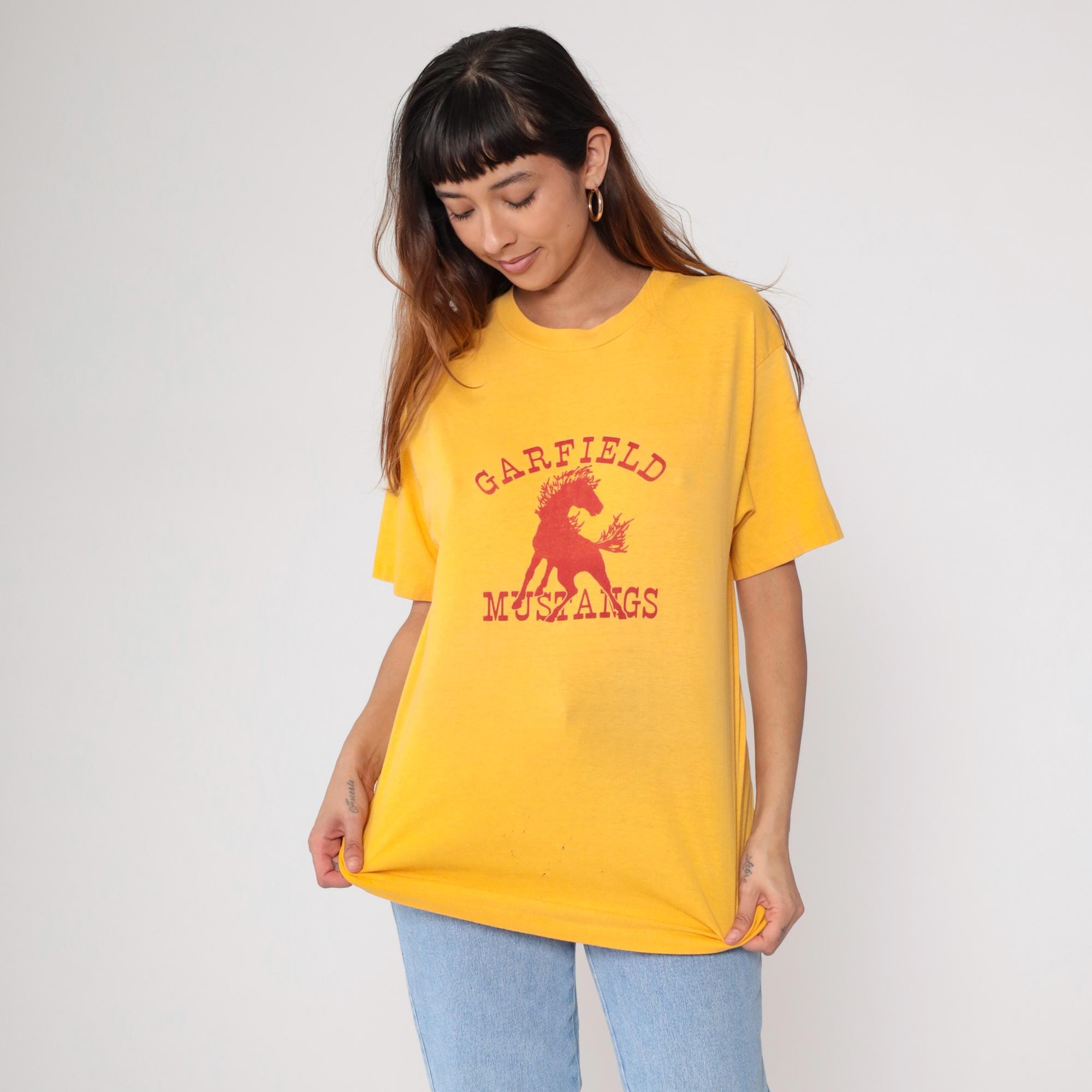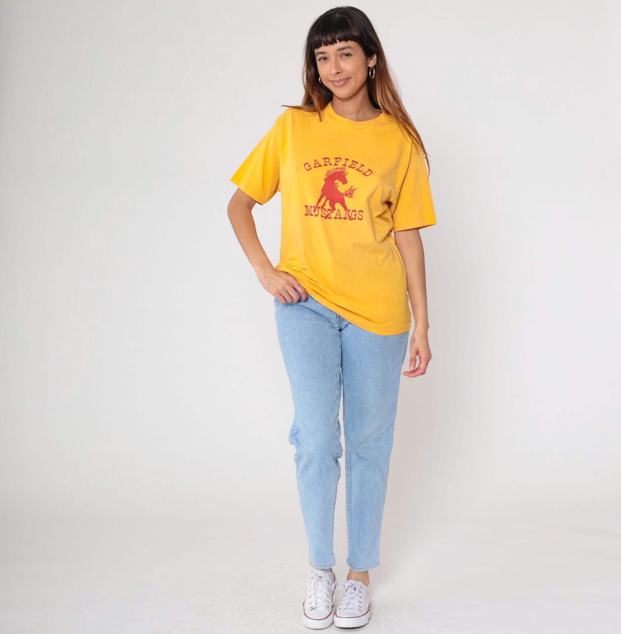 90s yellow t-shirt featuring Garfield County Mustangs high school mascot in red. Horse silhouette graphic with school name from Jordan, Montana.